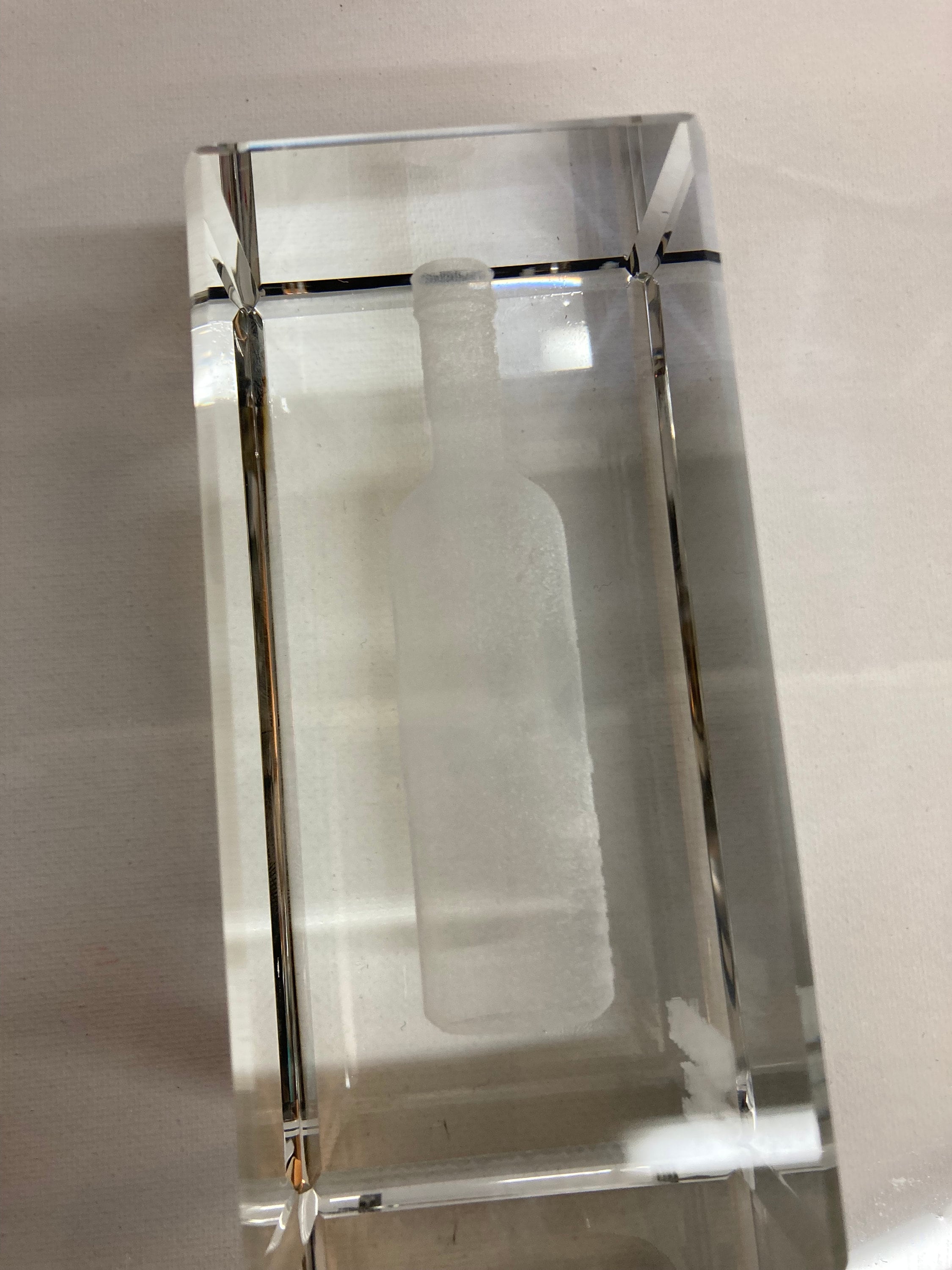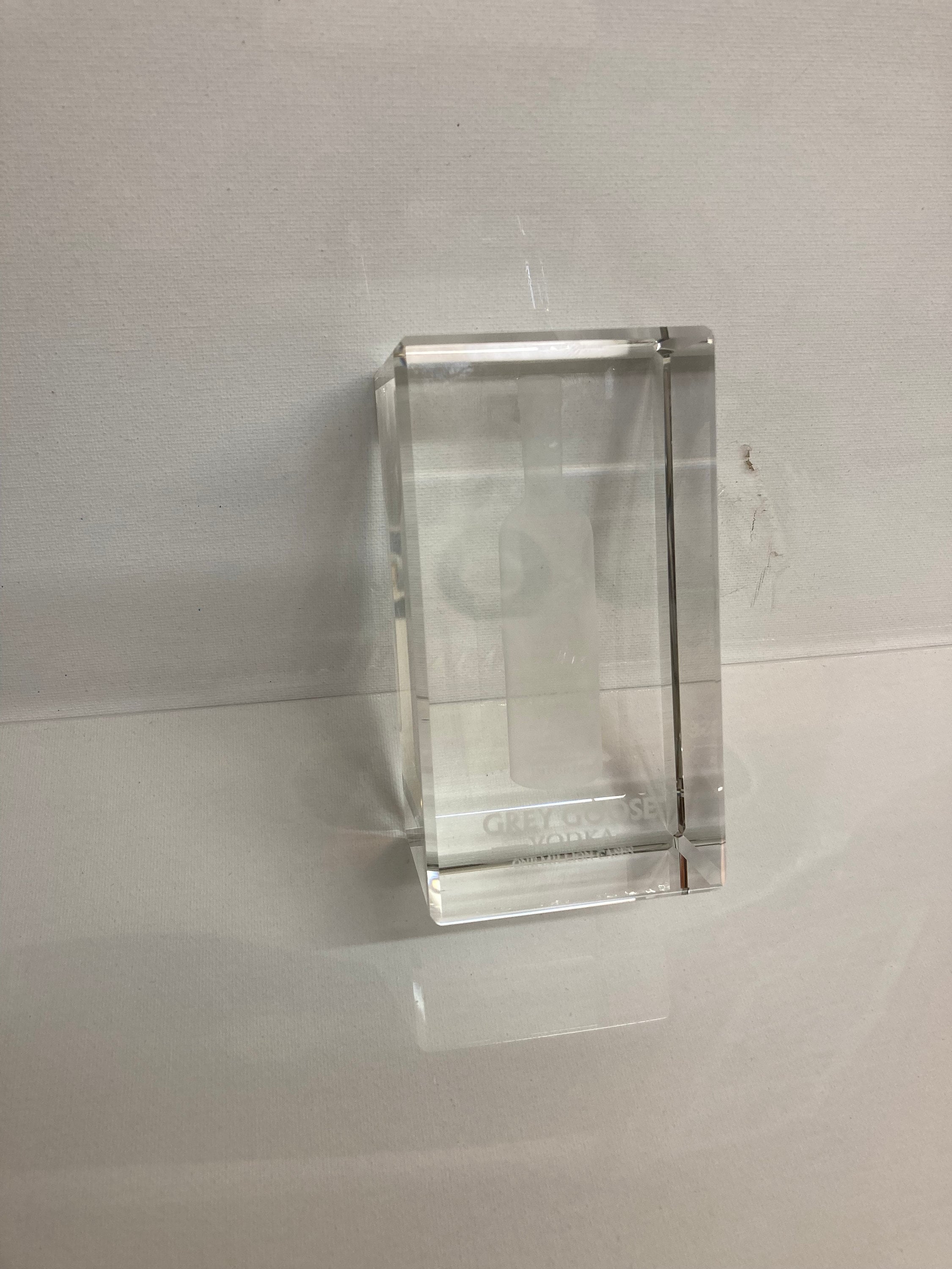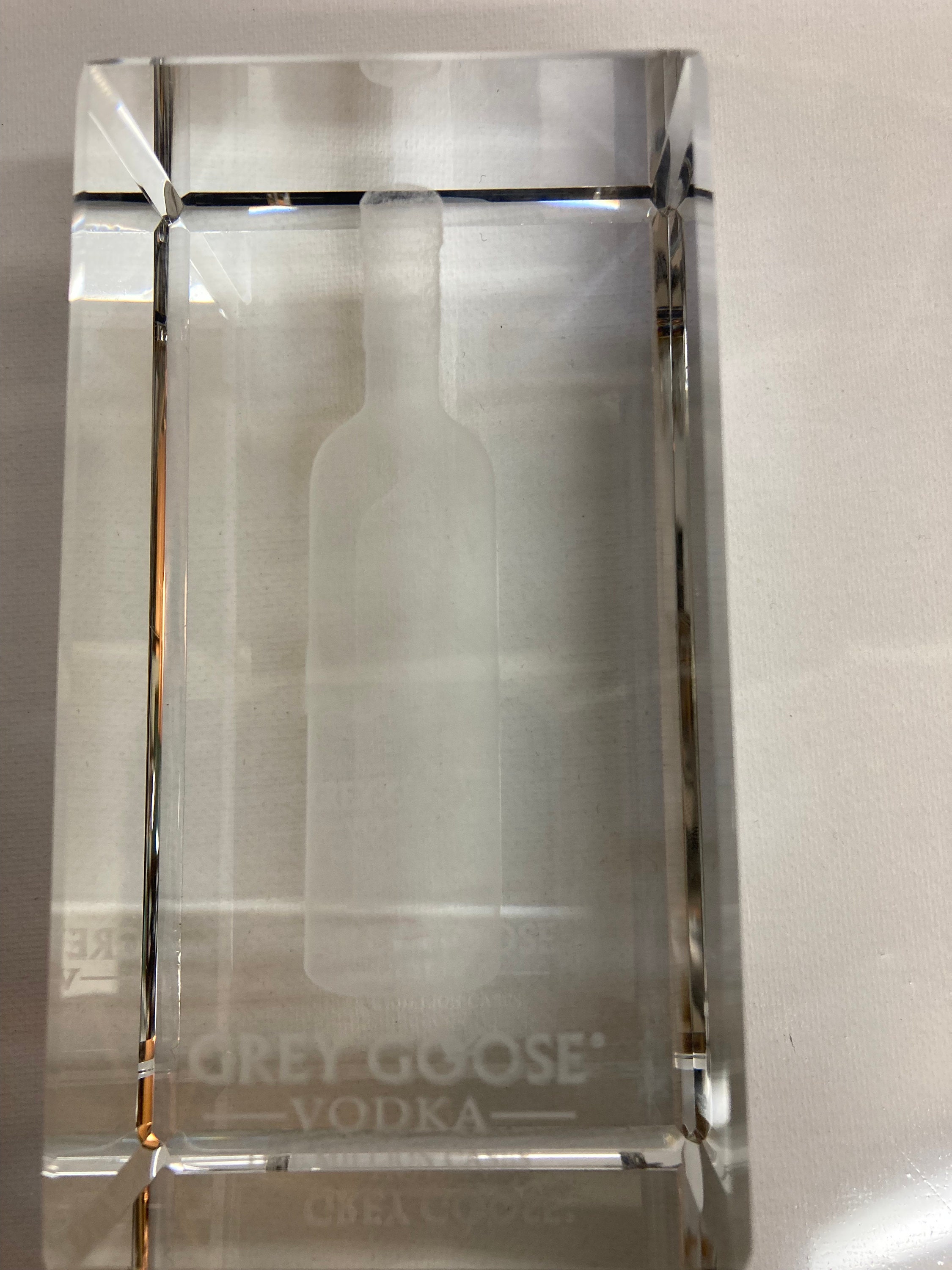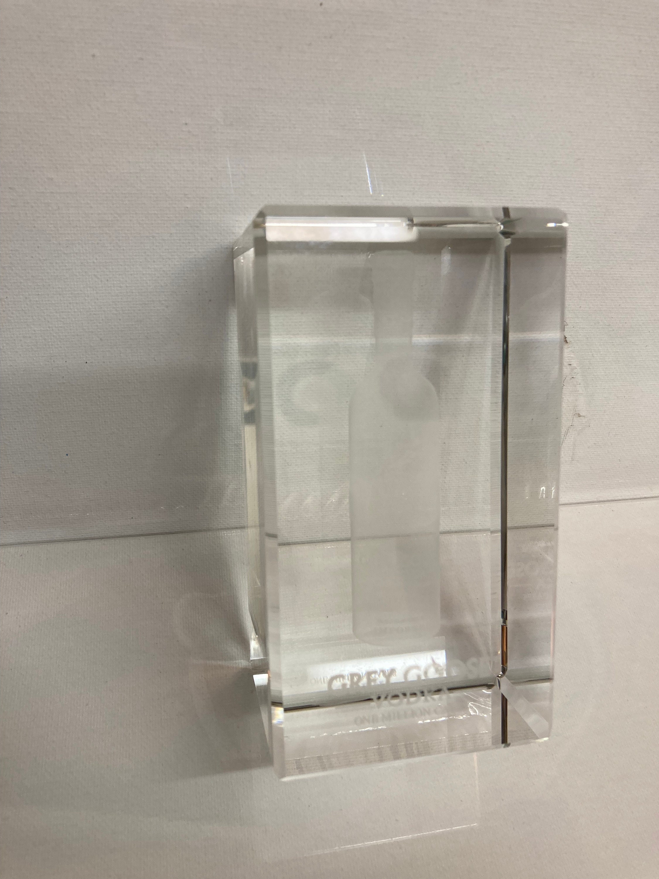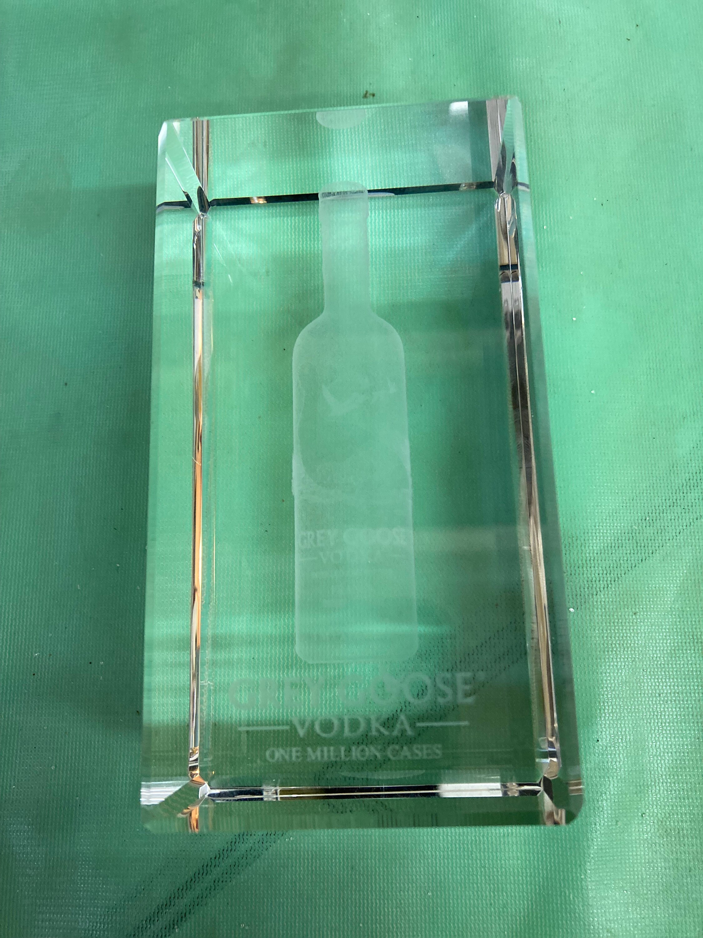 Vintage 3D Laser Etched With Grey Goose Vodka Bottle.In good condition. NO damages anywhereOne Million Cases CelebrationSolid and Heavy . Weights 3 1/4 lbs5 " tall2 3/4 "wide2 1/2 "deep