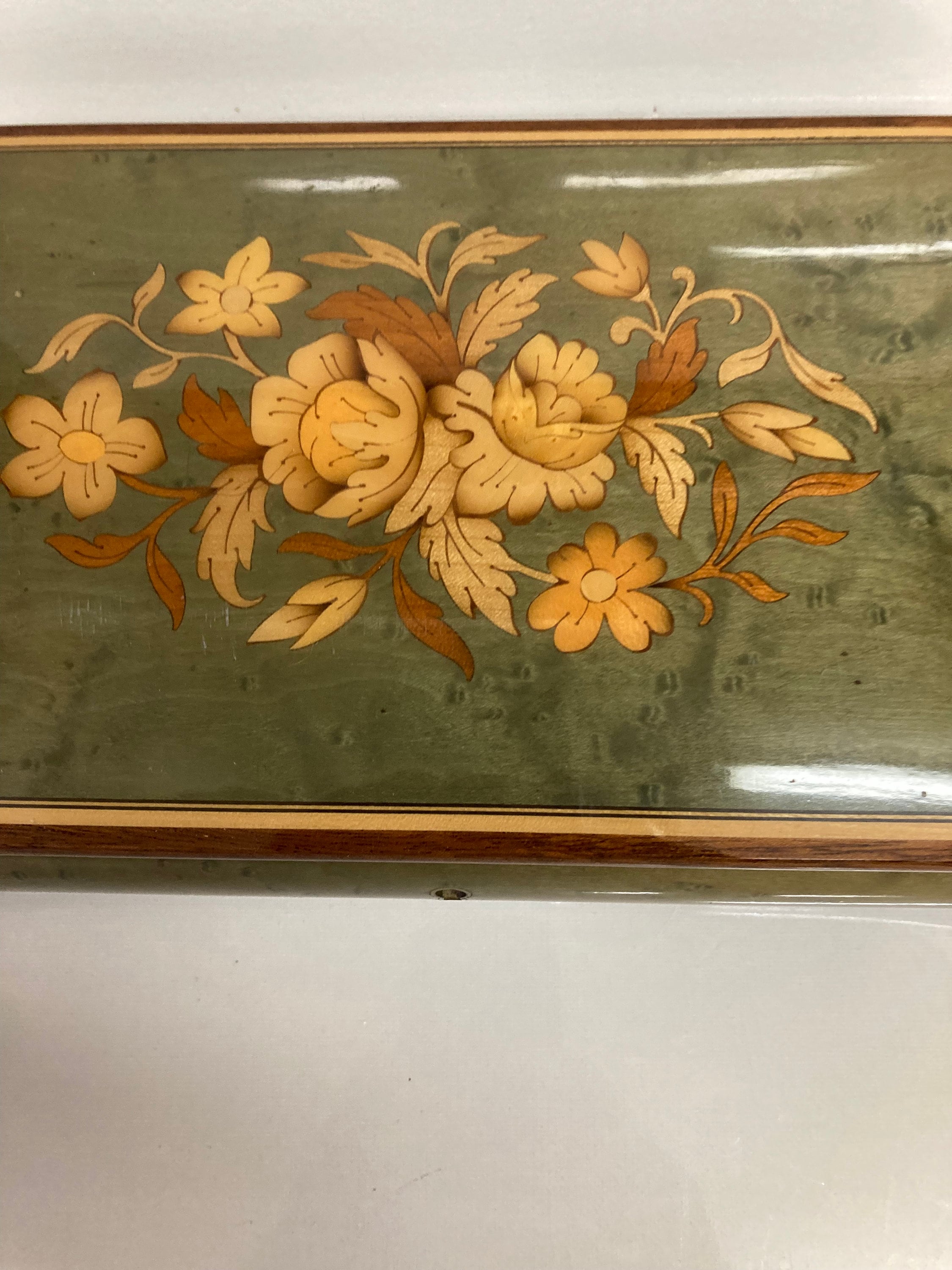 Beautiful Emerald Green colored Italian Inlaid jewelry box with an intricate floral design in the lid.