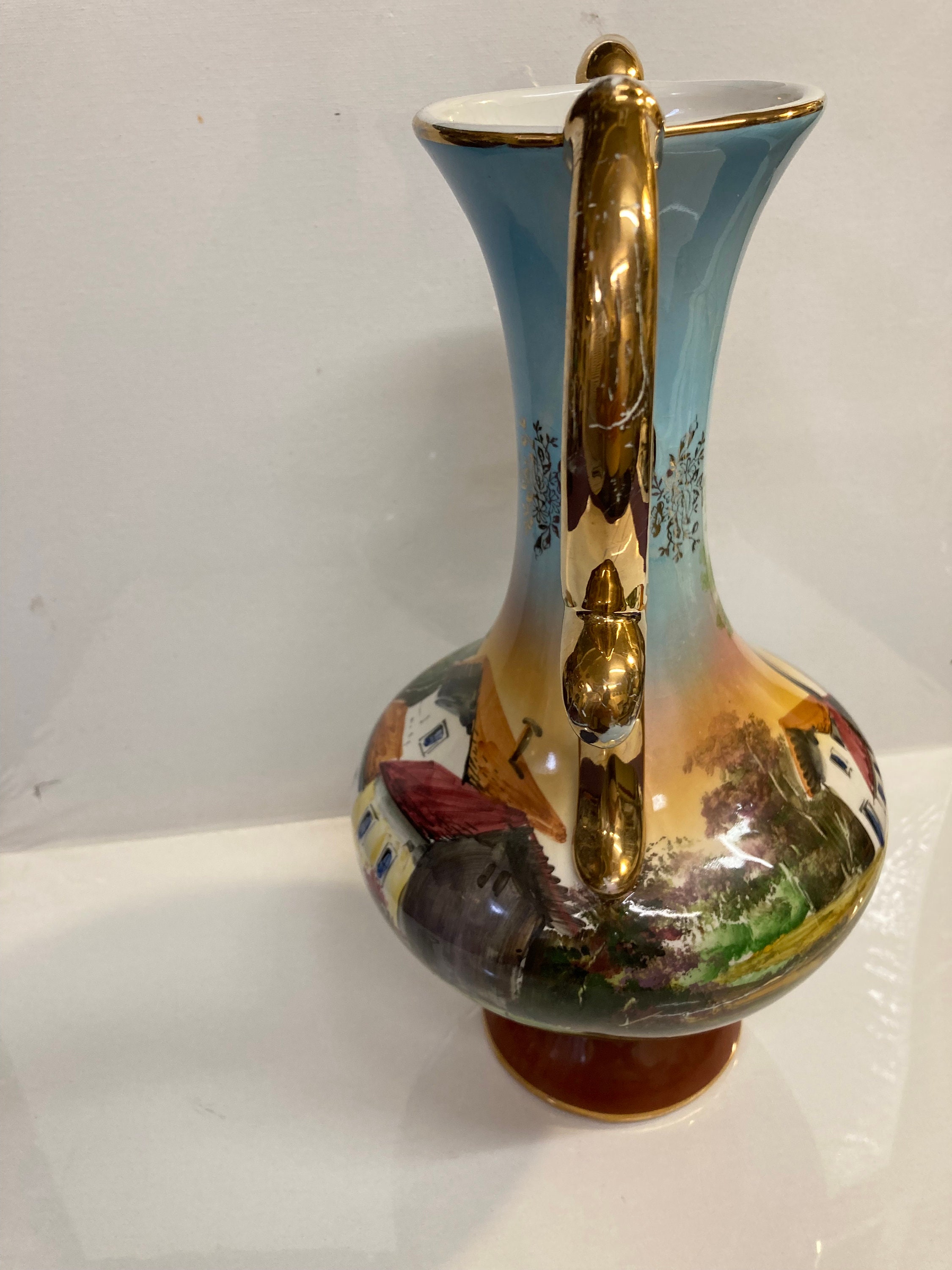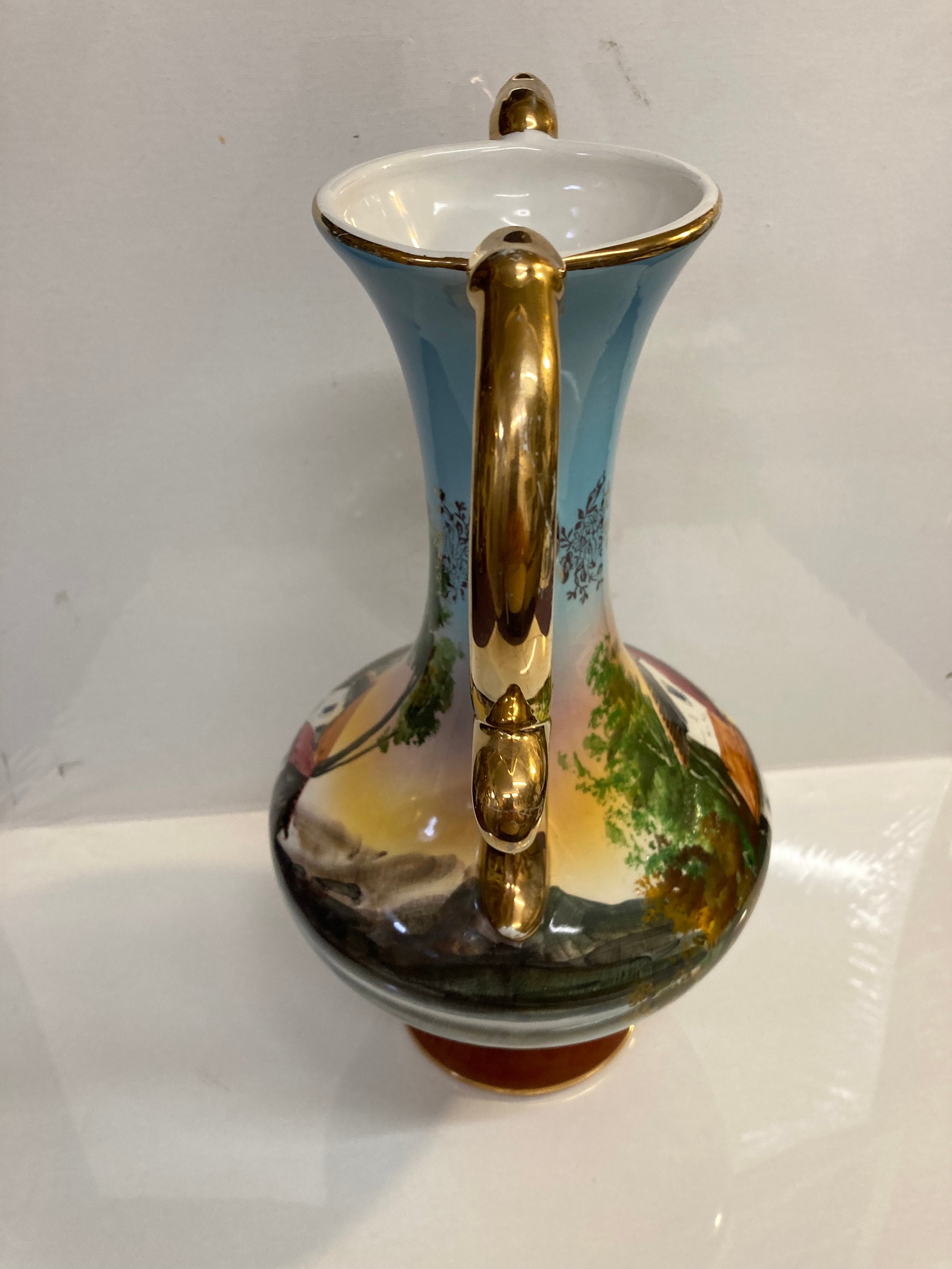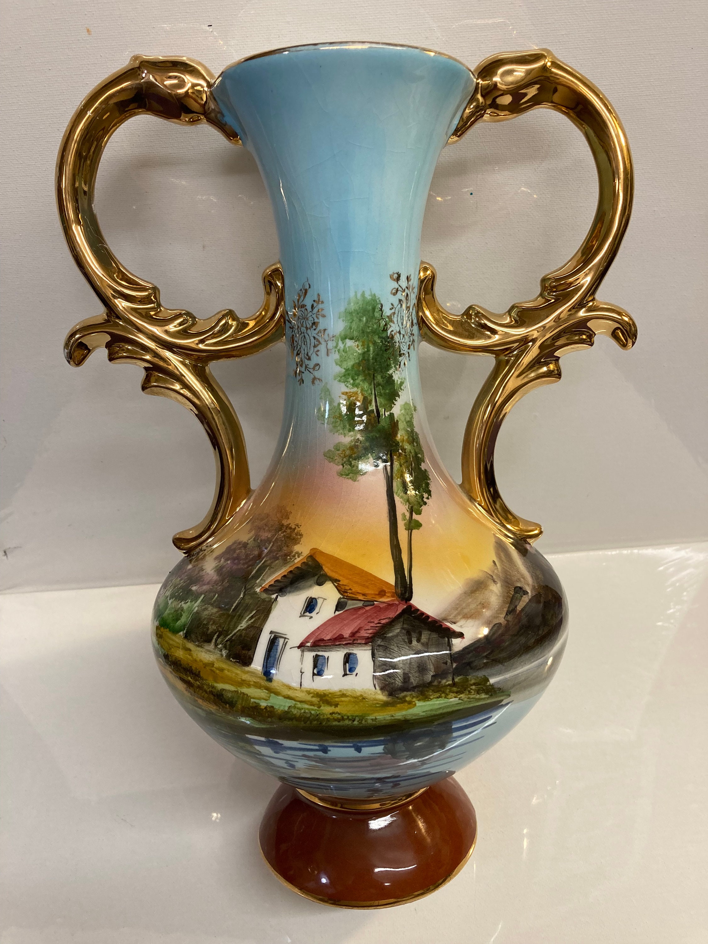 Portugal Hand Painted OCEAN Porcelain Vase Pereiras Valado GOLD DOUBLE HANDLE Made in Portugal Hand Painted Scenic View Porcelain Vase