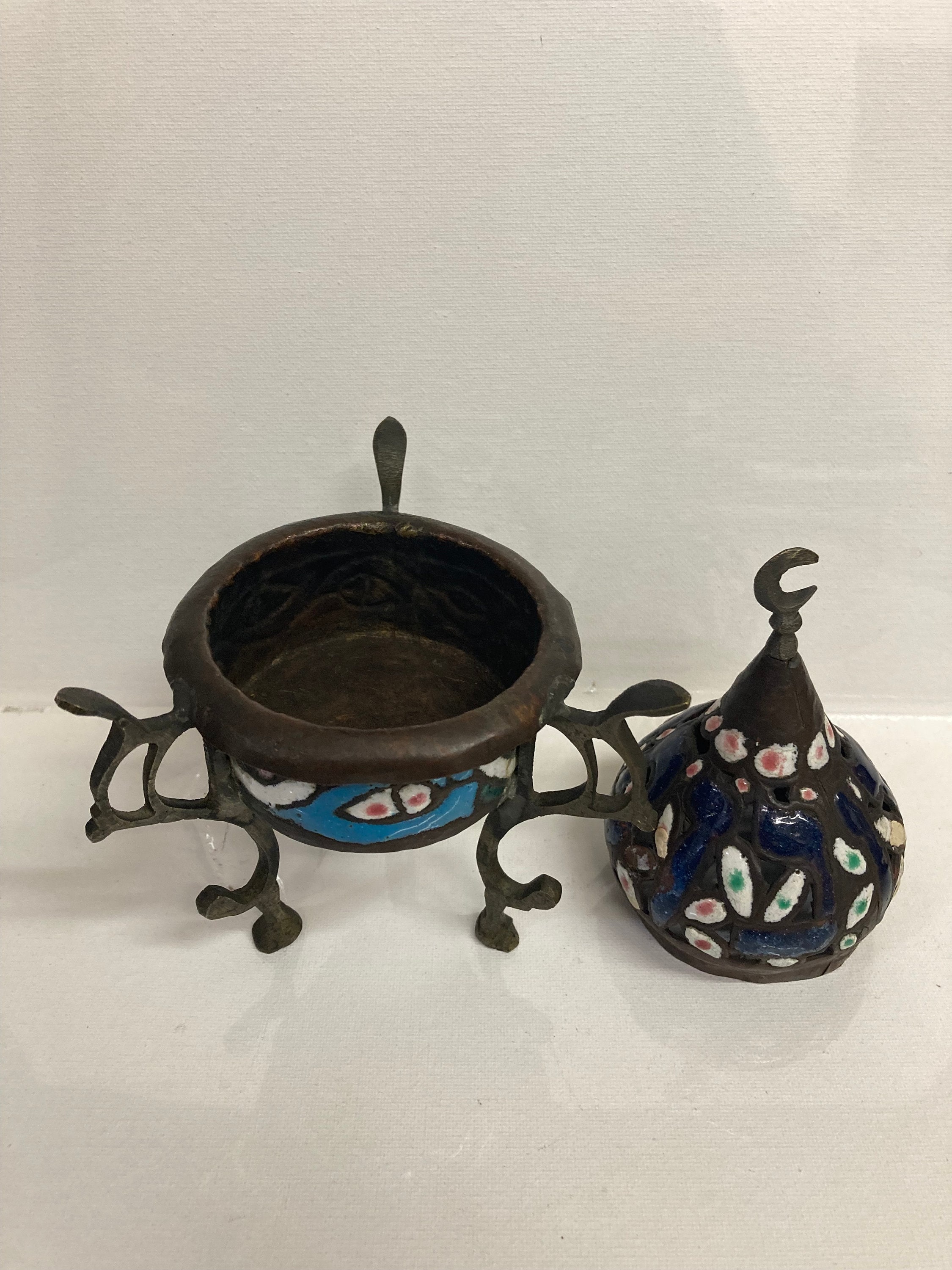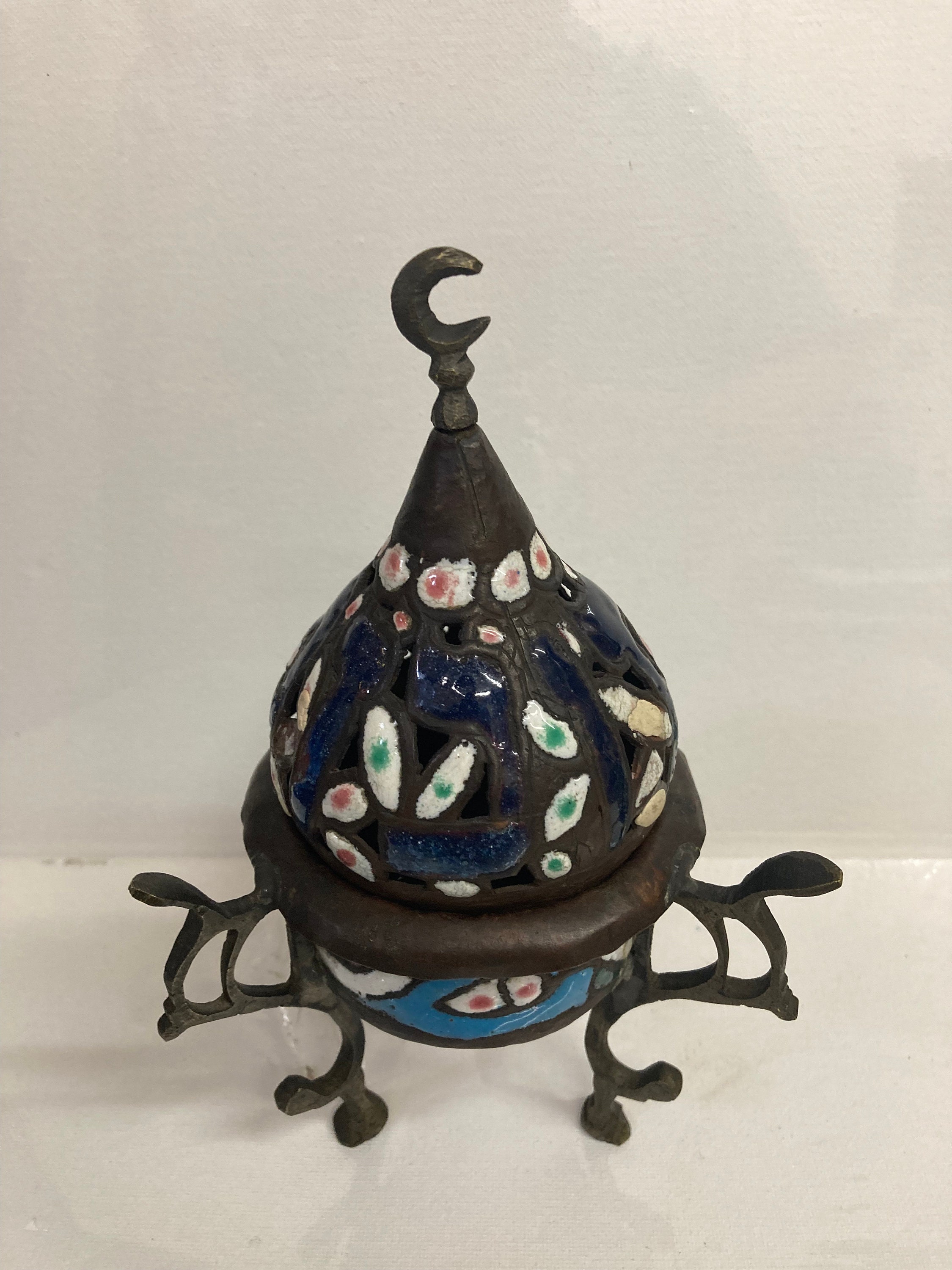 A brass incense burner, inlaid with Blue and white coloring .