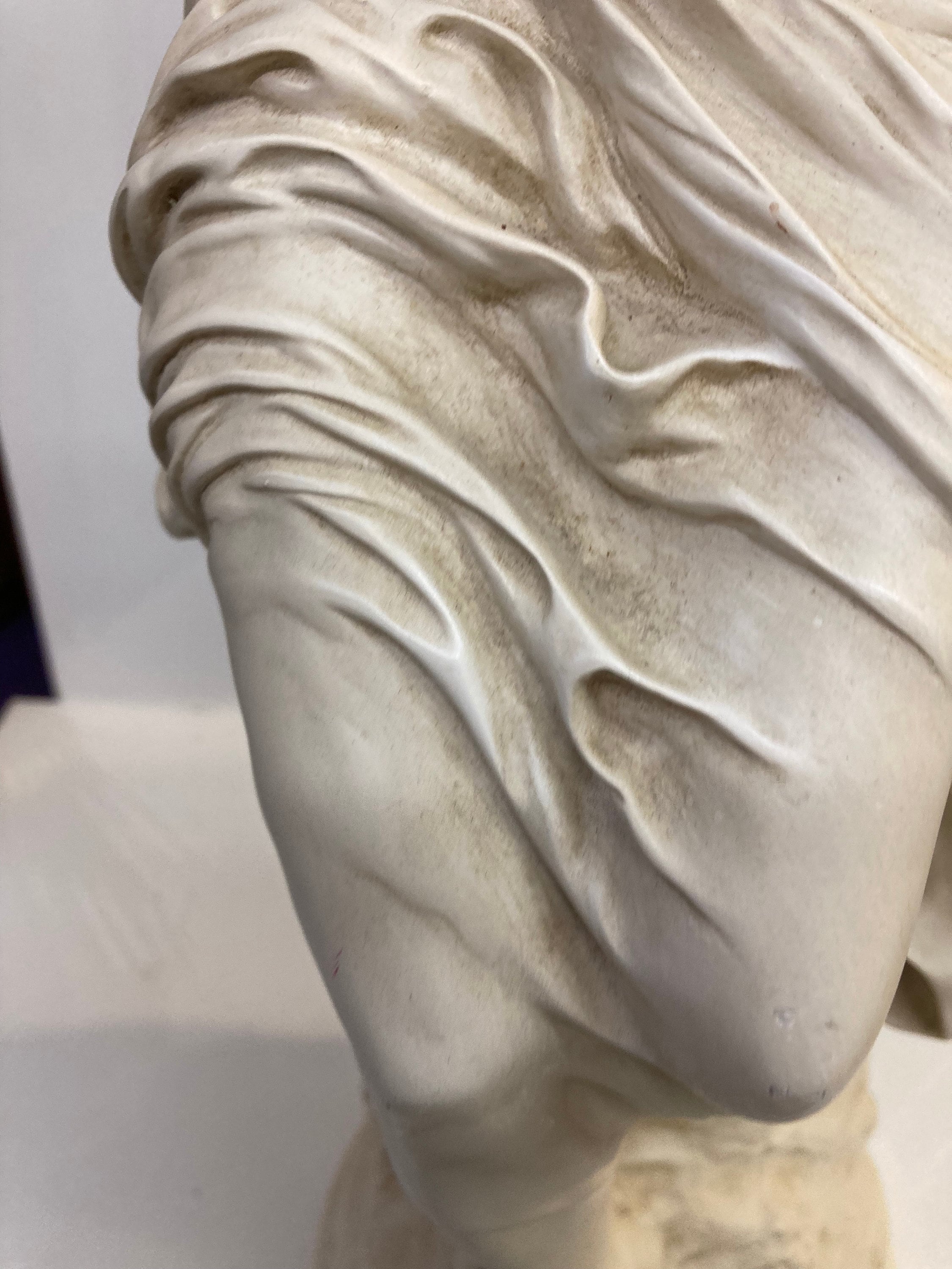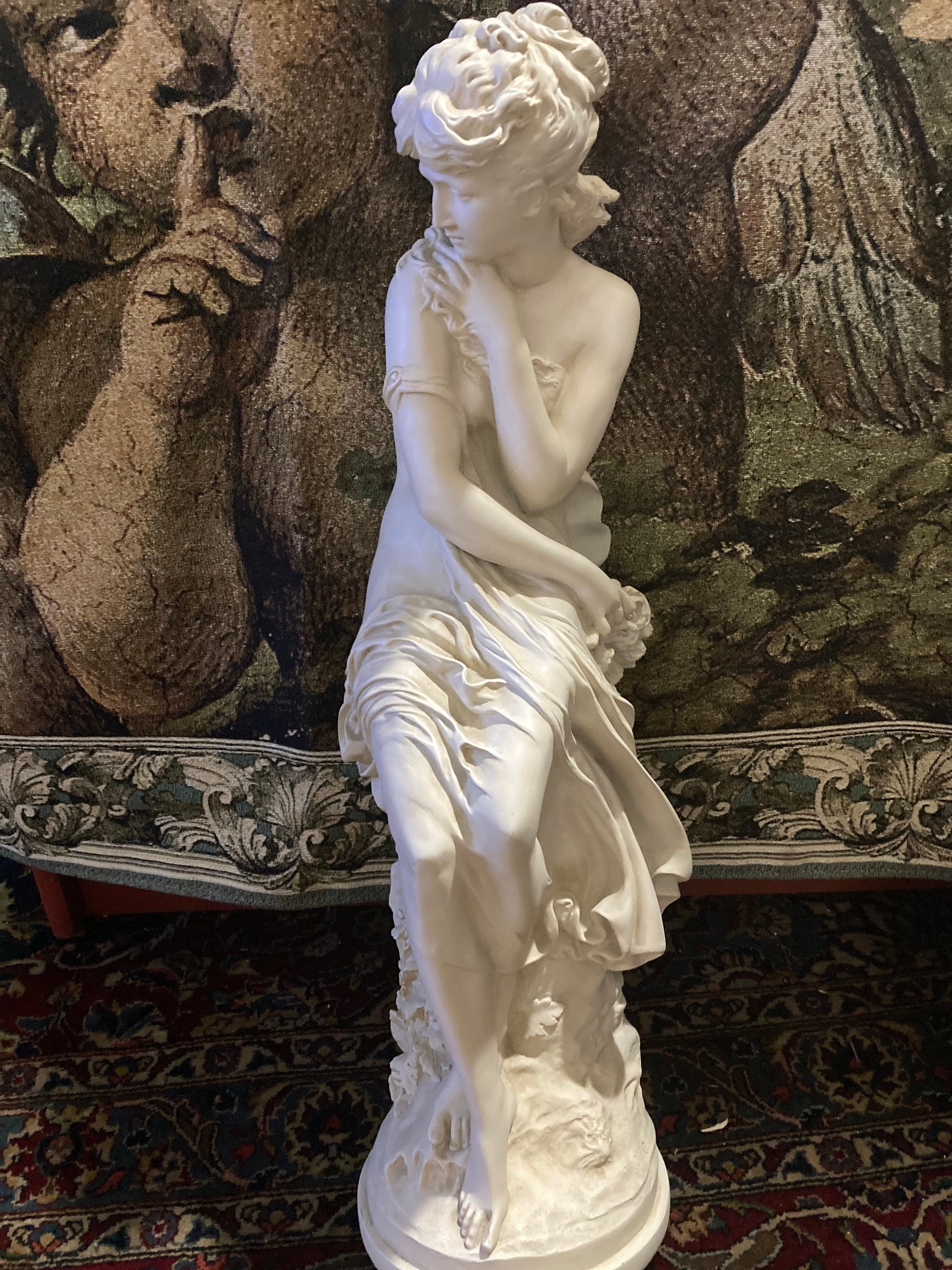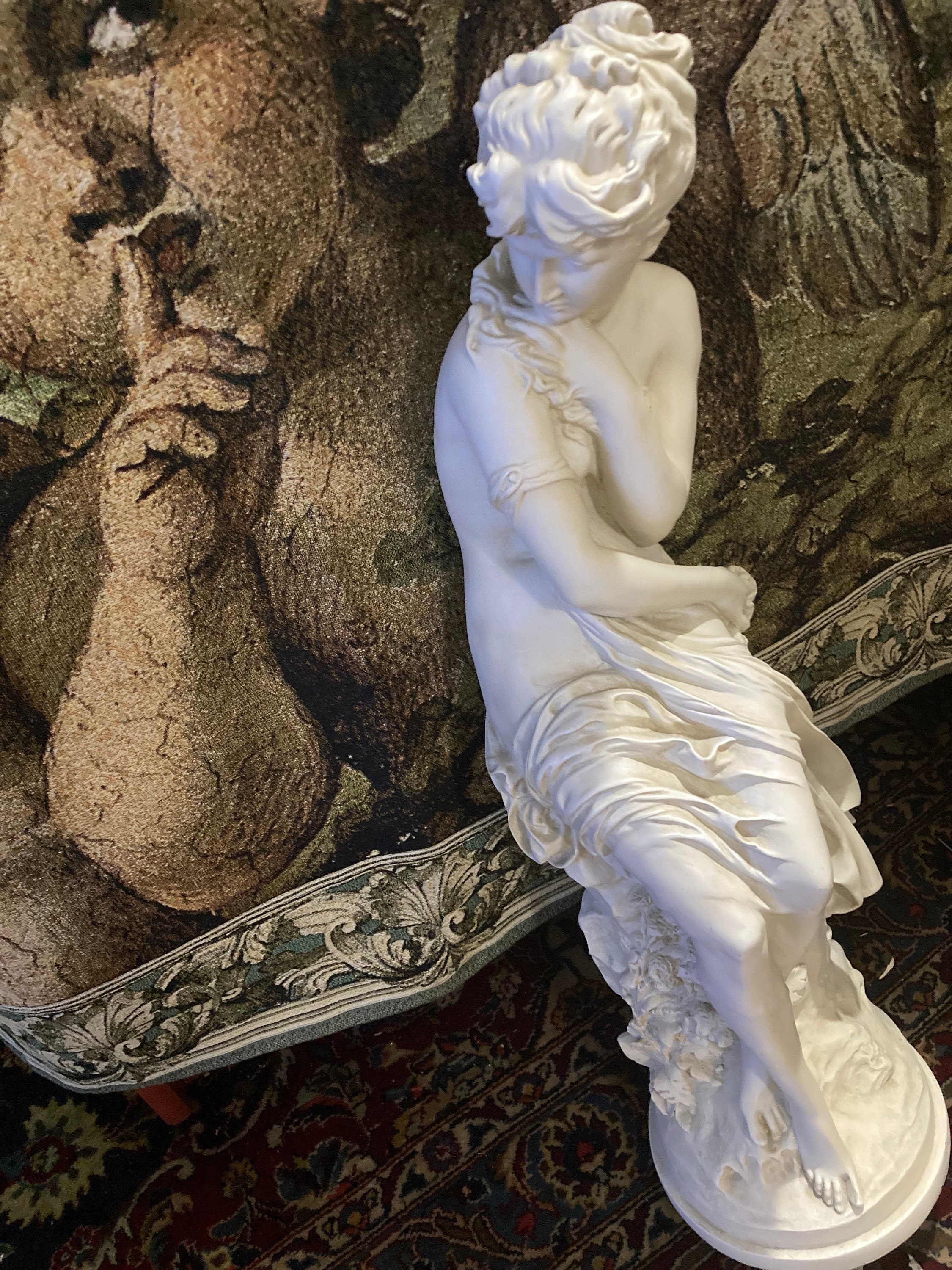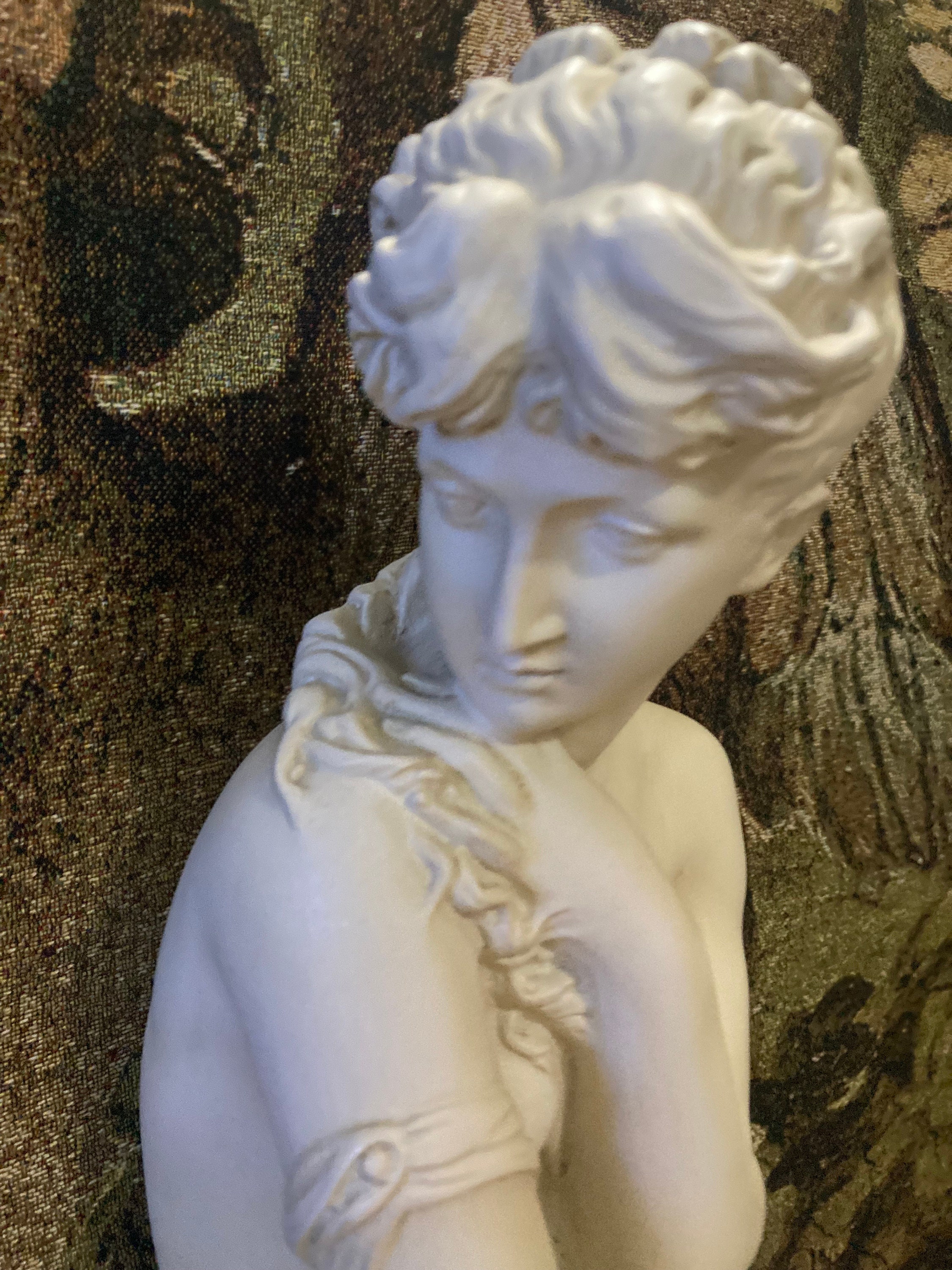 Moreau Signed Plaster Figural Statue depicting a young lady sitting on a pedestal and looking side ward ,