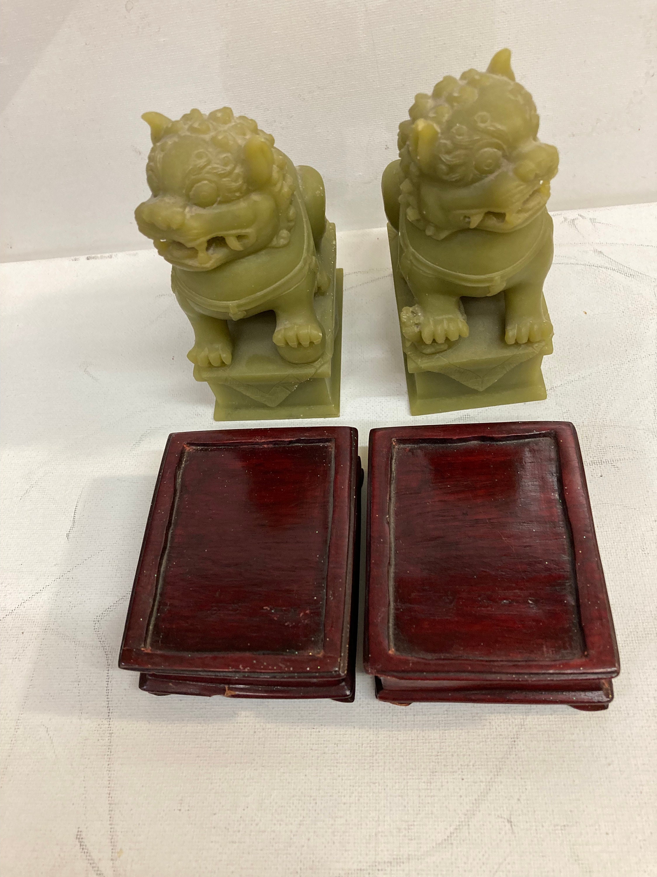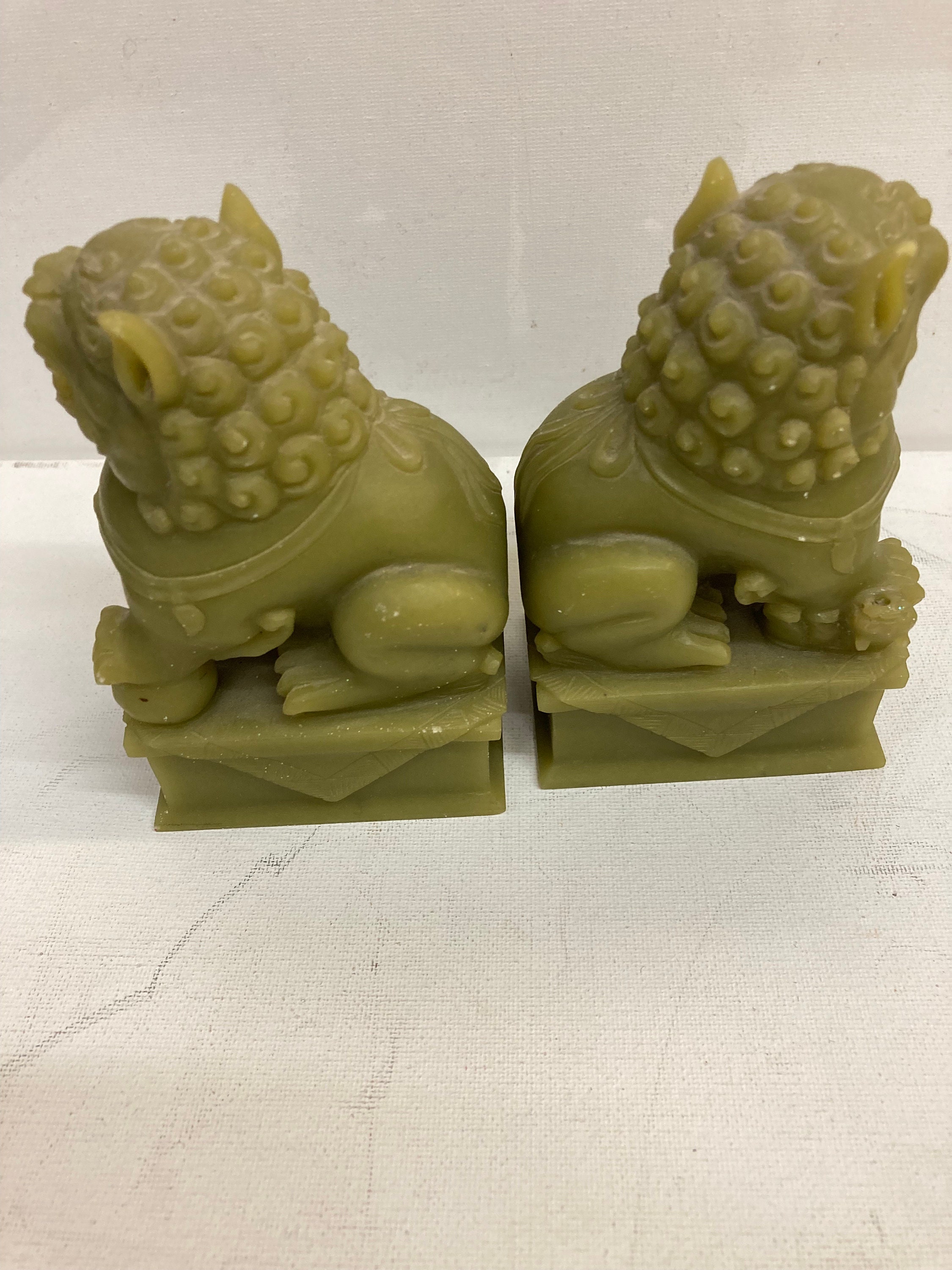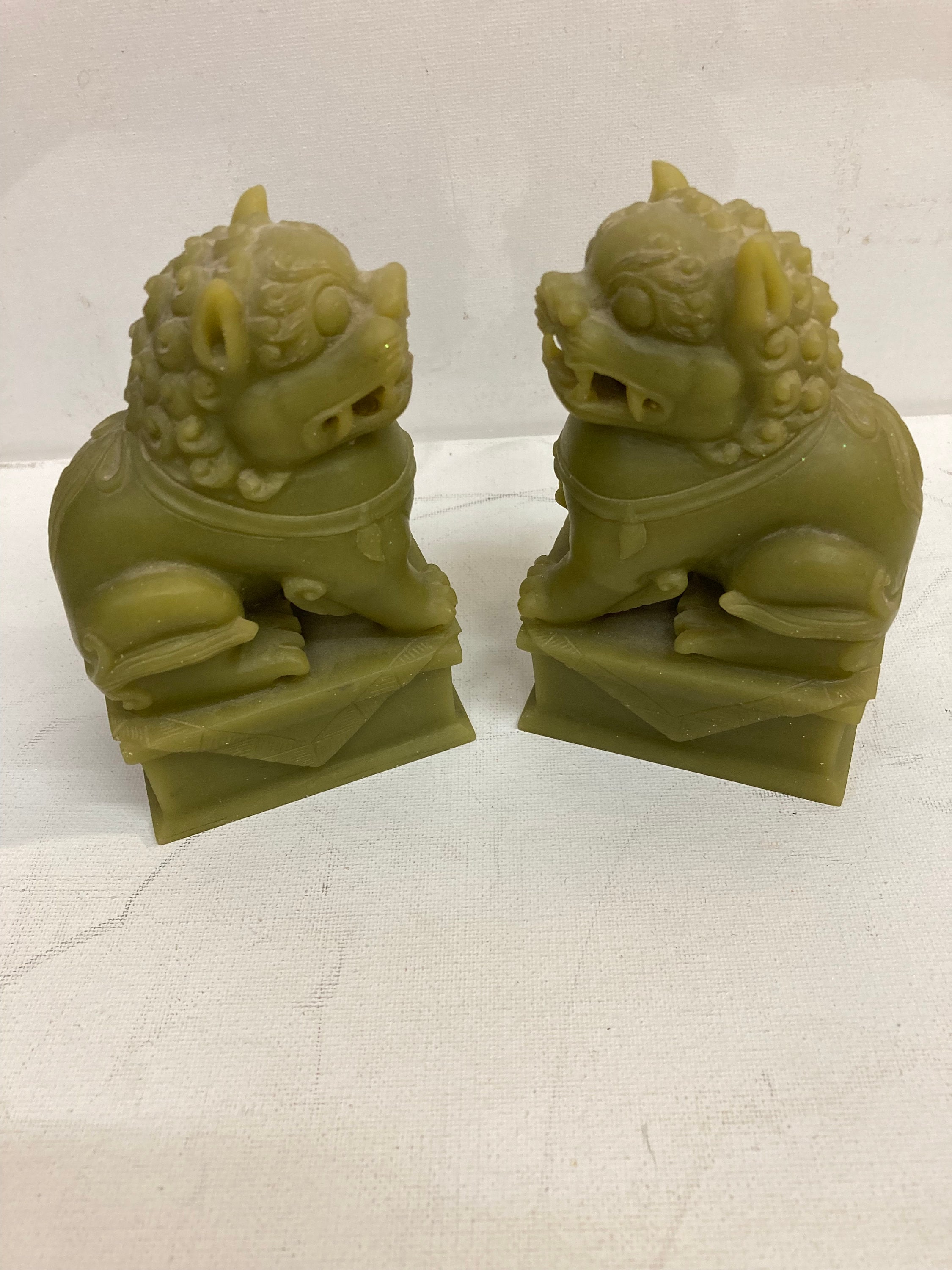 These classic mini foo dog statues are a one-of-a-kind set! Their elegant appeal and timeless design make them the perfect addition to your home décor! This is a fabulous set for any existing vignette, mantle, or a creative pair of bookends! Featuring a stunning hand-painted design in pale green, and sold as a pair; these two could never be split up! This mini foo dog set is just what you’ve been looking for!