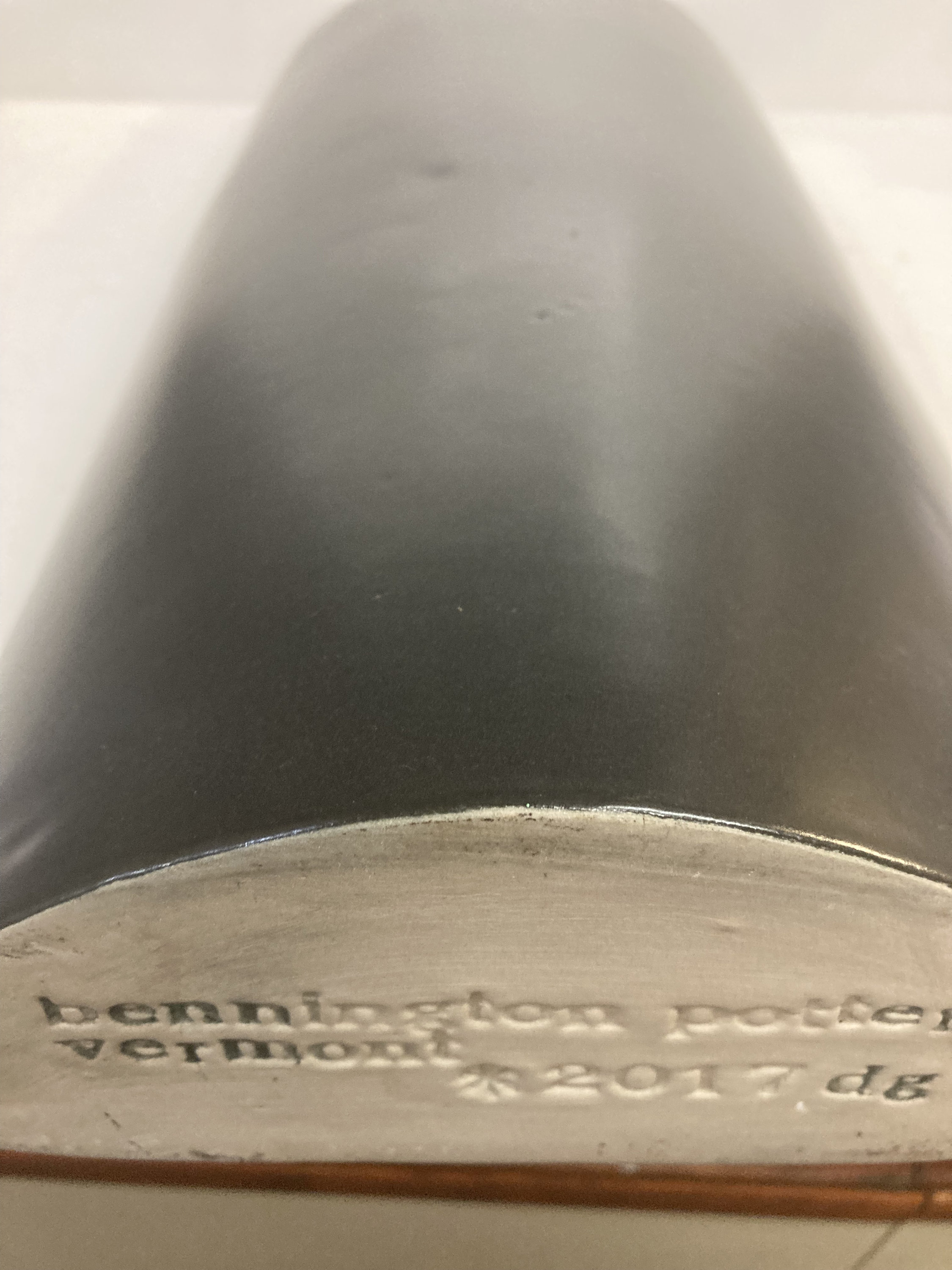Very large Bennington Potters / Vermont, vase by David Gil 2017. Matte/satin finish to the charcoal black finish. Stands 17” tall x 8” wide. Weighs approximately 7-8lbs. Excellent condition.