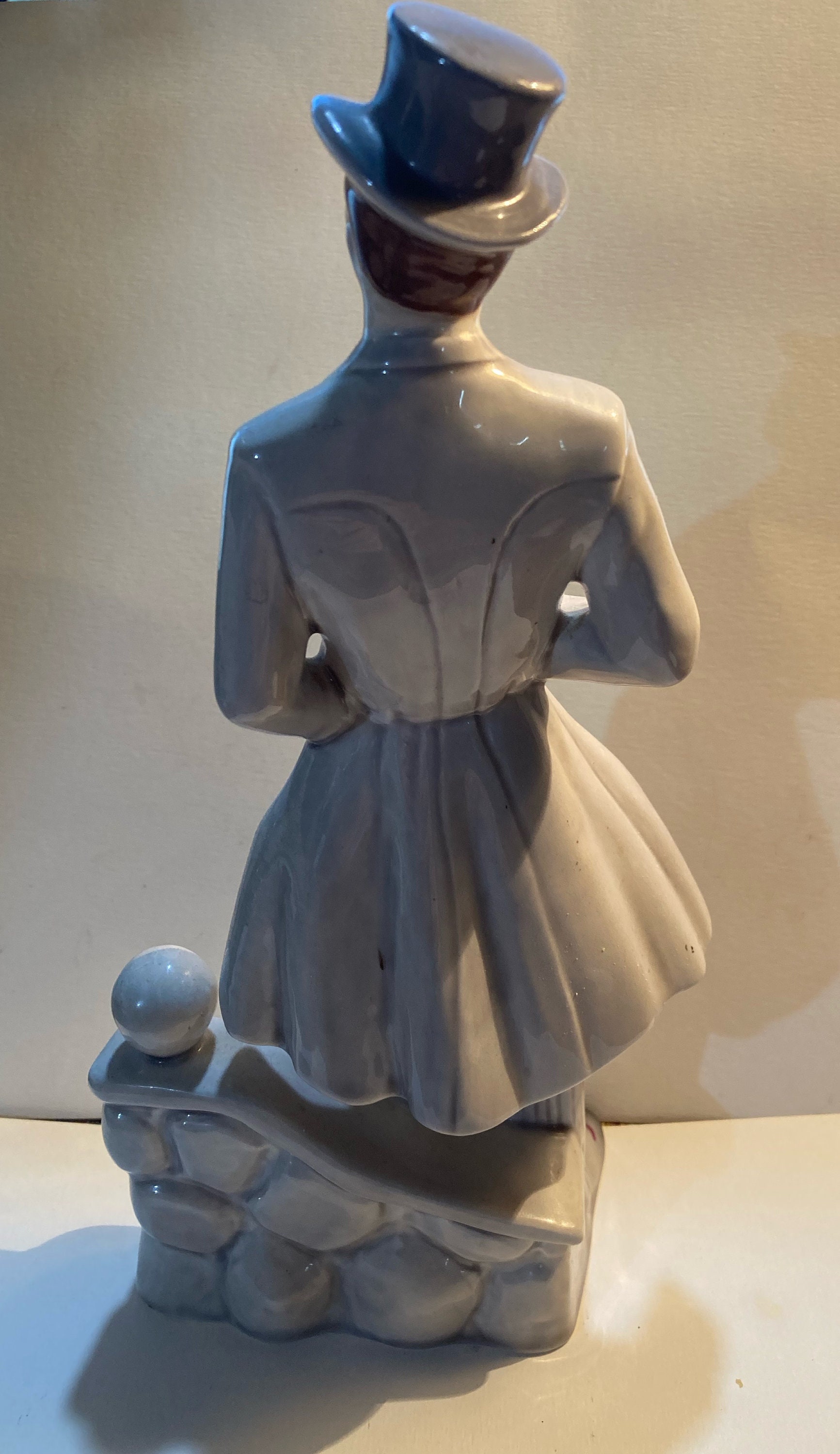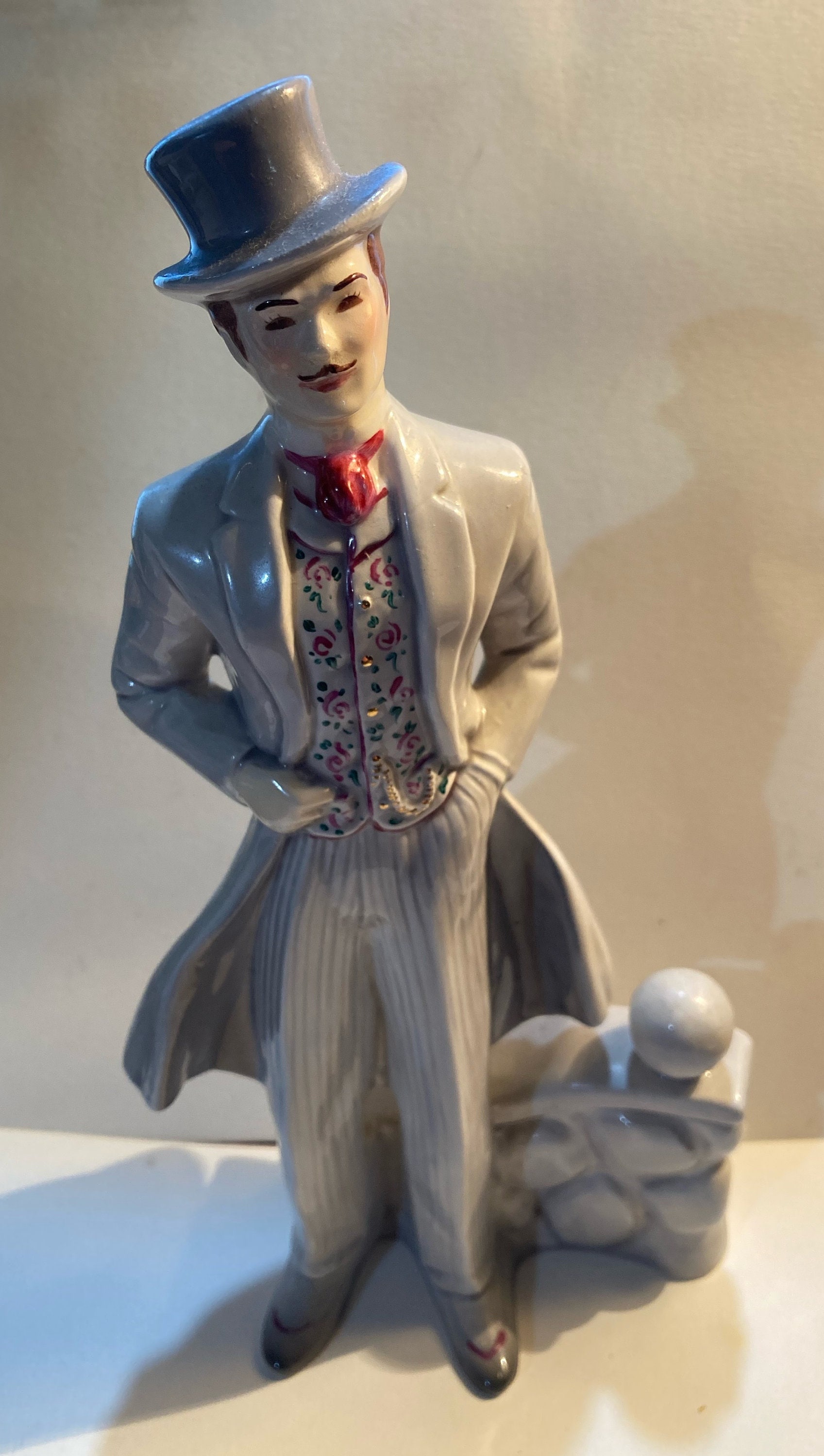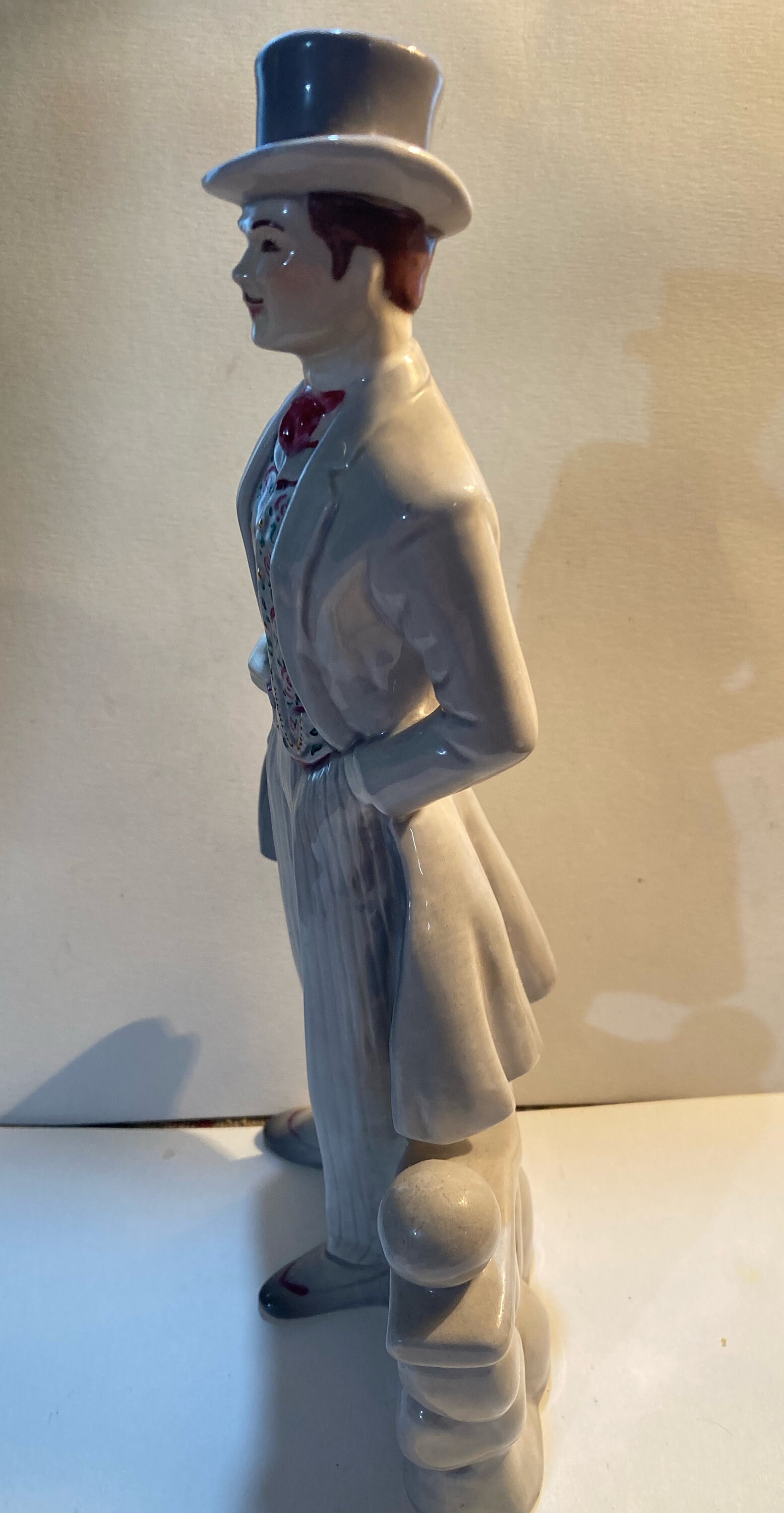 Florence Ceramics' Rhett Butler from Gone With Wind Movie, figure stands against a stone wall with his left hand in his pocket.
