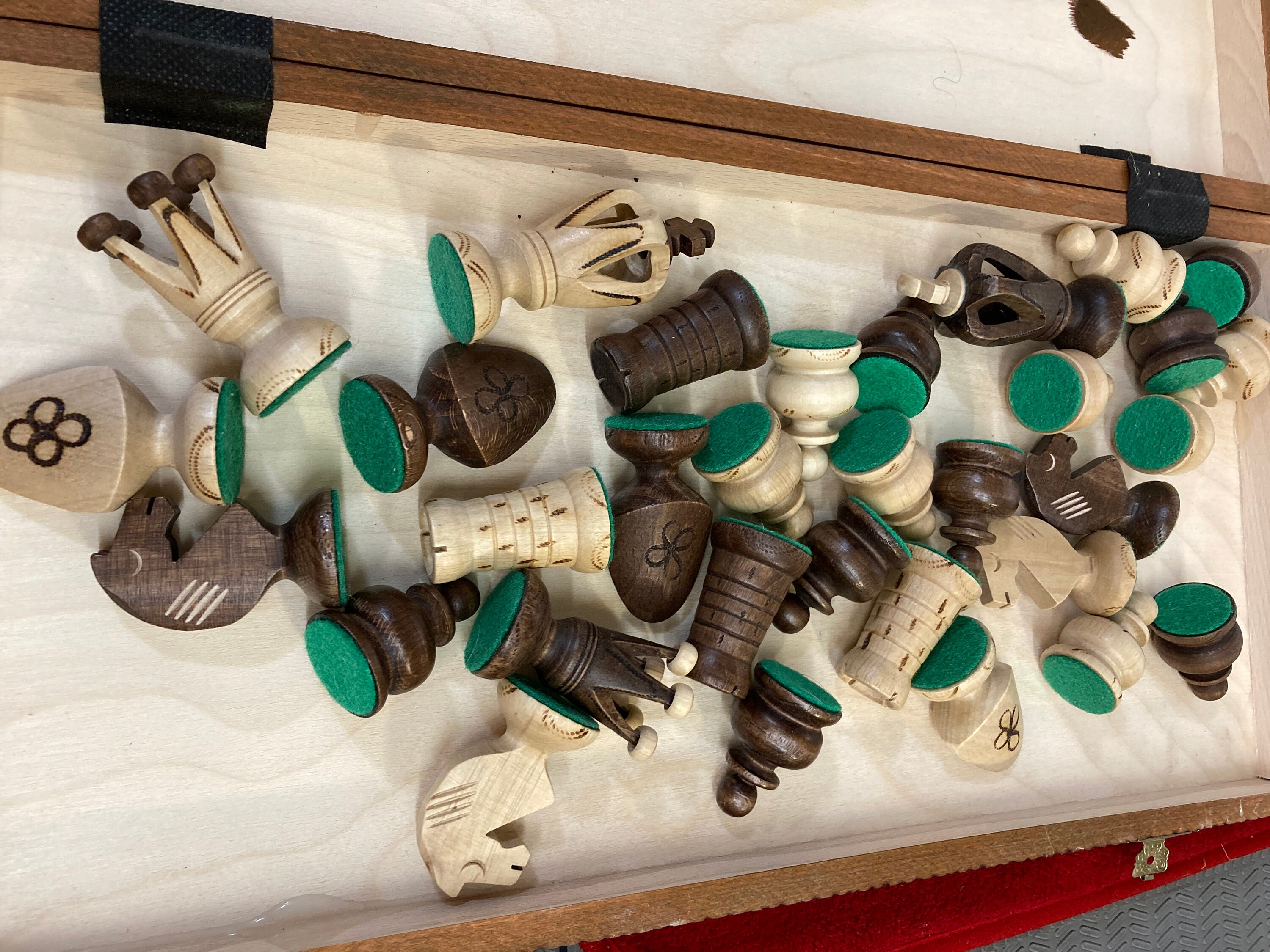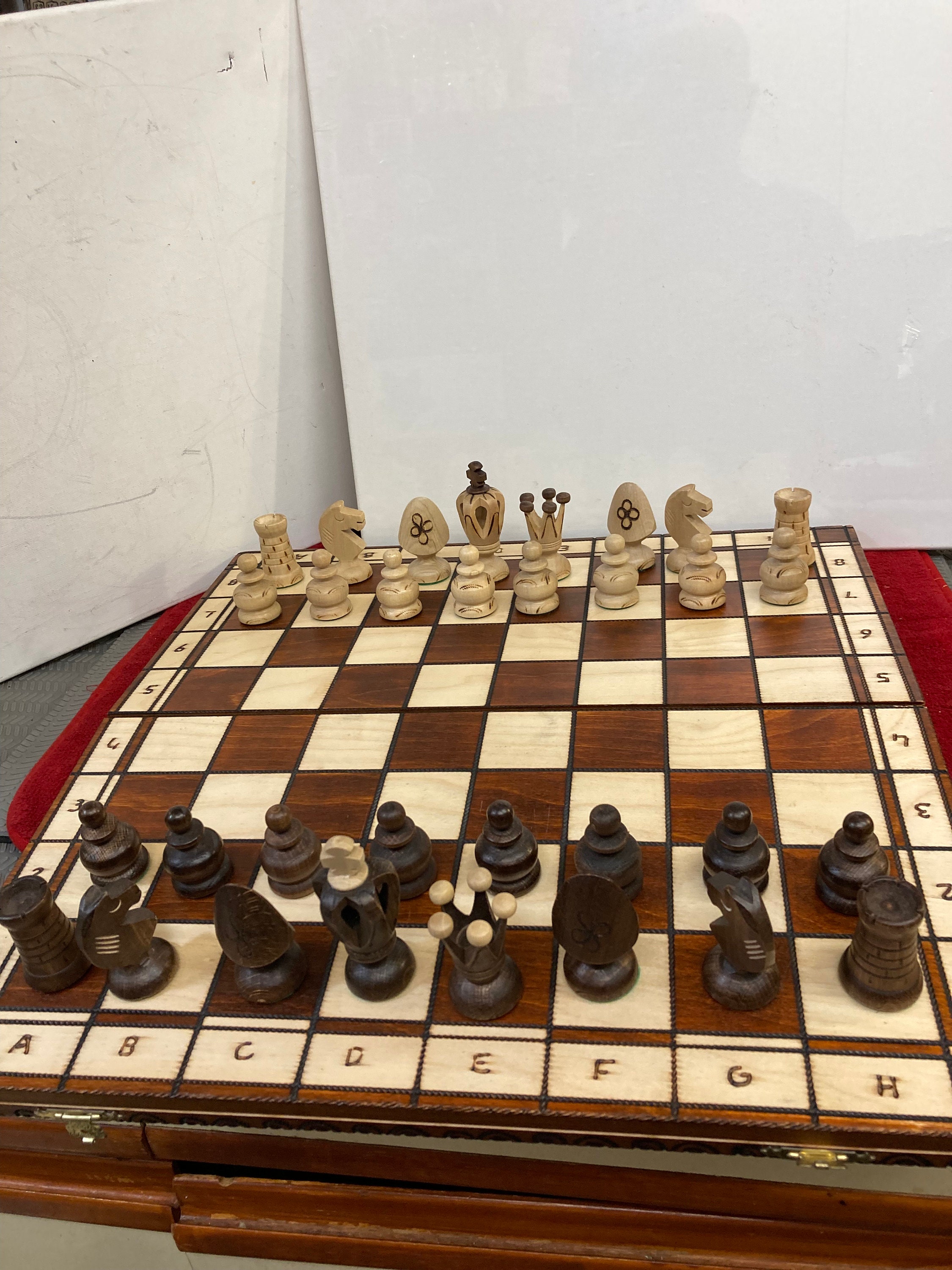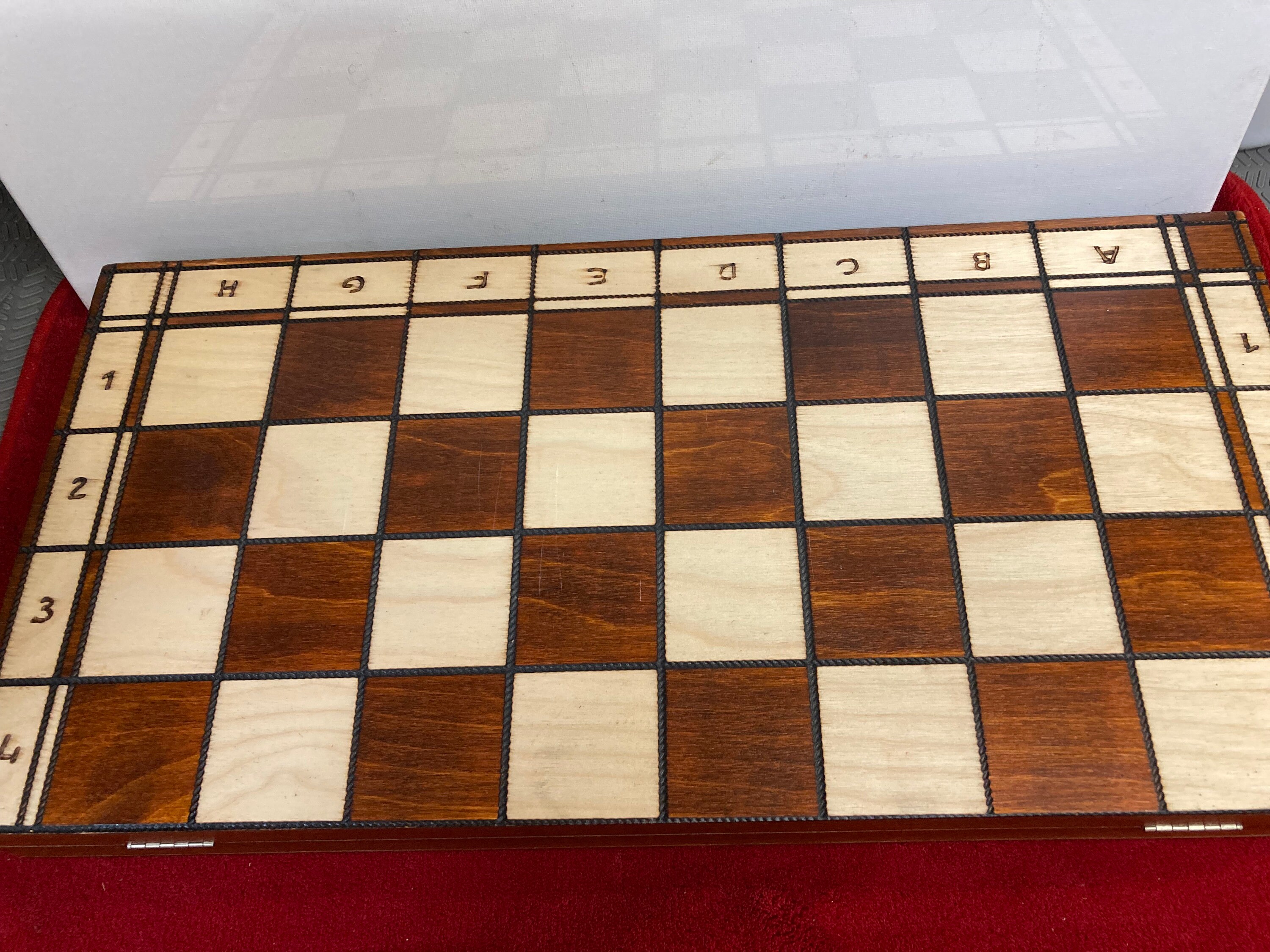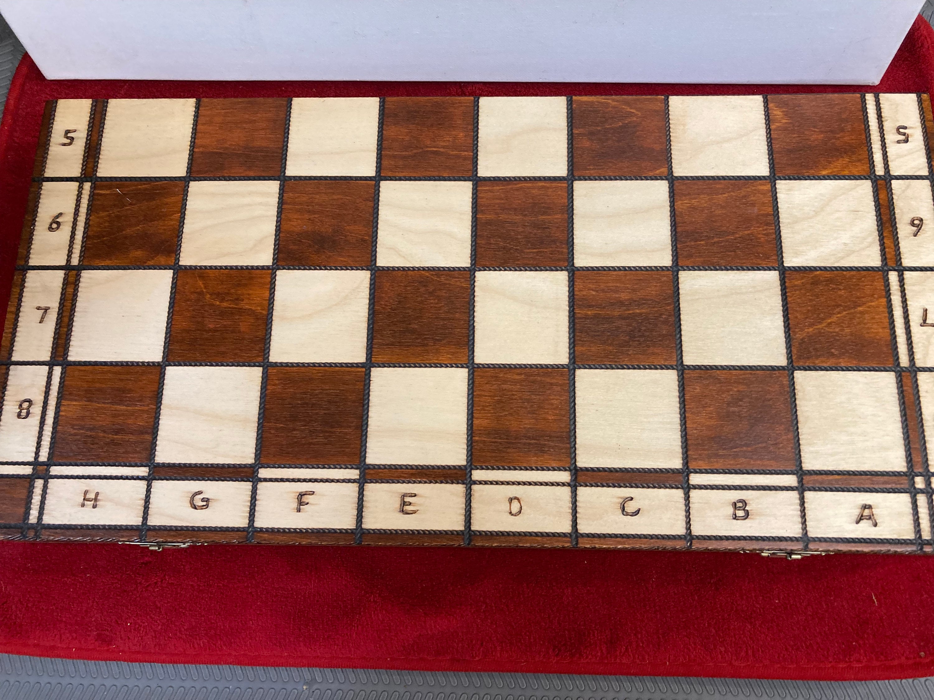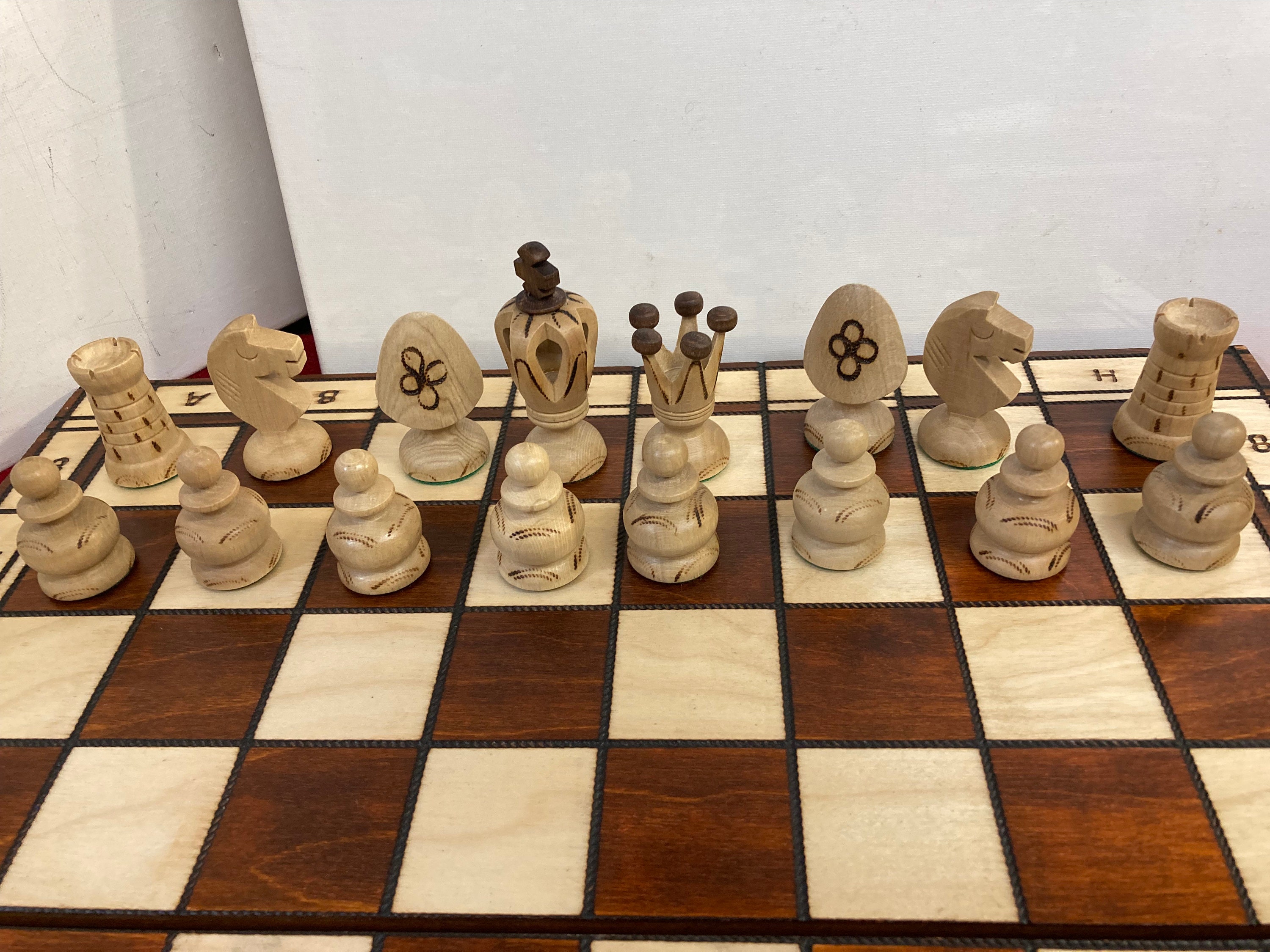 This chess is one of the most popular amateur sets. The large size chessboard is lacquered finish and has nice looking burnt lines between squares and burnt numbers. There are also burnt ornaments around the board.