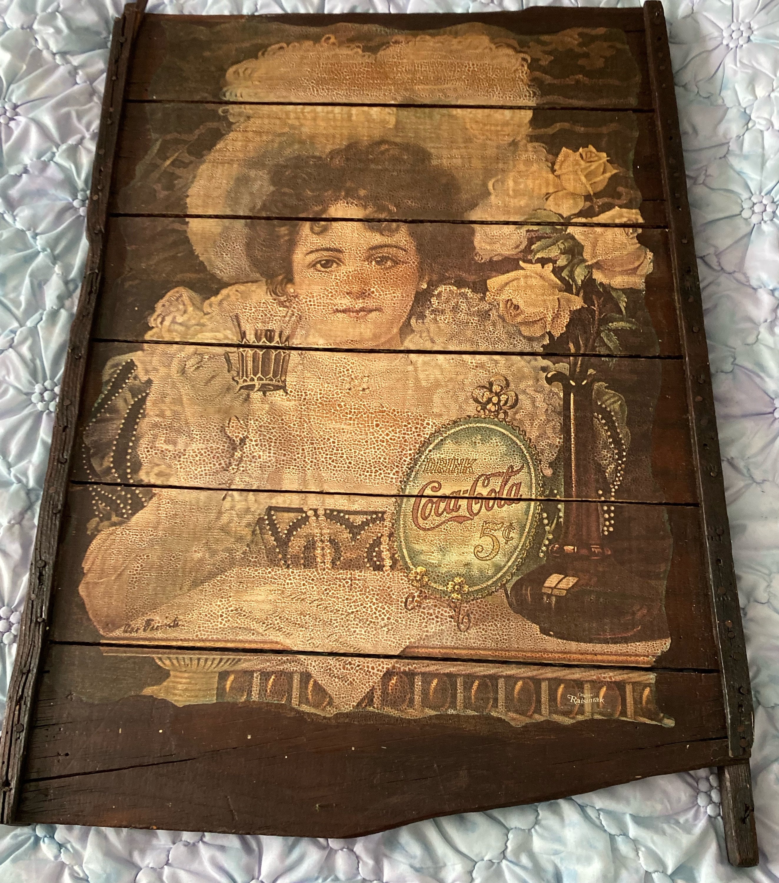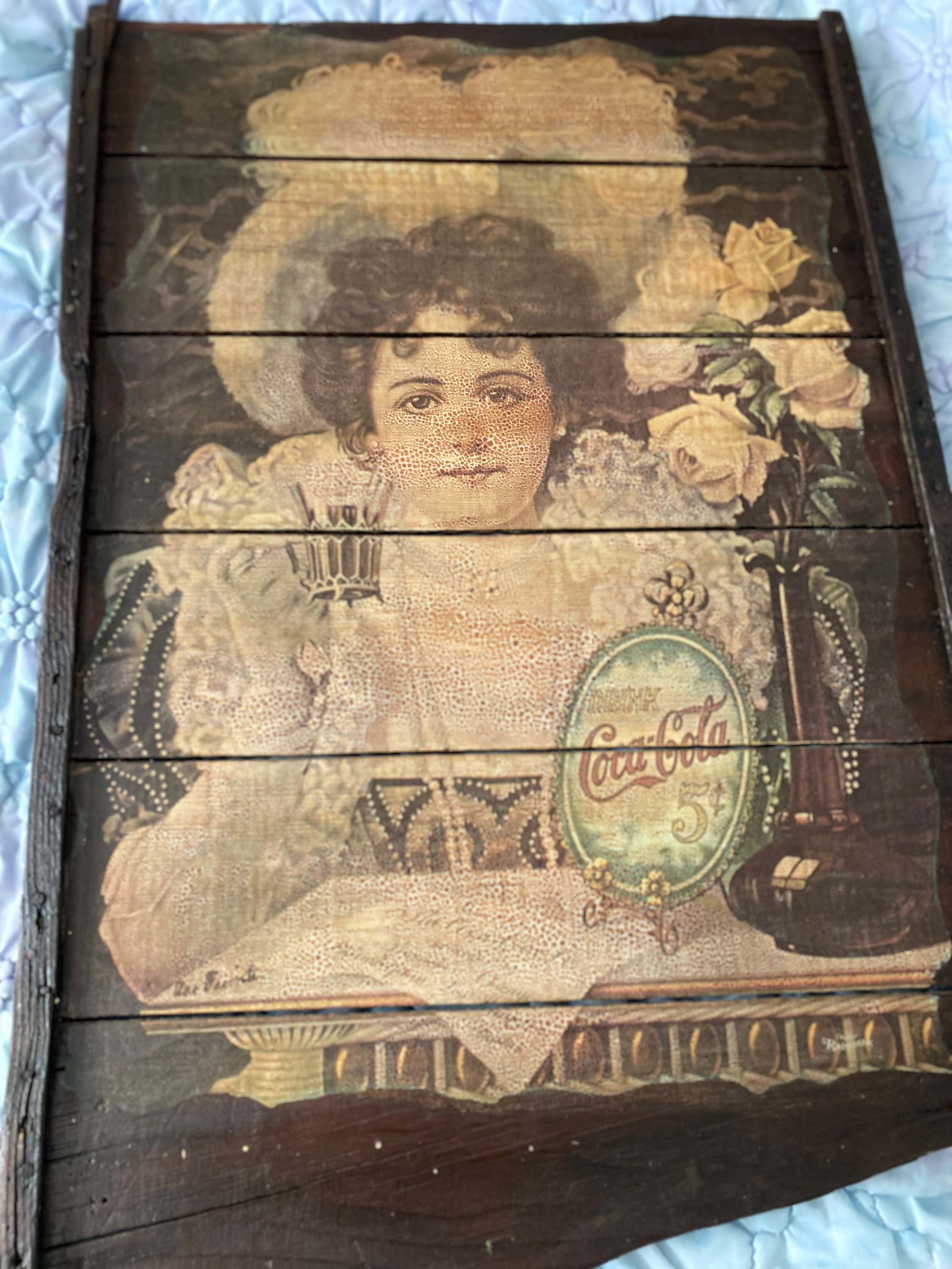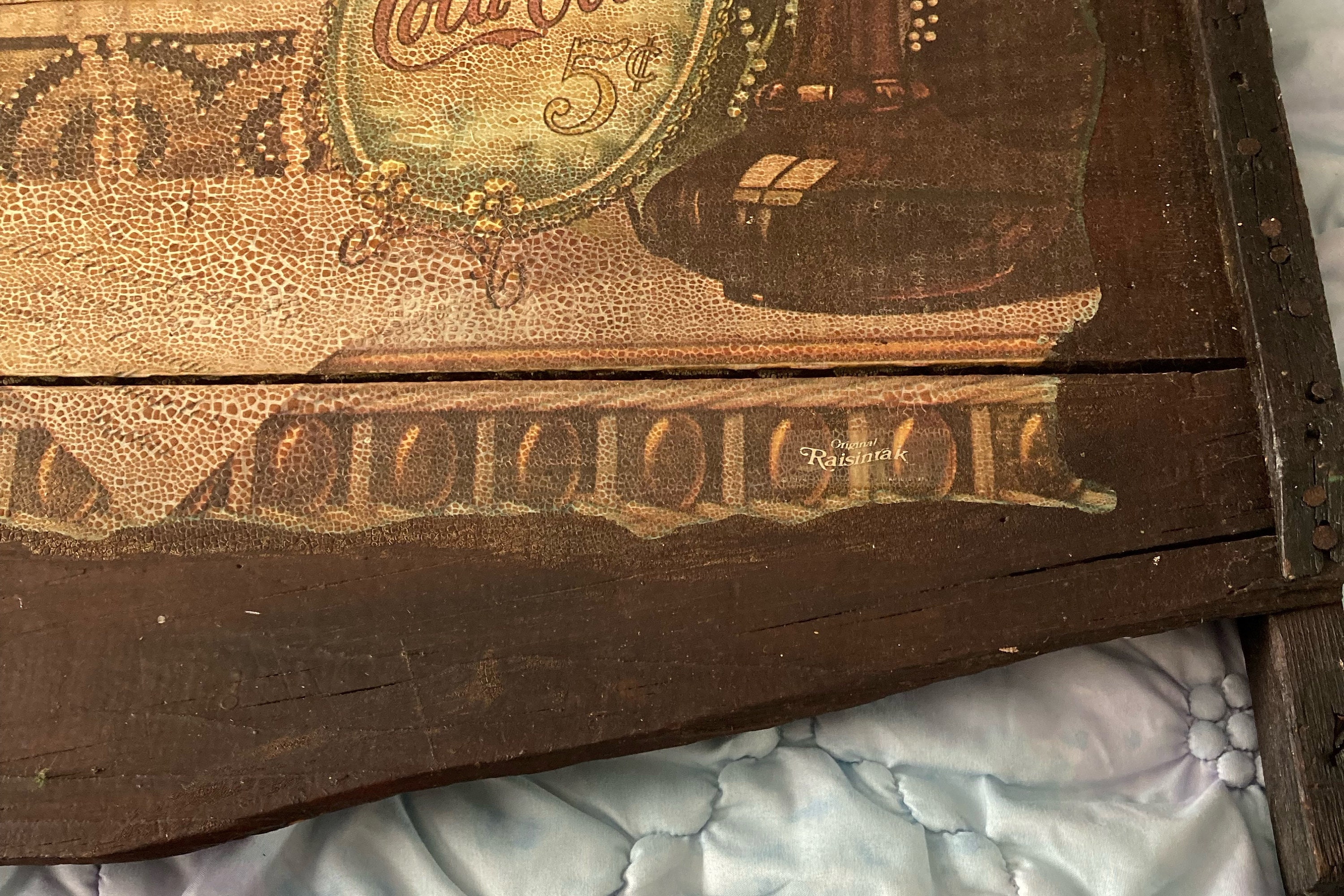 A vintage ‘Original Raisinrak’ decoupage plaque. The wooden advertising poster for Coca-Cola featuring a young lady has been painted to the surface and . There is a small label near the lower right corner reading ‘Original Raisinrak/1974 Four Seasons Marketers Inc.’.