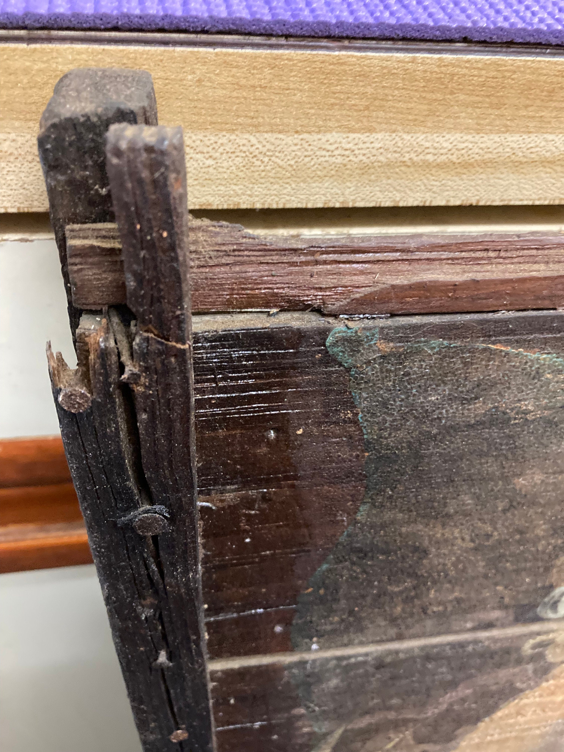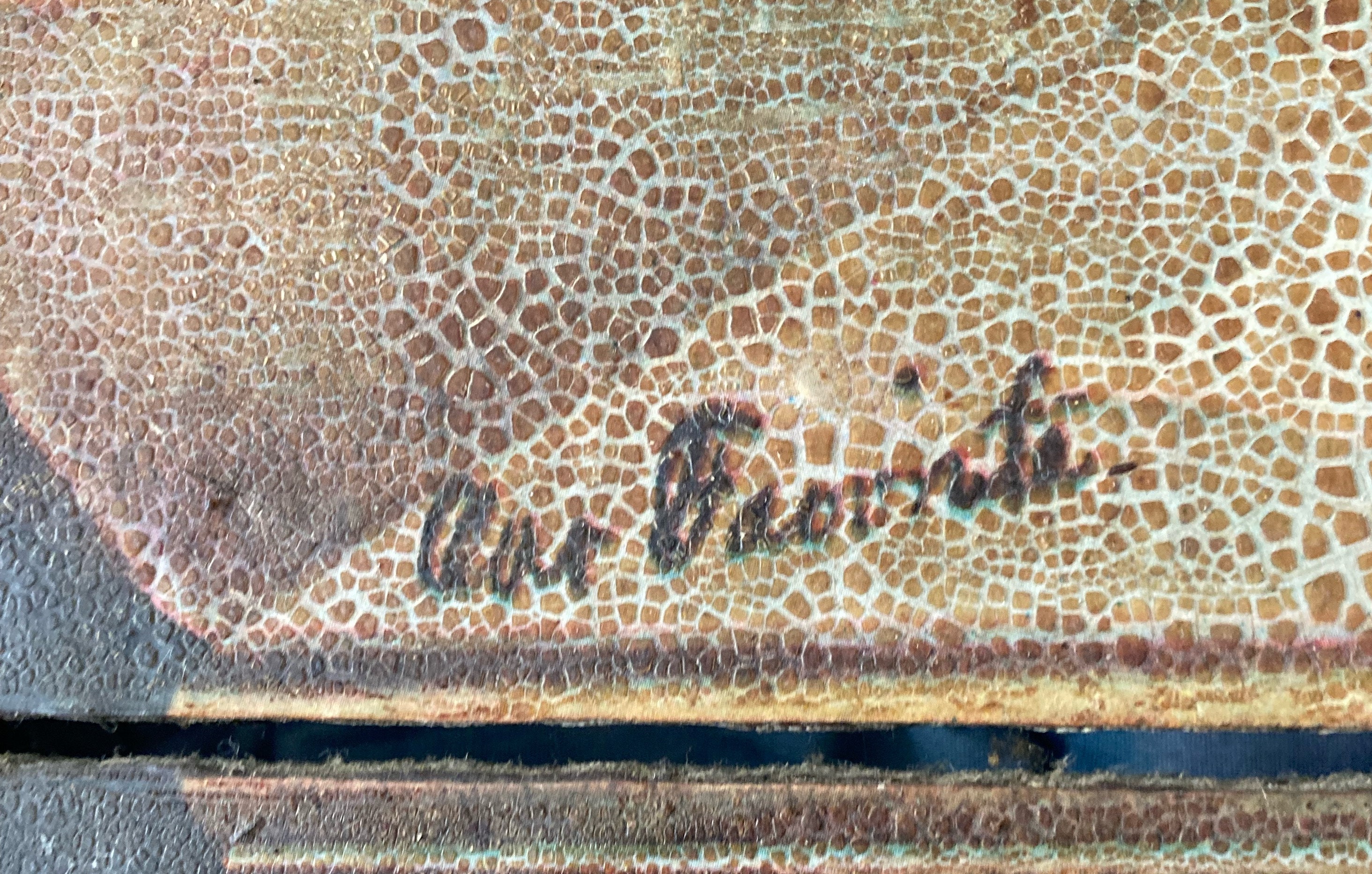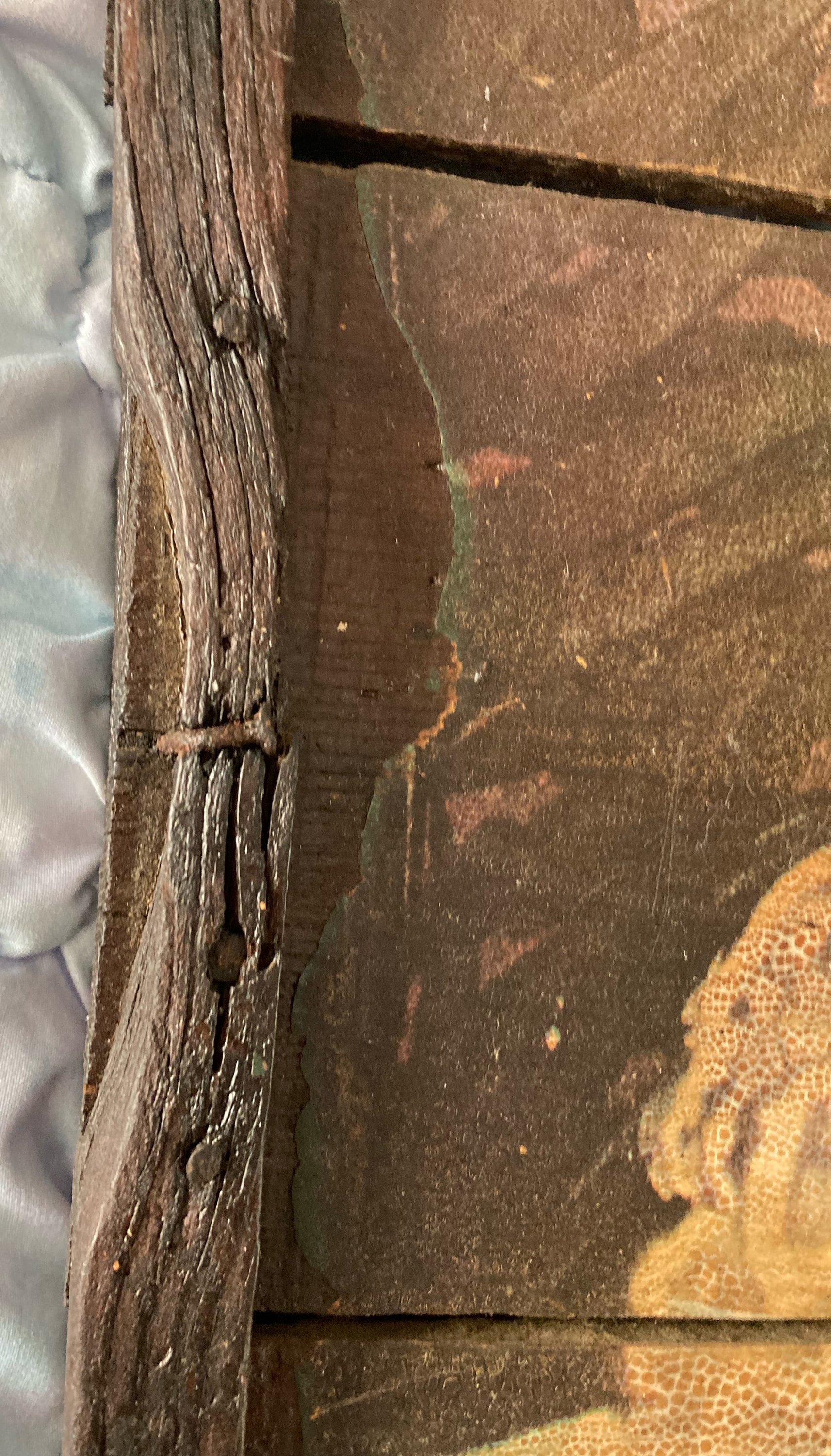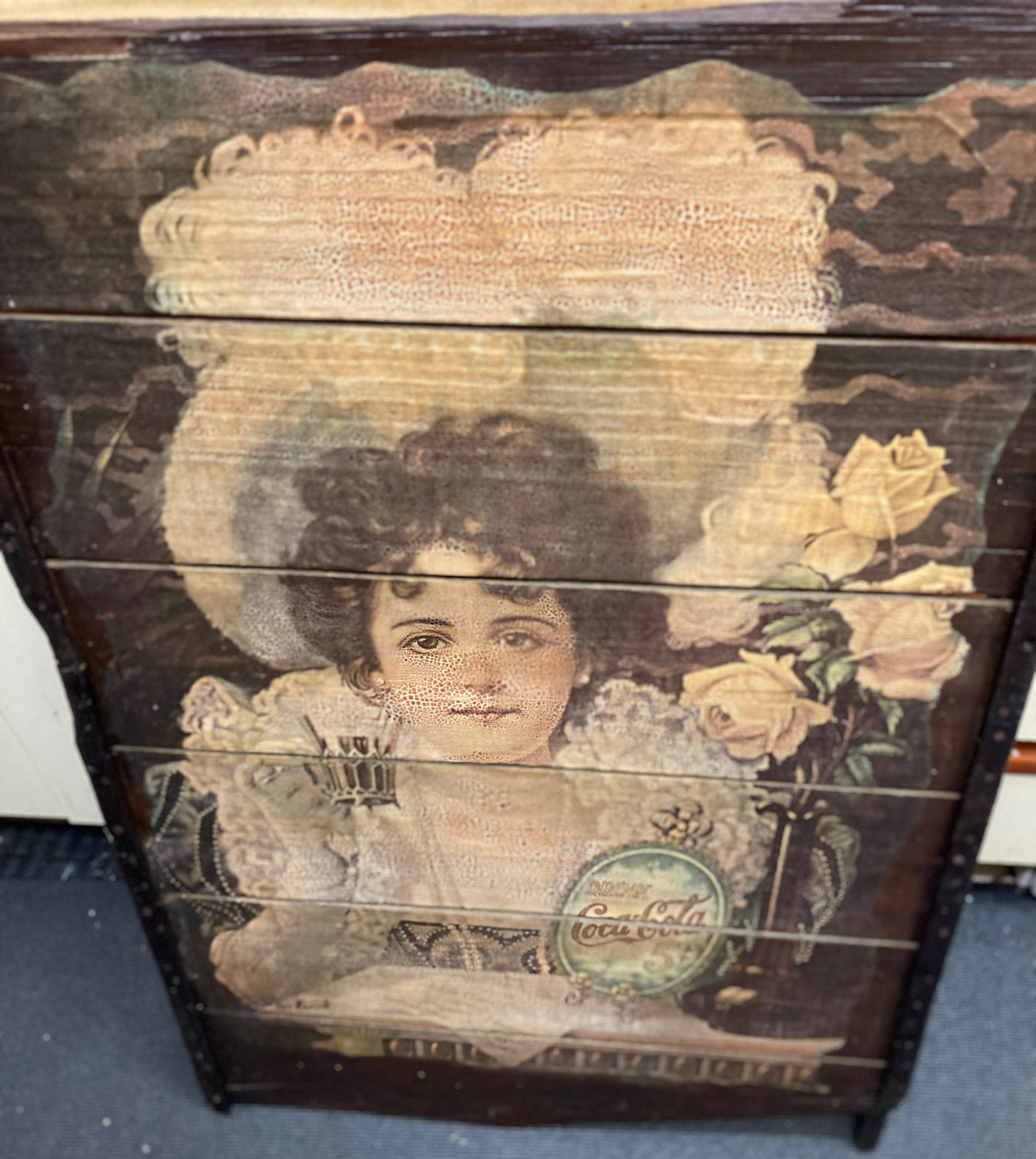 A vintage ‘Original Raisinrak’ decoupage plaque. The wooden advertising poster for Coca-Cola featuring a young lady has been painted to the surface and . There is a small label near the lower right corner reading ‘Original Raisinrak/1974 Four Seasons Marketers Inc.’.