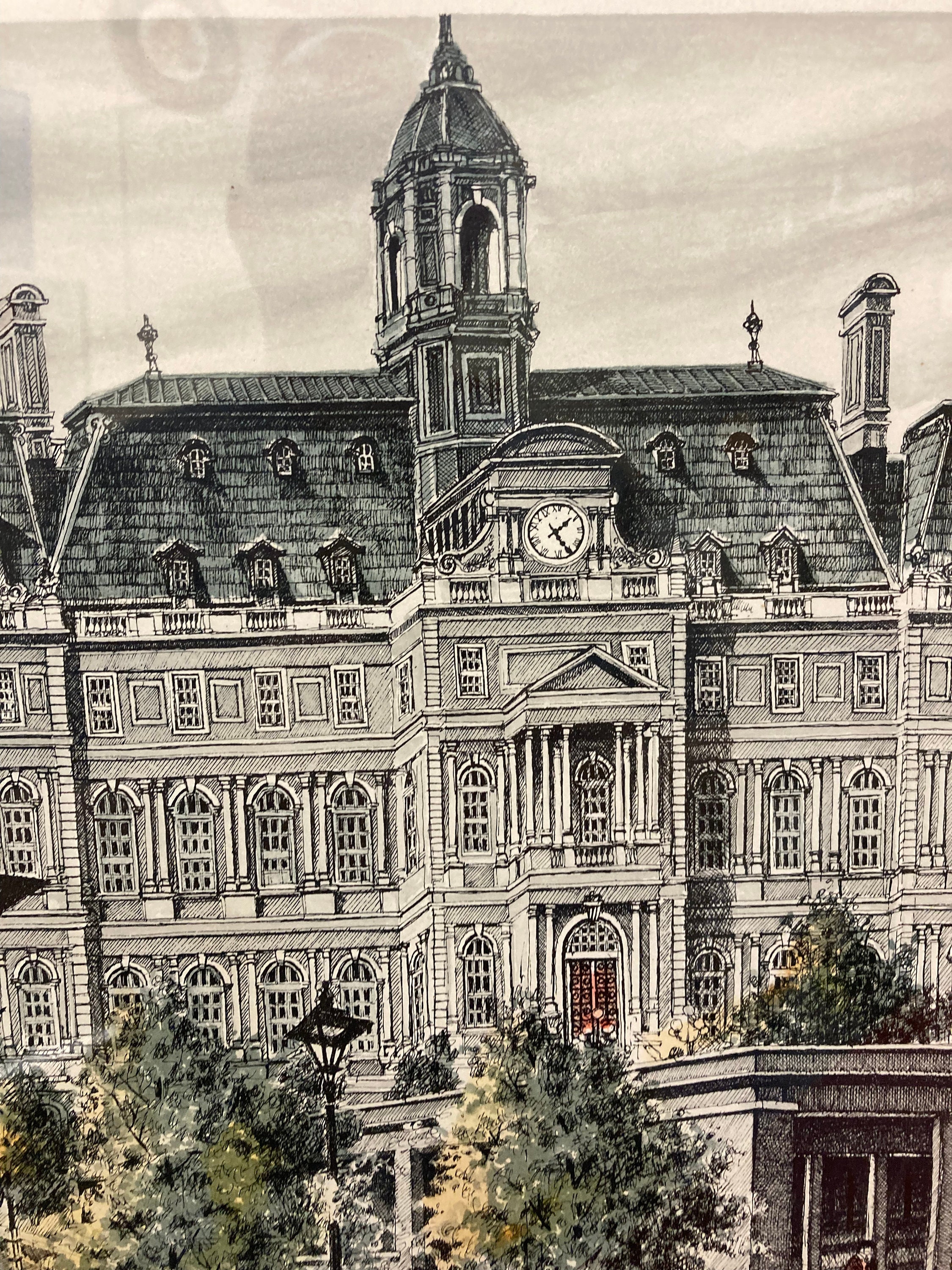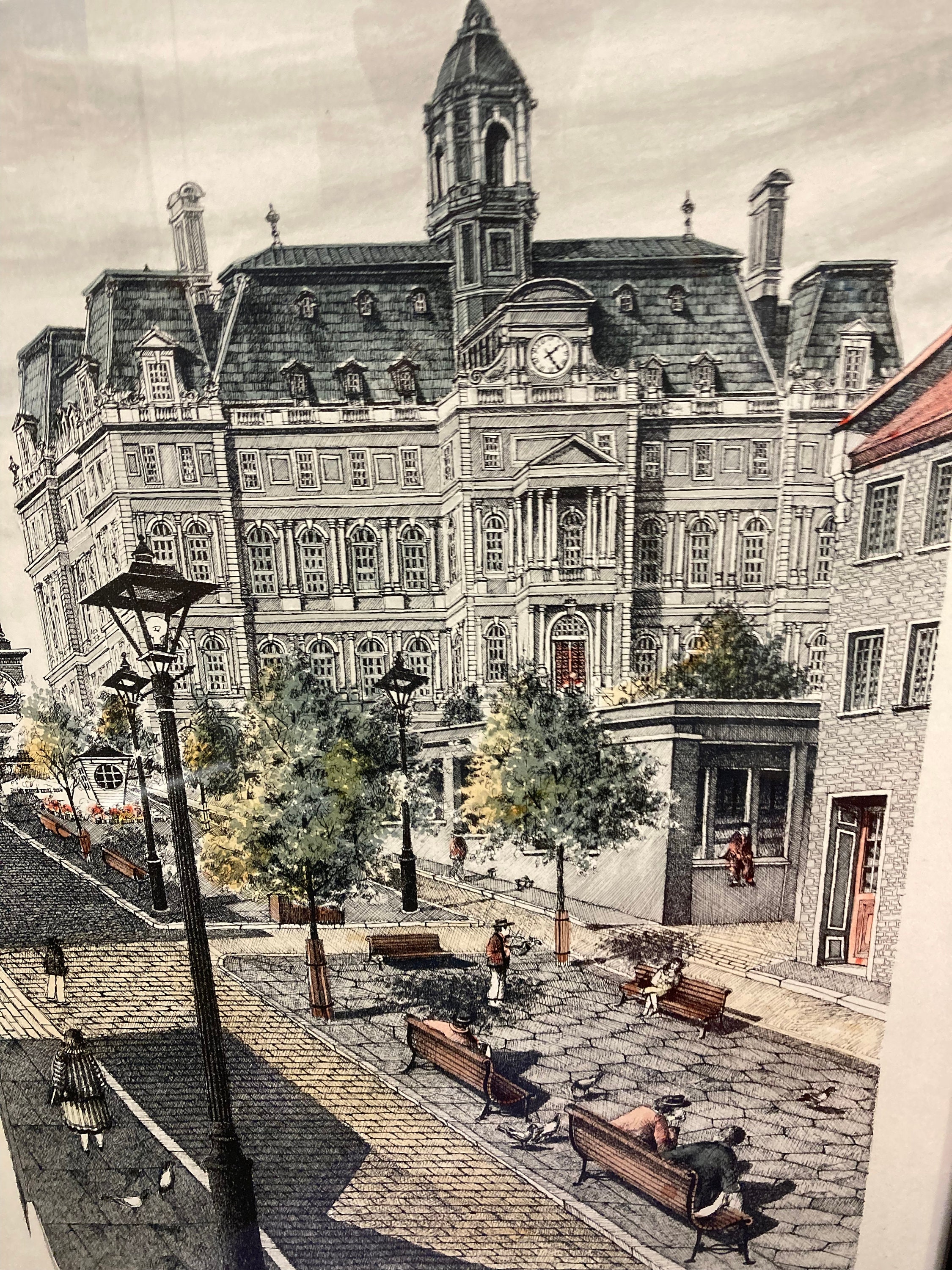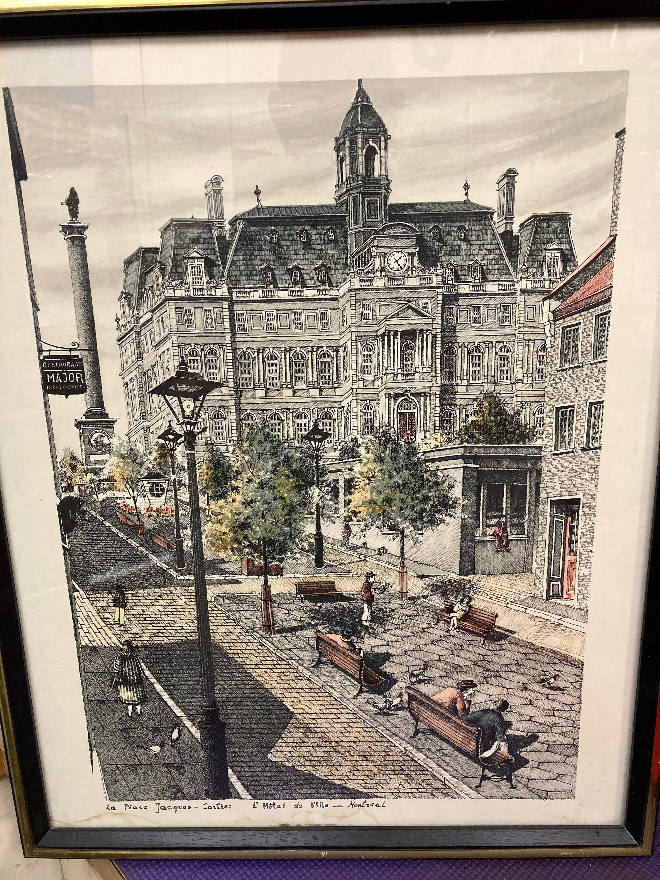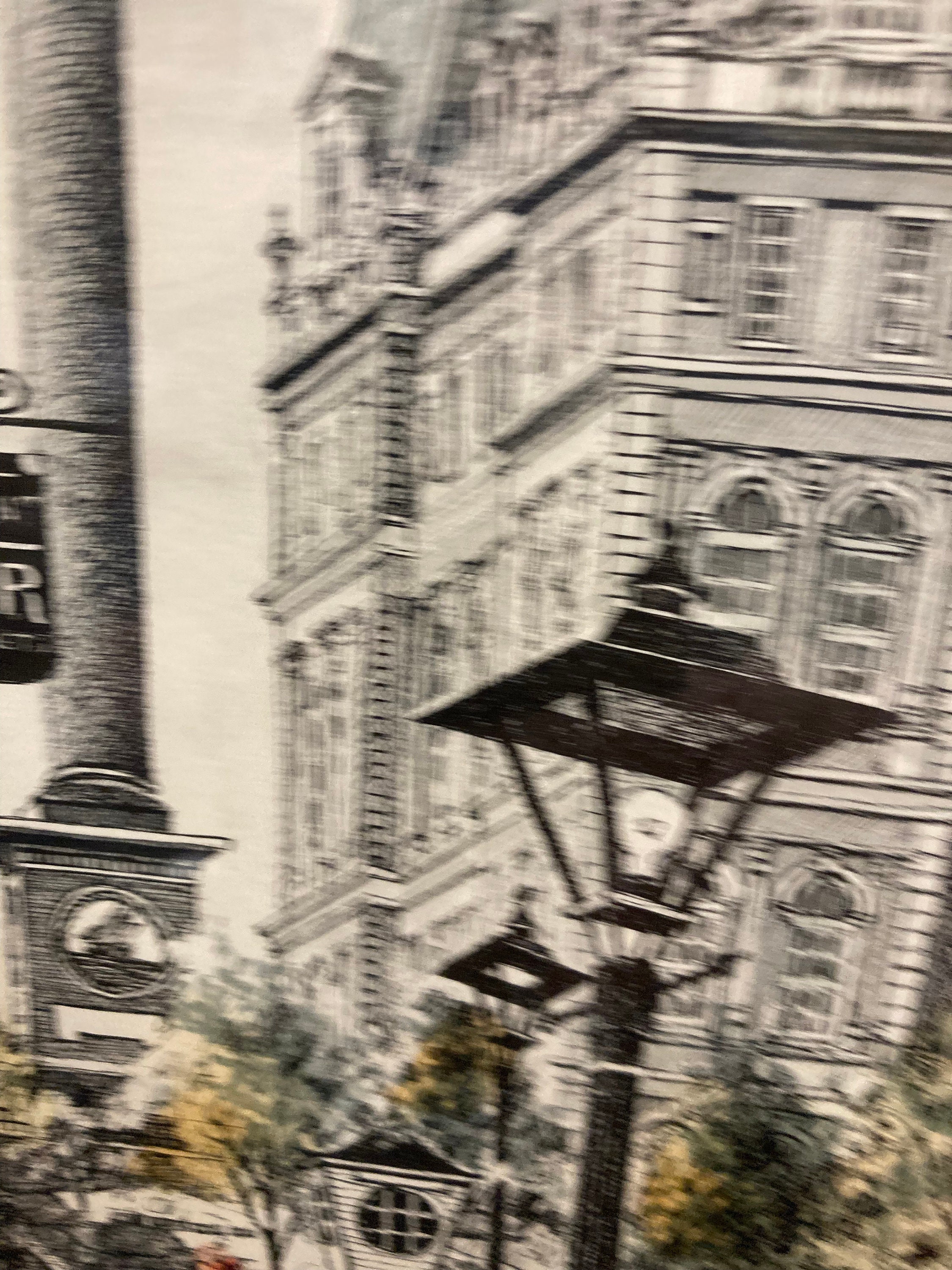 Hand colored etching of "La Place Jacques - Cartier L' Hotel de Villa - Montreal