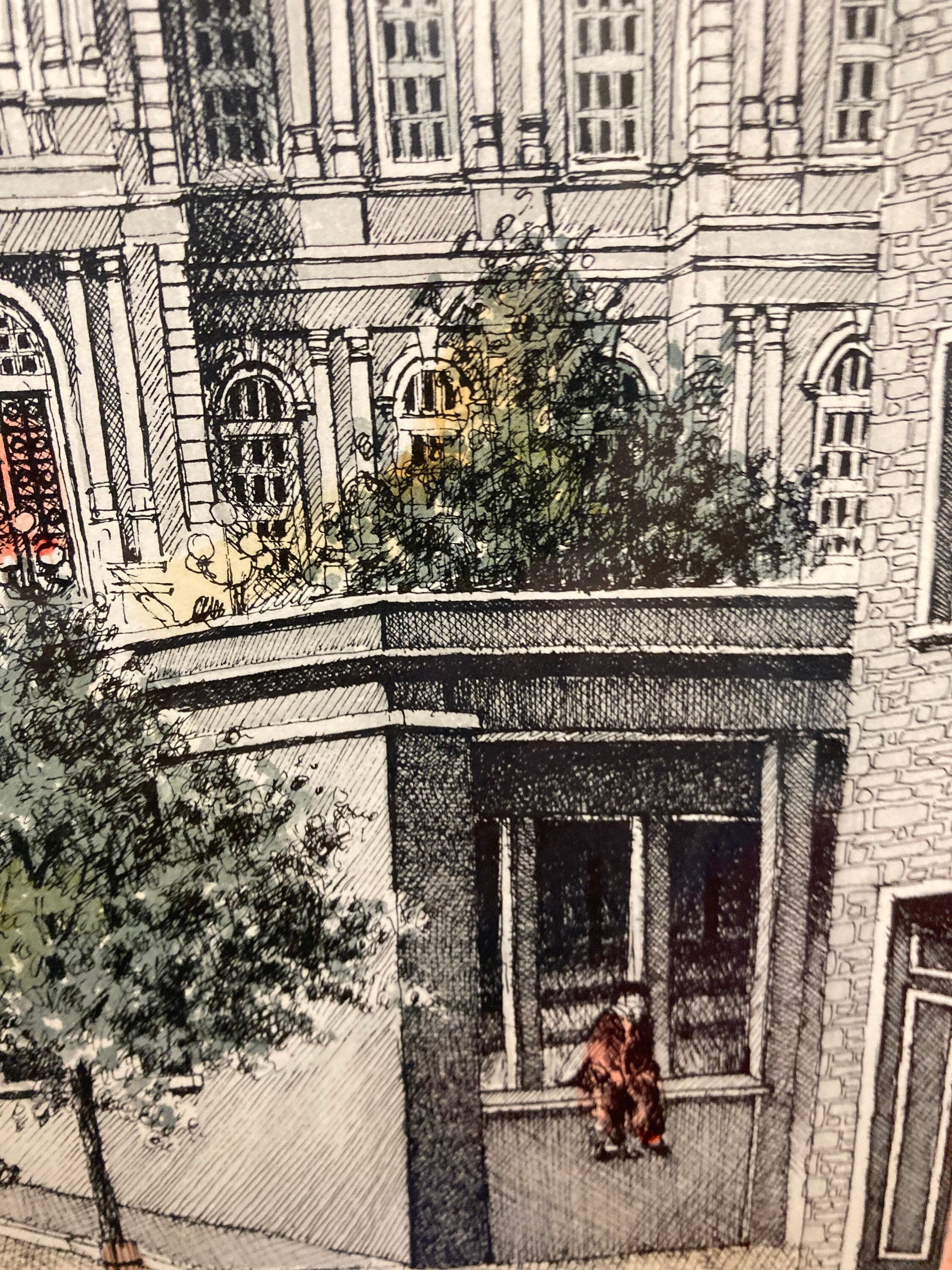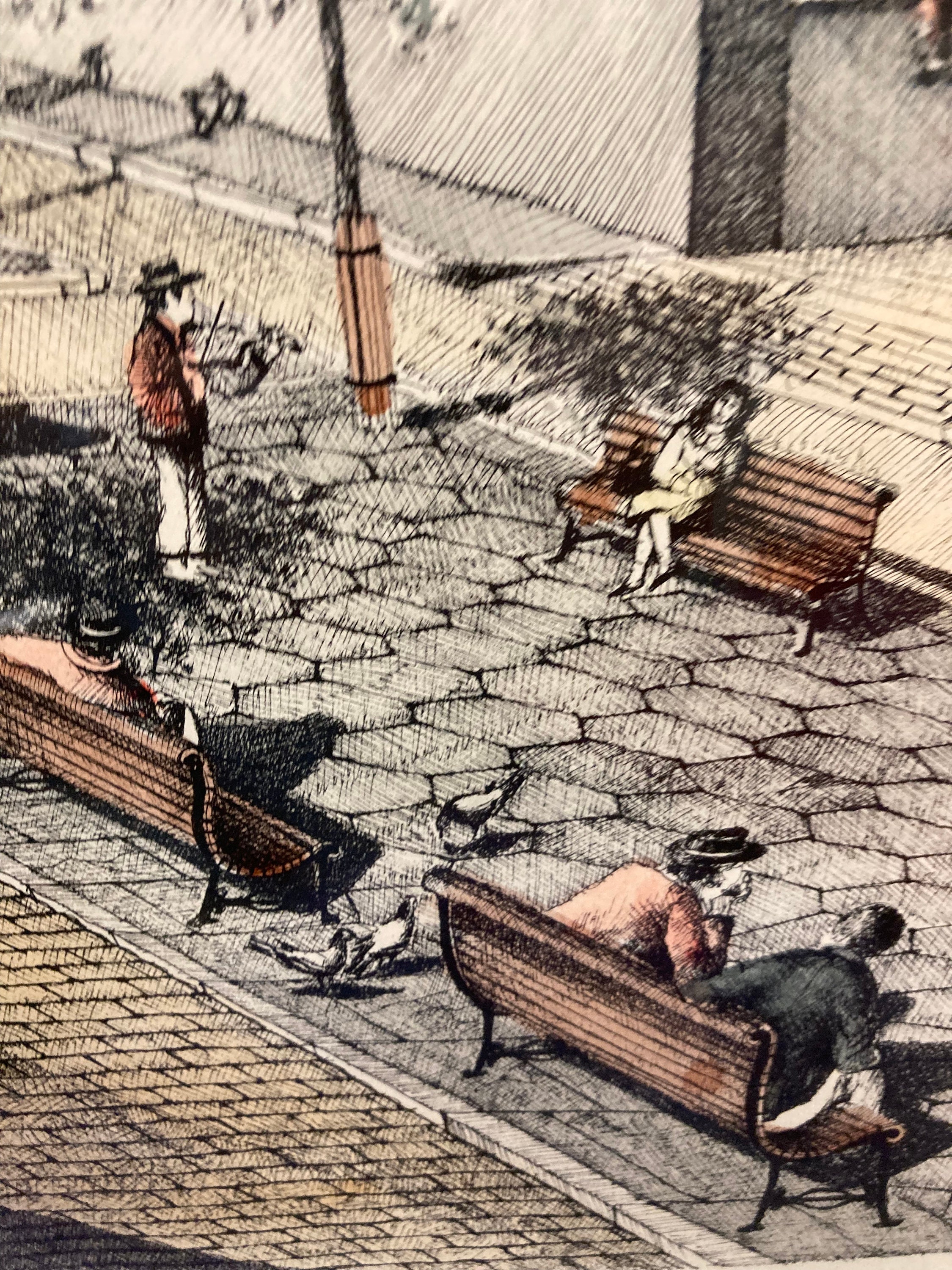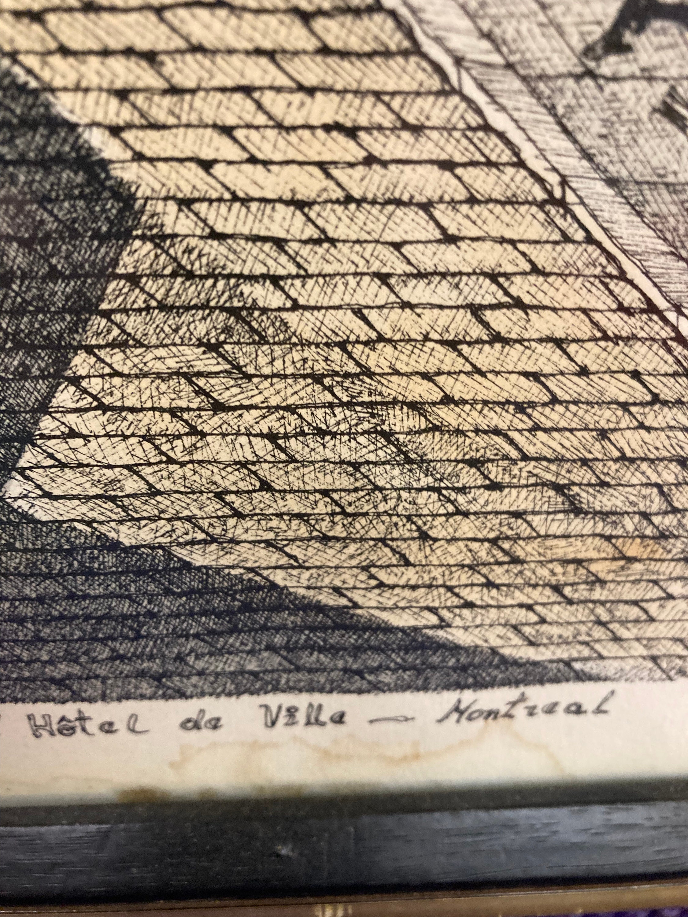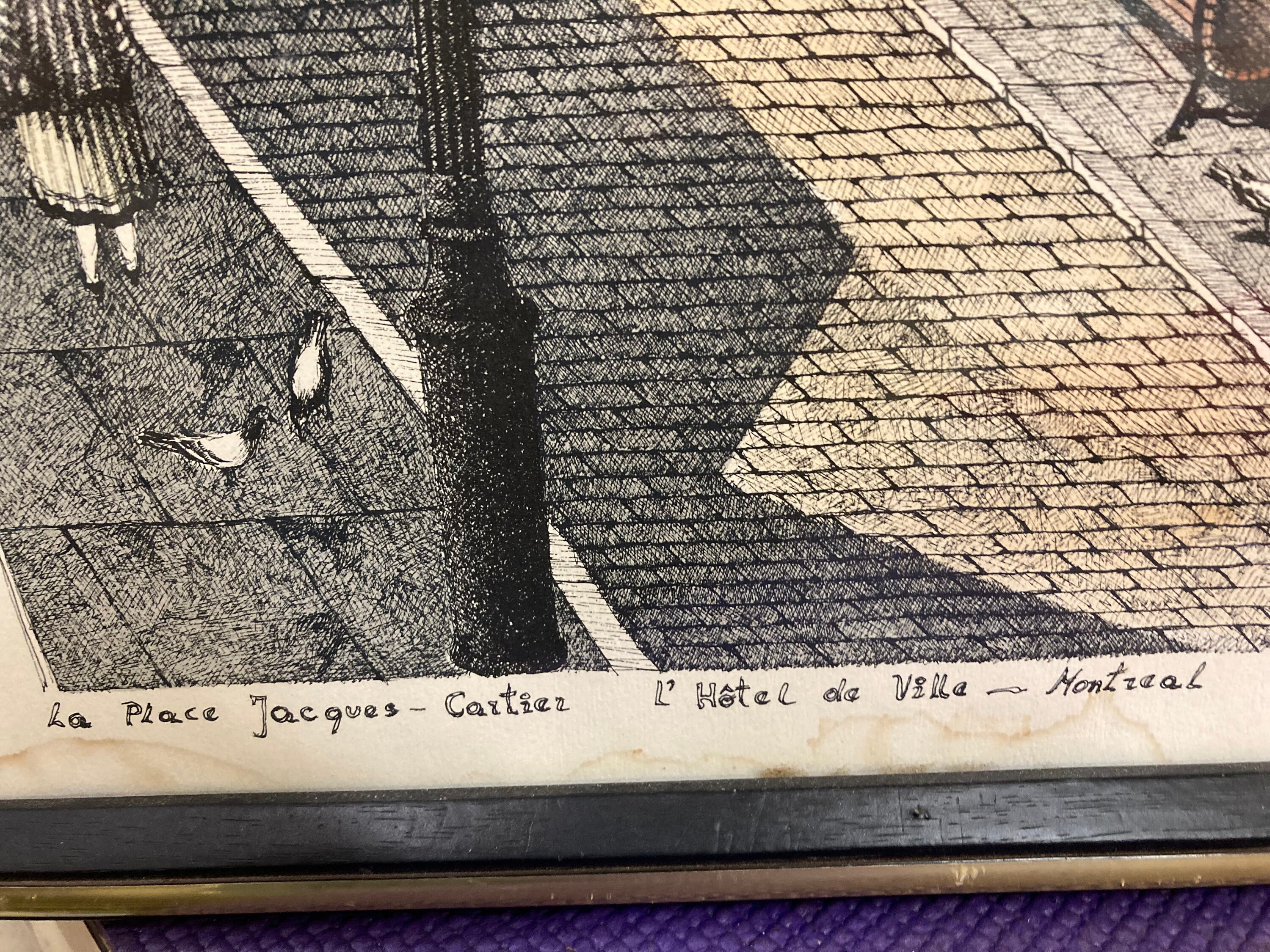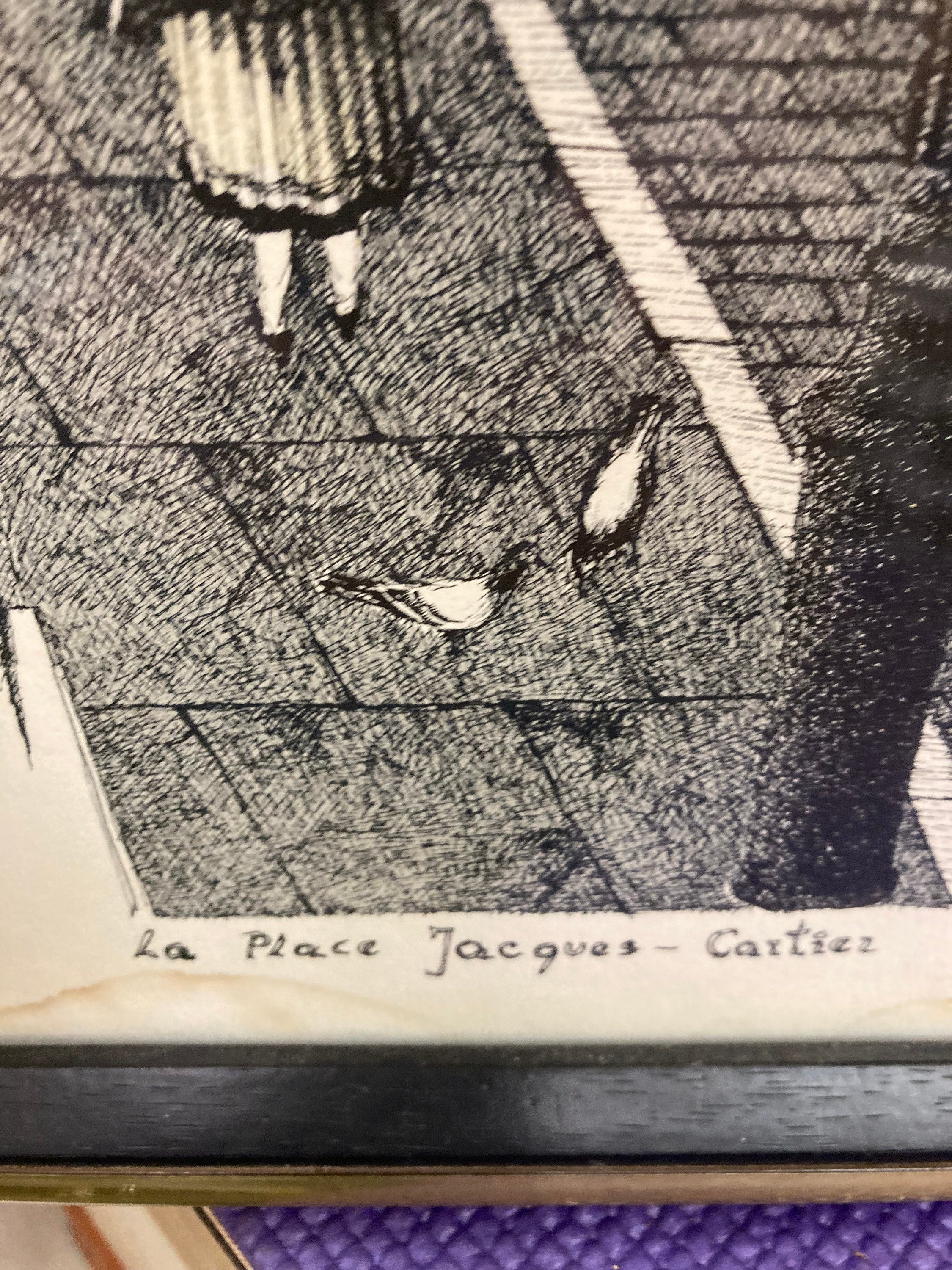 Hand colored etching of "La Place Jacques - Cartier L' Hotel de Villa - Montreal