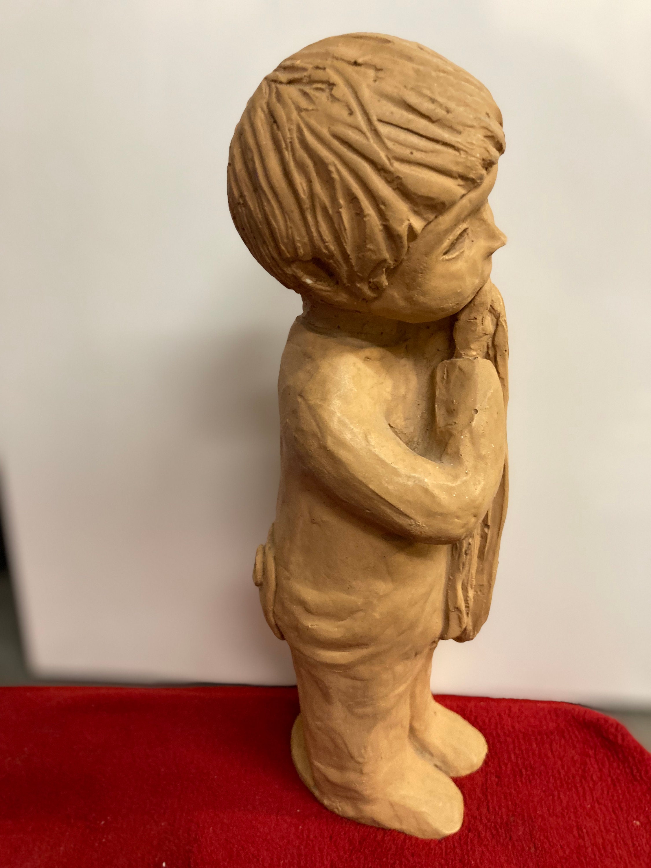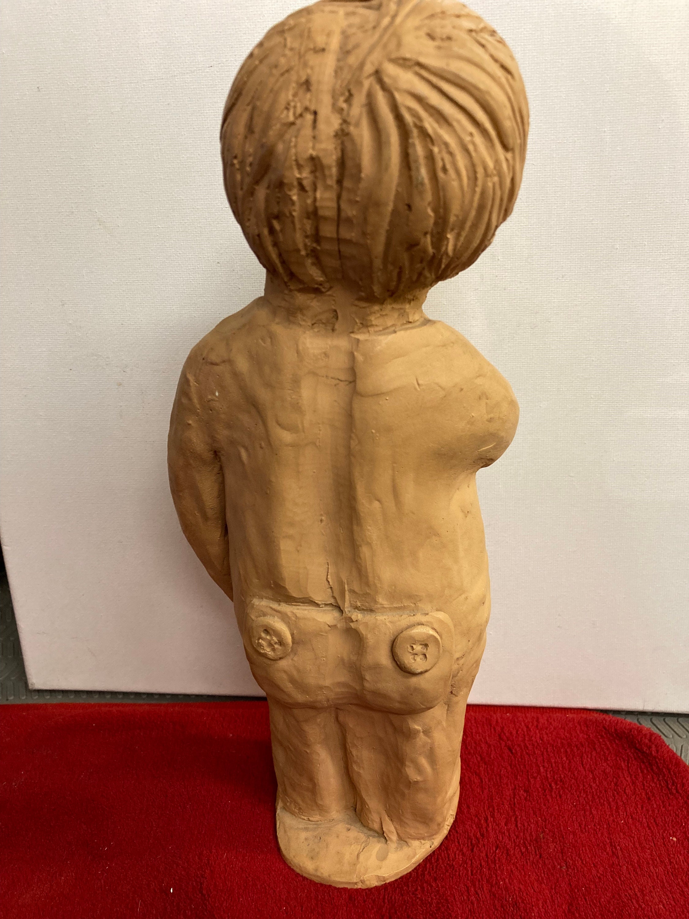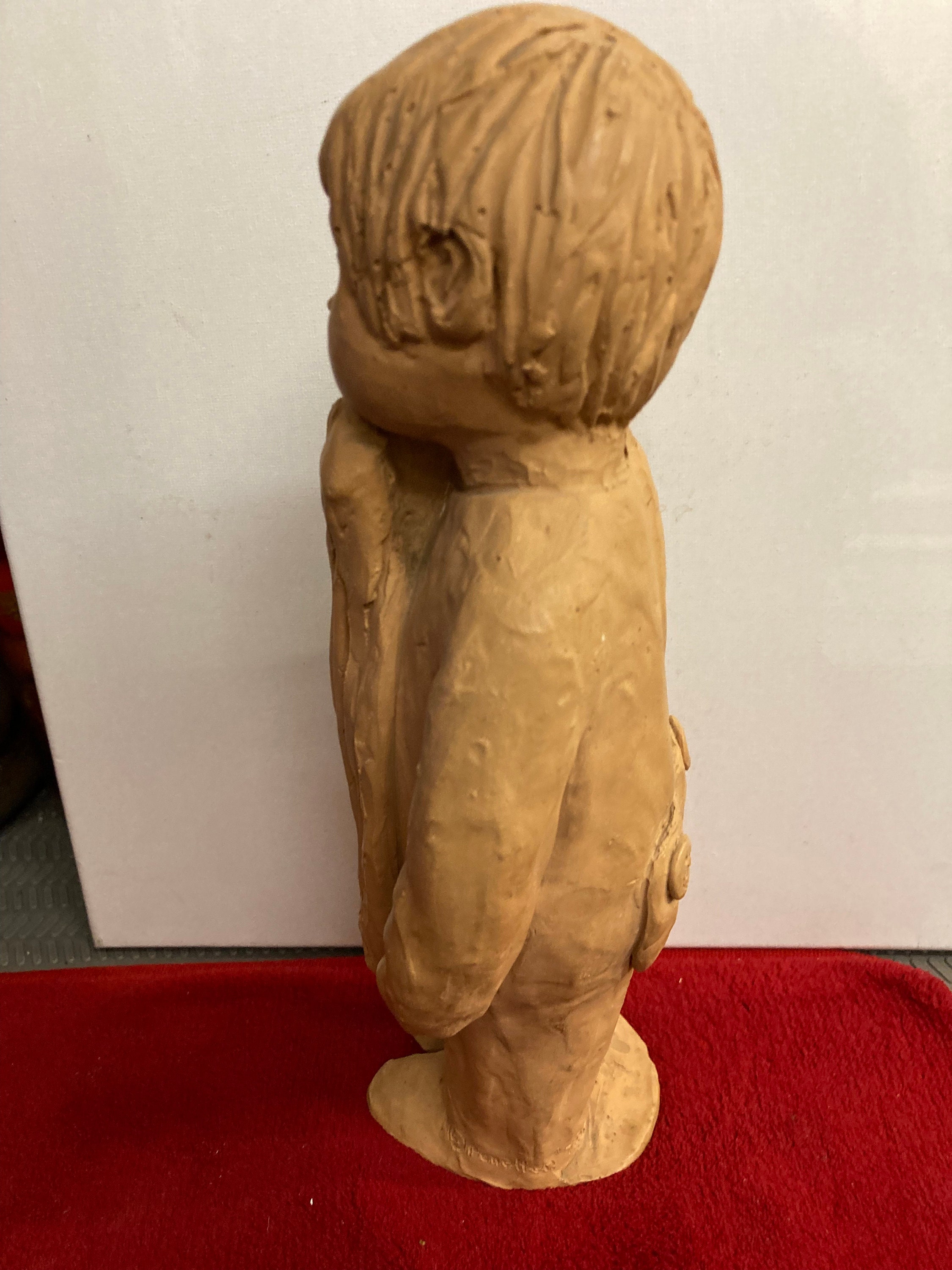 Handmade Vintage Clay Sculpture of a Child, Sined, '73Weight: 2.5 lbs10 3/4 " tall x 4 1/2 " wide x 3" deepSigned by ArtistInitialed: RSDated: 1973Perfect Vintage ConditionNo Damages, chips, or Cracks