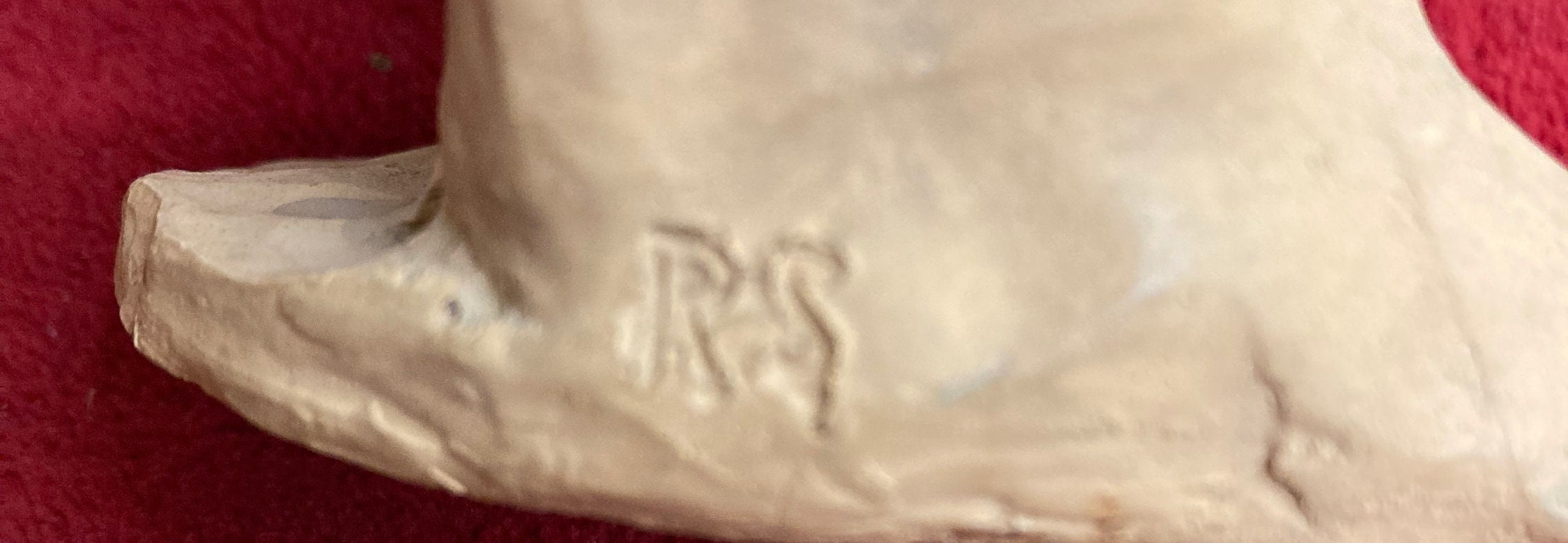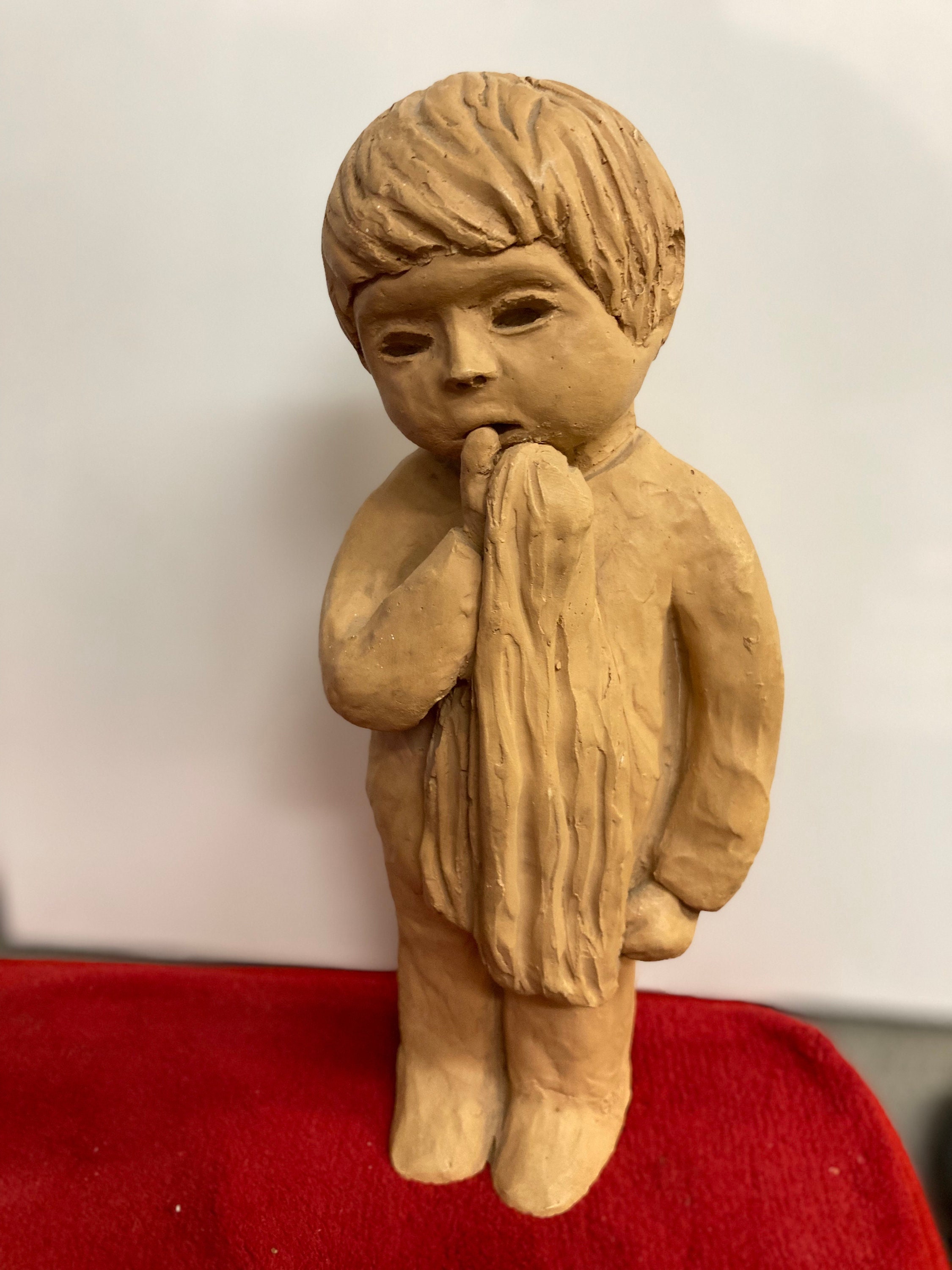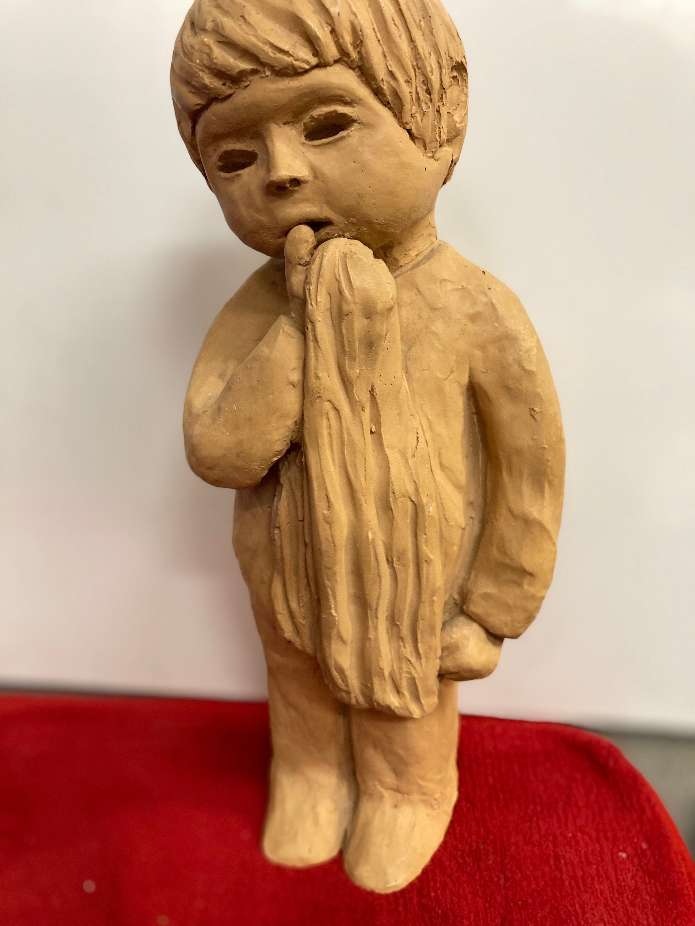 Handmade Vintage Clay Sculpture of a Child, Sined, '73Weight: 2.5 lbs10 3/4 " tall x 4 1/2 " wide x 3" deepSigned by ArtistInitialed: RSDated: 1973Perfect Vintage ConditionNo Damages, chips, or Cracks