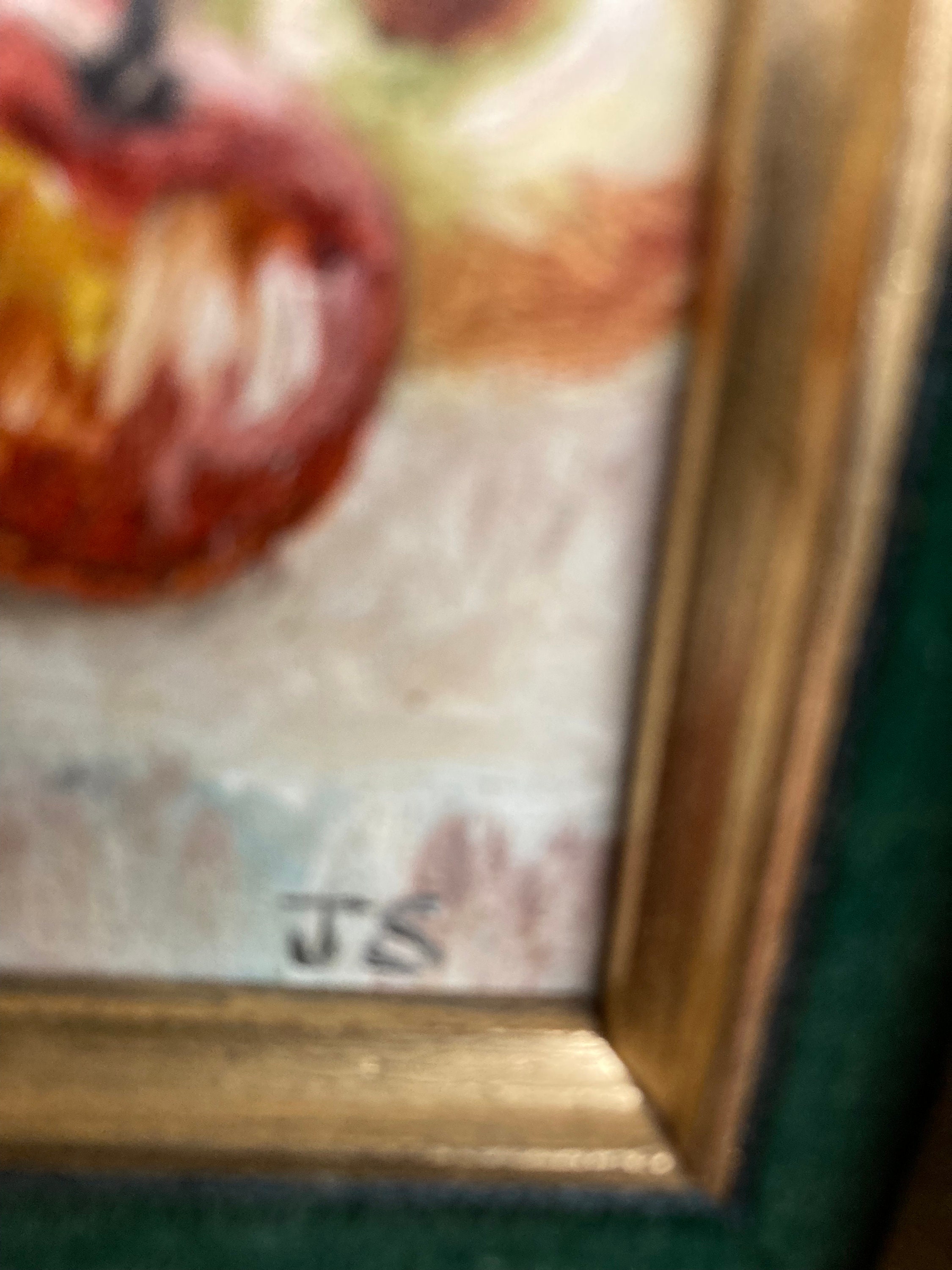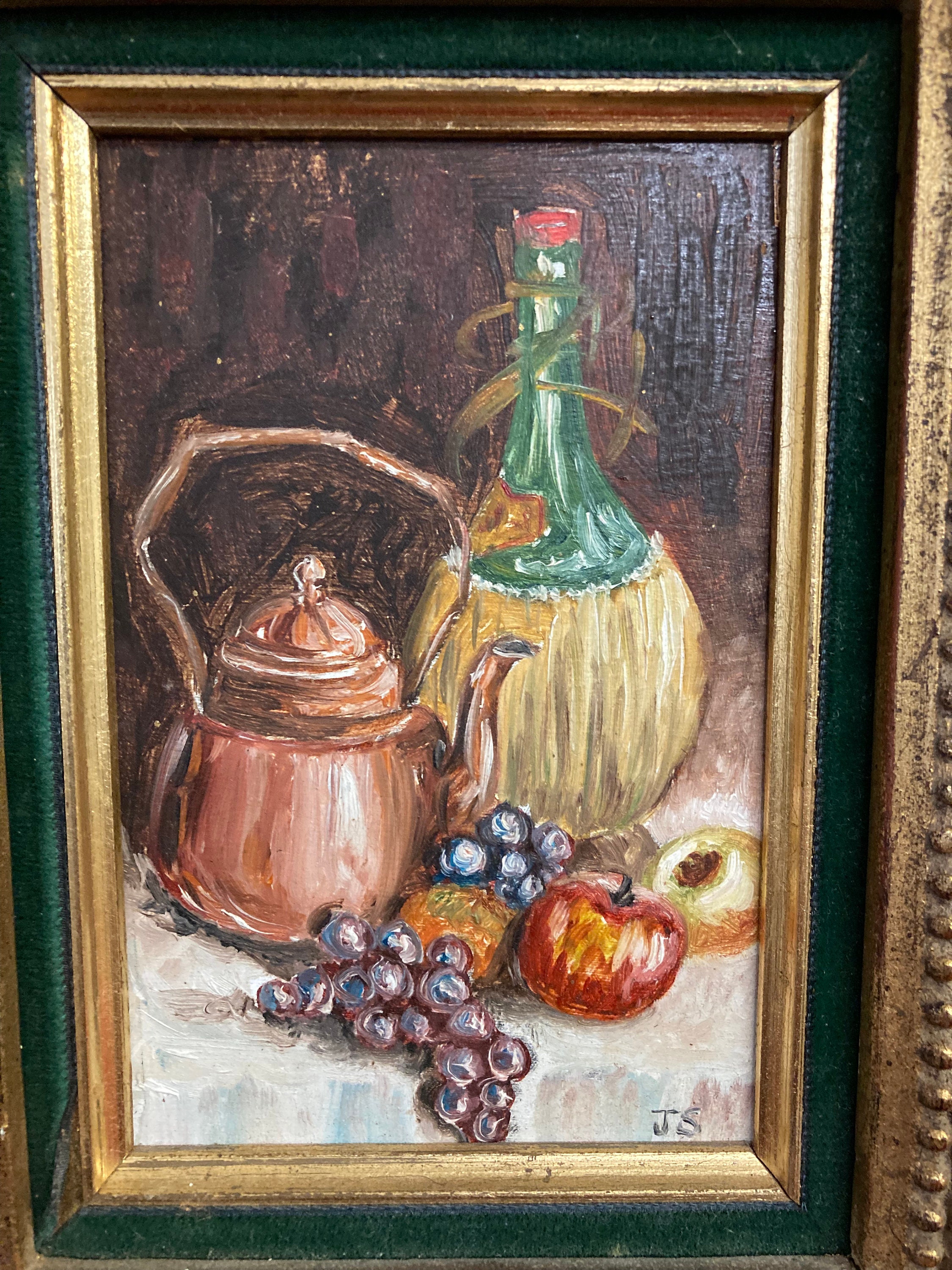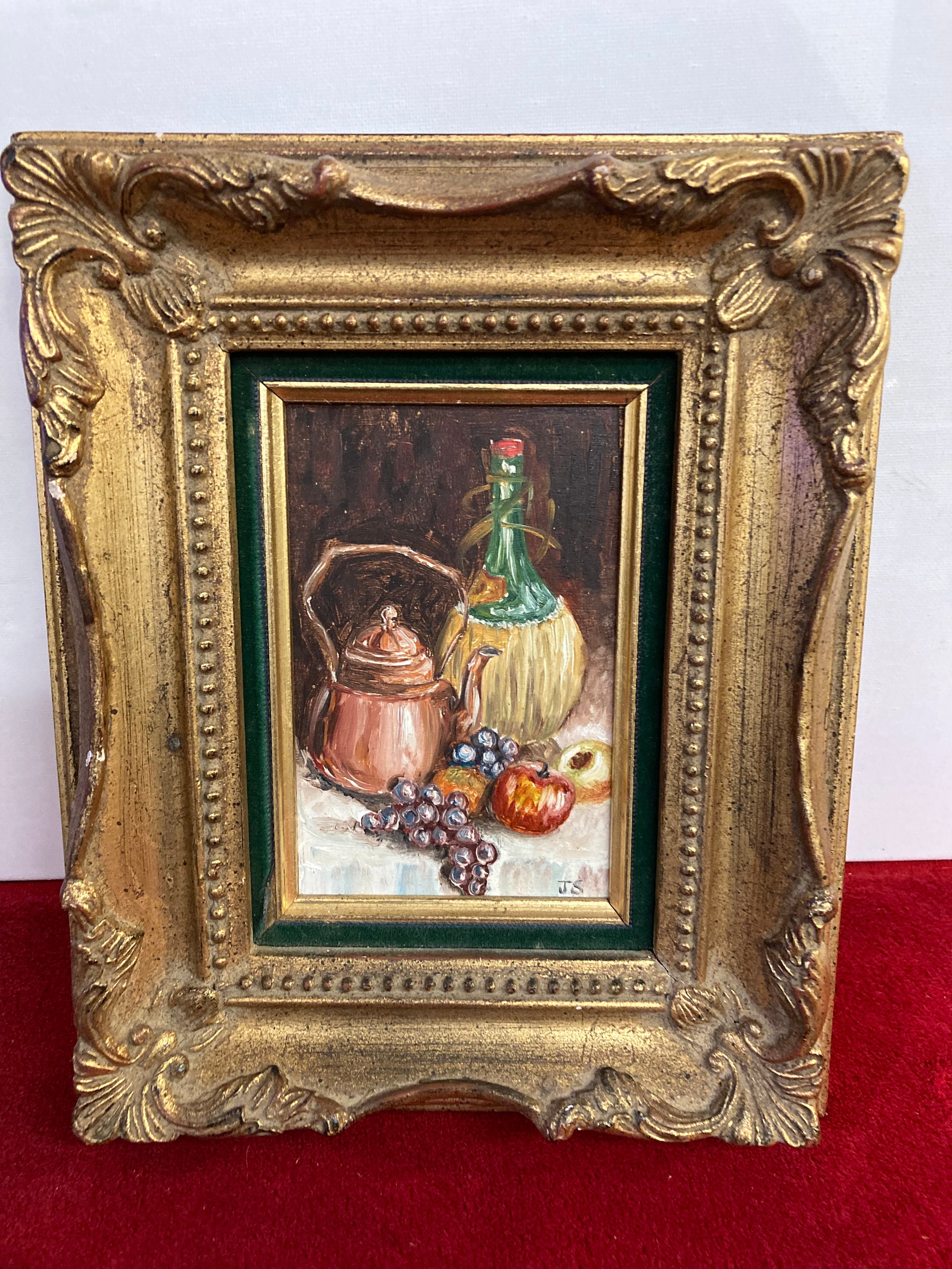 Mid 20th Century Tabletop Still Life Acrylic Painting with Fruit, Wine and Copper Tea Kettle, Framed