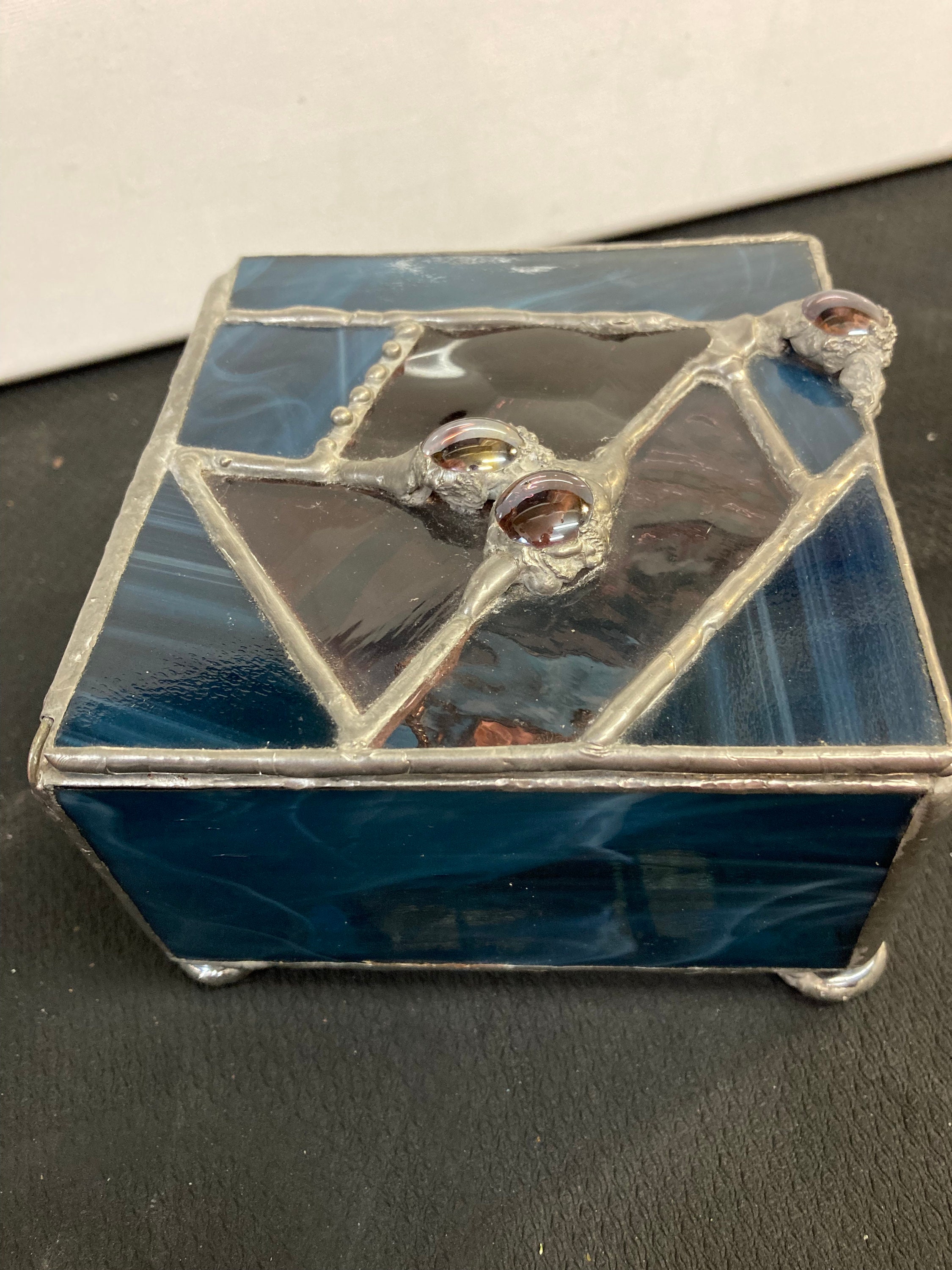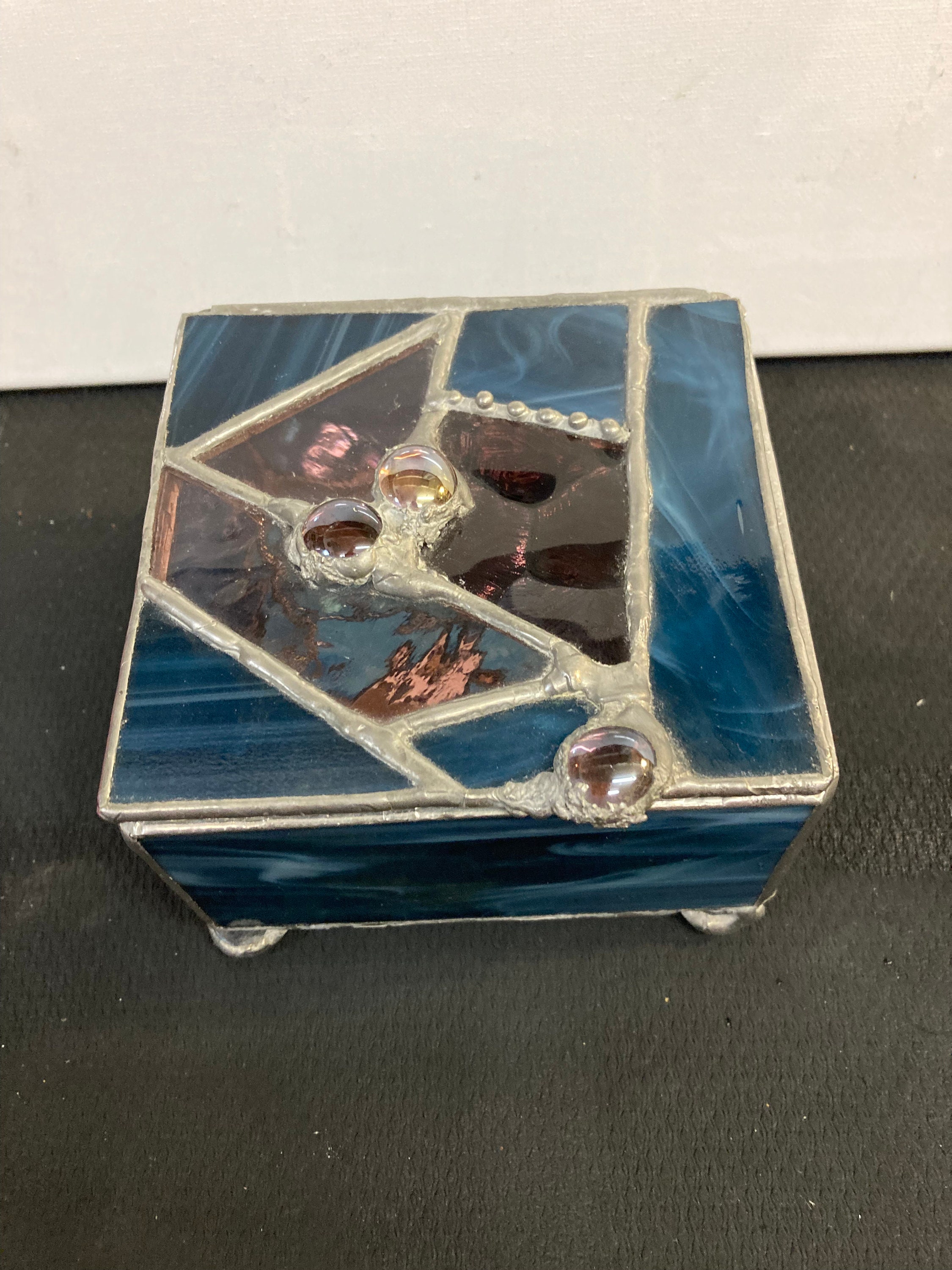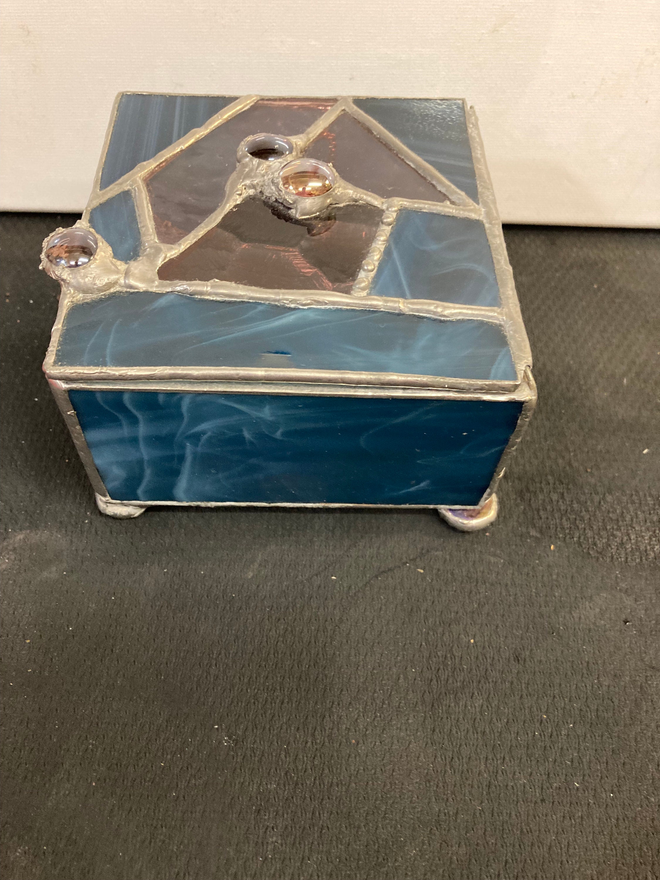 Handmade Stained Glass Jewlery Box4,25" wide x 4 " deep x 2.5" tallMade of Glass Abstract designSaphire Blue Color with crystal brown accentVery well made with no damagesVery Good Condition