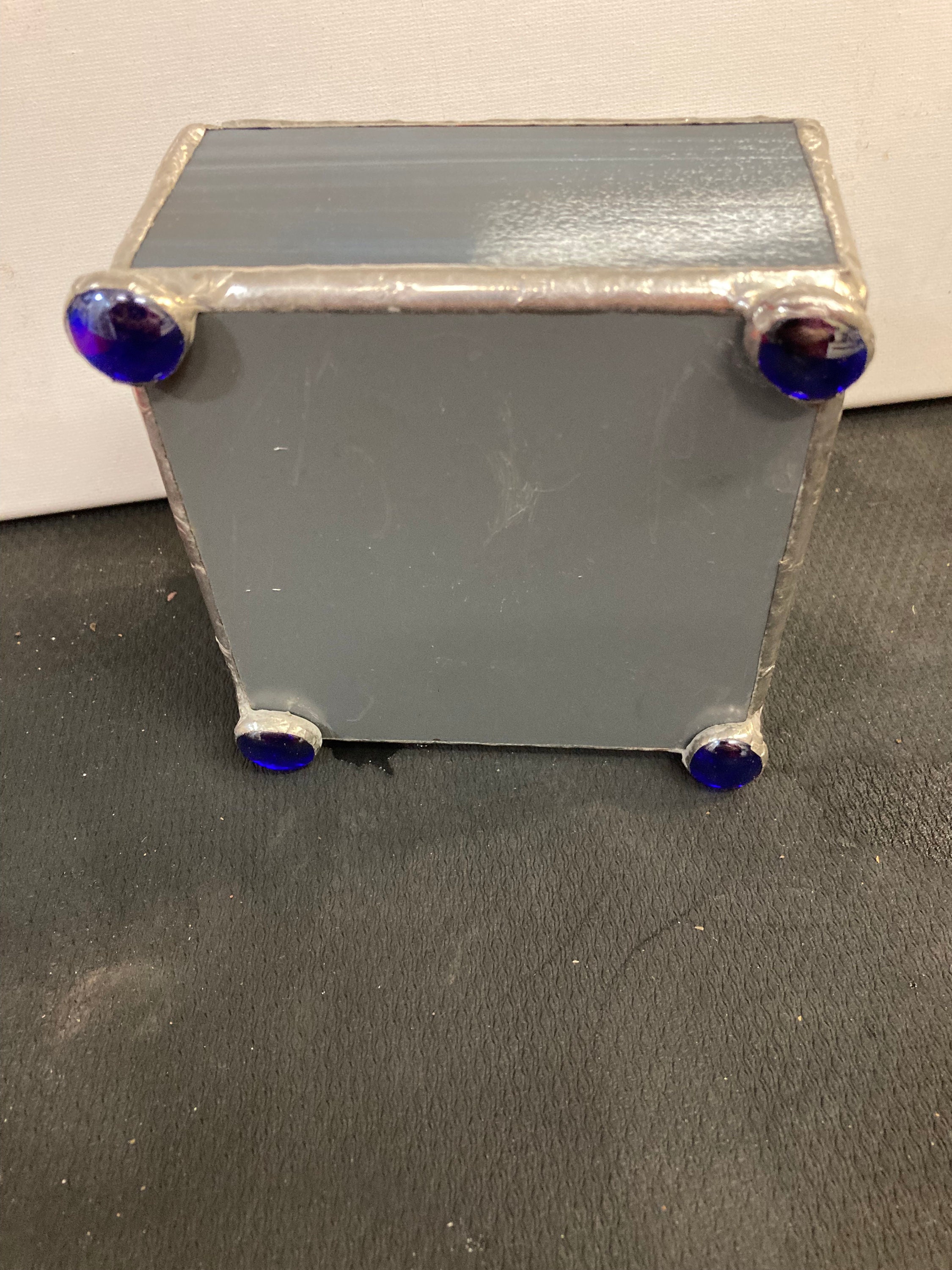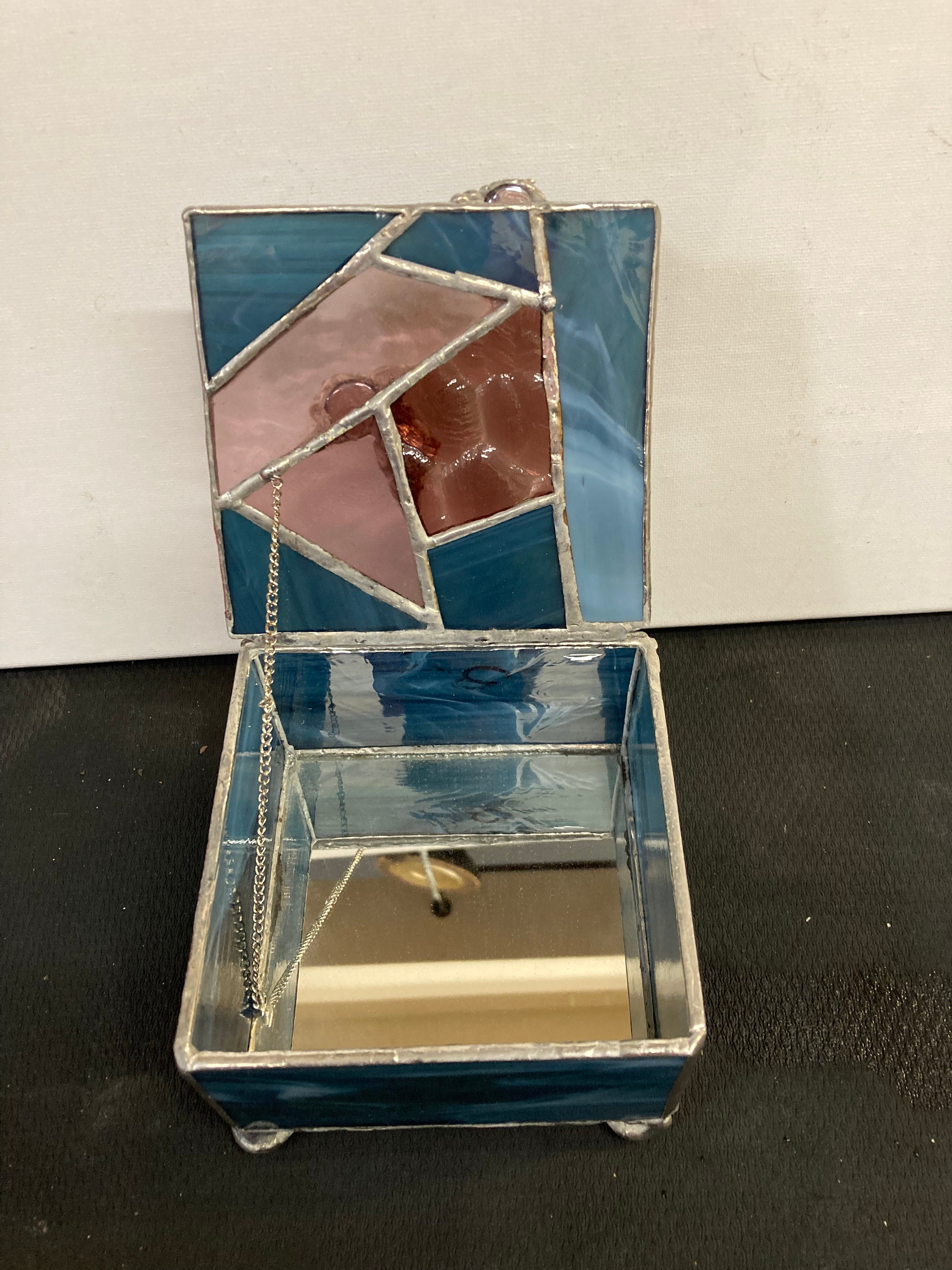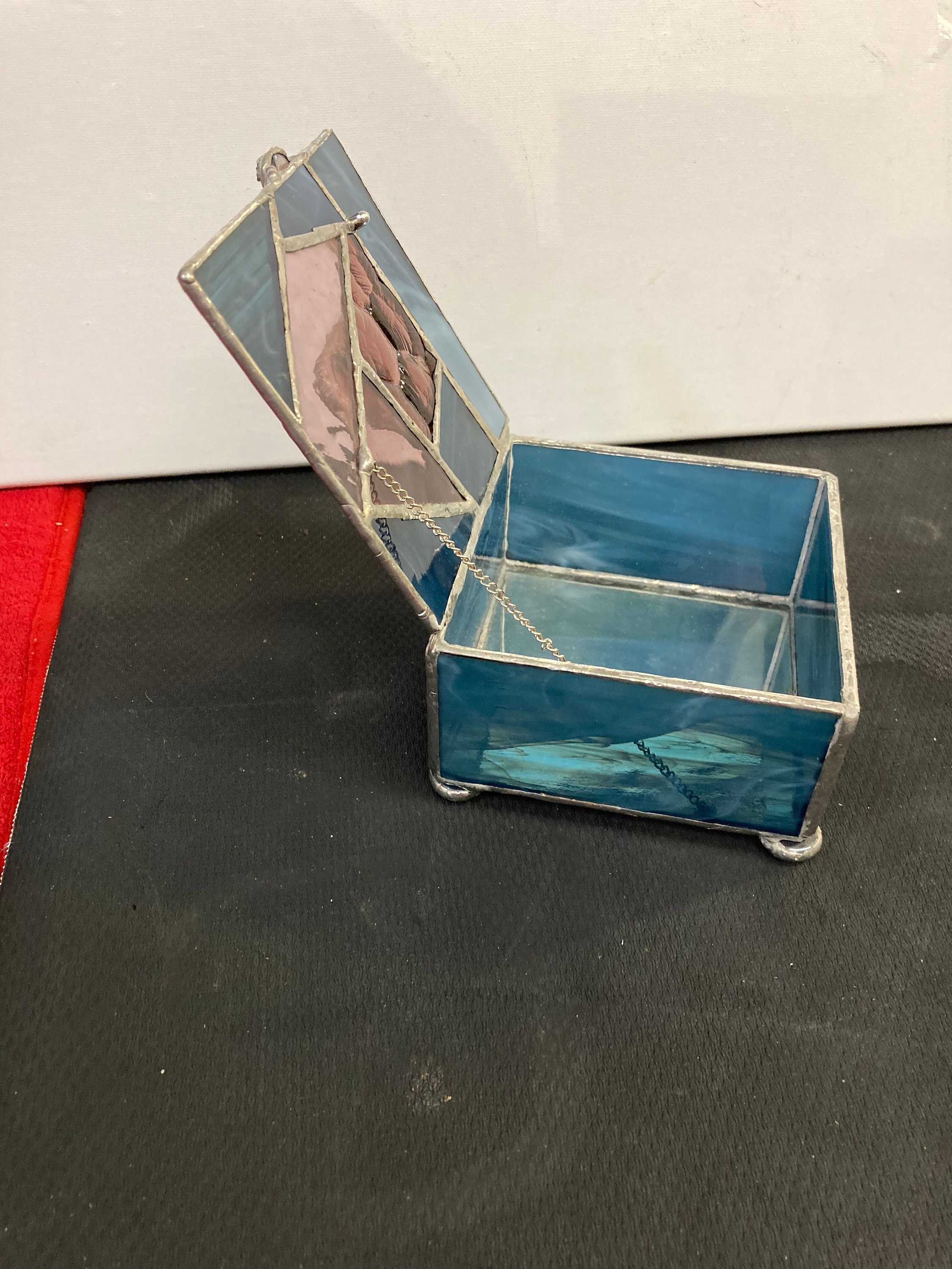 Handmade Stained Glass Jewlery Box4,25" wide x 4 " deep x 2.5" tallMade of Glass Abstract designSaphire Blue Color with crystal brown accentVery well made with no damagesVery Good Condition