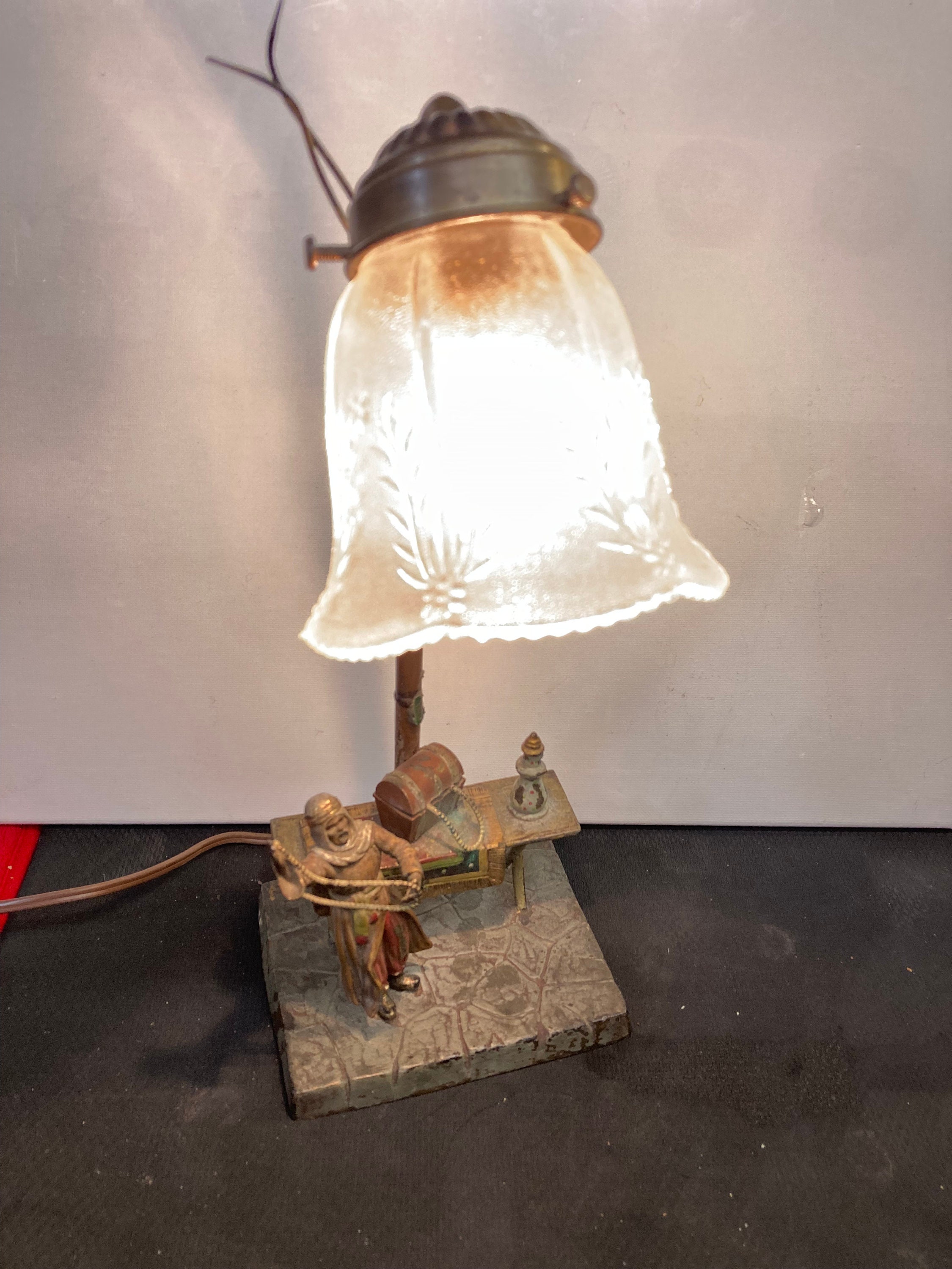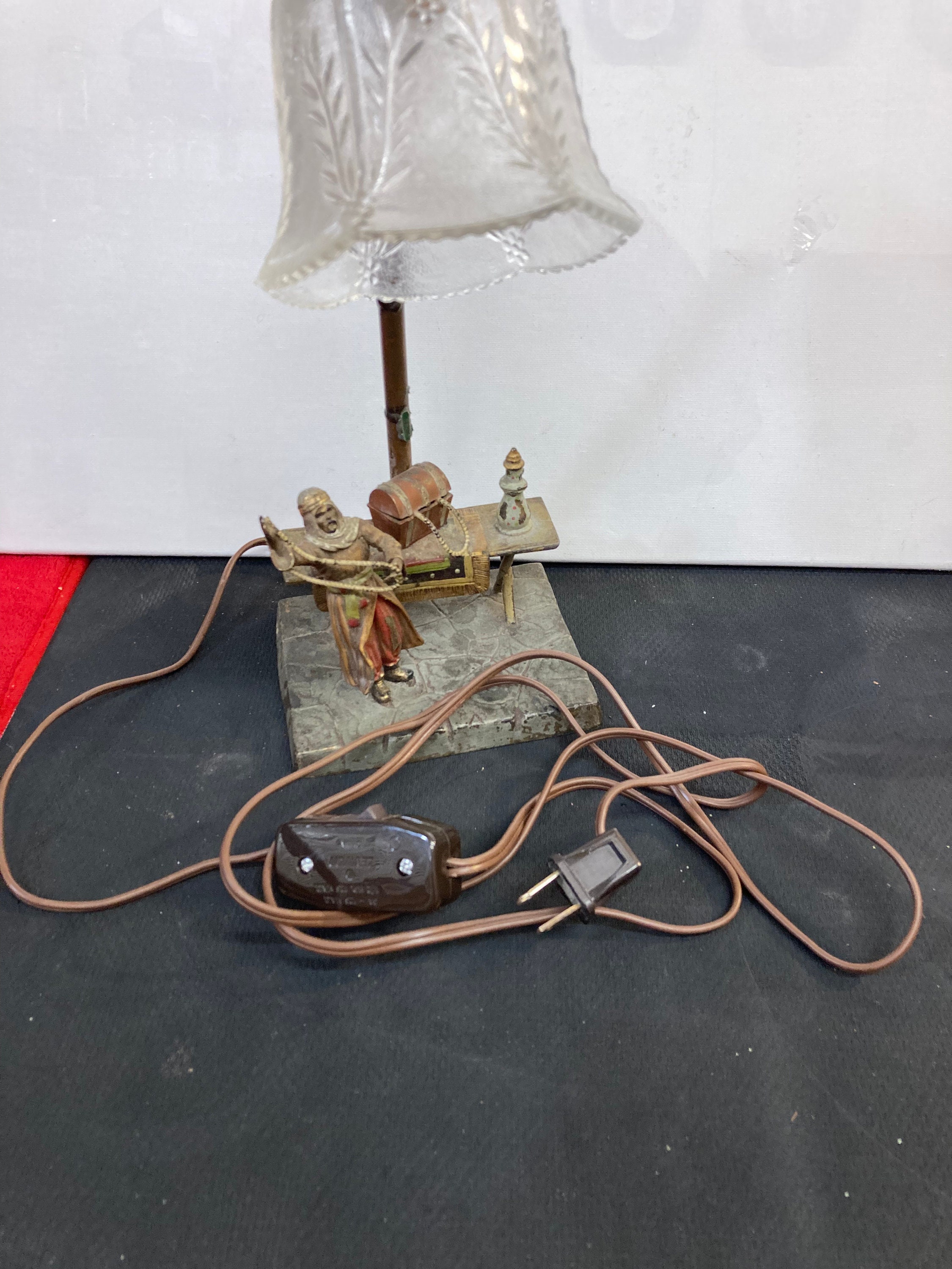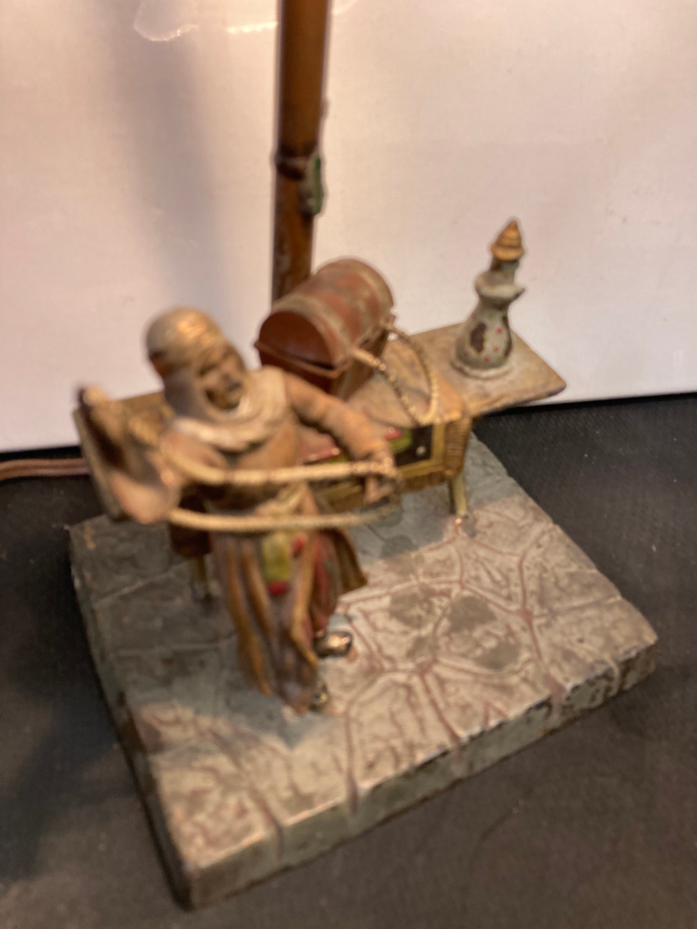 This small antique figural desk or table lamp is unsigned, but presumed to have originated from Austria and dating to approximately 1920 and done in the period Art Deco style. The base of the lamp is done with cast spelter which has been cold-painted in the realistic style. The figure depicts an Arab man in traditional dress standing and presumably at an outdoor bazaar. The lamp is in working condition, and the shade used in the photos is original made of glass