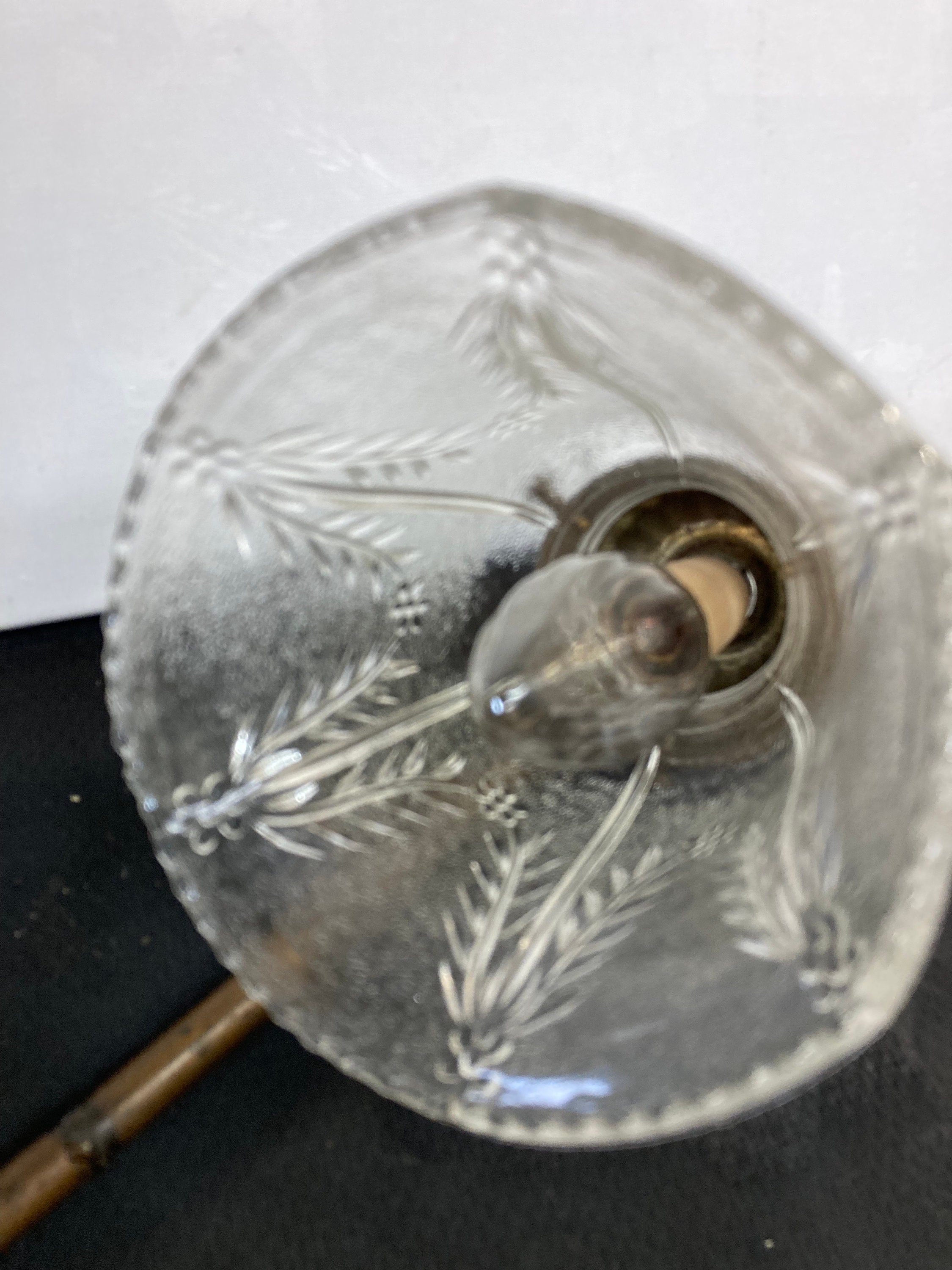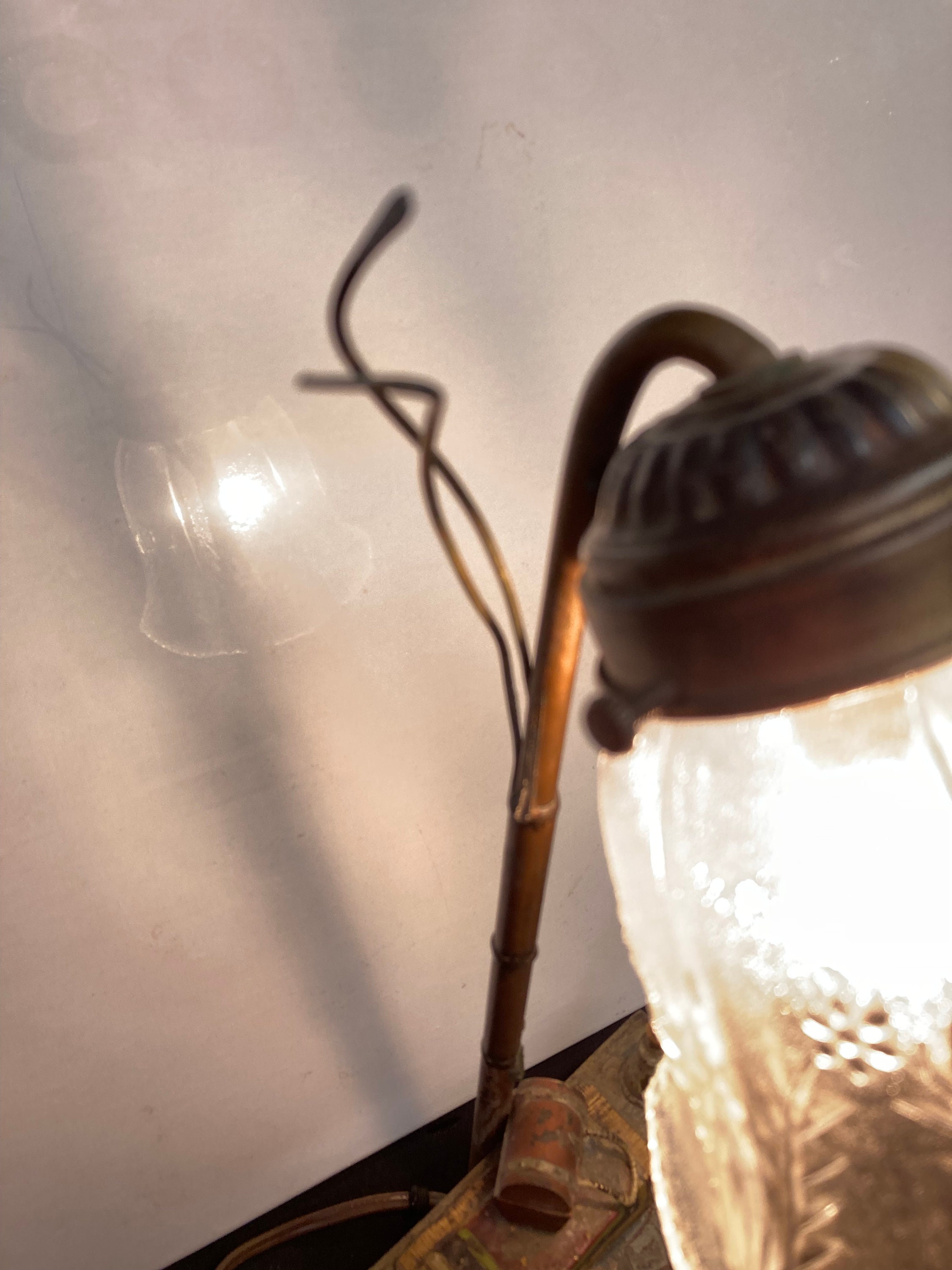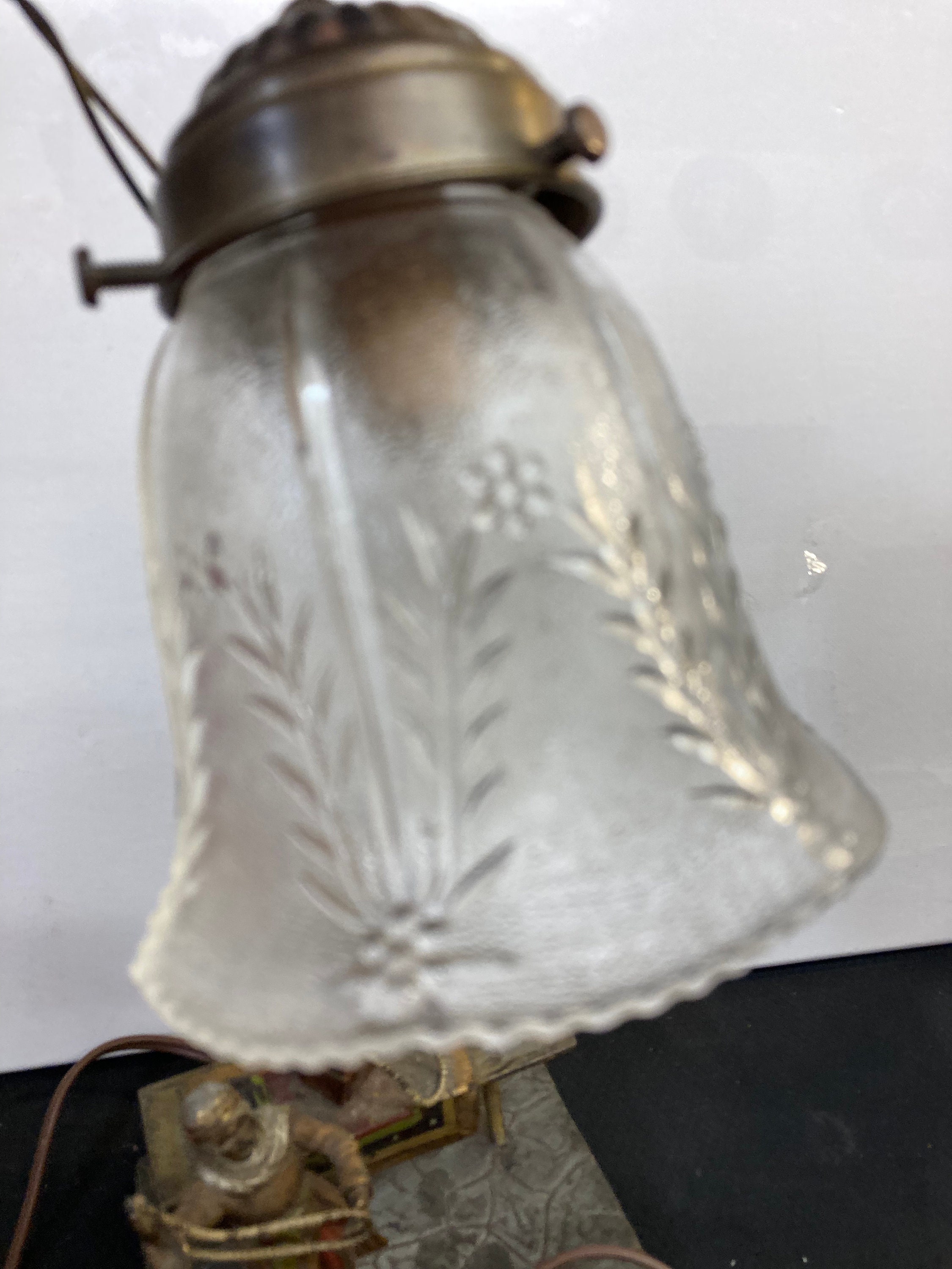 This small antique figural desk or table lamp is unsigned, but presumed to have originated from Austria and dating to approximately 1920 and done in the period Art Deco style. The base of the lamp is done with cast spelter which has been cold-painted in the realistic style. The figure depicts an Arab man in traditional dress standing and presumably at an outdoor bazaar. The lamp is in working condition, and the shade used in the photos is original made of glass