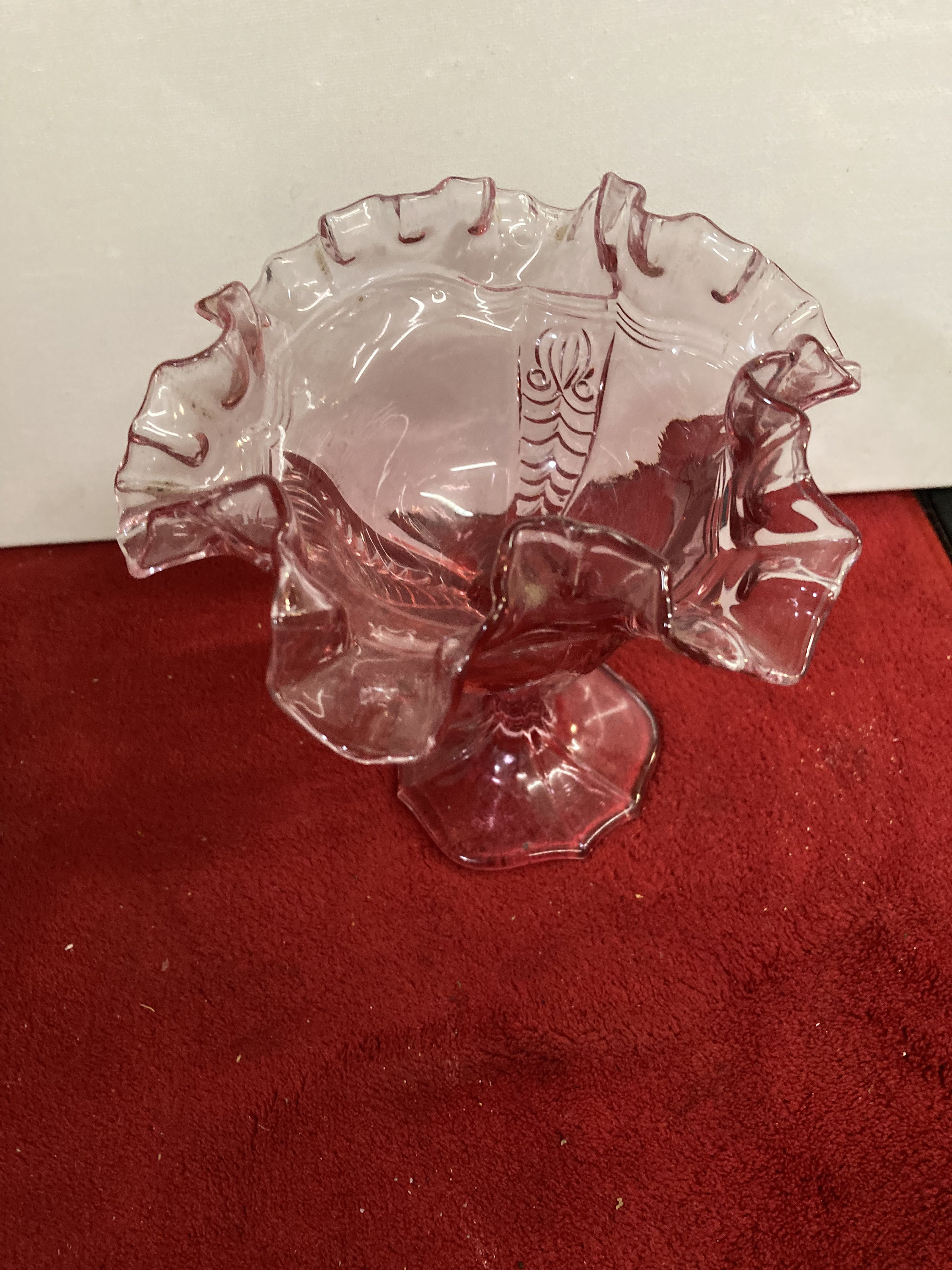 This footed colonial pink double crimped, ruffled edge compote dish just sparkles in the light.