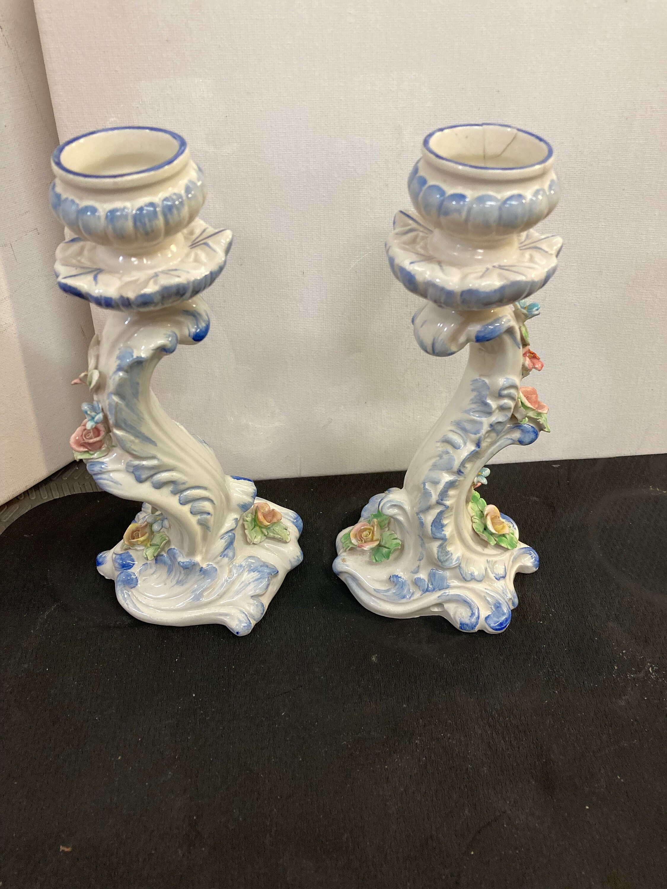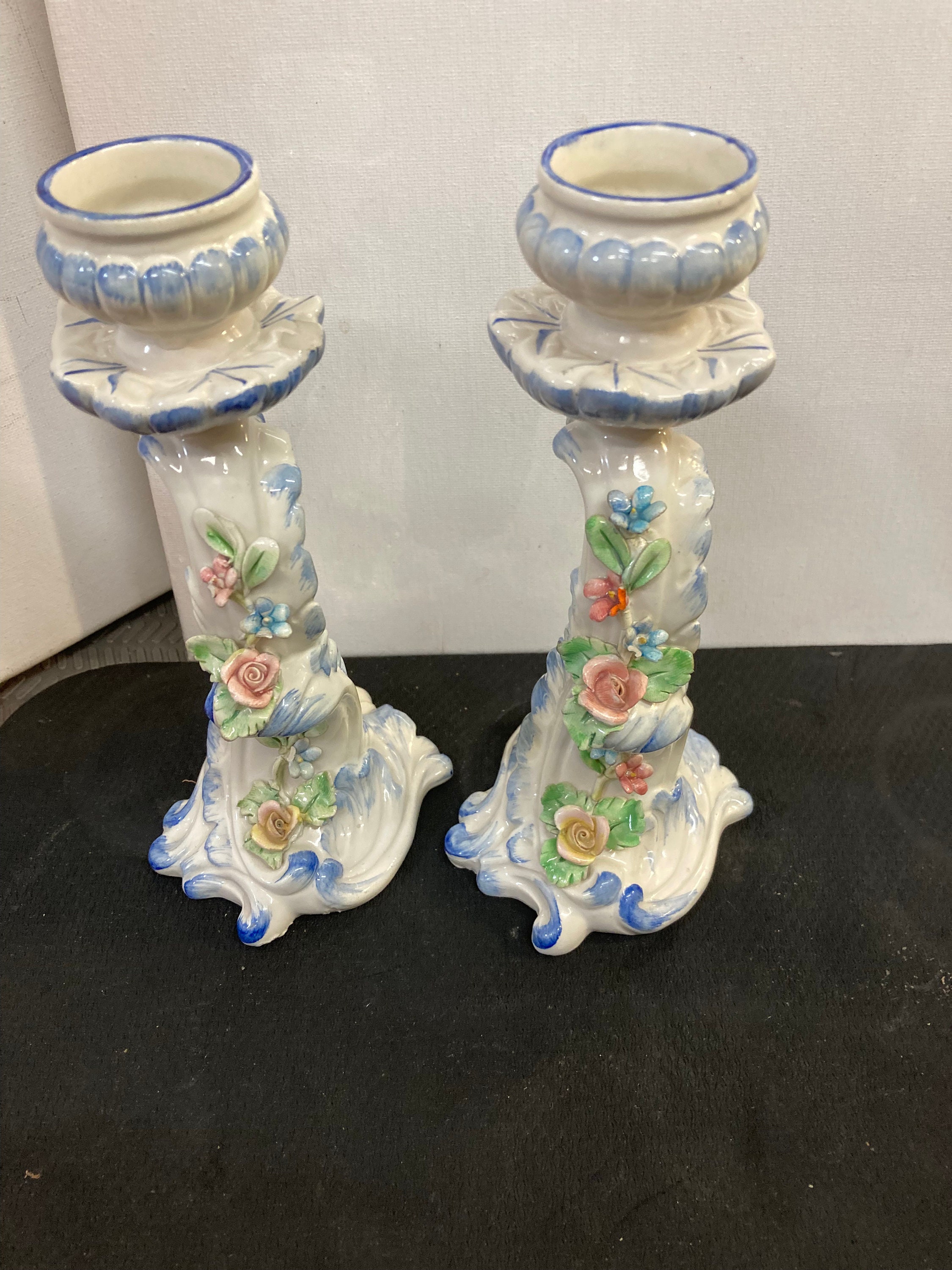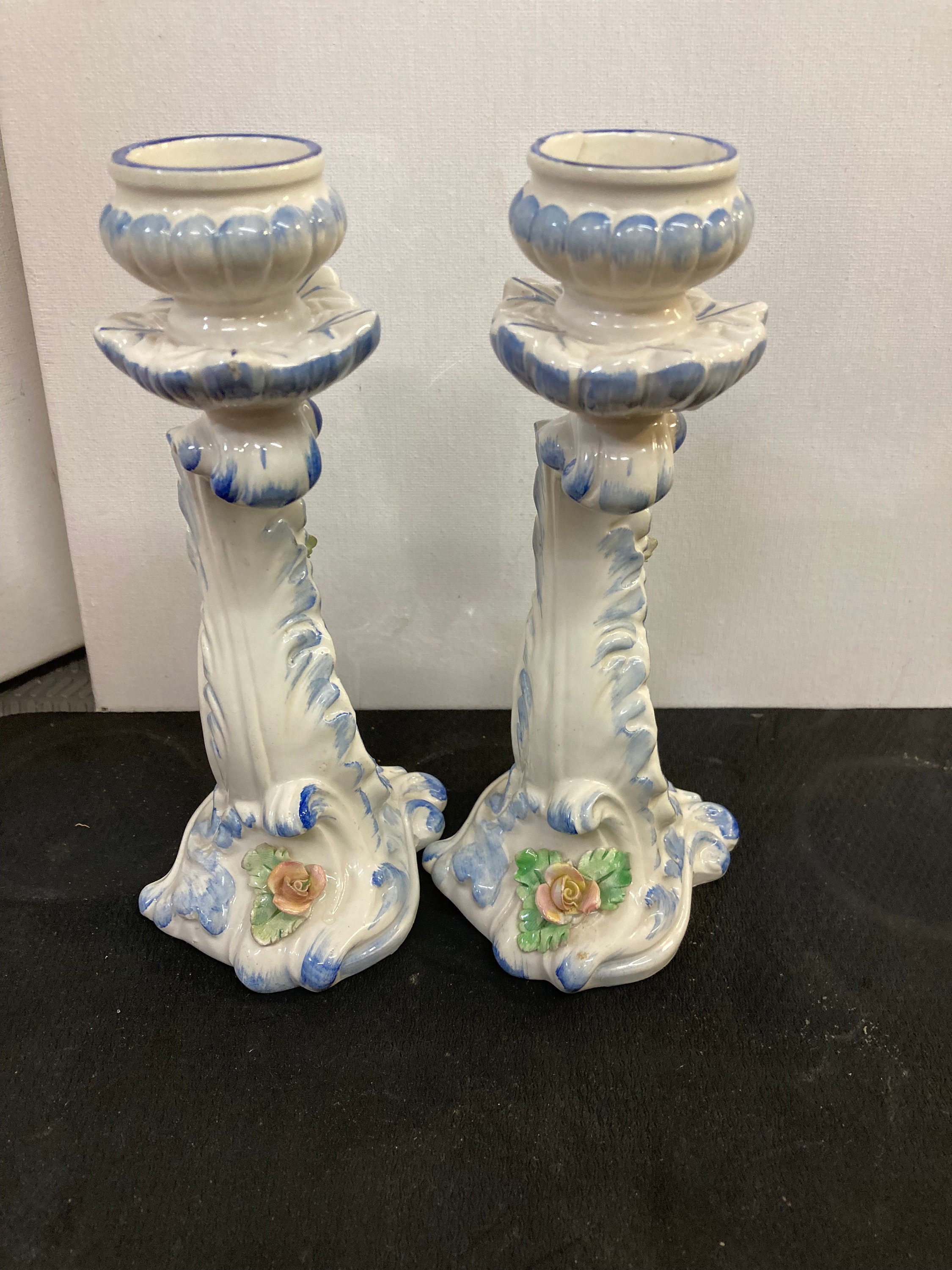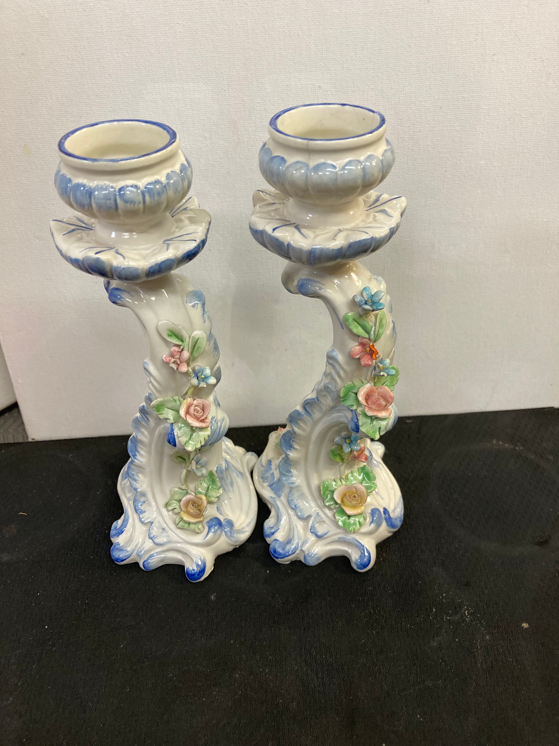 Vintage Italian Capodimonte Pair of Tall Candlestick Holders with Rose Motif