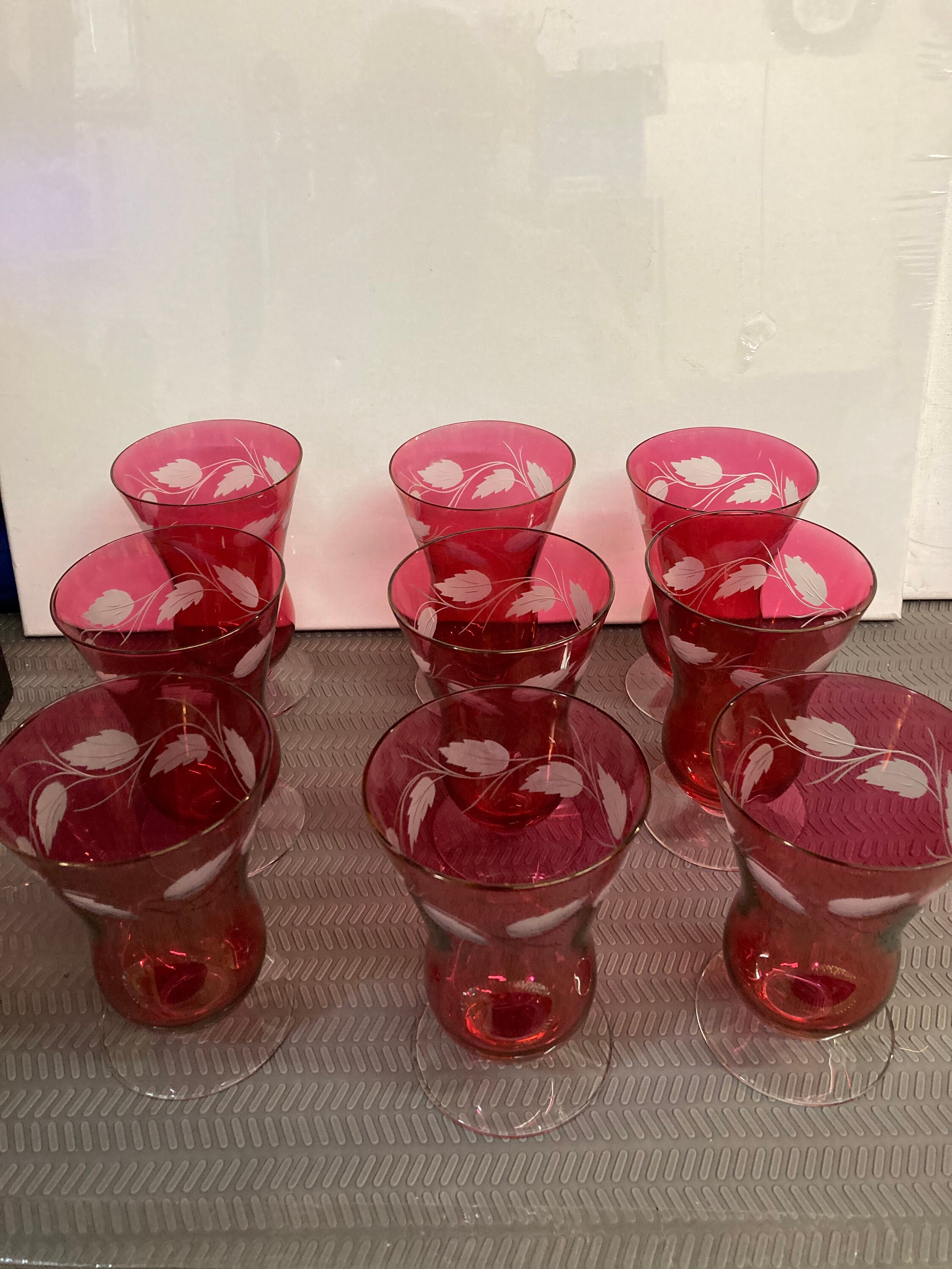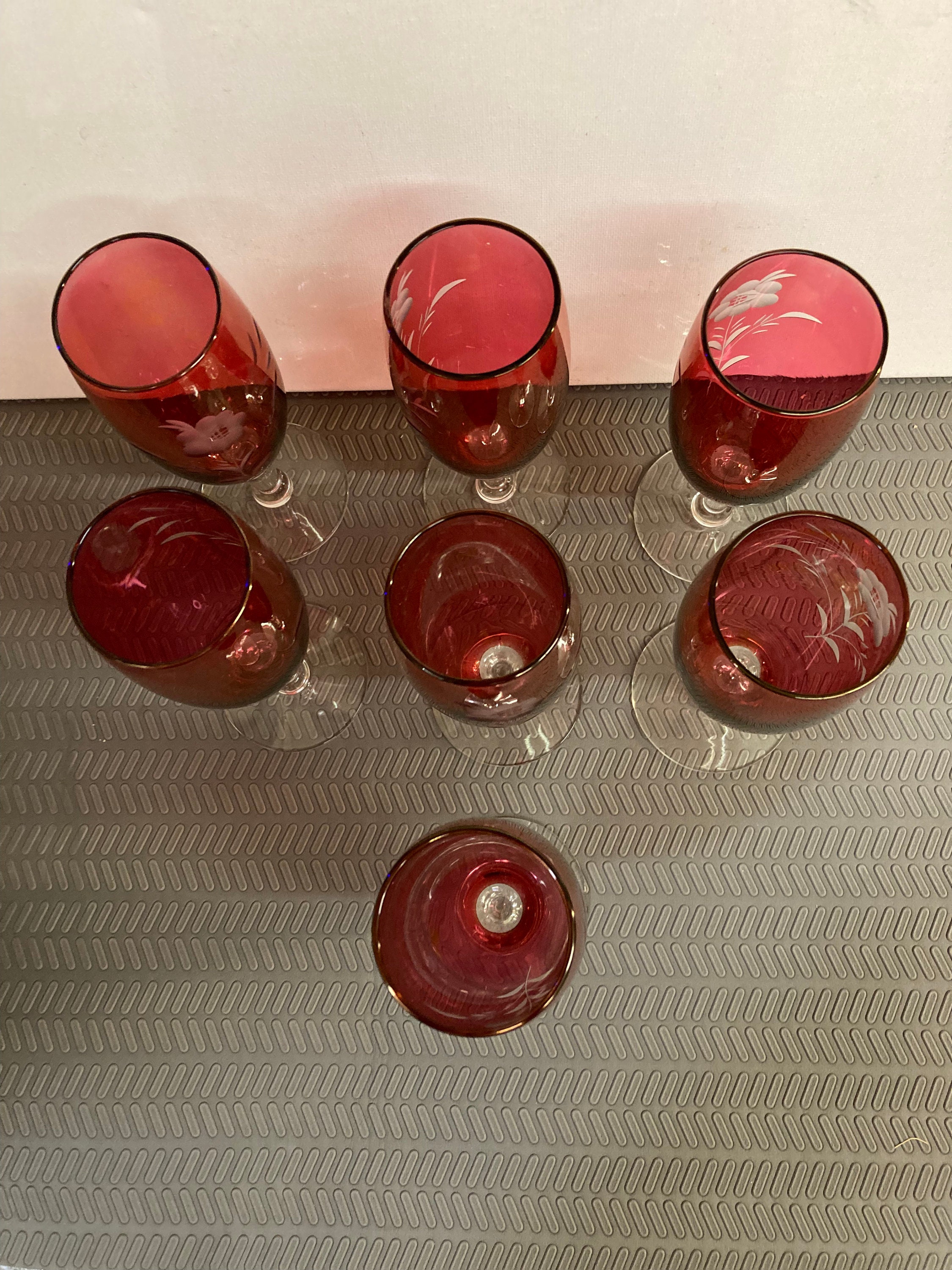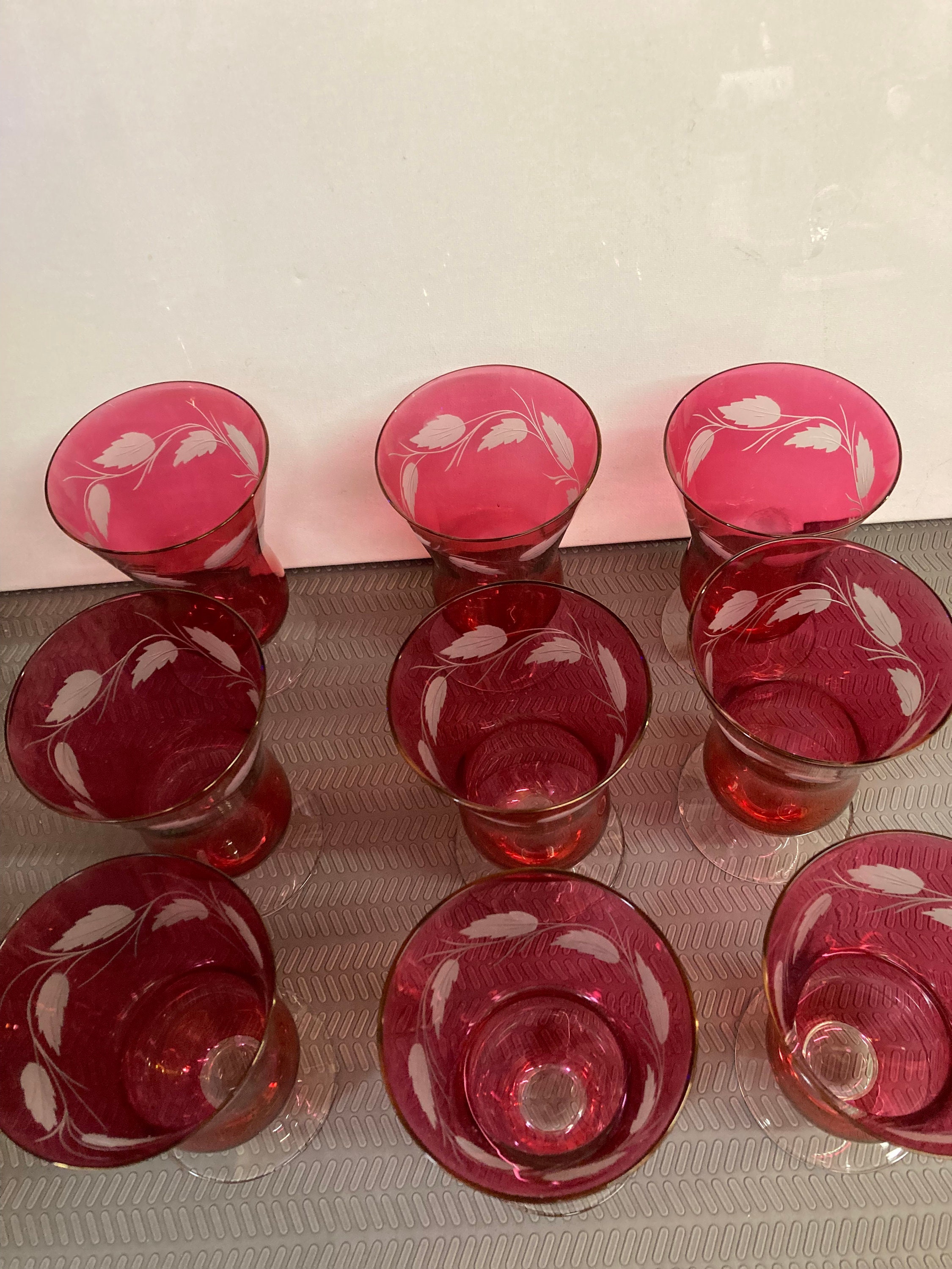 16 Beautiful Vintage Cranberry Red Floral Etched Glass , Clear Bottom Flower