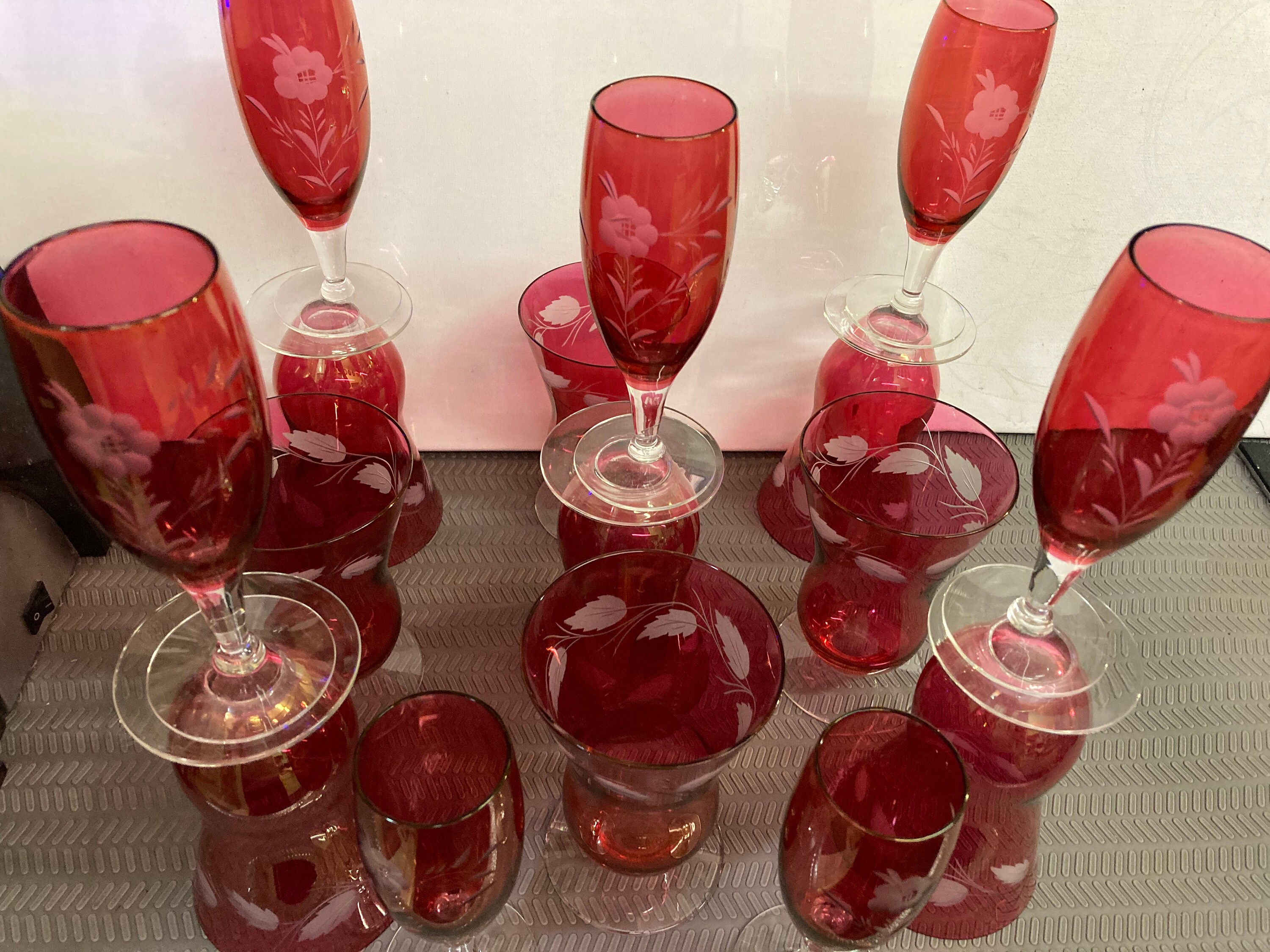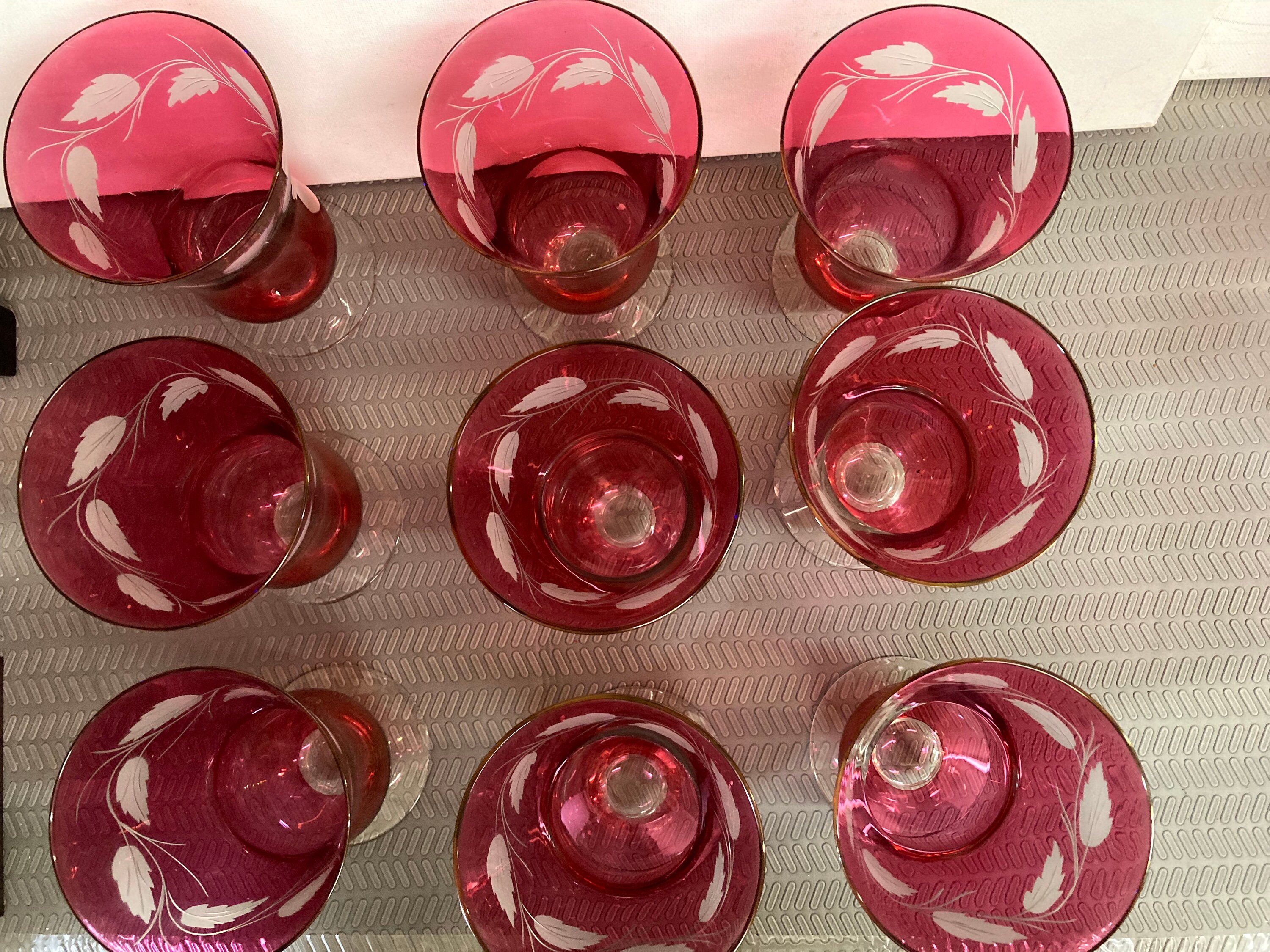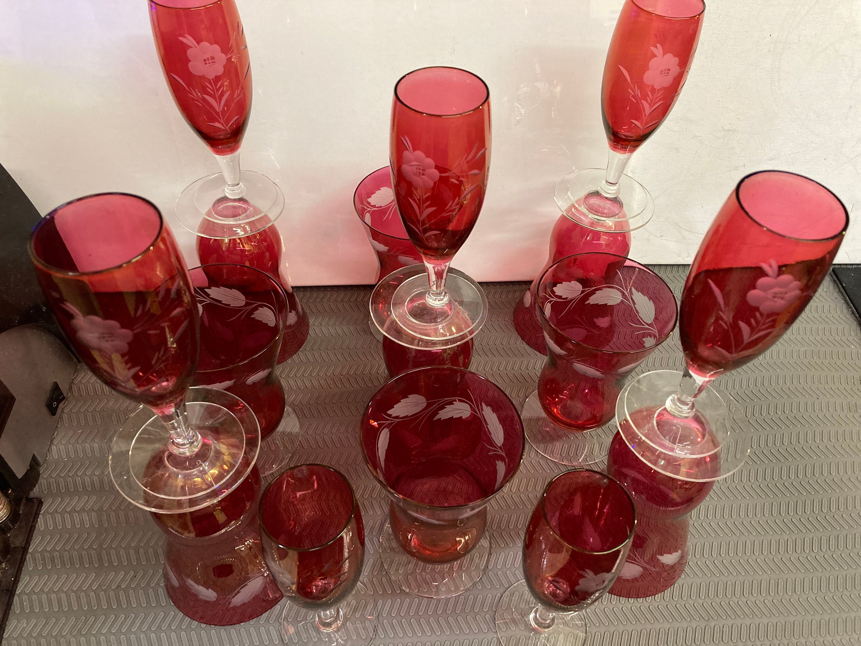 16 Beautiful Vintage Cranberry Red Floral Etched Glass , Clear Bottom Flower