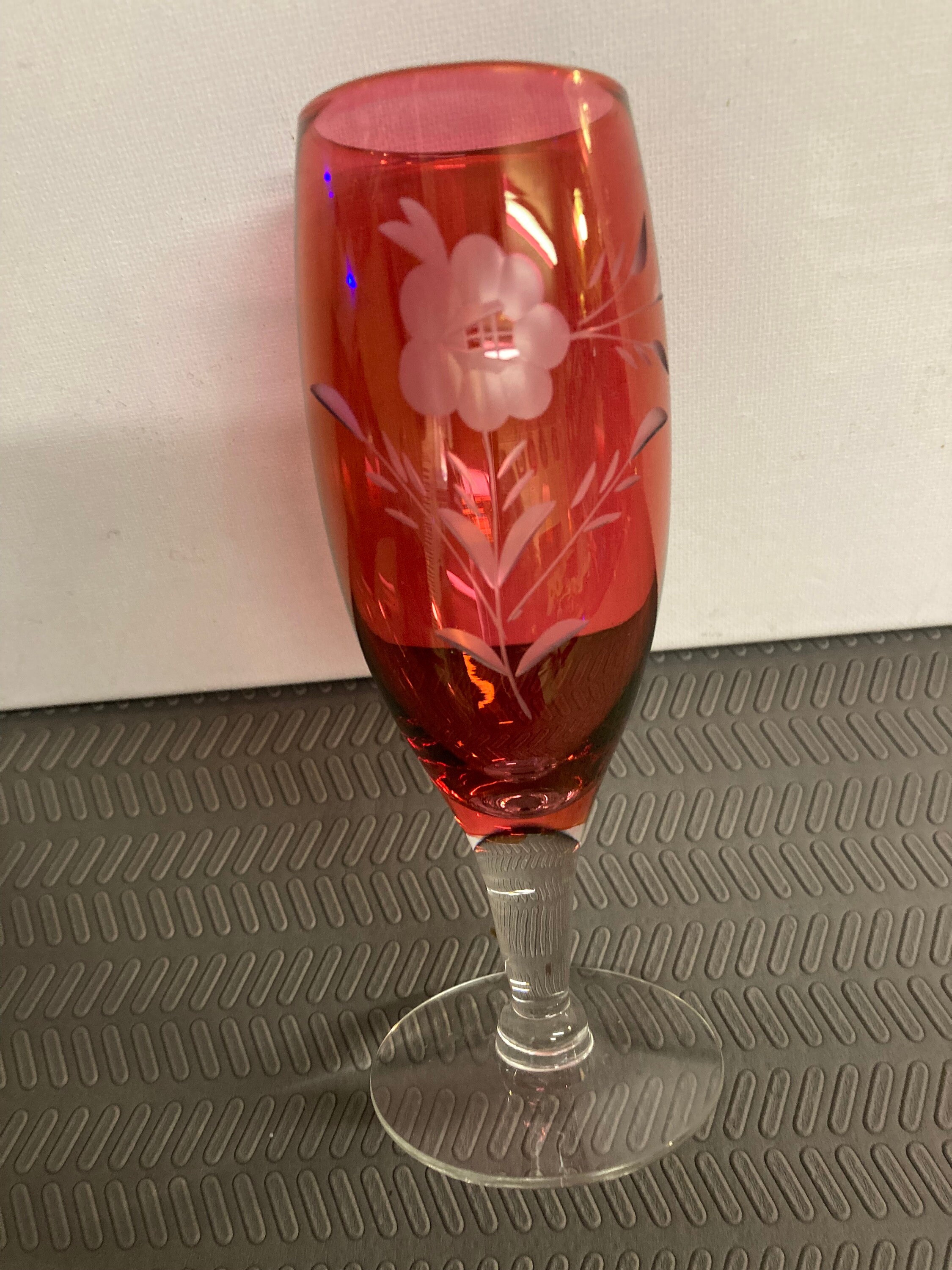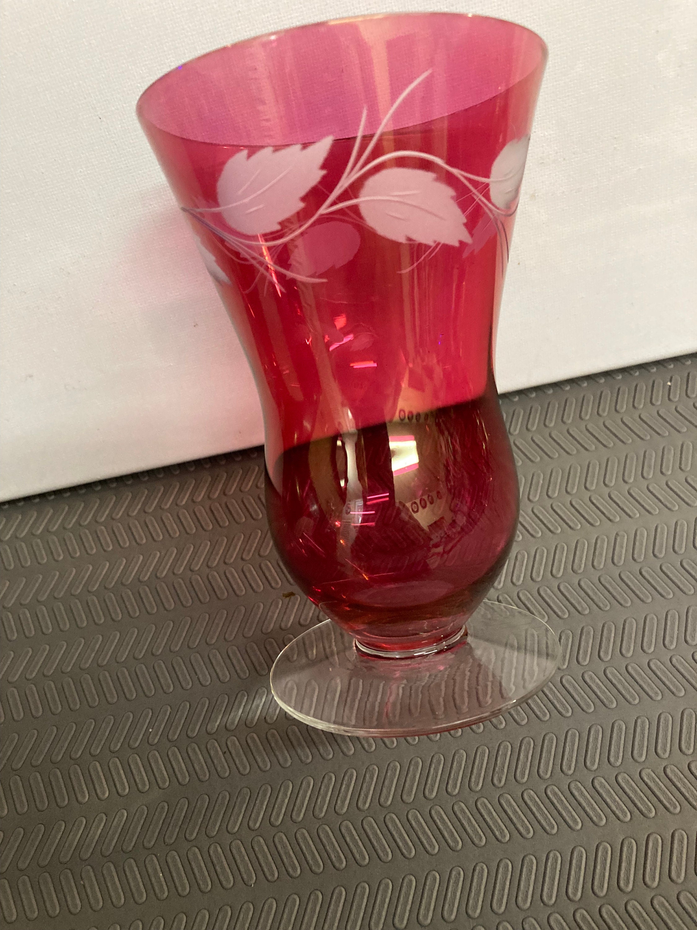Vintage Cranberry Red Vase, etched floral pattern in the 2 types of Glasses.