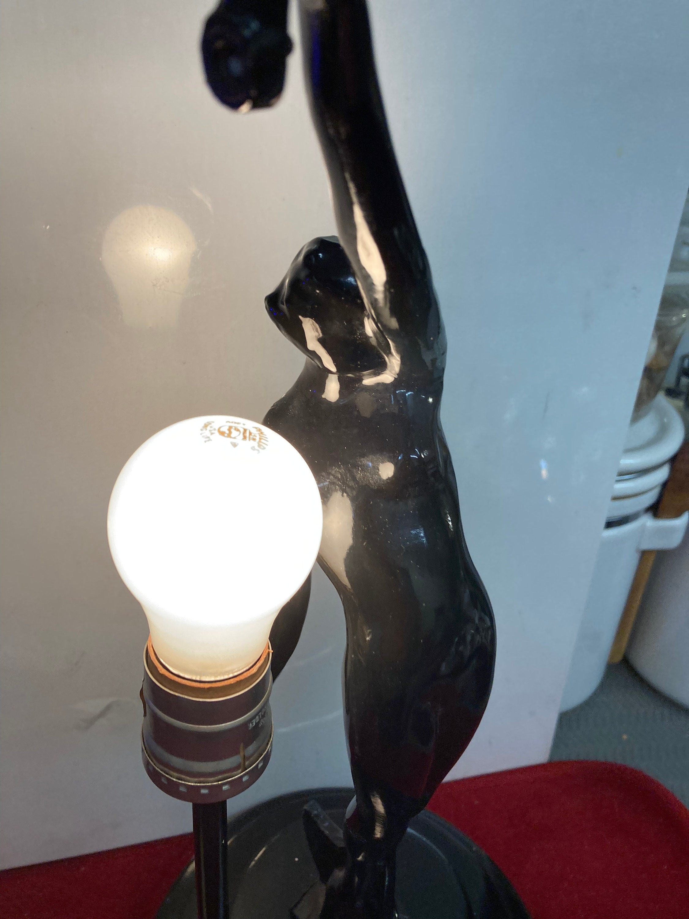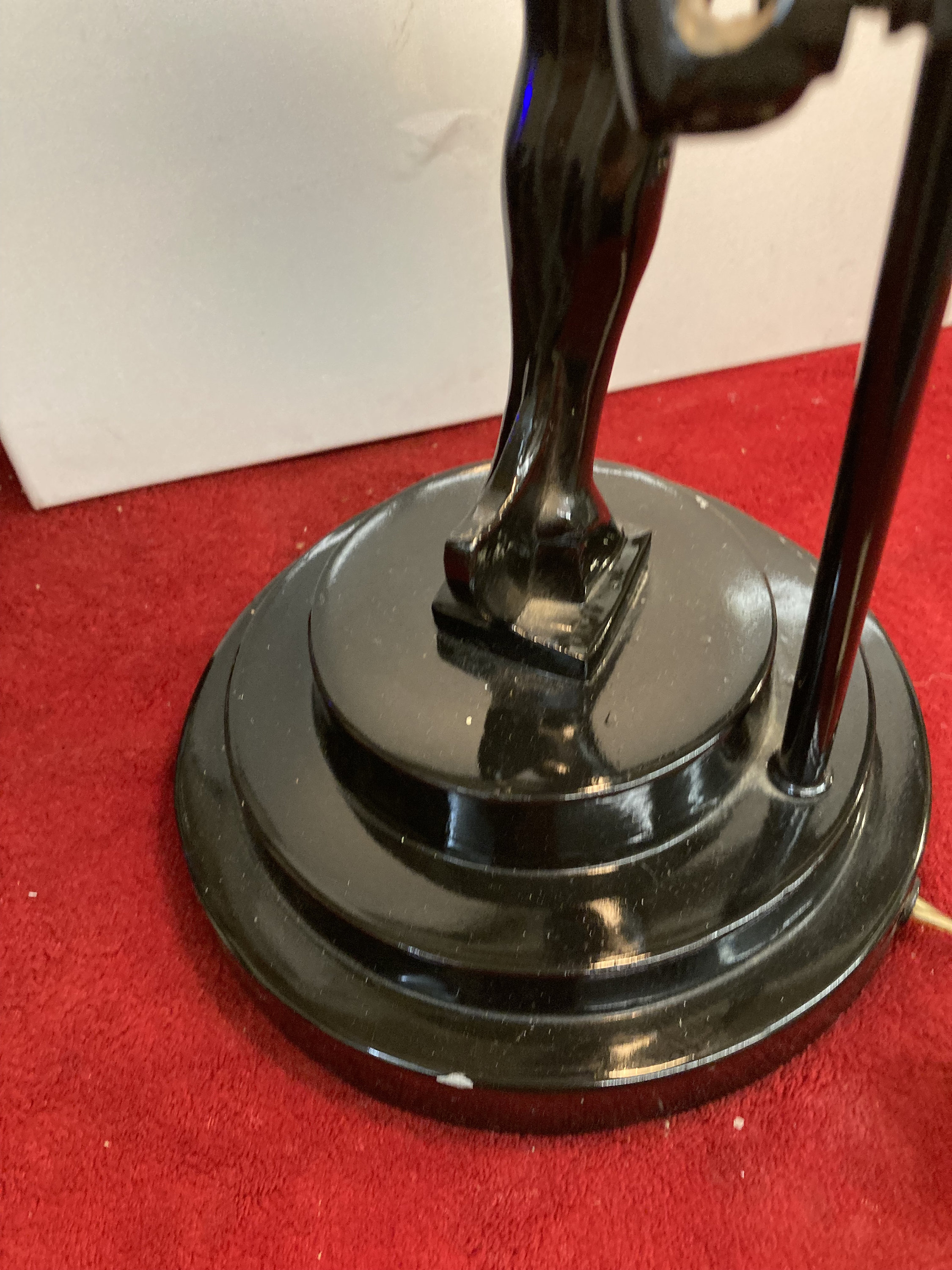A gorgeous vintage Art Deco silhouette metal and hand blown glass lamp, by Sarsaparilla (Frankart molds).