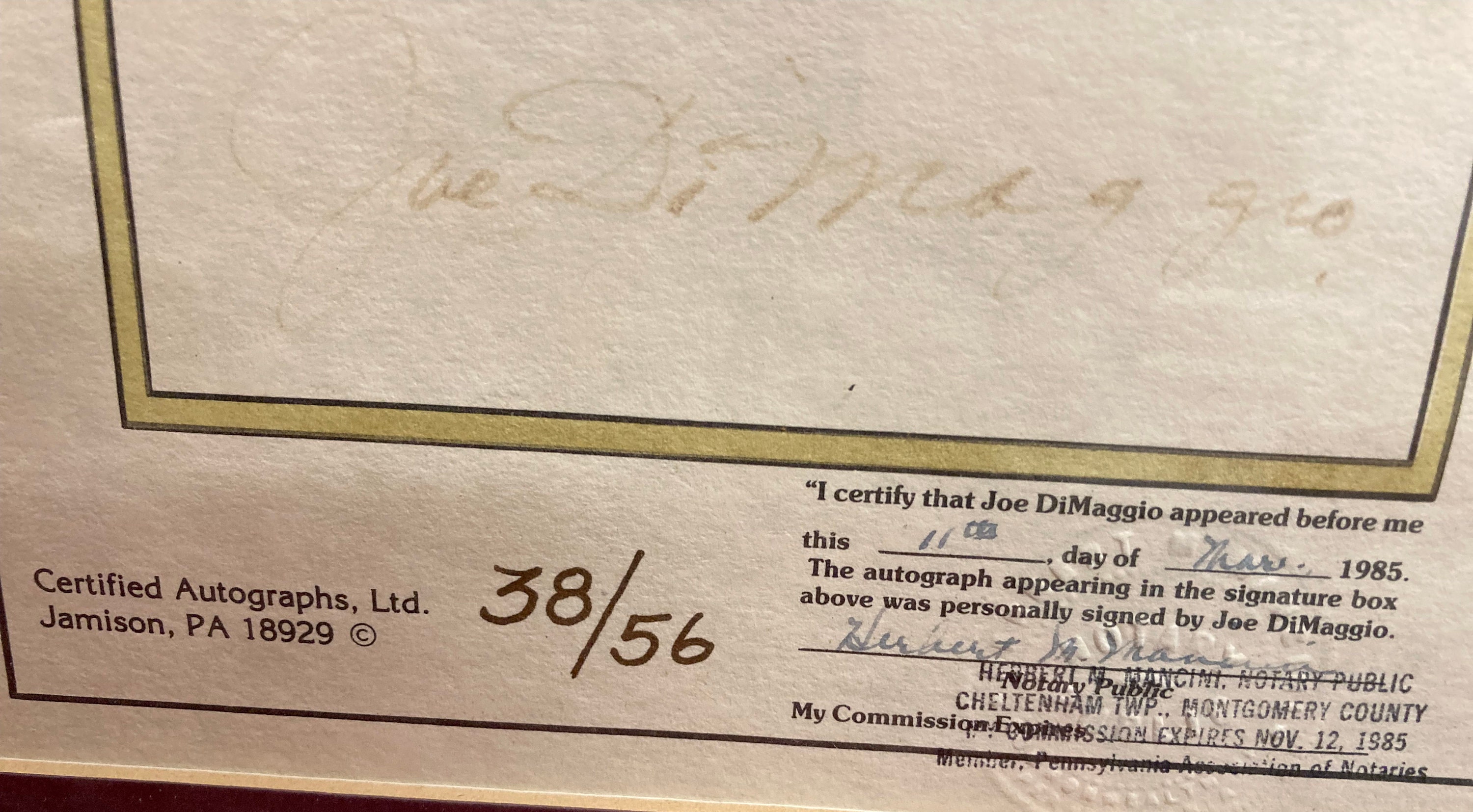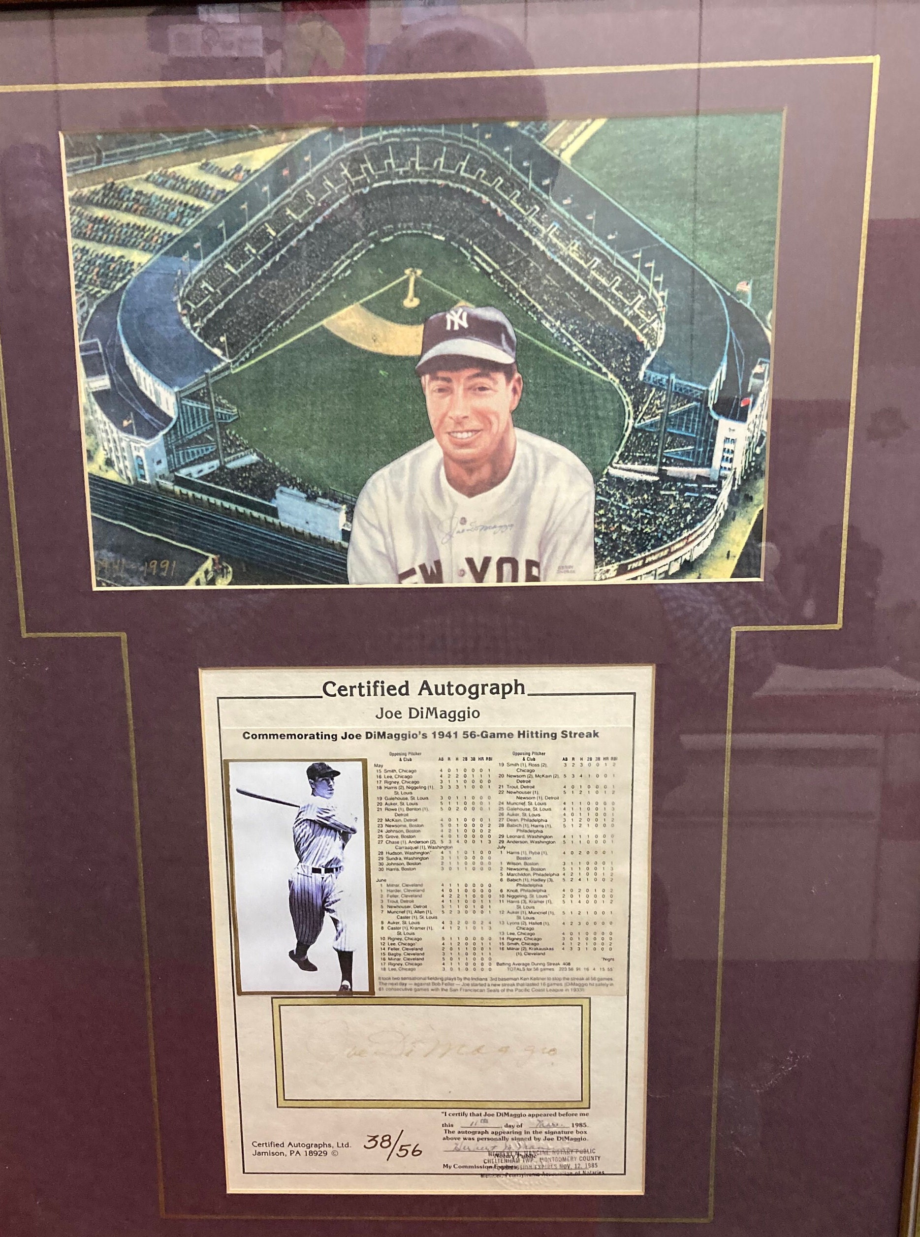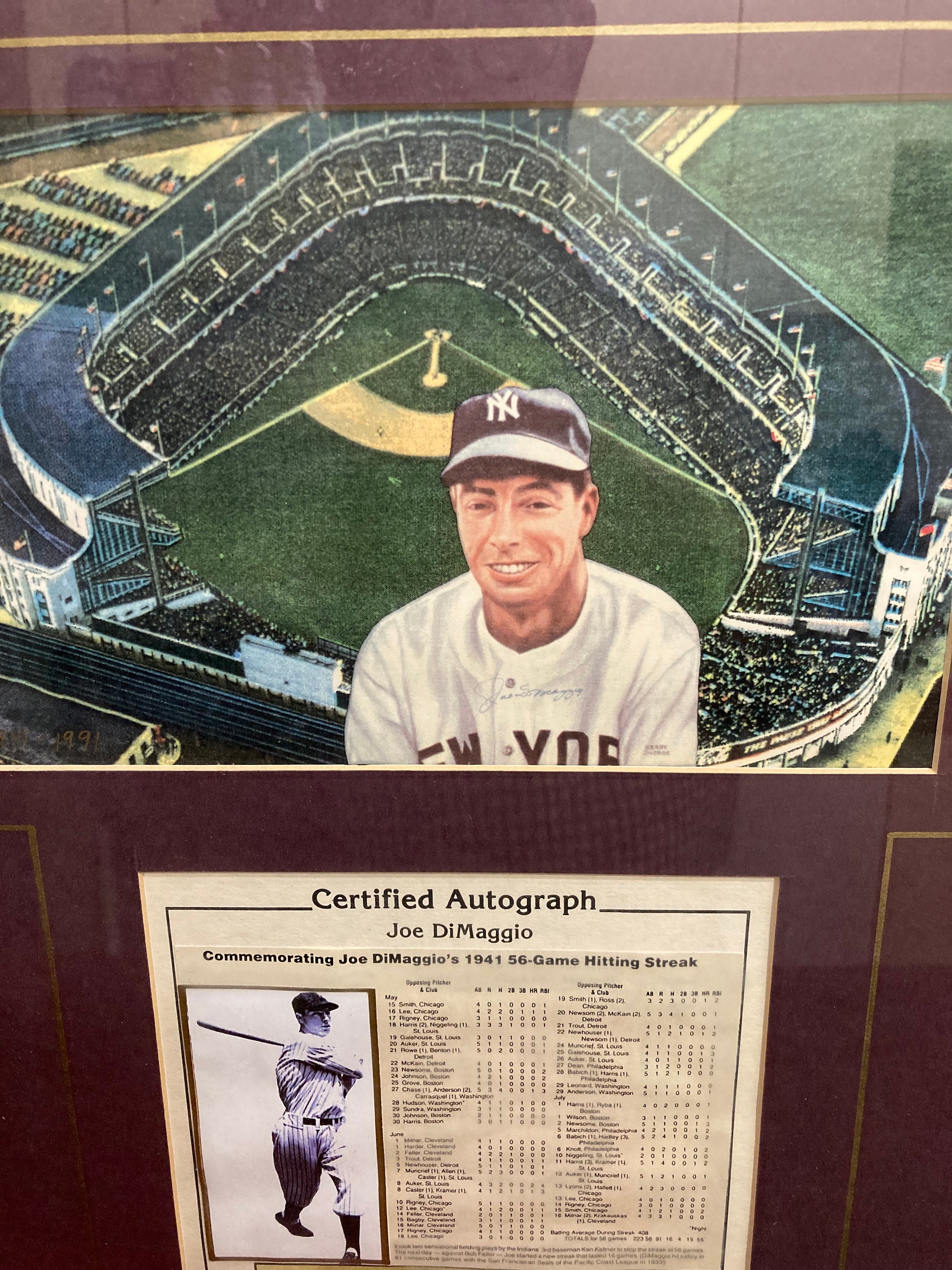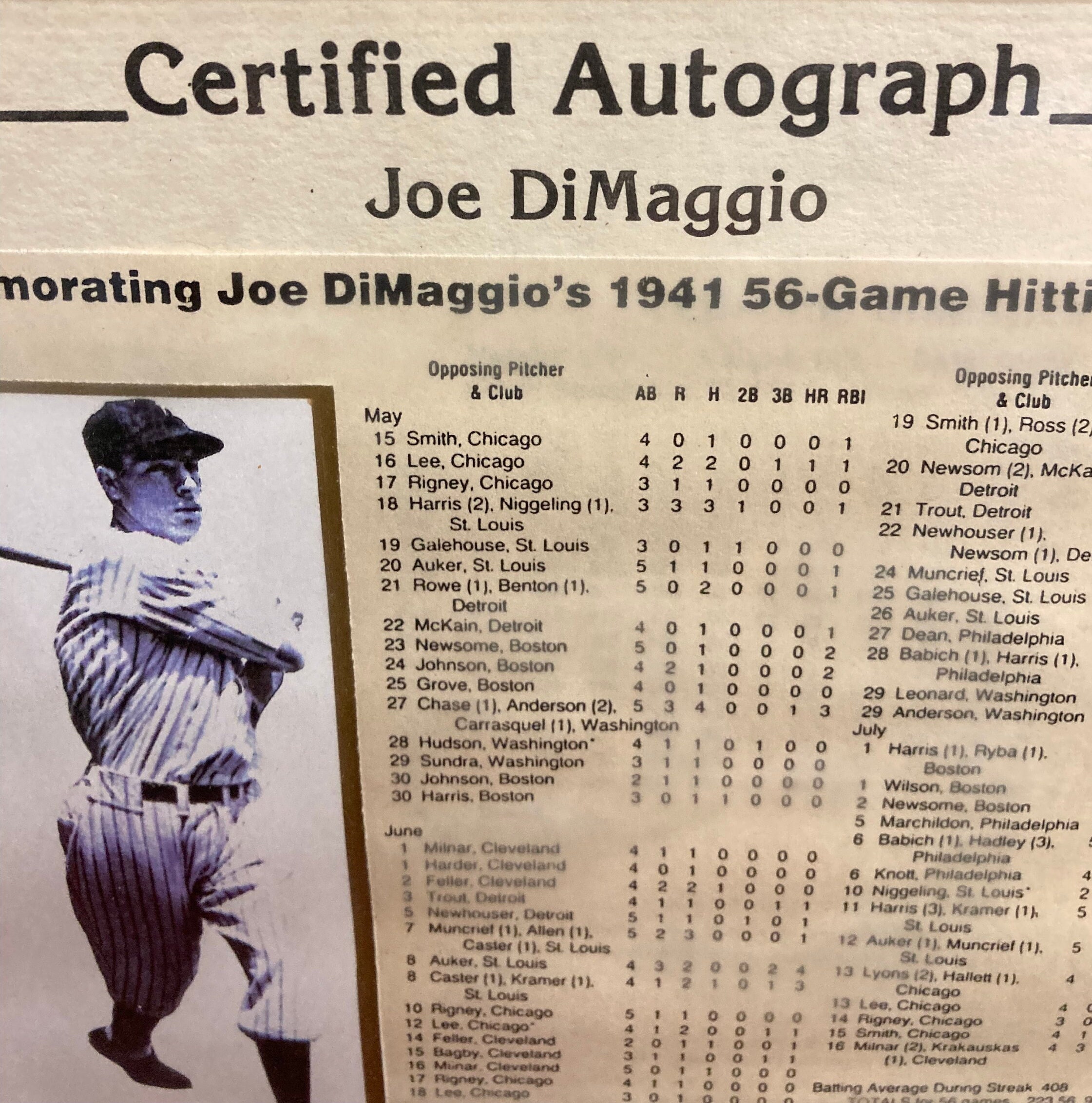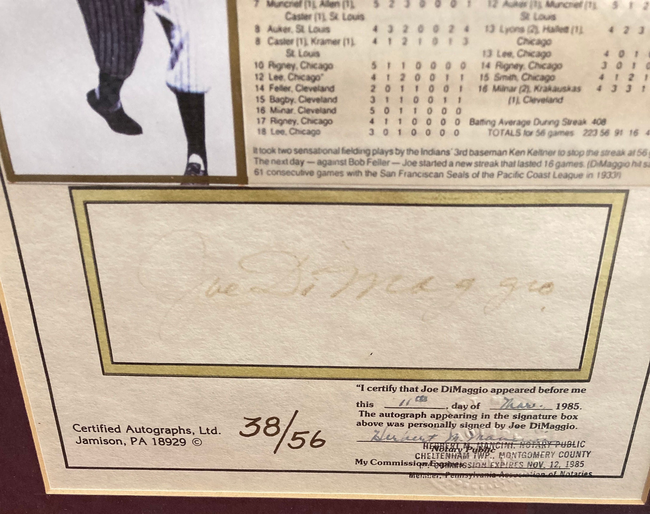 Item is nicely framed and matted with a photo of Joe and a plaque commemorating his 56 game hitting streak.
