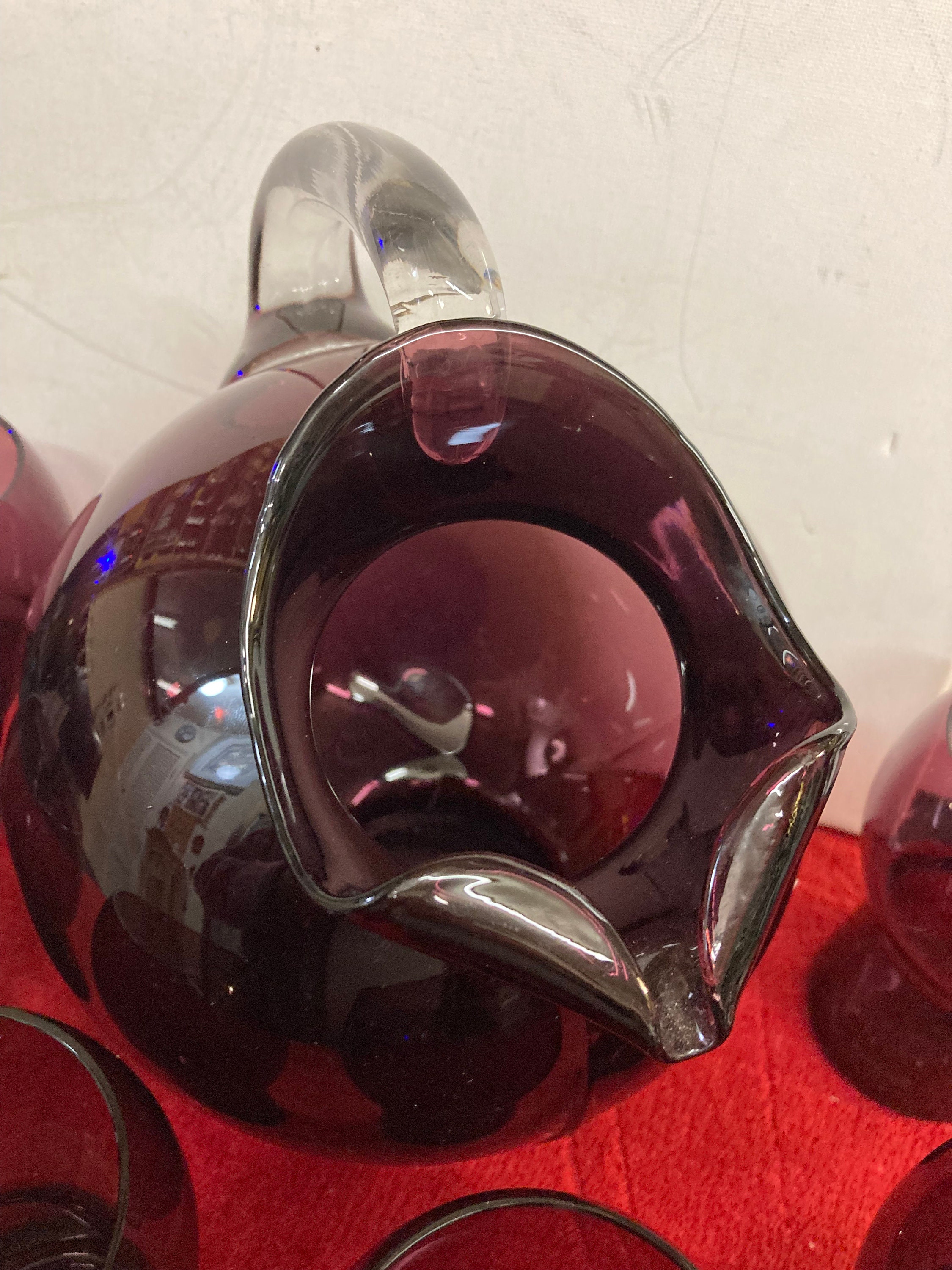Lovely ruby red tilt style ball pitcher in the Carmen pattern by Cambridge.