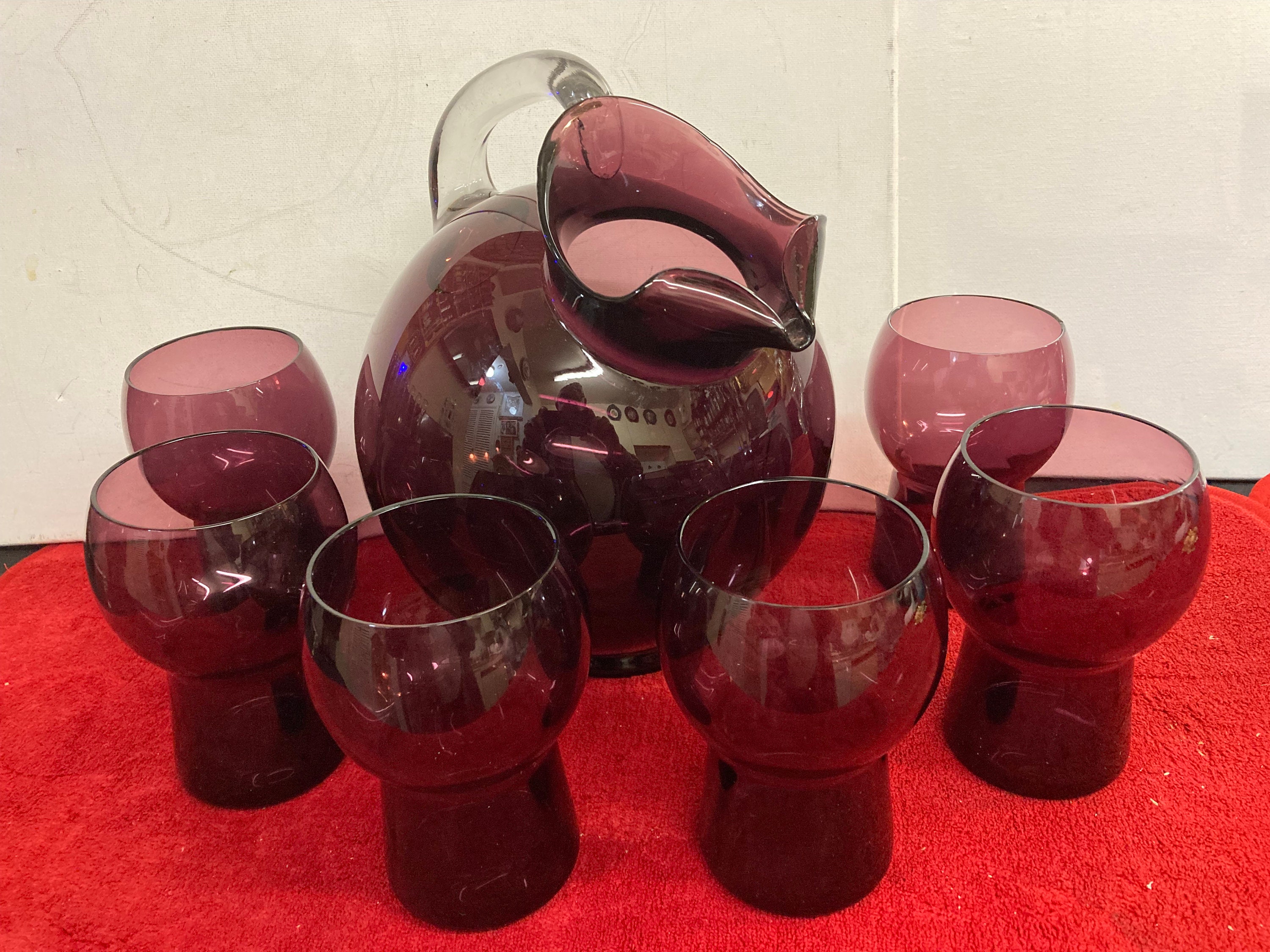 The set includes 6 matching mushroom style cordial glasses, and ball style pitcher.