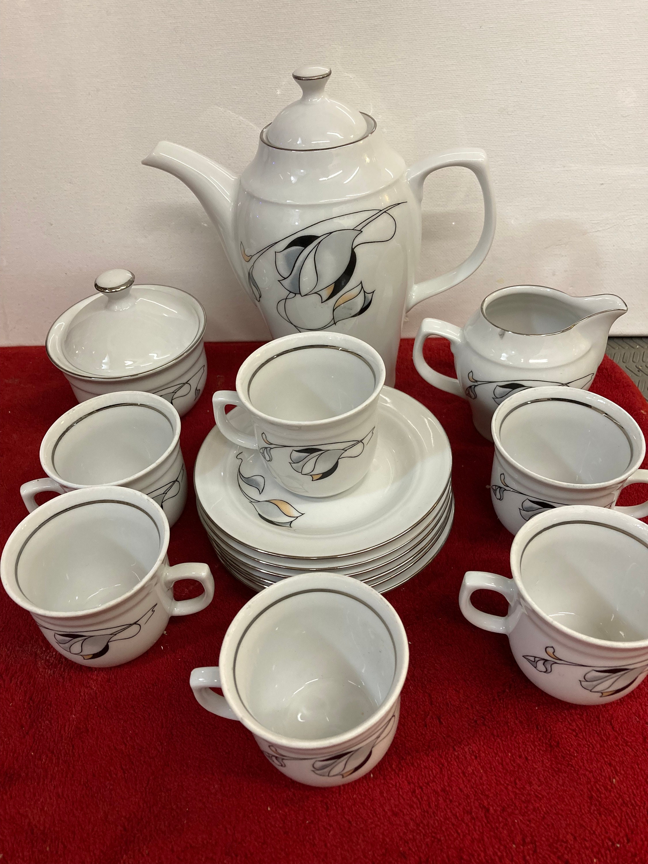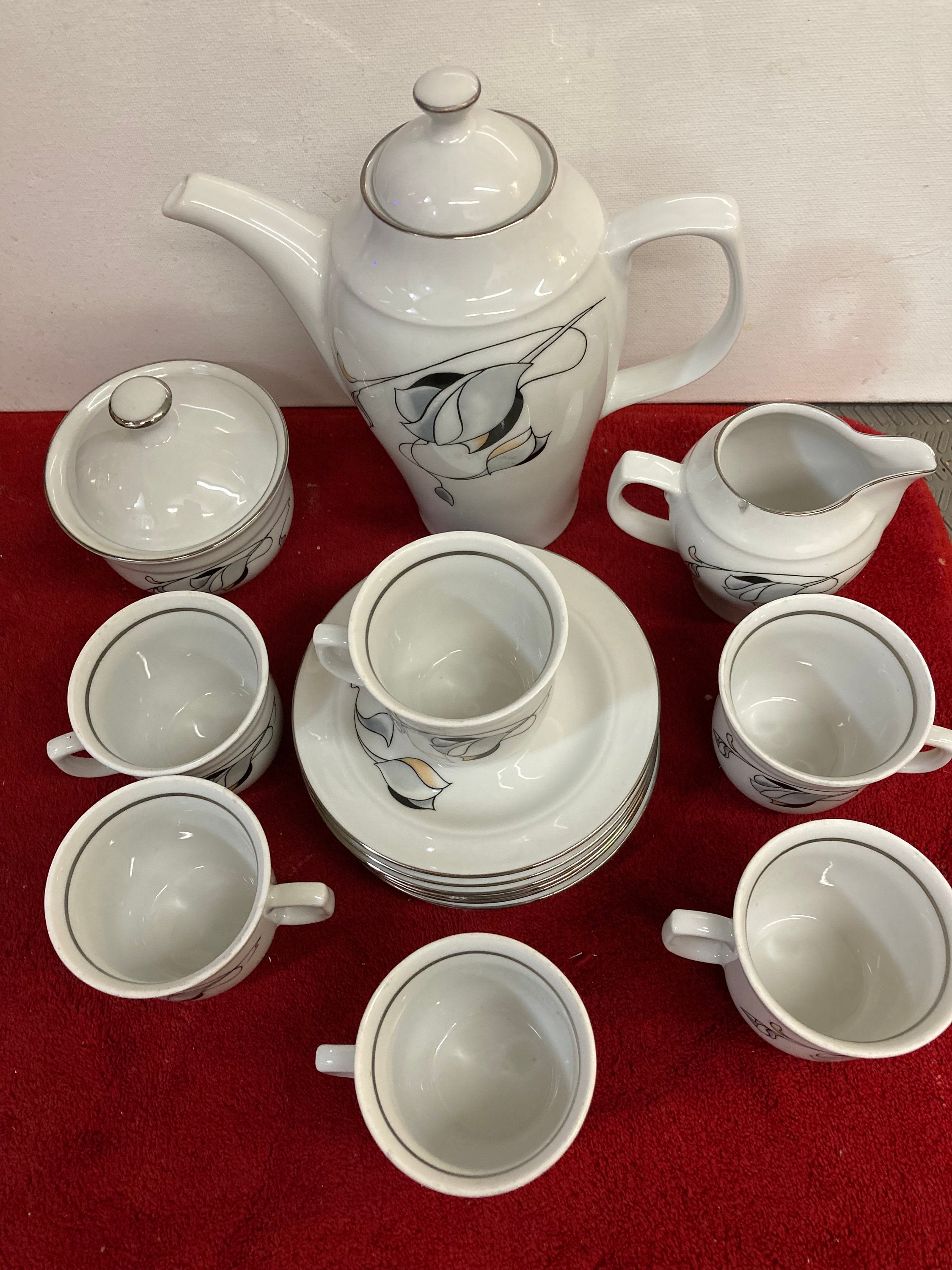 6 tea cups, 6 saucers, 1 Coffee/Tea Pot, 1 cream pitcher, 1 sugar jar with lid