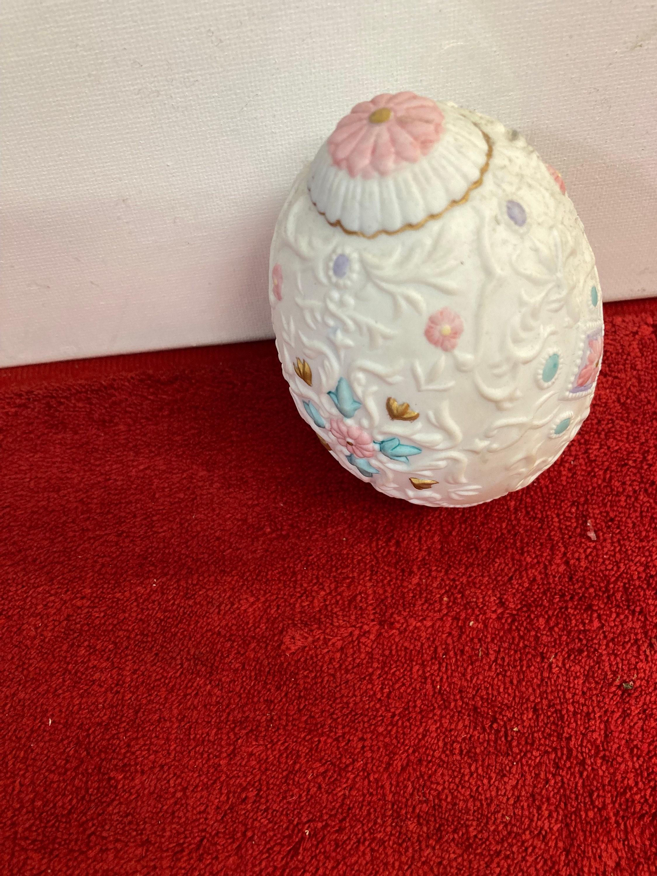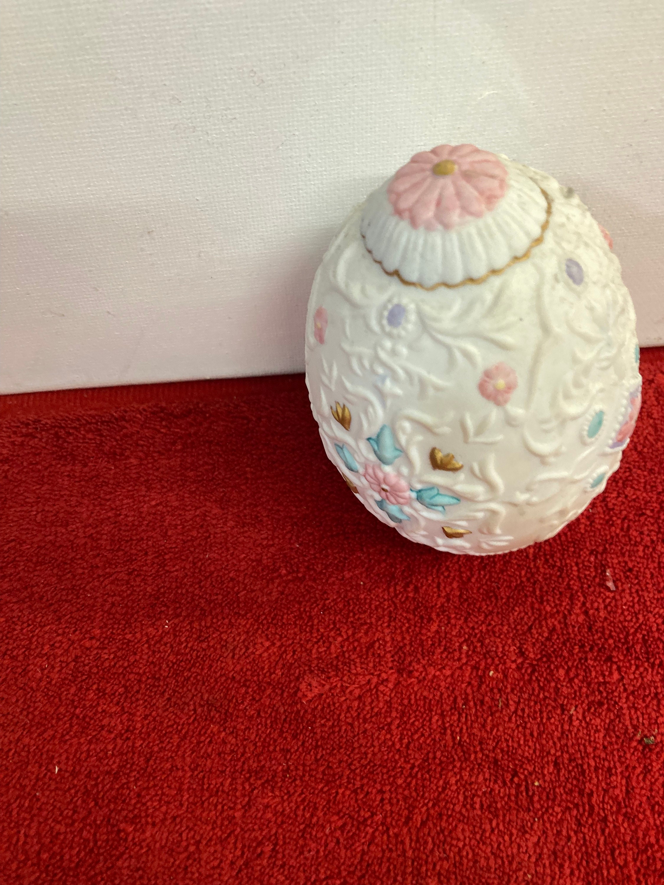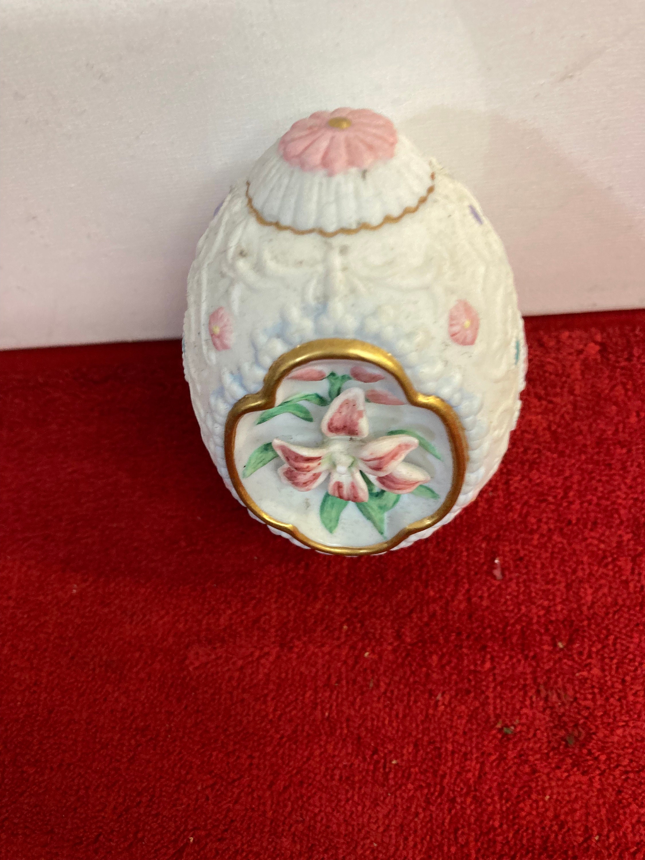 1990: Loooks like Fabrege Egg, with Decorated Flowers. 3.5" tall and 2.5" in diameter. Not a Hangimg ornament