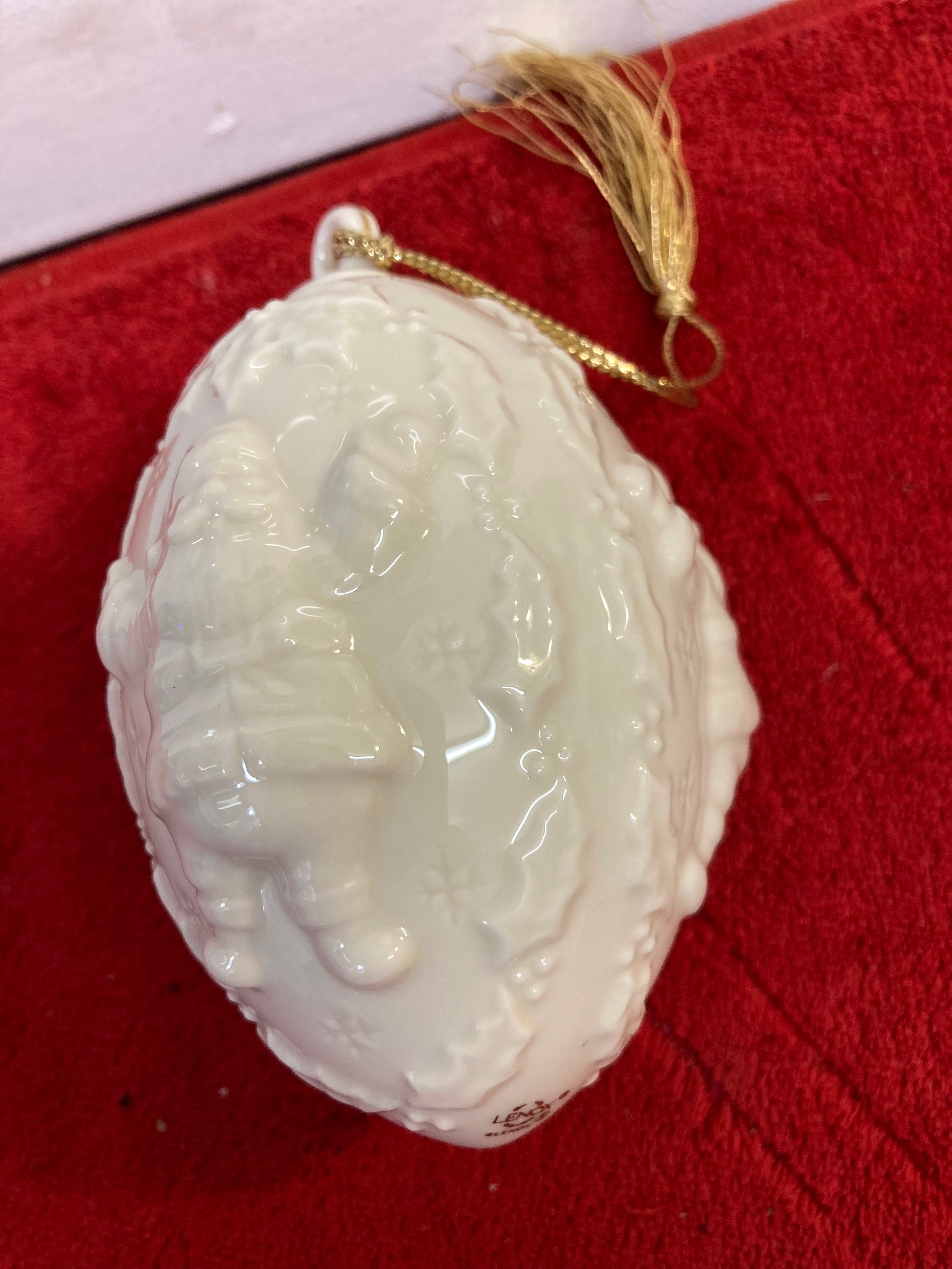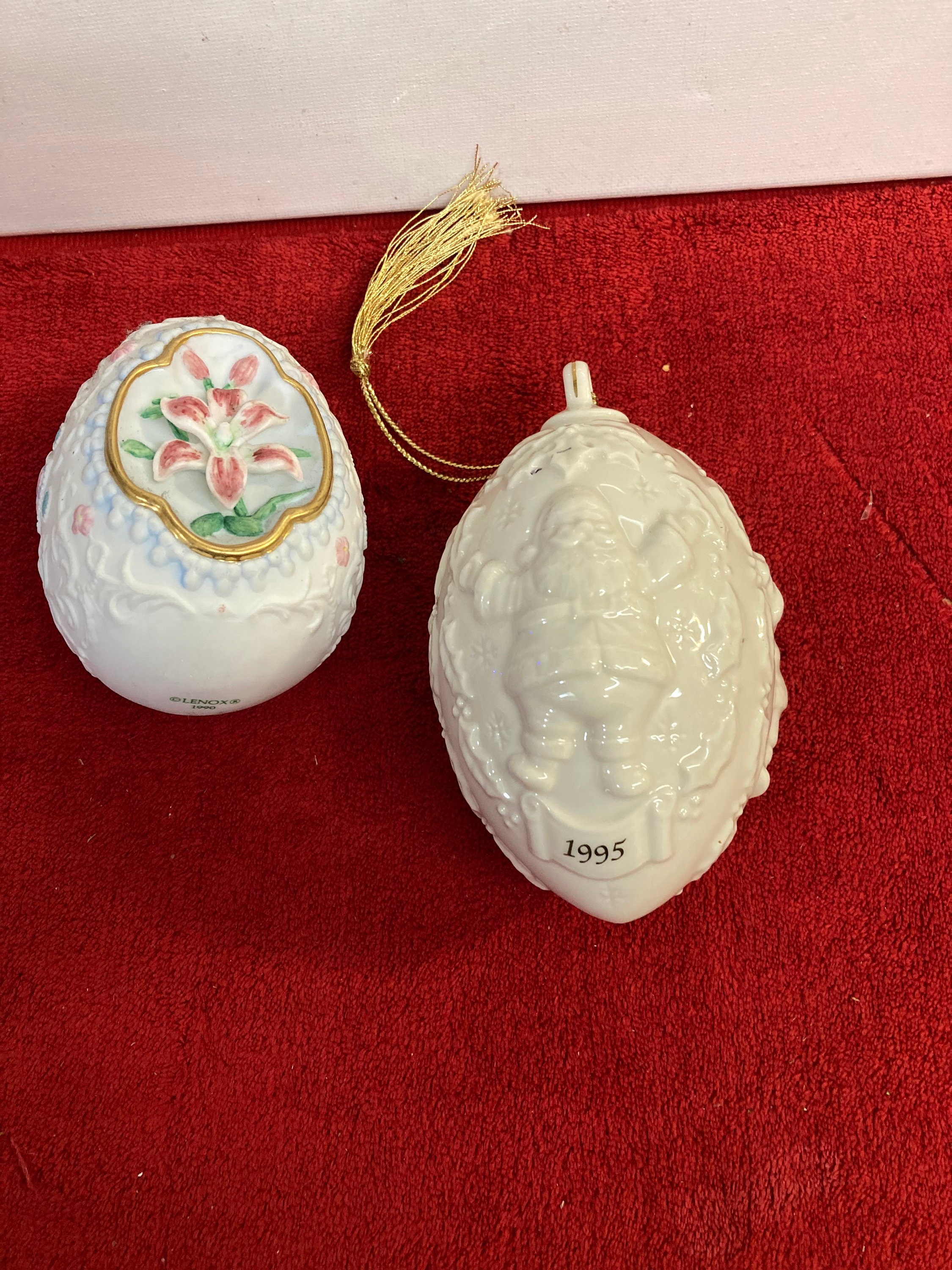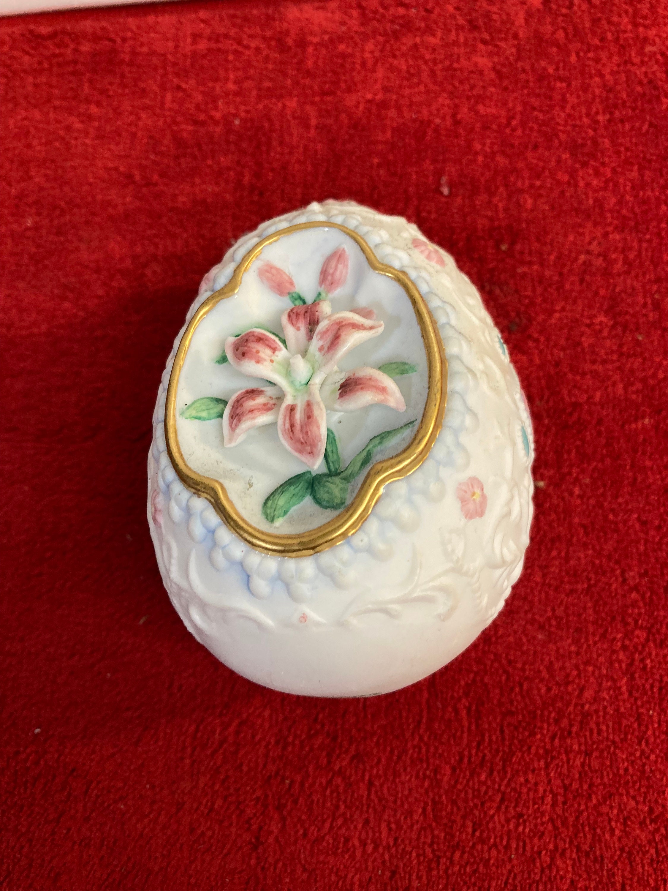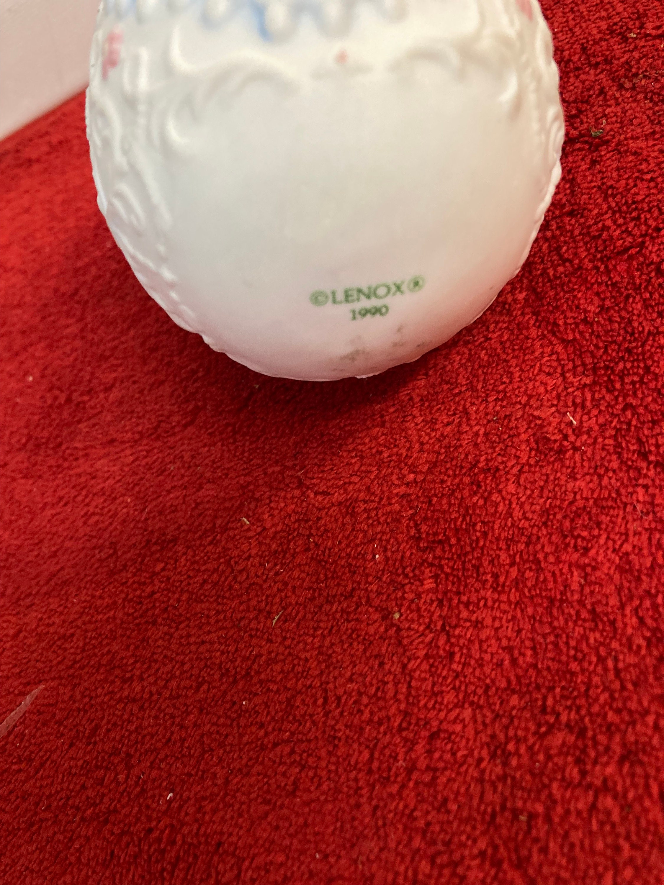 1990: Loooks like Fabrege Egg, with Decorated Flowers. 3.5" tall and 2.5" in diameter. Not a Hangimg ornament