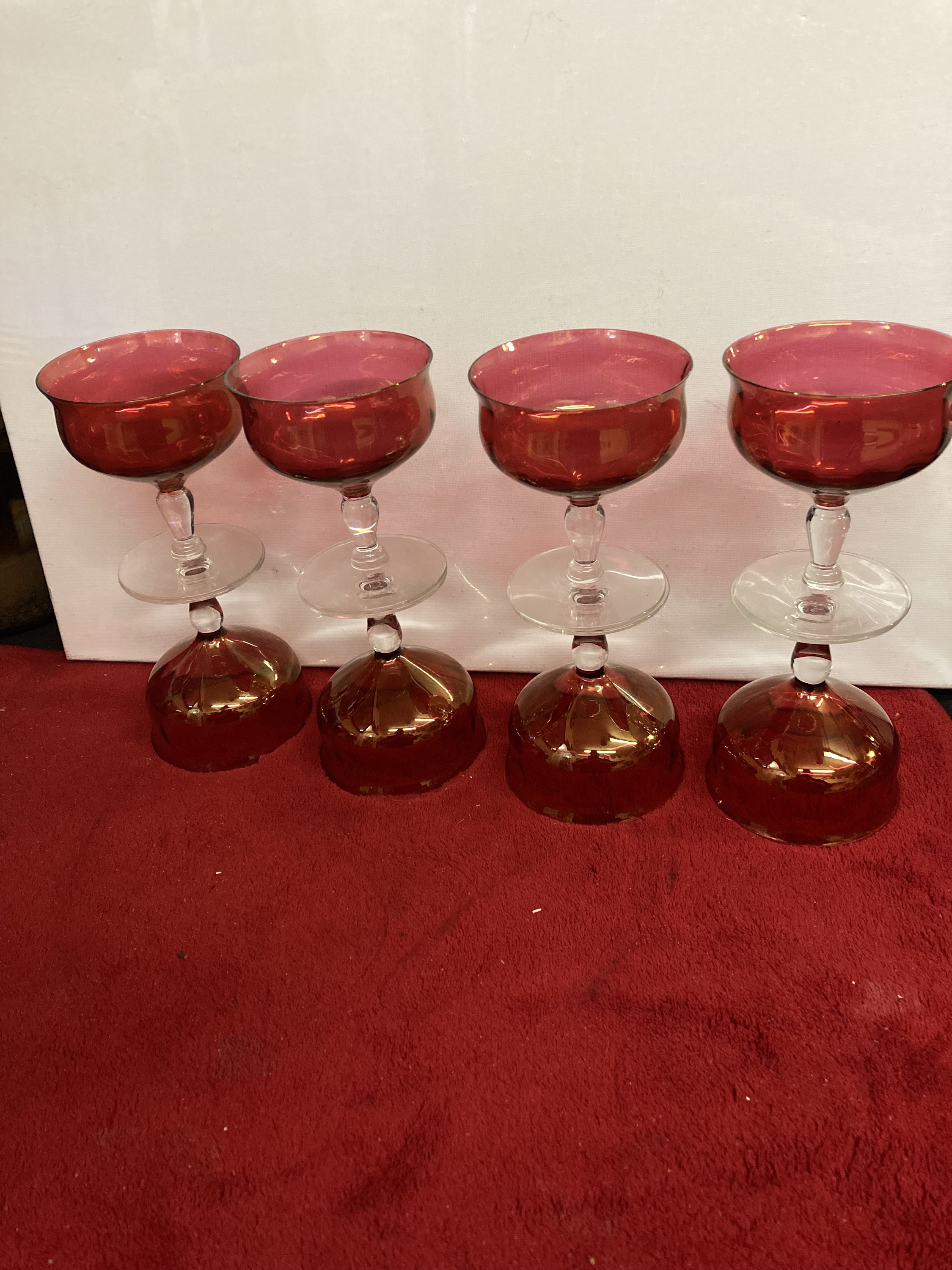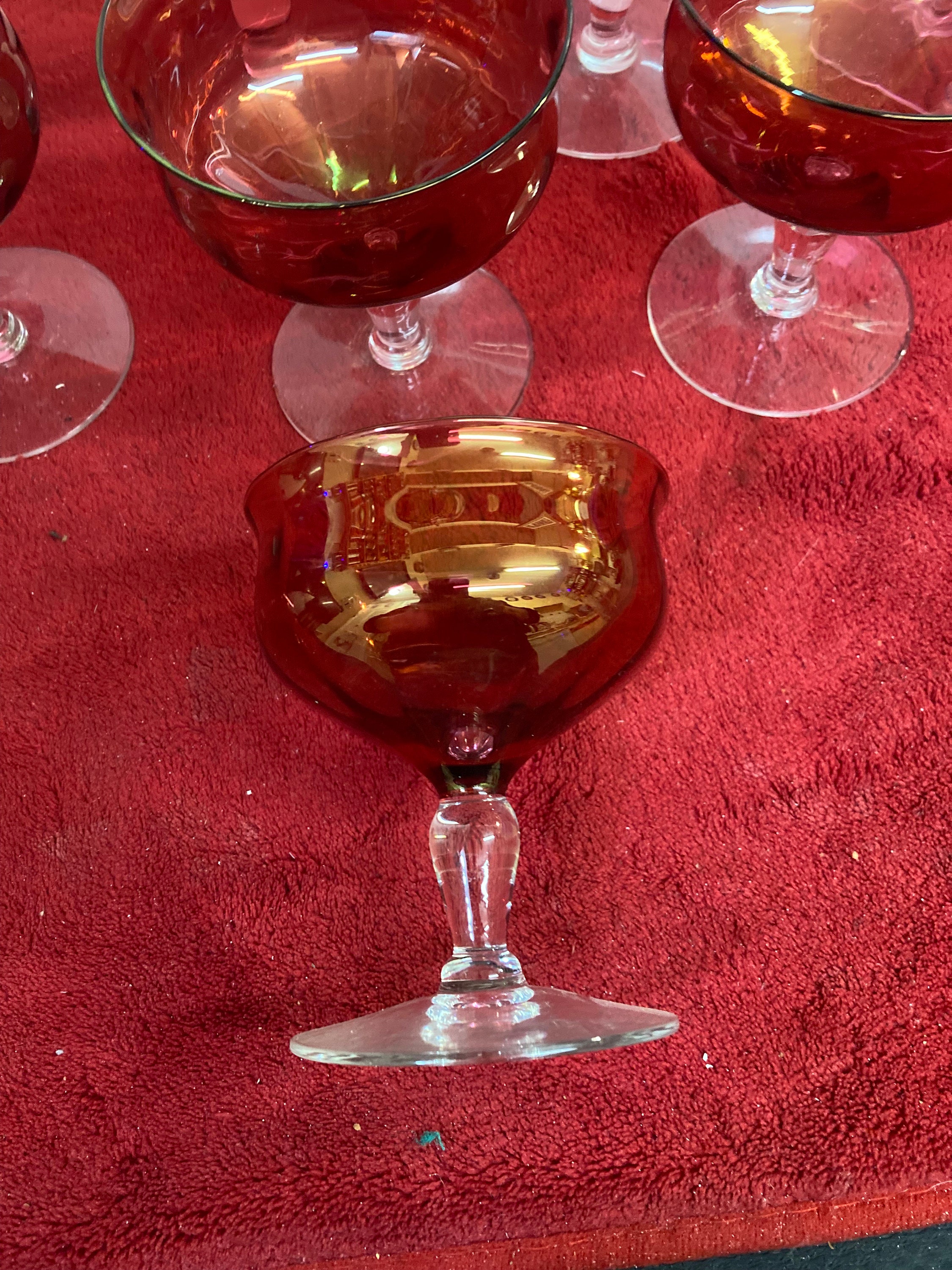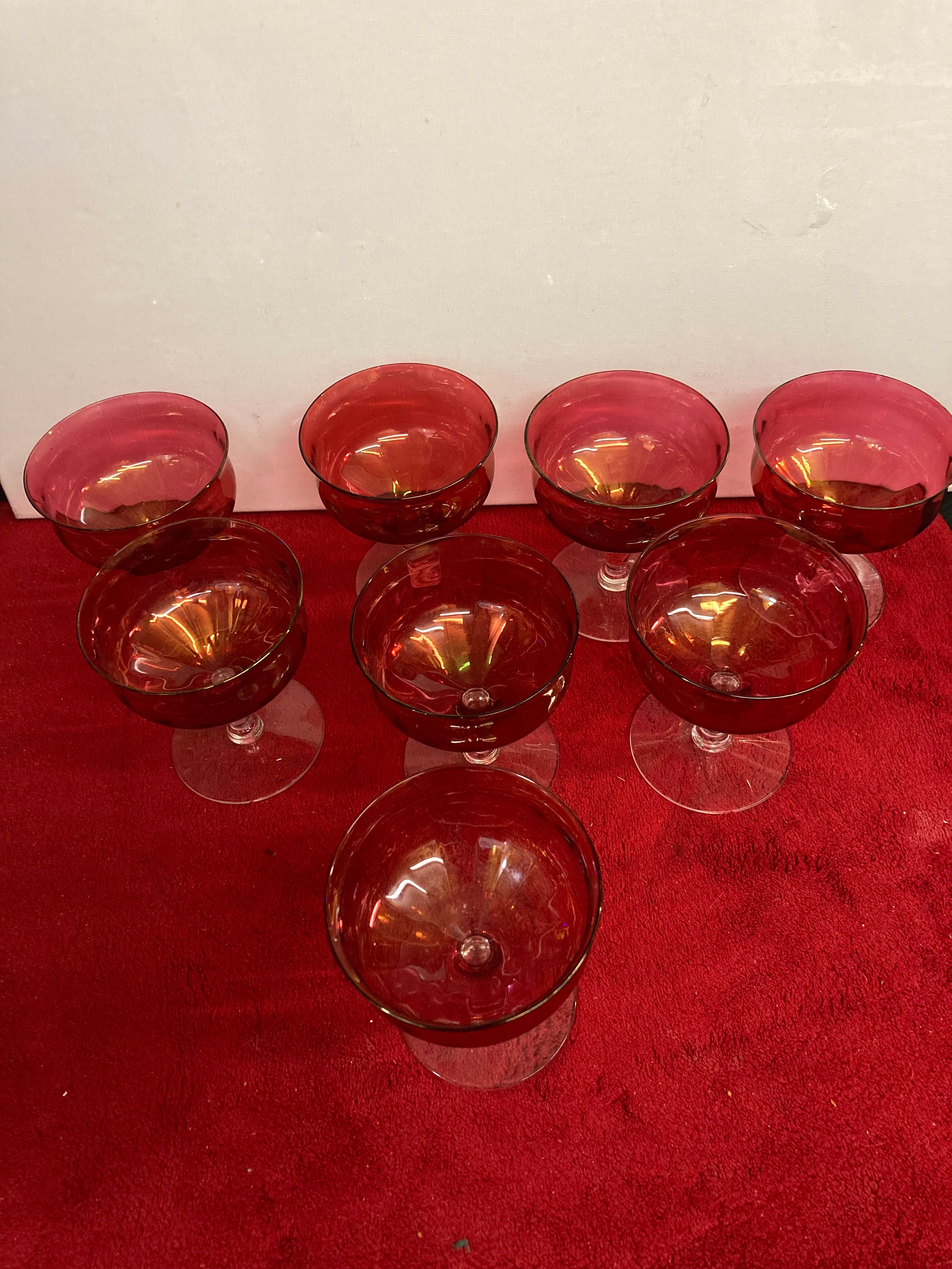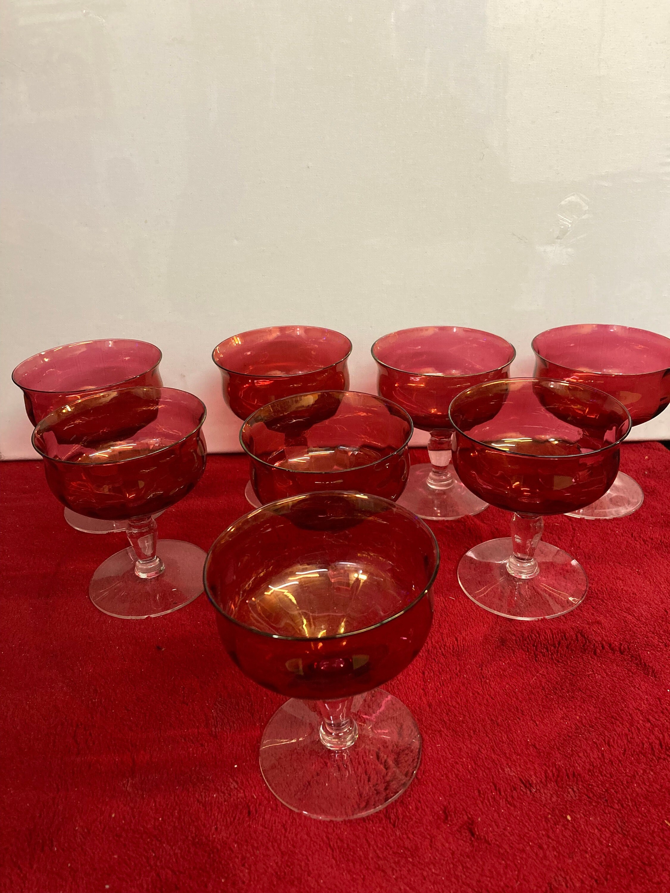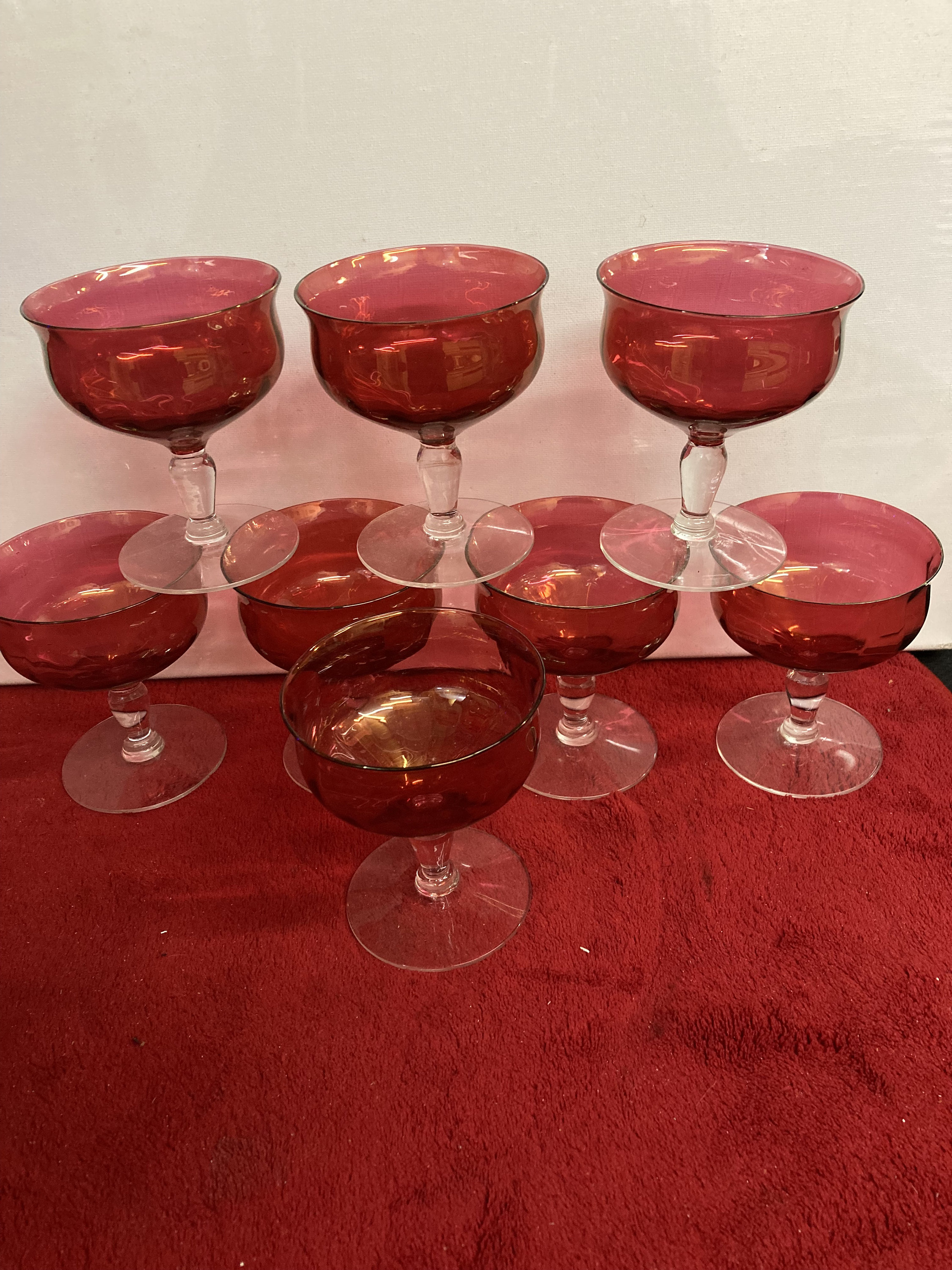Offered is a set of eight ruby red with clear stem vintage French crystal champagne coupes' glasses / barware