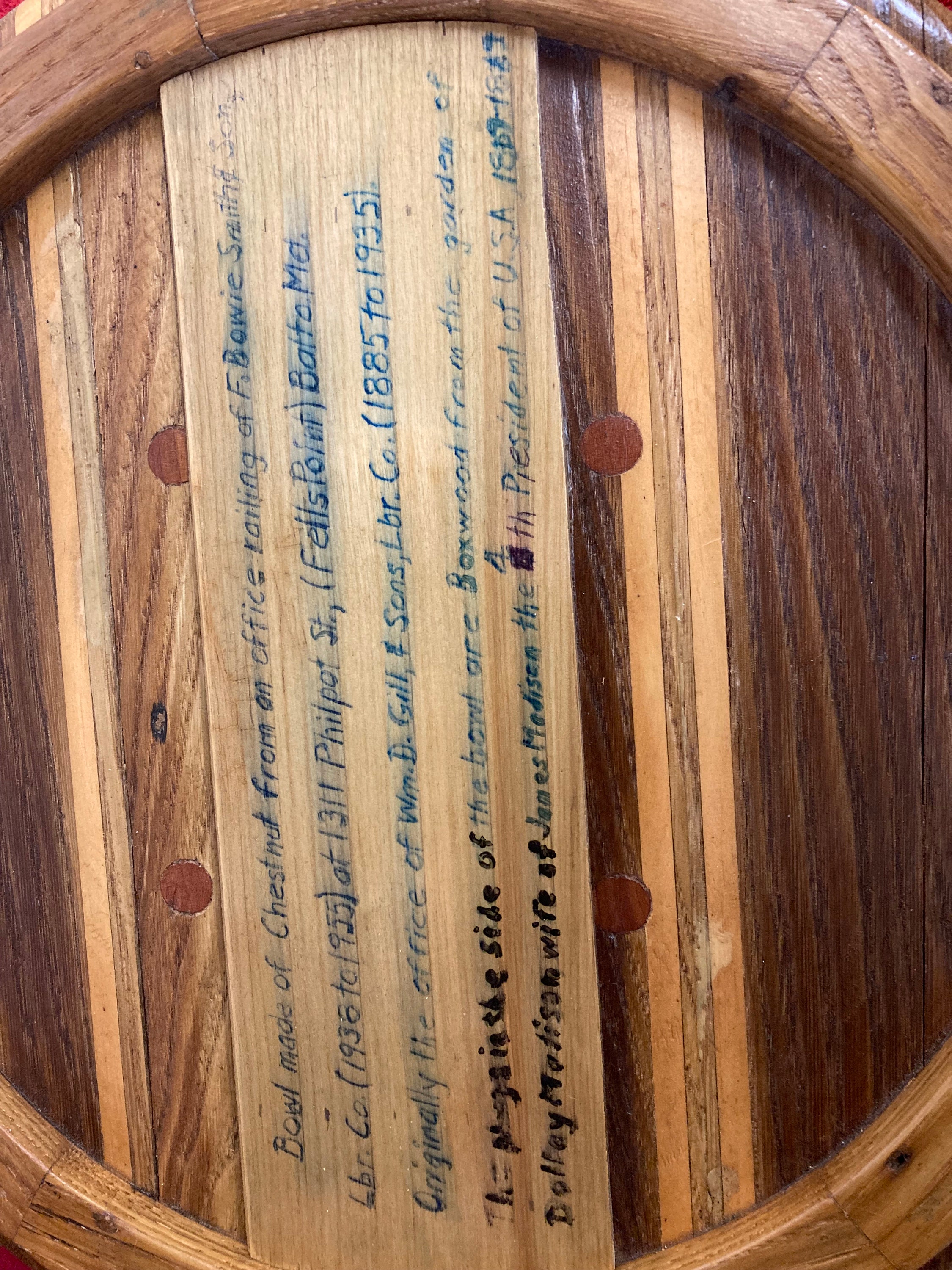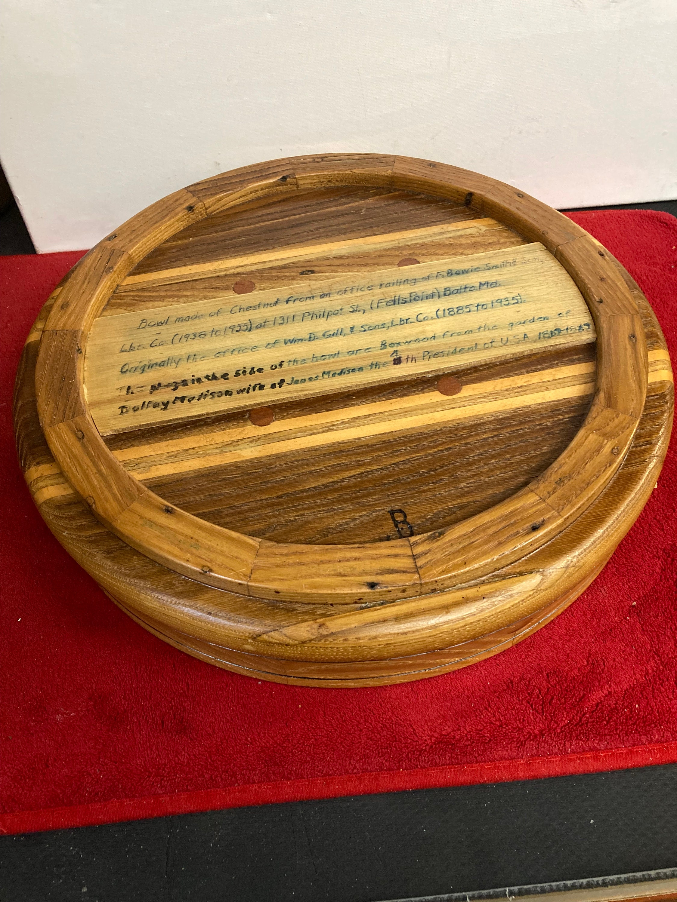 "BOWL made of Chestnut from an office railing of F. Bowie Smith & Son