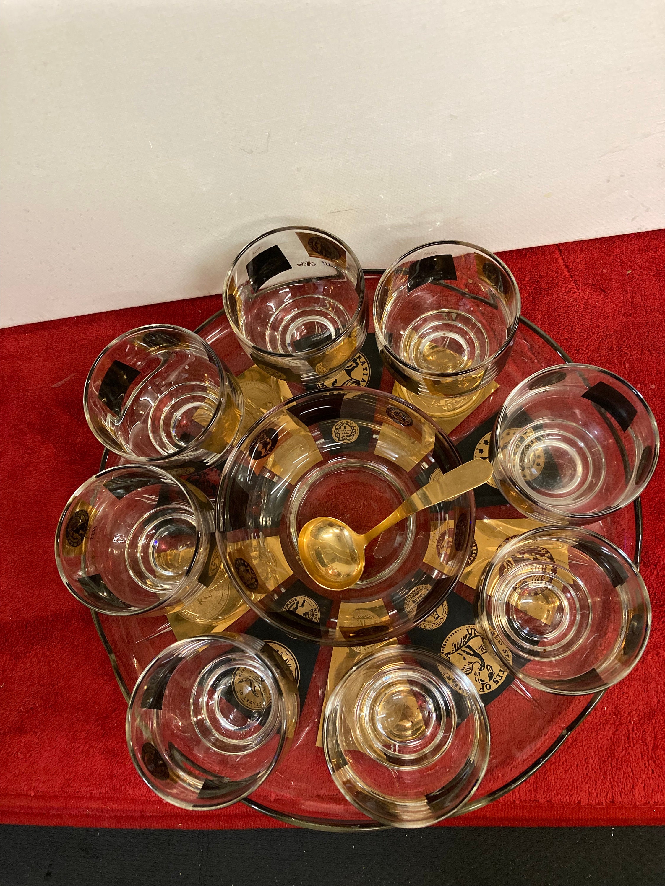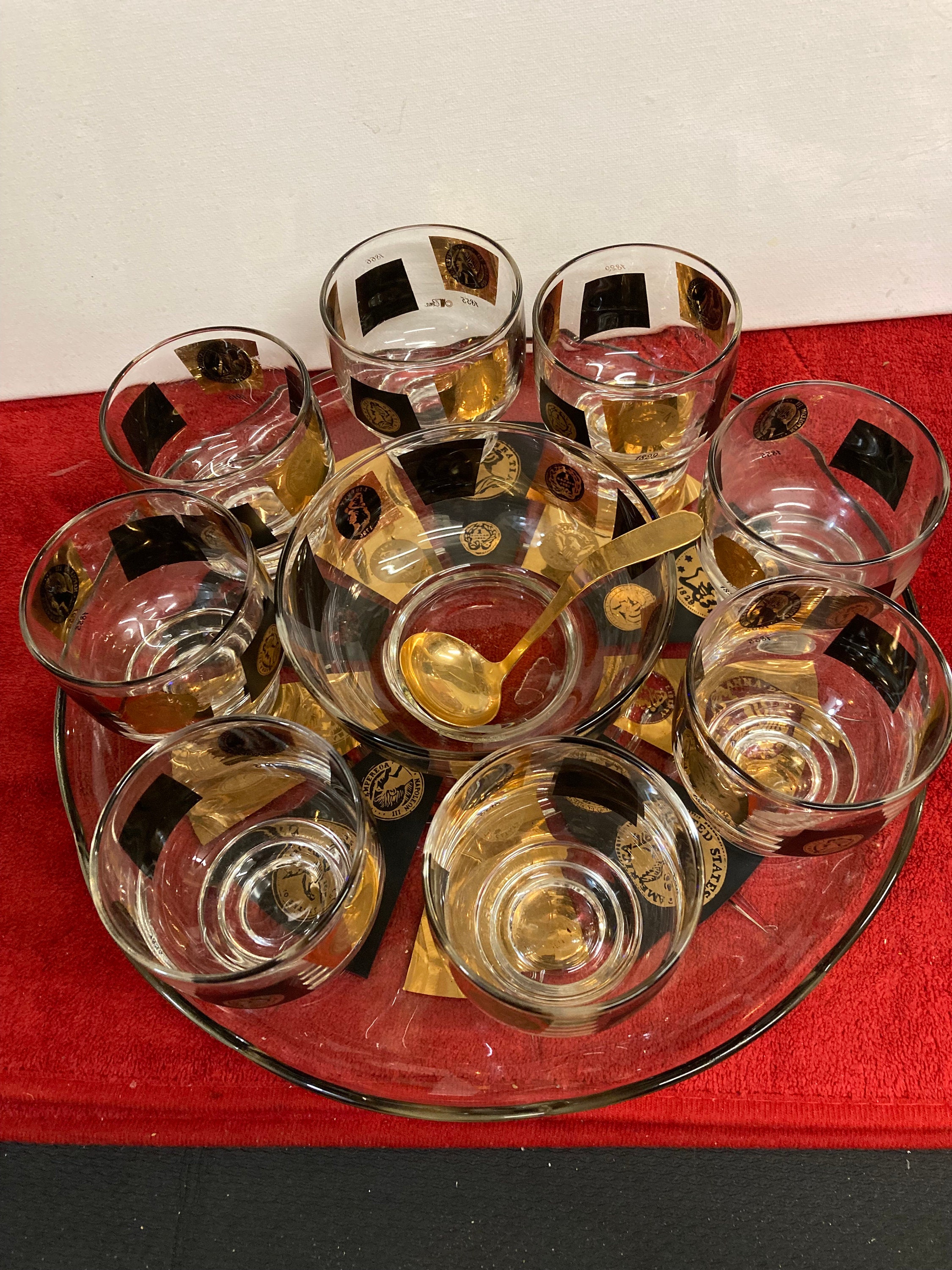 The glasses feature "US Coins" in black and 22-karat gold Mid-Century Modern barware glasses by Cera