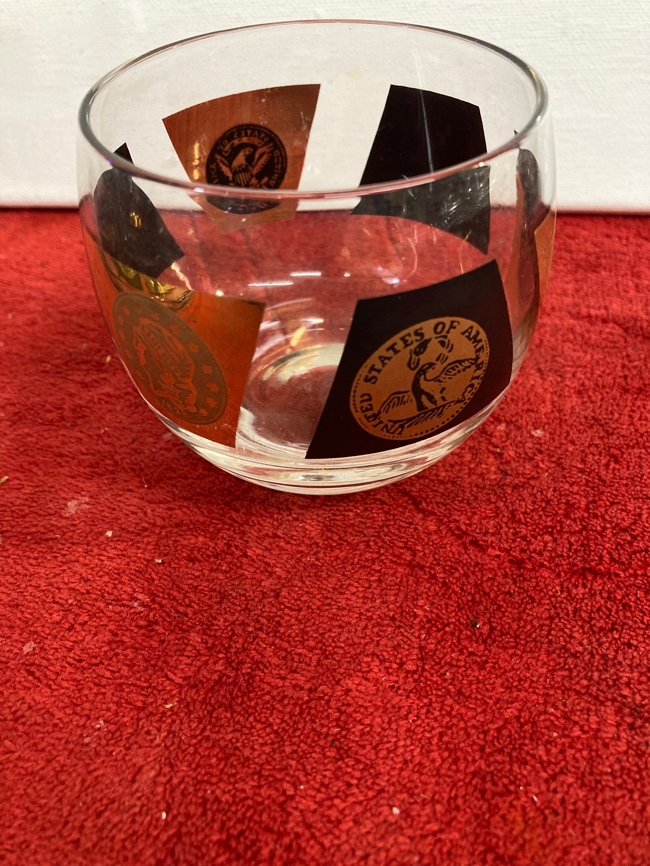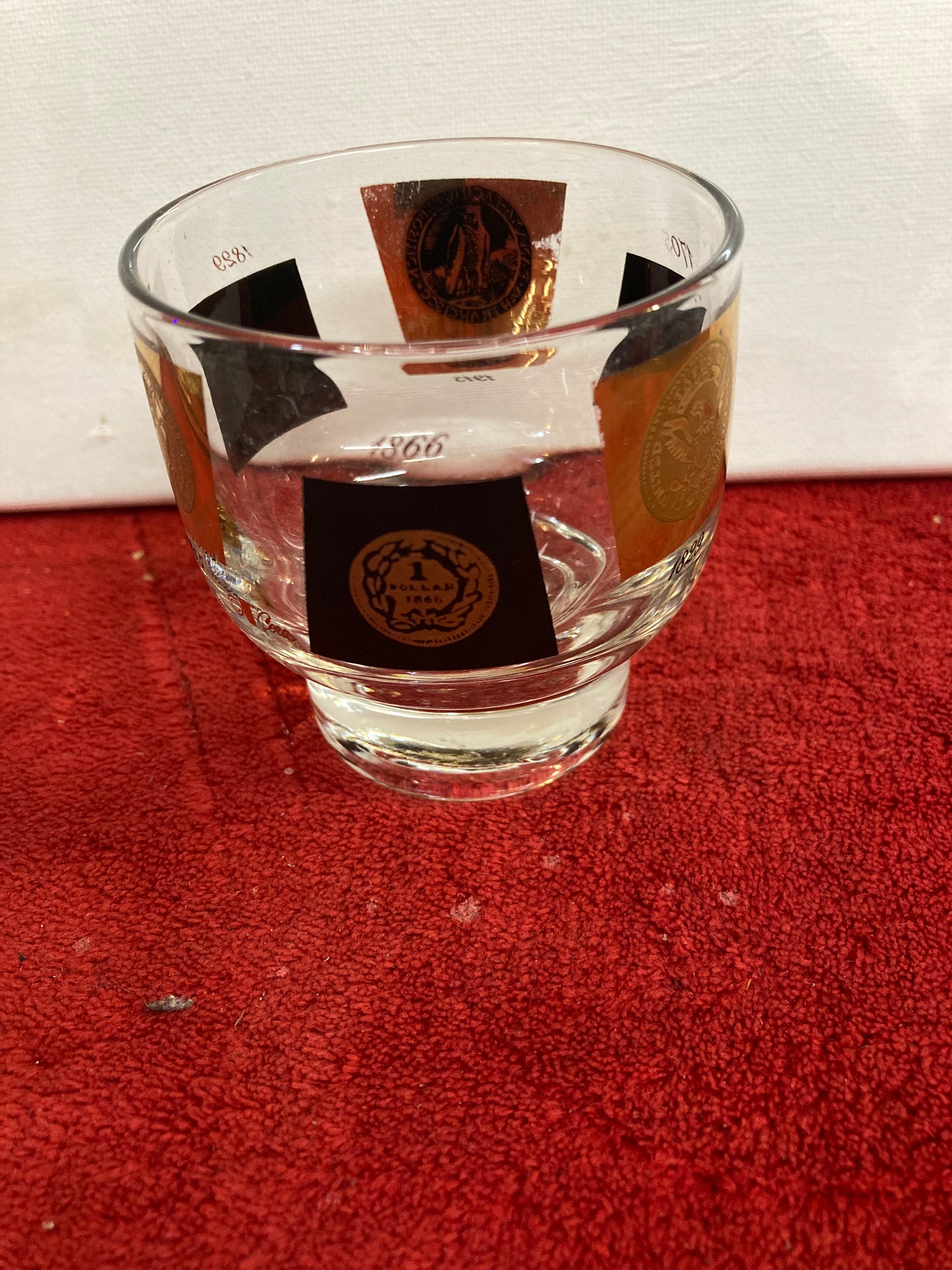 Midcentury vintage Set of 10 pieces set rocks glasses 1960s gold printed presidential coins.