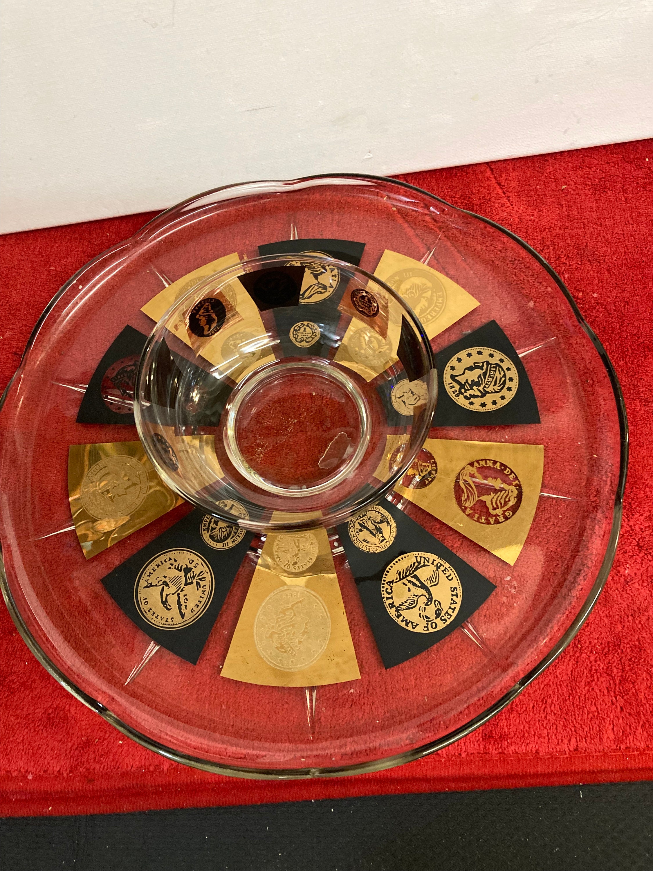 Vintage Midcentury Barware Set, Rocks Glasses with Serving Plate 1960s Gold Presidential Coins