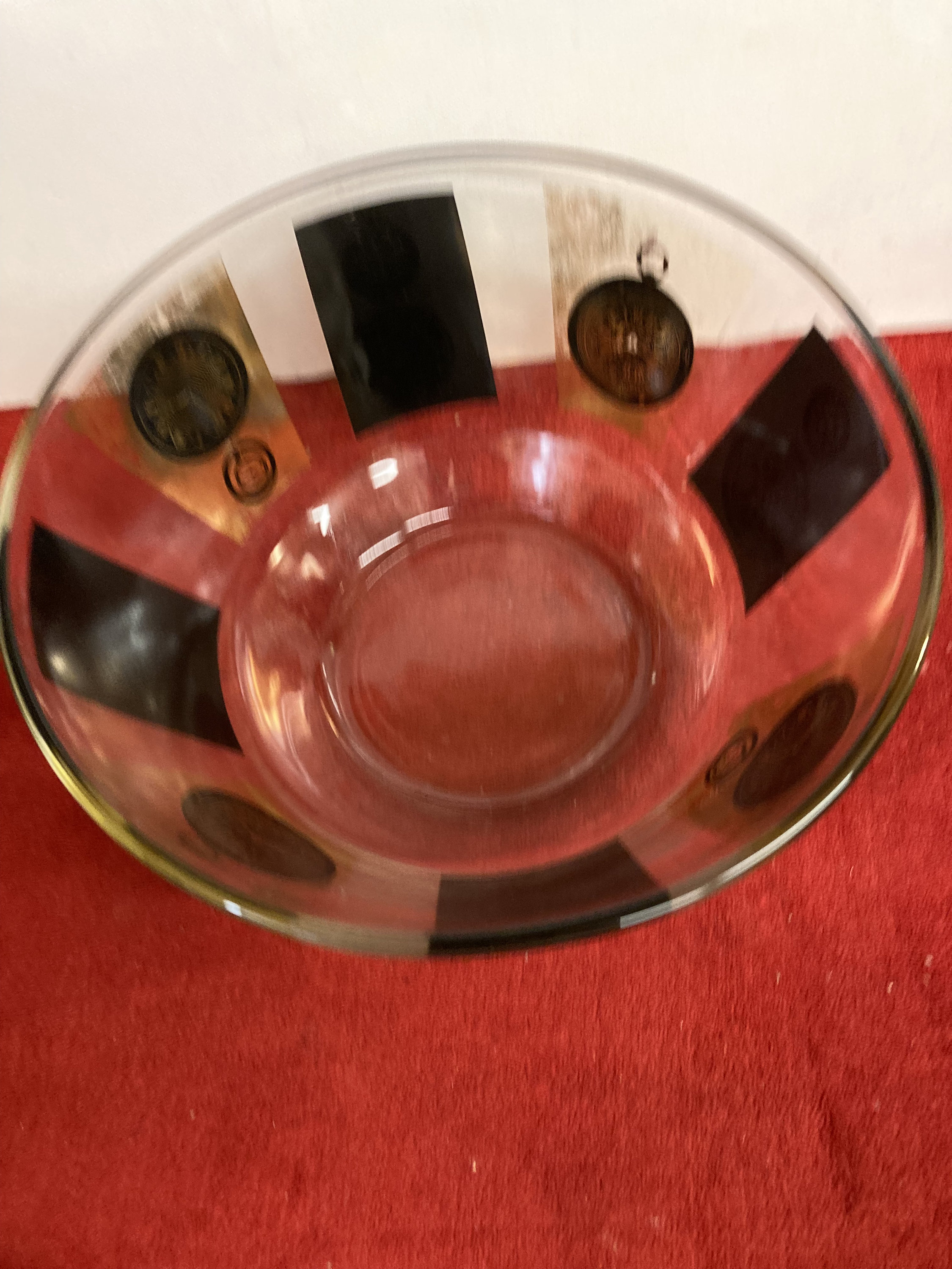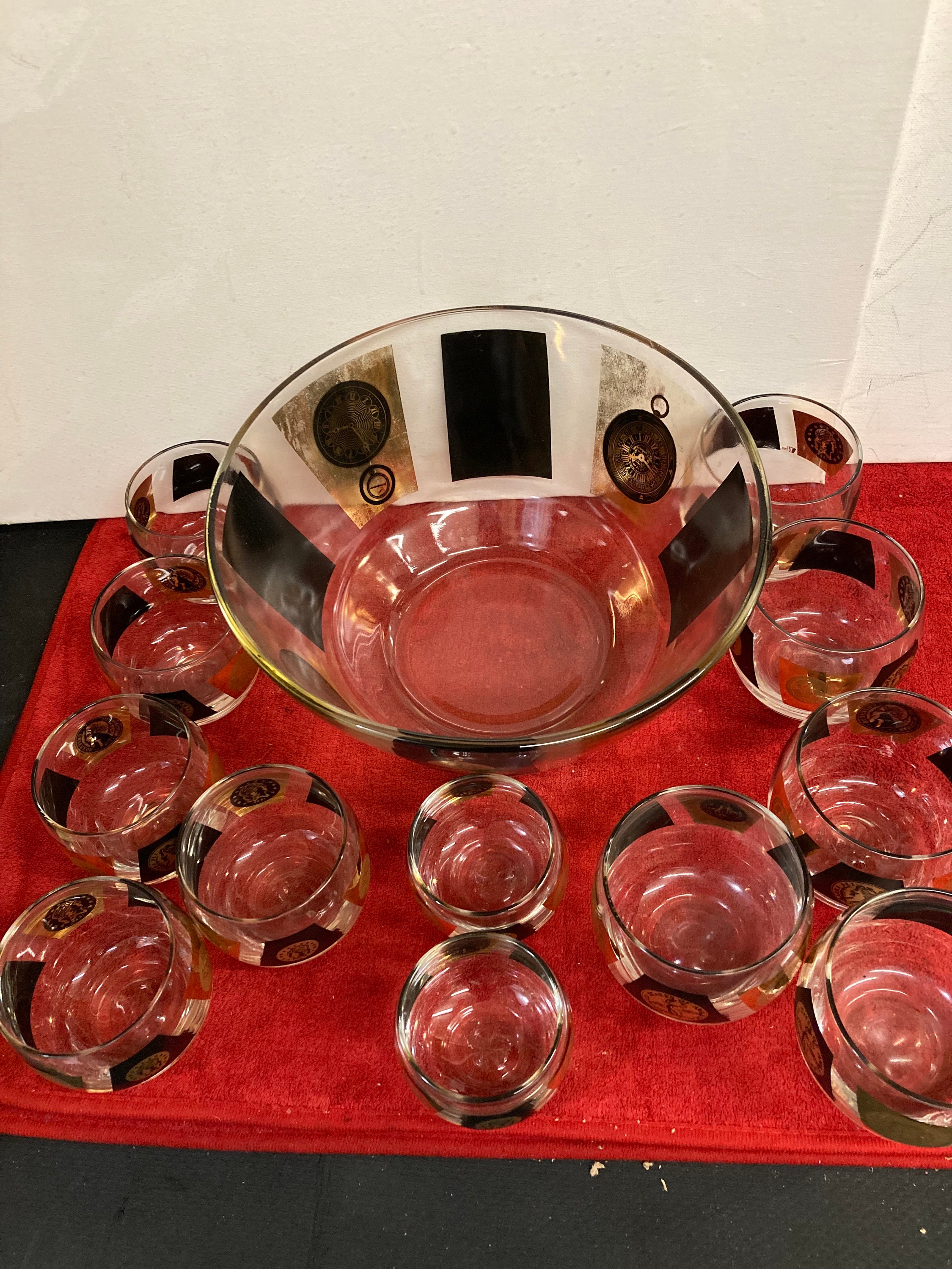 Cera Punch Bowl with 12 Assorted Low Ball Blasses coin clear gold and black coin mid century vintage