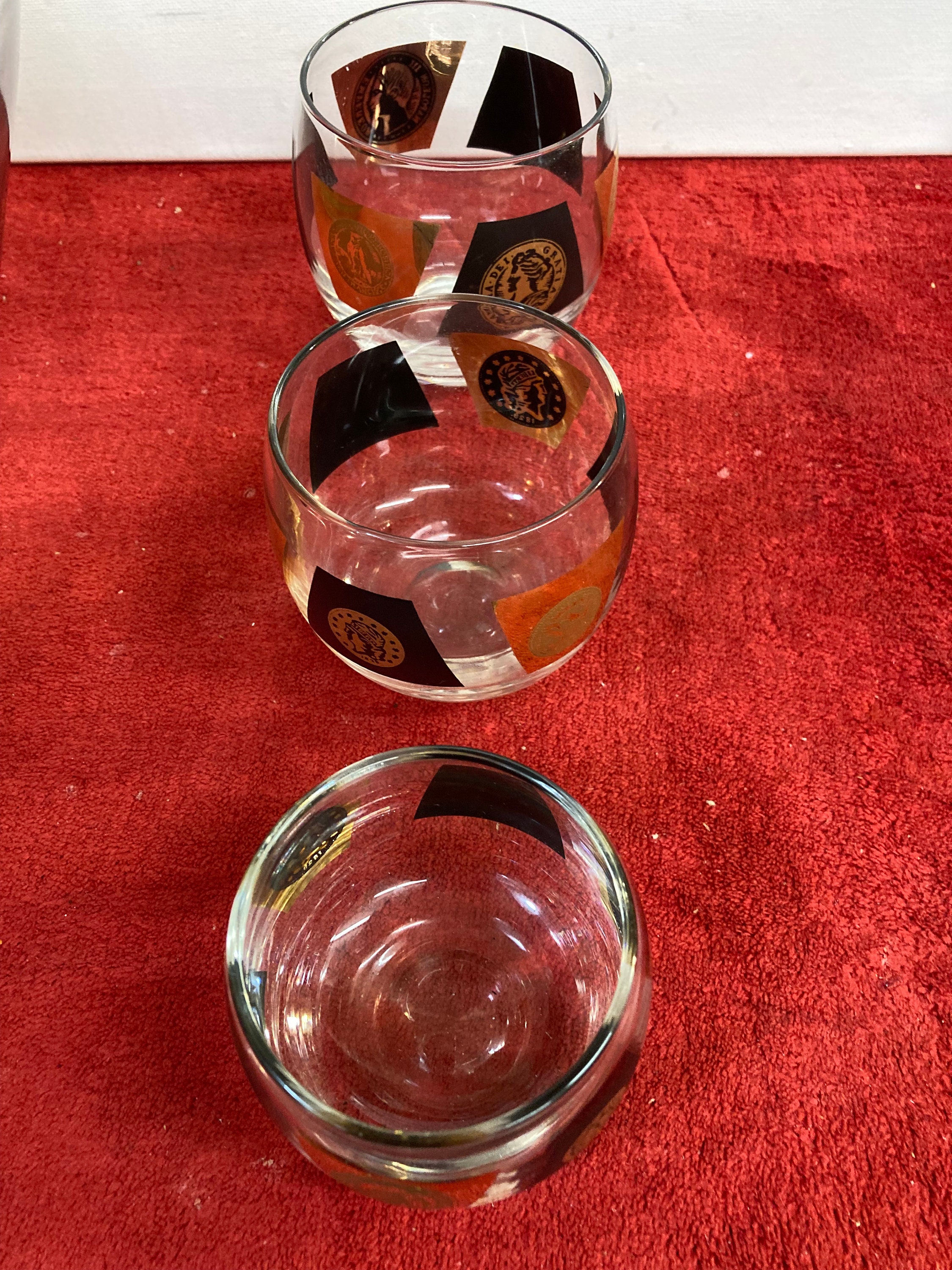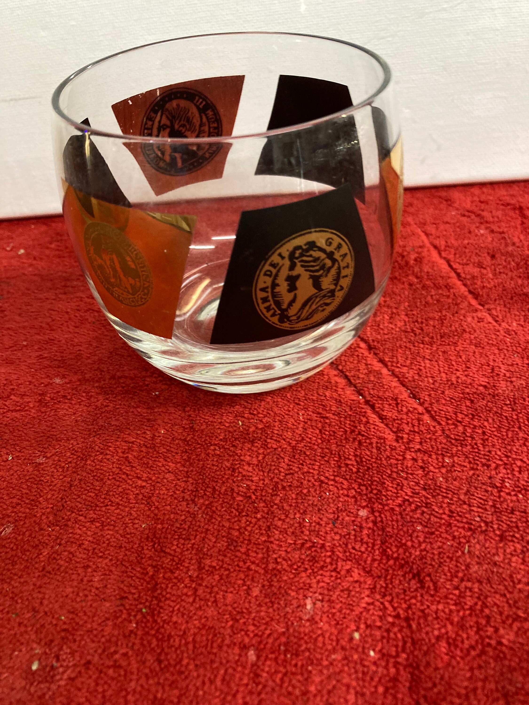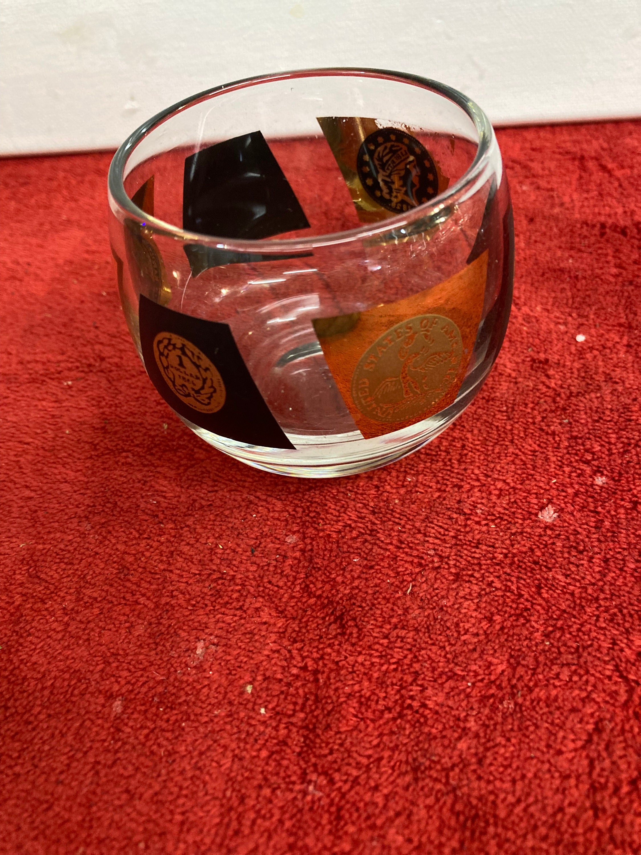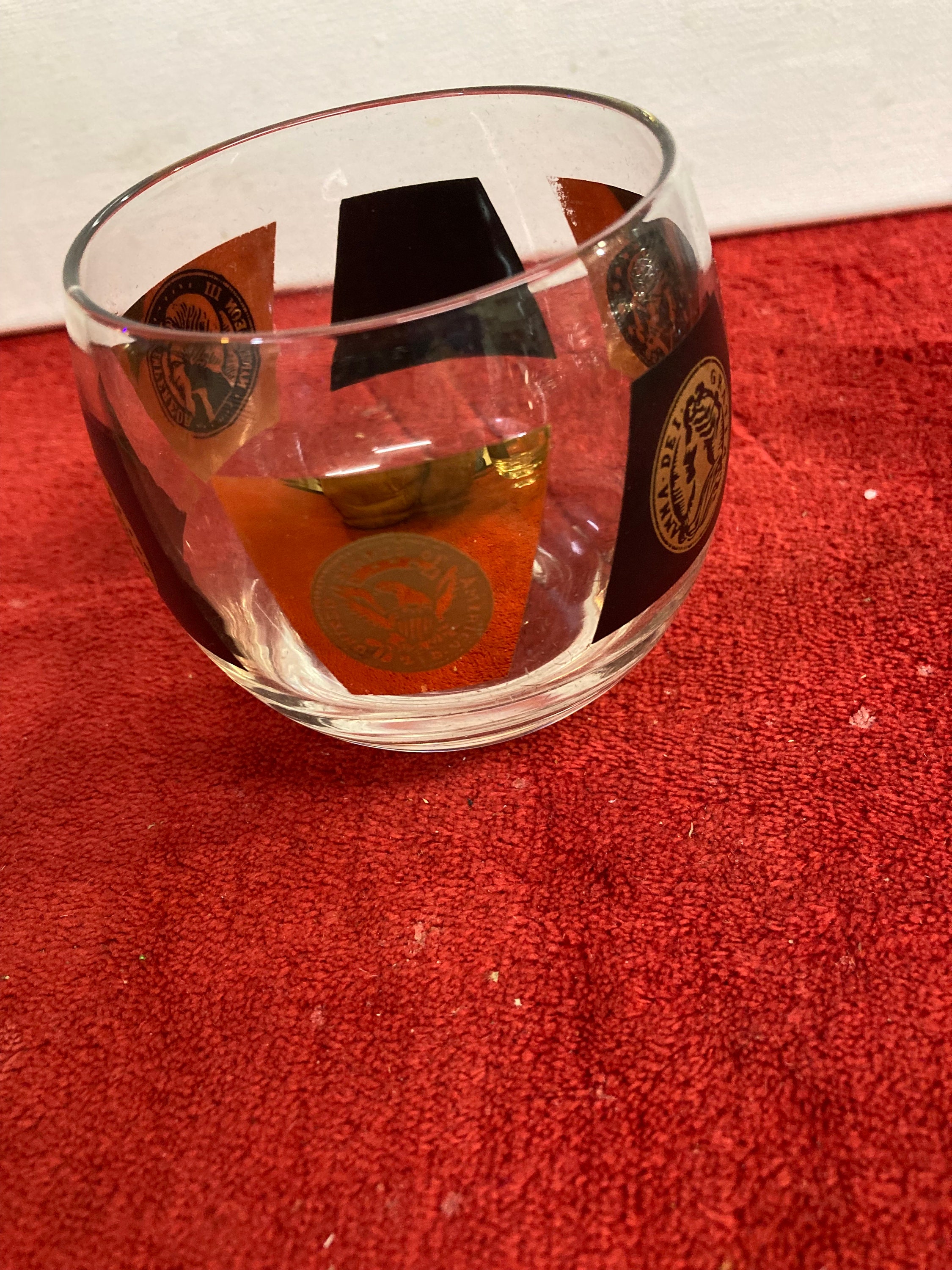 Midcentury vintage Set of 13 pieces Rocks glasses 1960s gold printed presidential coins.