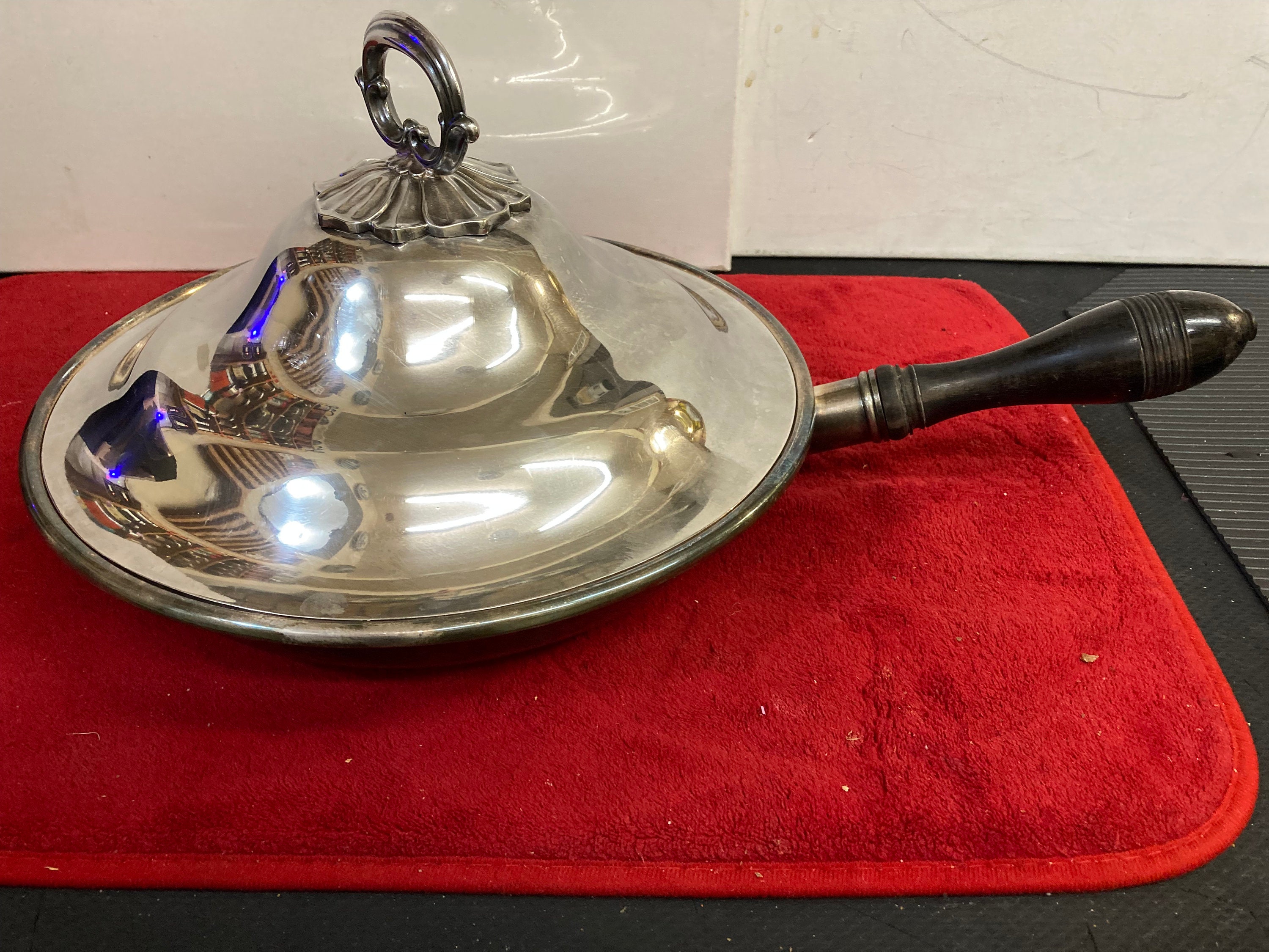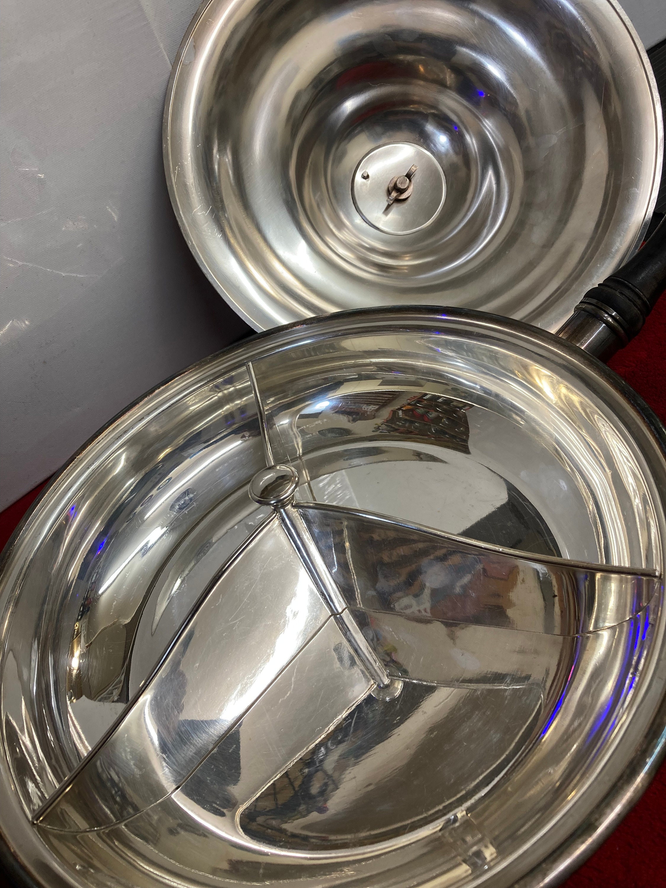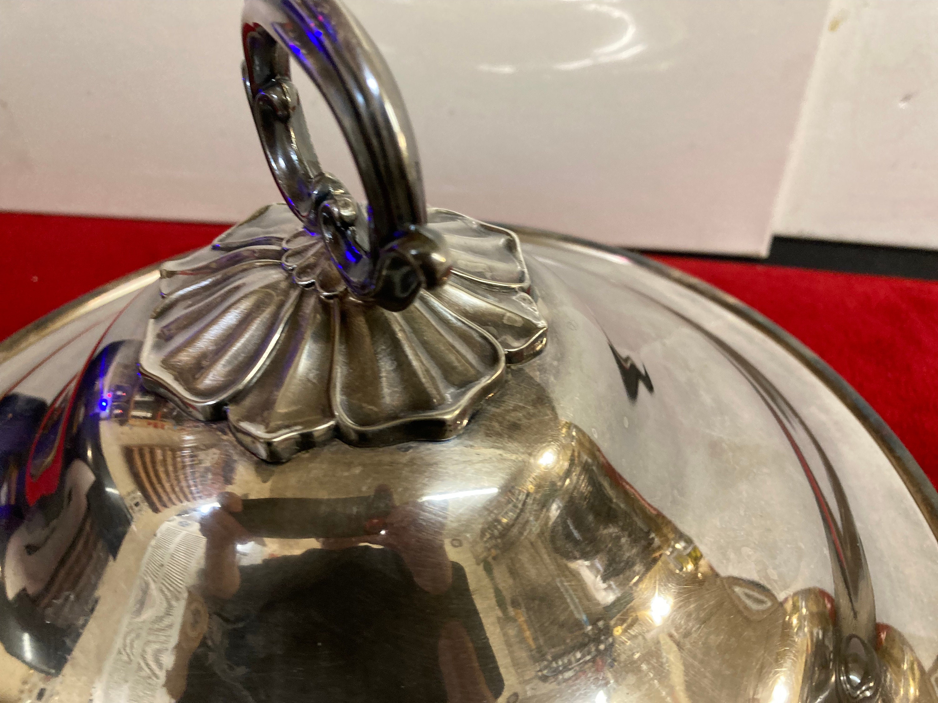 Bearing the Elkington CROWN mark (in use prior to 1895) and the date code of 1880, this handsome silver plate serving dish is equality appropriate for the antique silver plate collector or to grace your traditional table. With three deep well sections divider, elegant lid and dark wood handle.