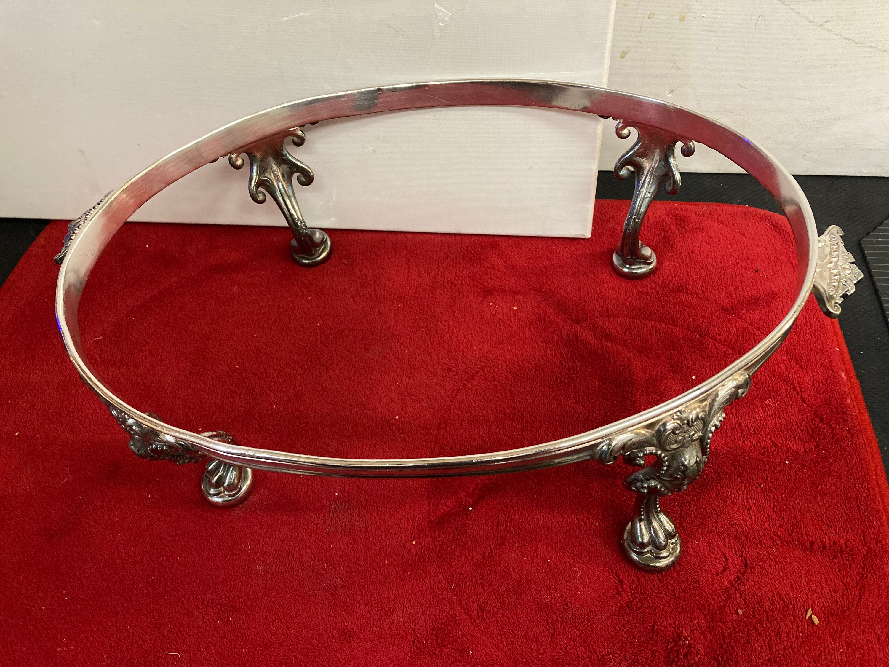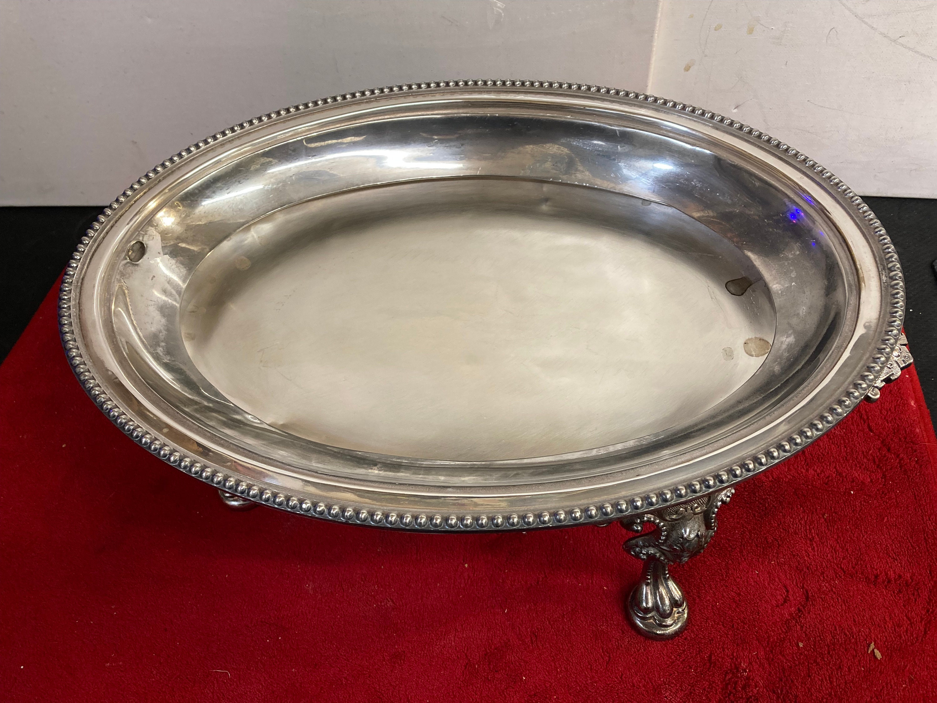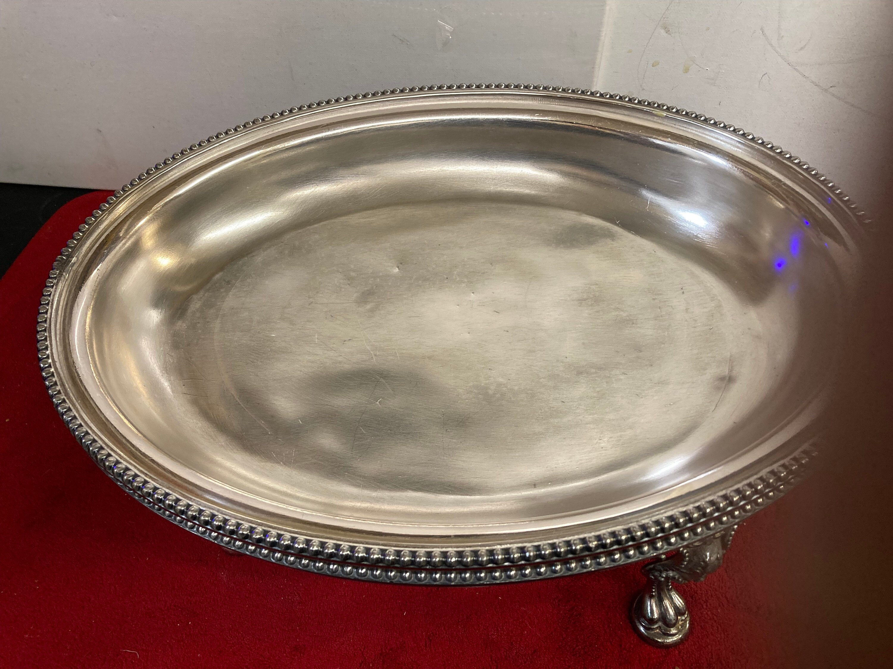 This antique silver plated warm food server was made by the well known Reed & Barton of the United States in approximately 1920 in an Edwardian style. The oval server or chafing dish has a graduated lid with stylized rope borders which are accented by the scroll and beaded decoration on the legs . The handles on the sides also have a beaded decoration which compliments the beading on the removable handle on the lid.