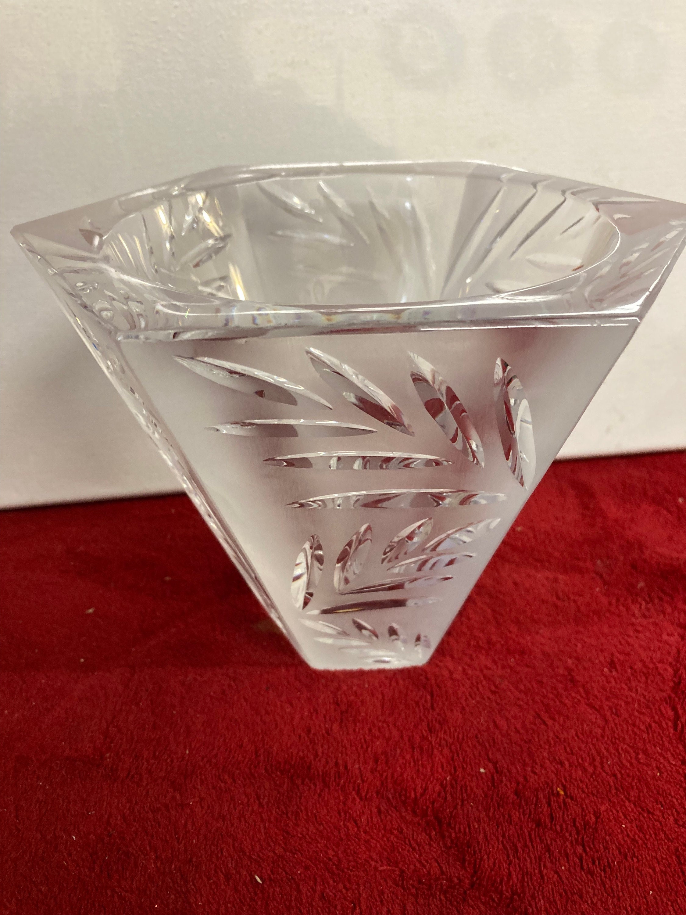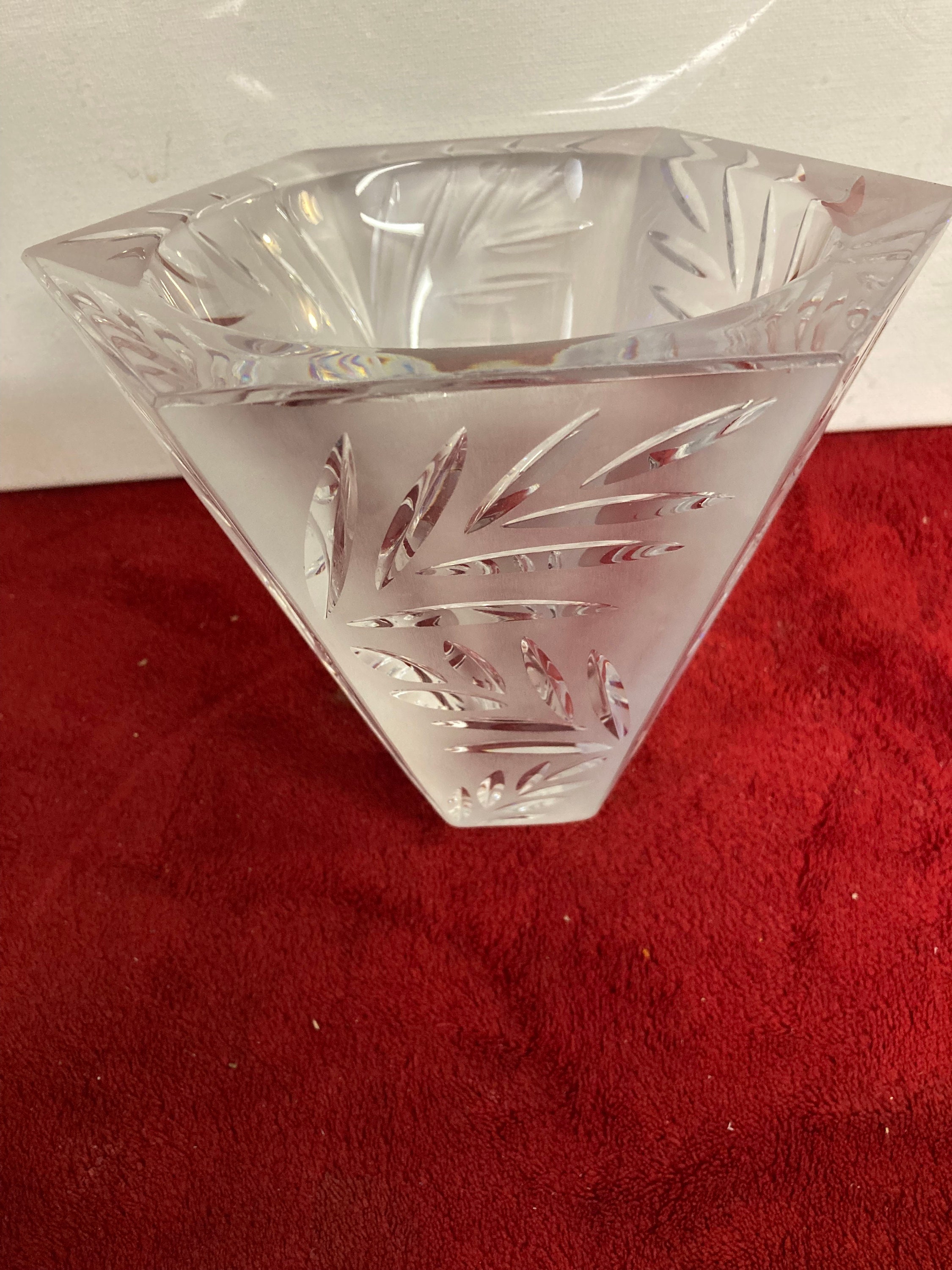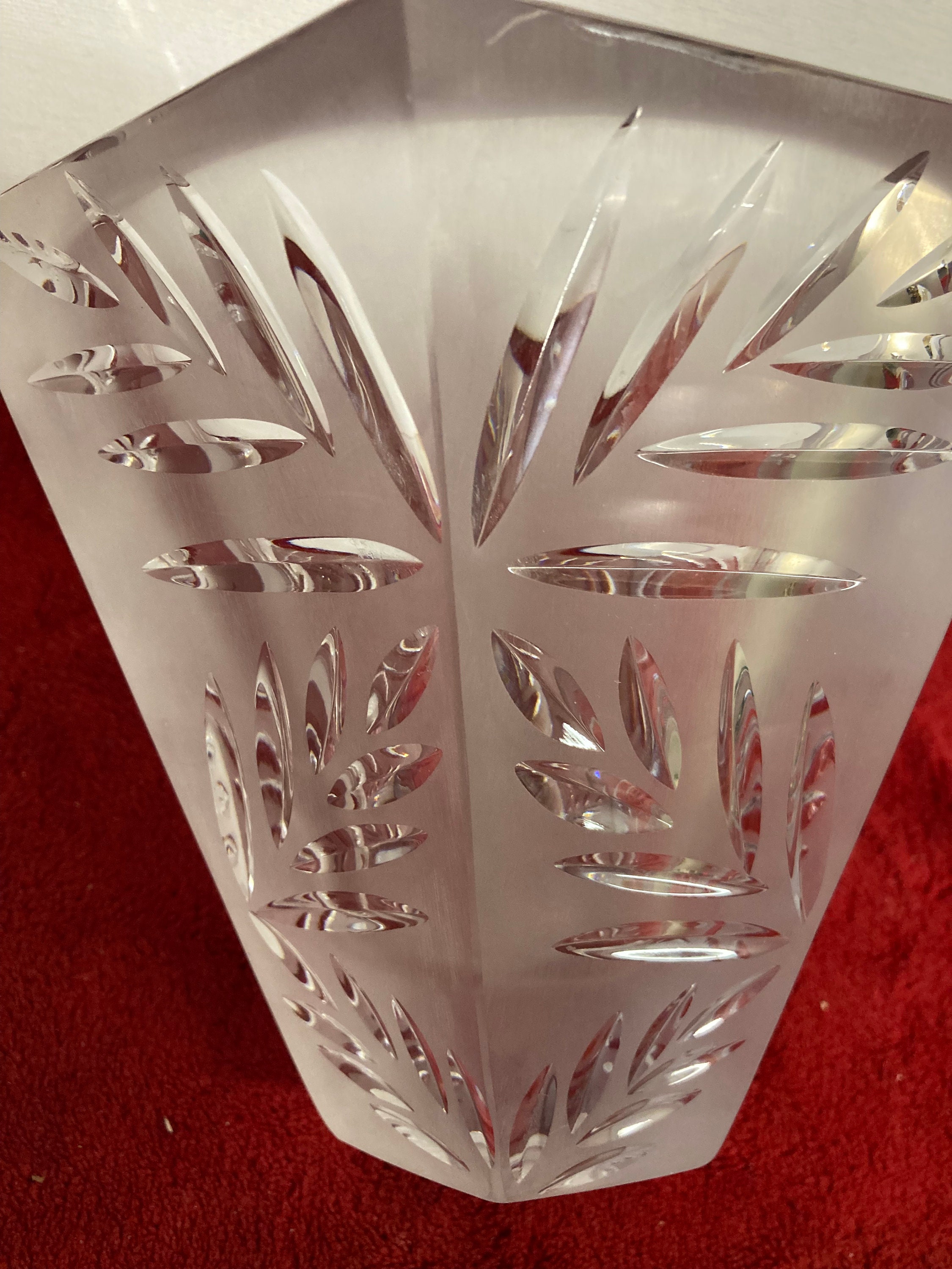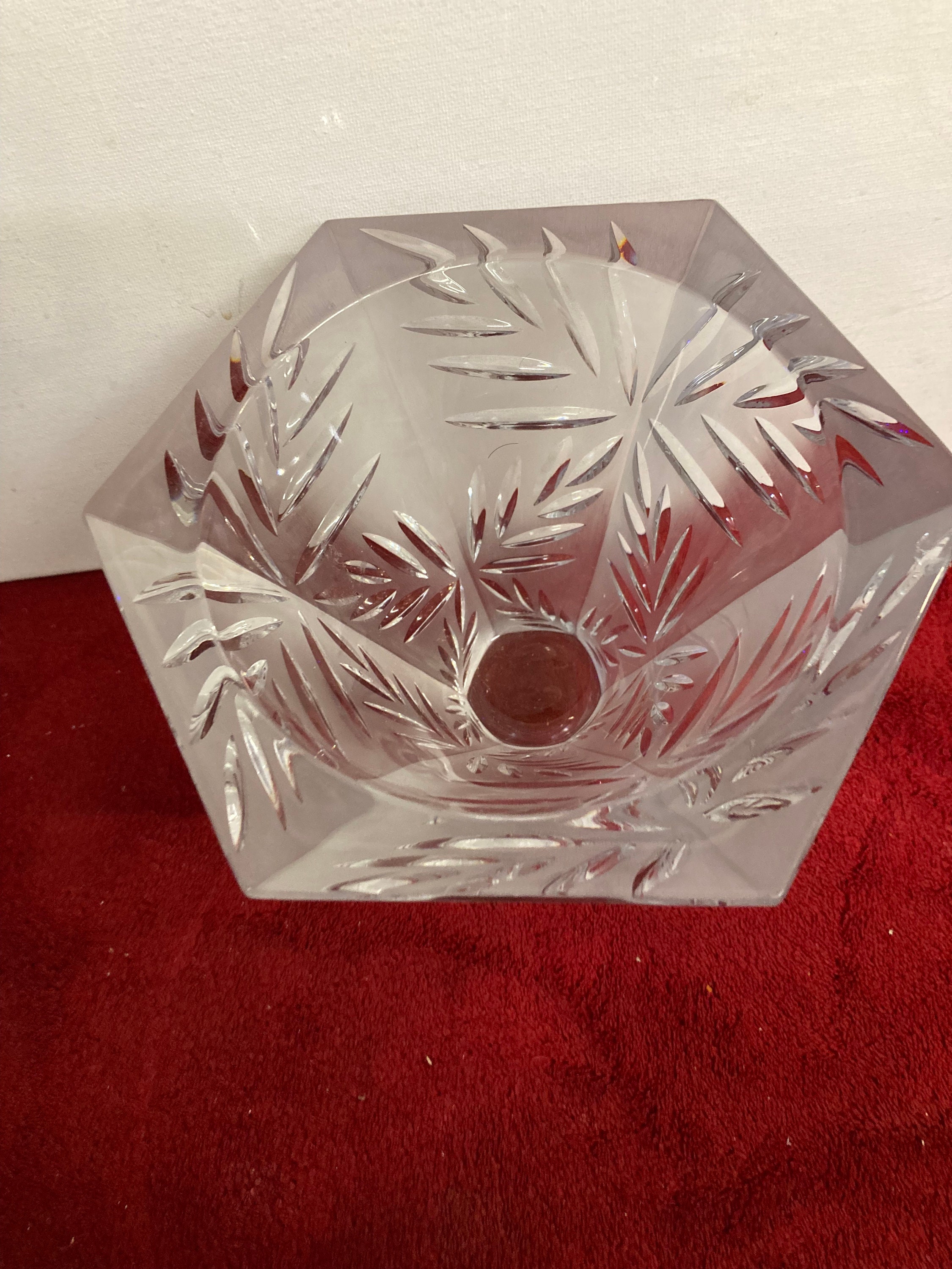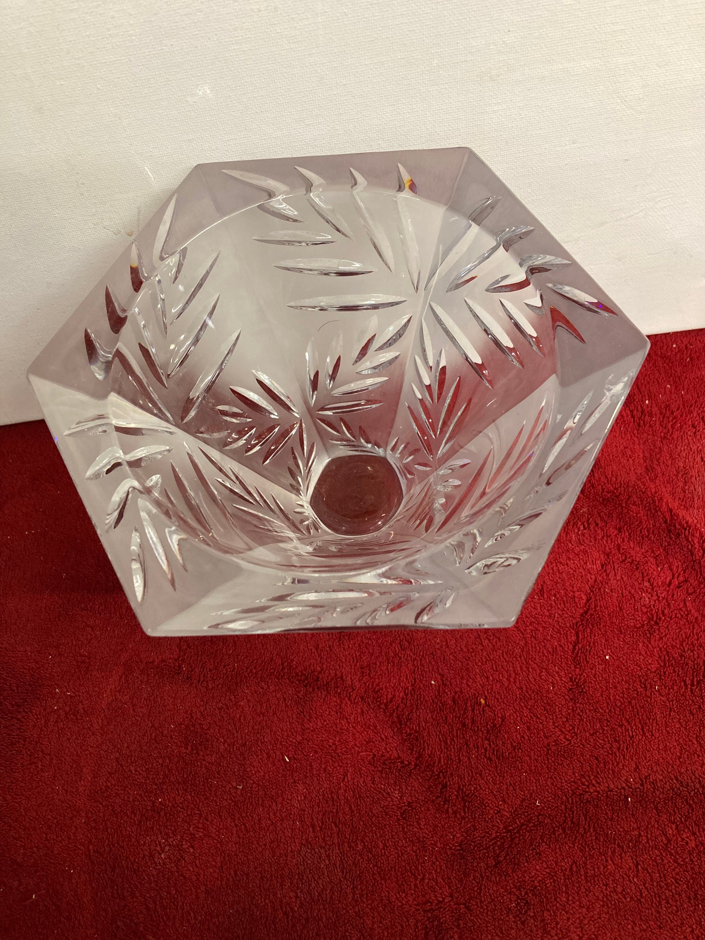 Heavy Crystal Bowl Hexagonal Paneled Pattern Leaf Design7 1/4 Diameter2" Base5 1/2 " Tall Weight : 6 lbsNo Marks Unknown Maker