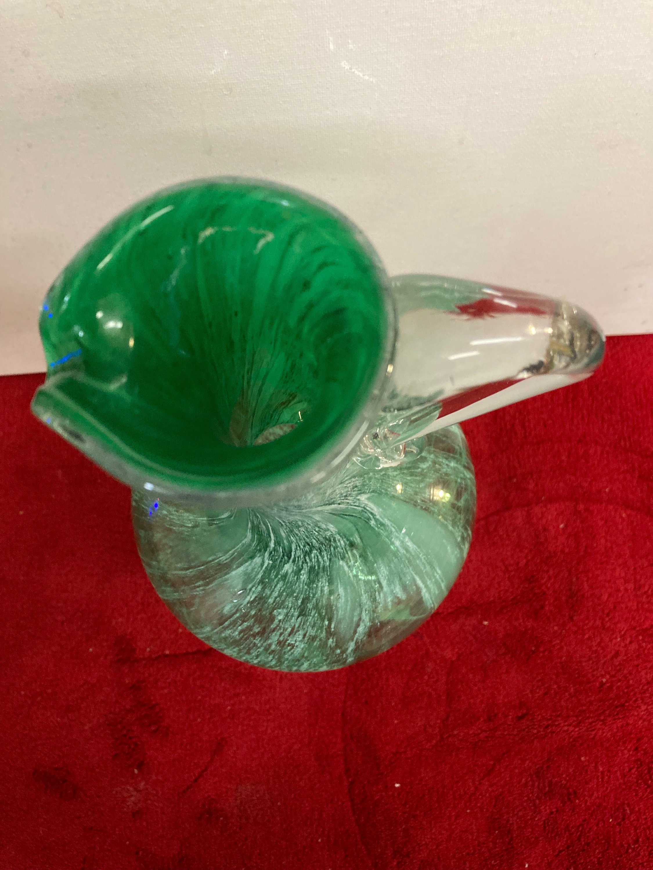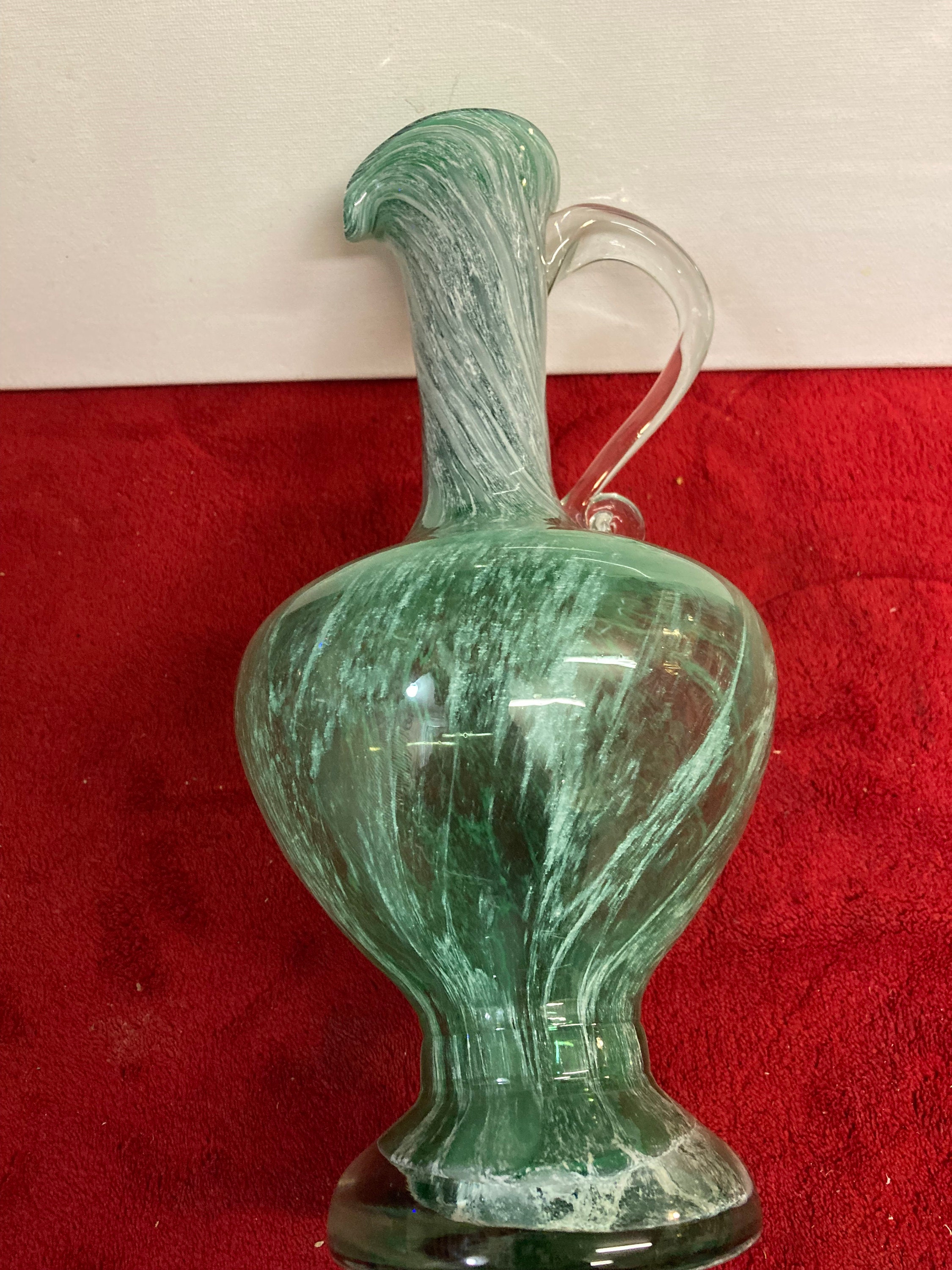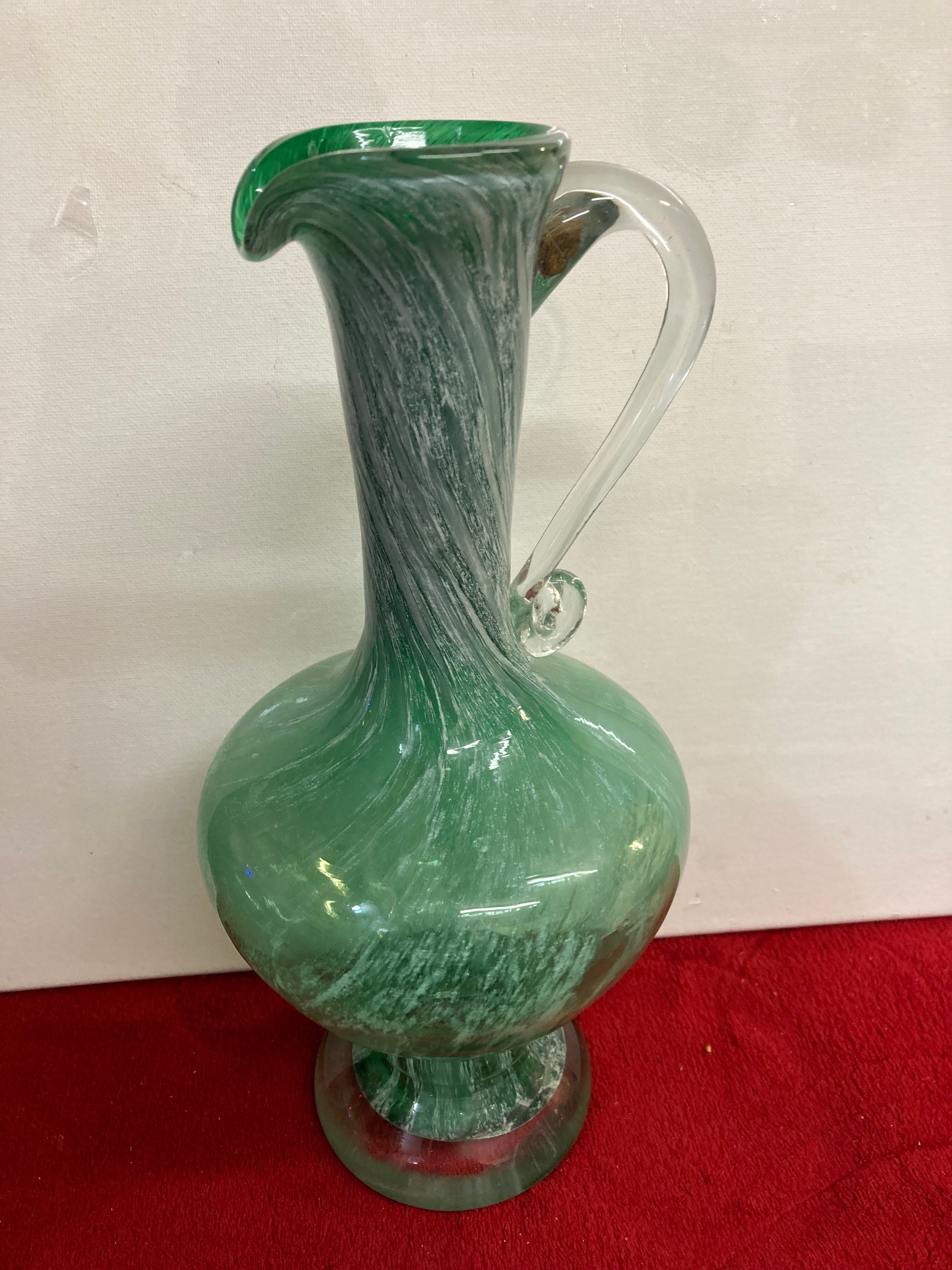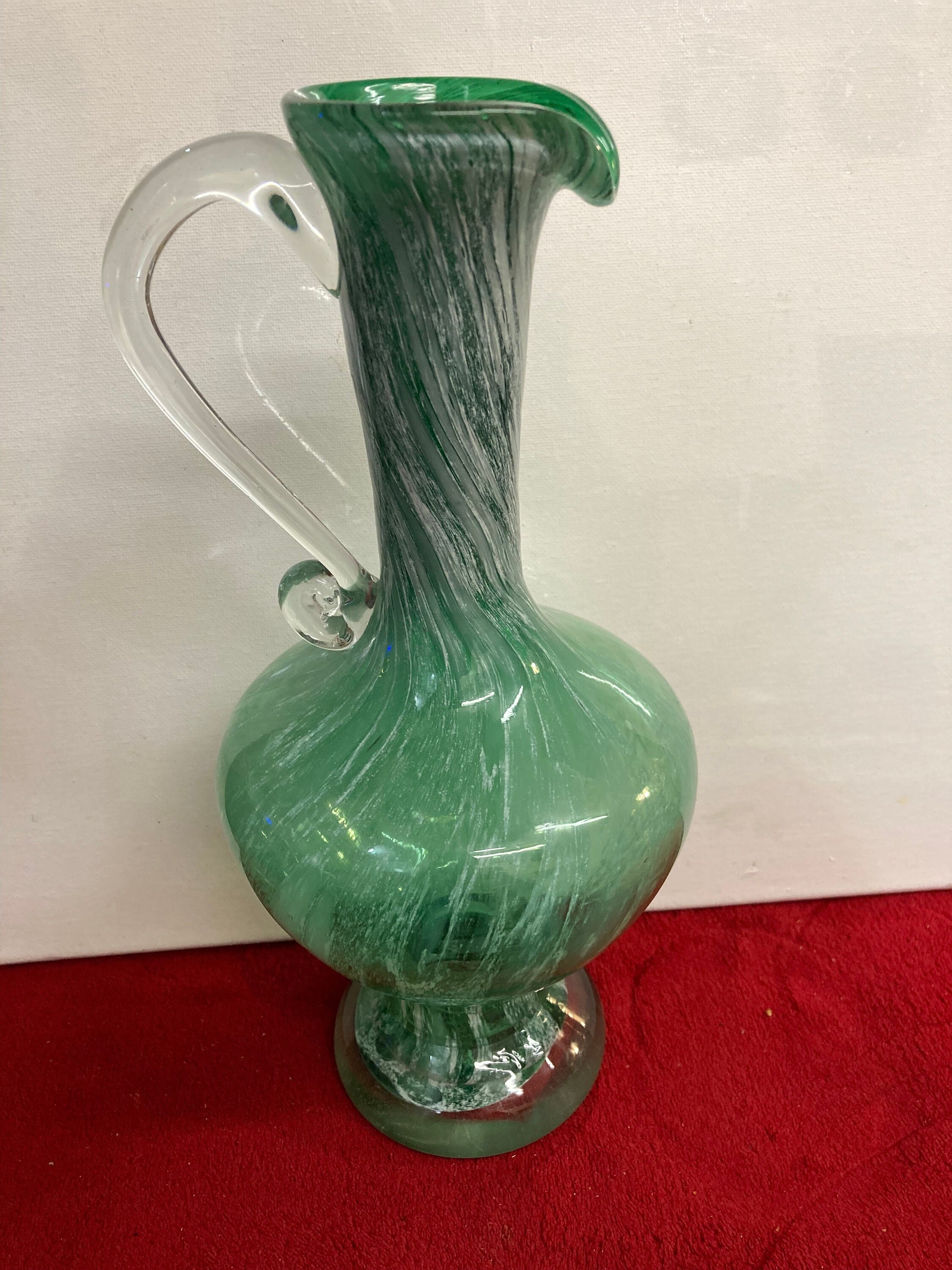 Handmade Green Glass Pitcher Applied Clear Handle11 " tall x 4 3/4" wide 2" opening & 3 3/4" baseWeight : 2 3/4 lbsExcellent ConditionNo Damages, chips or cracksOrigin : UnkownLooks like made by Murano