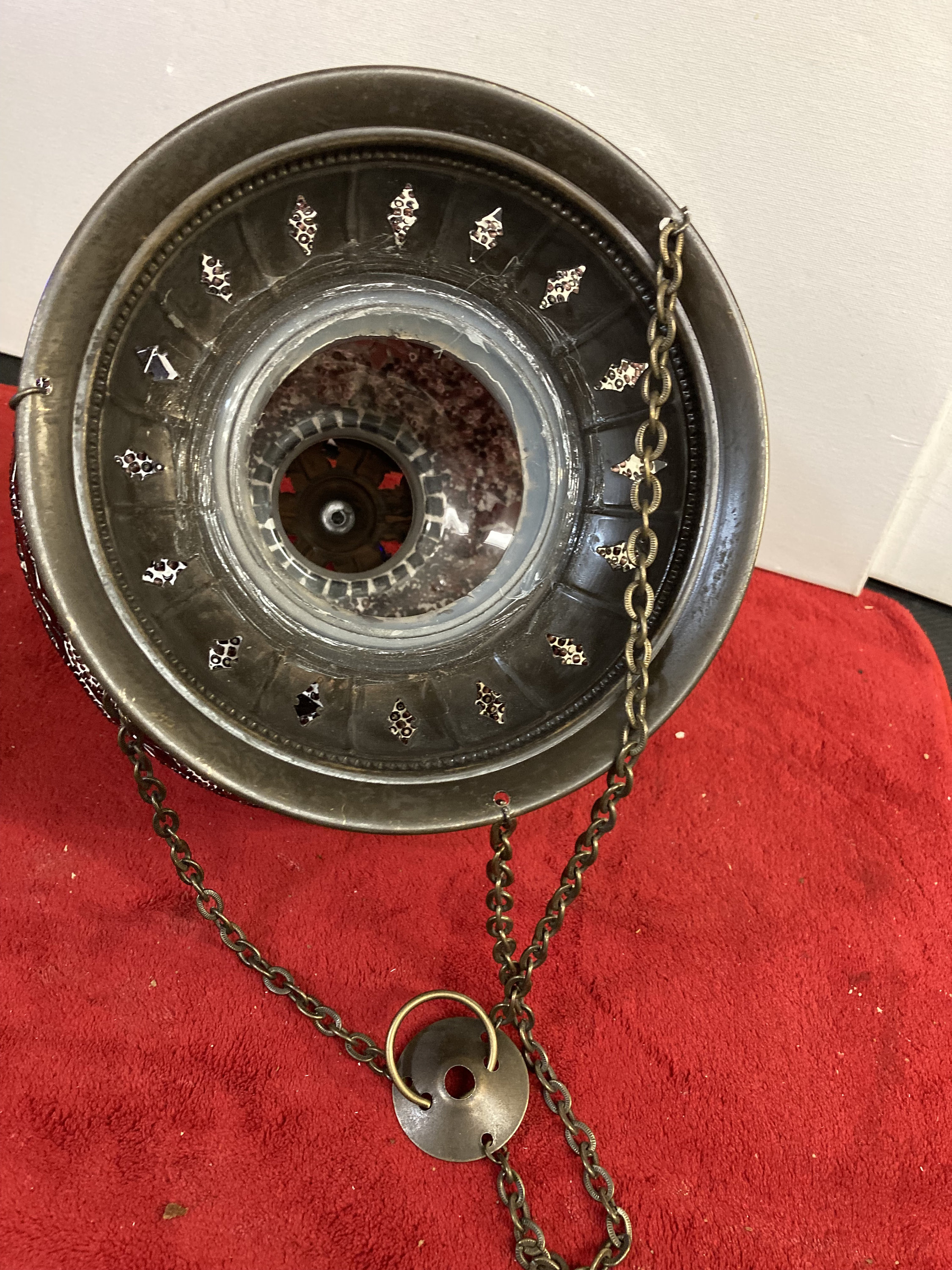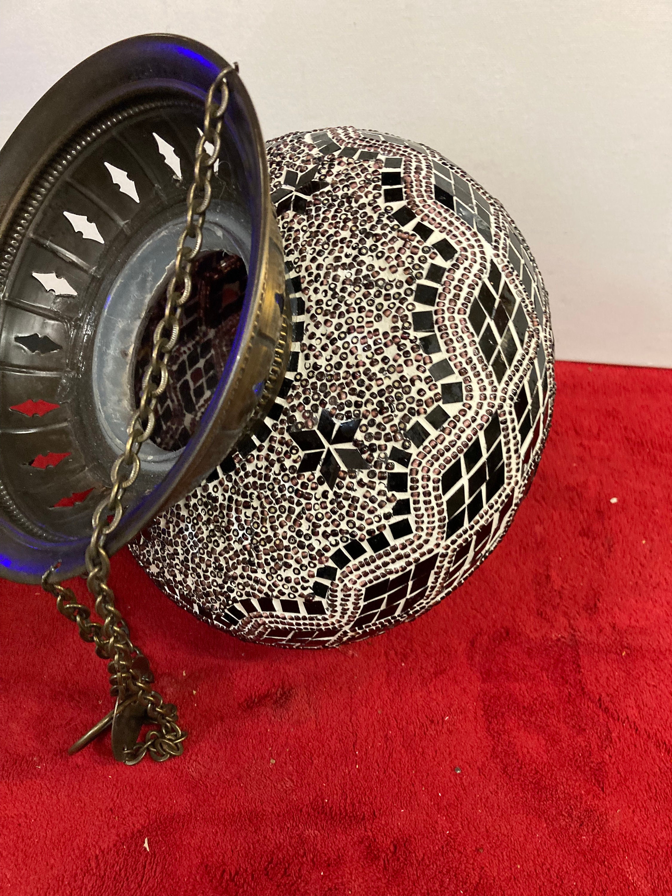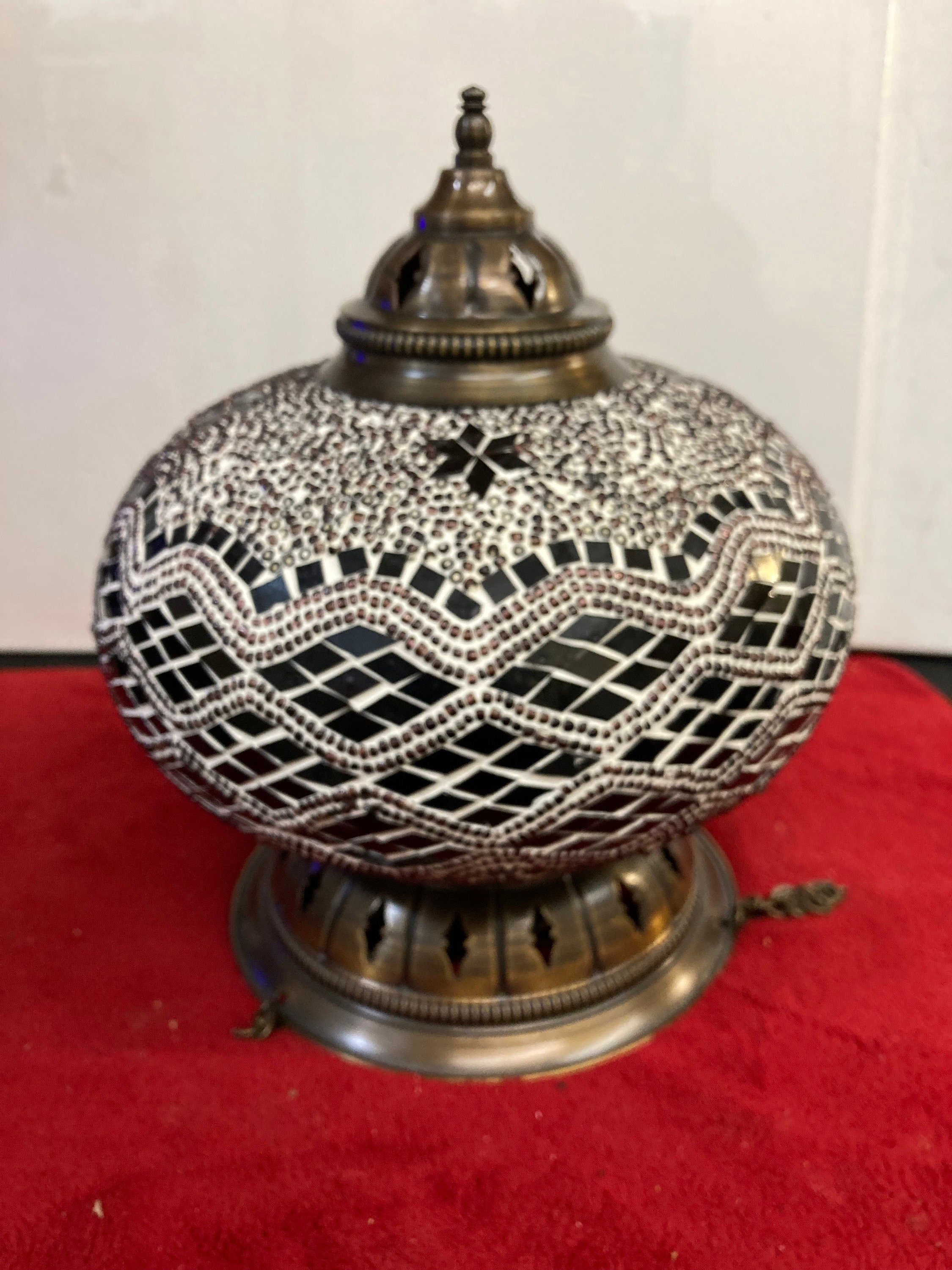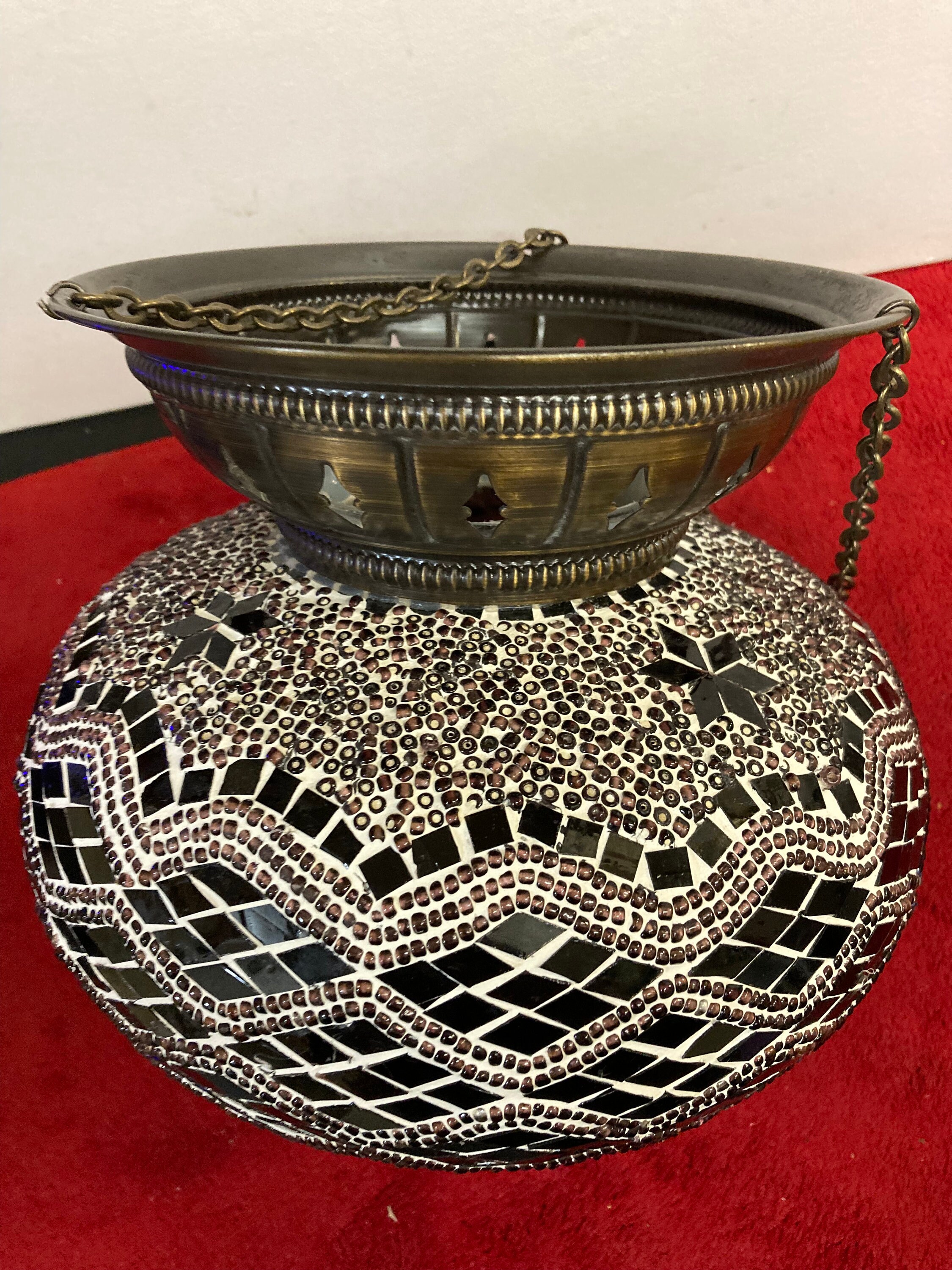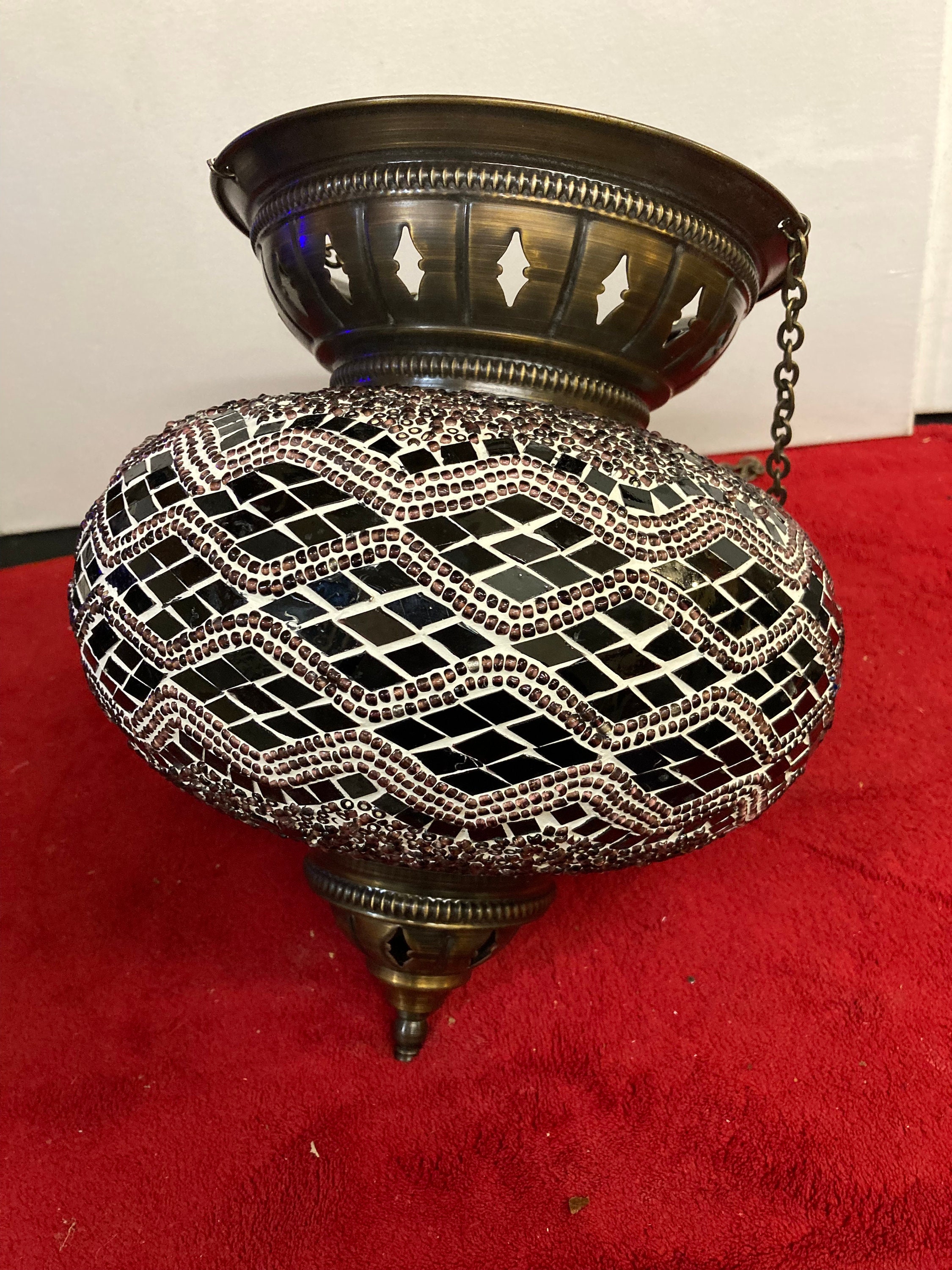 Intricate glass gems encircle the entire piece, along with ornate hand-punched brass in a beautiful design.