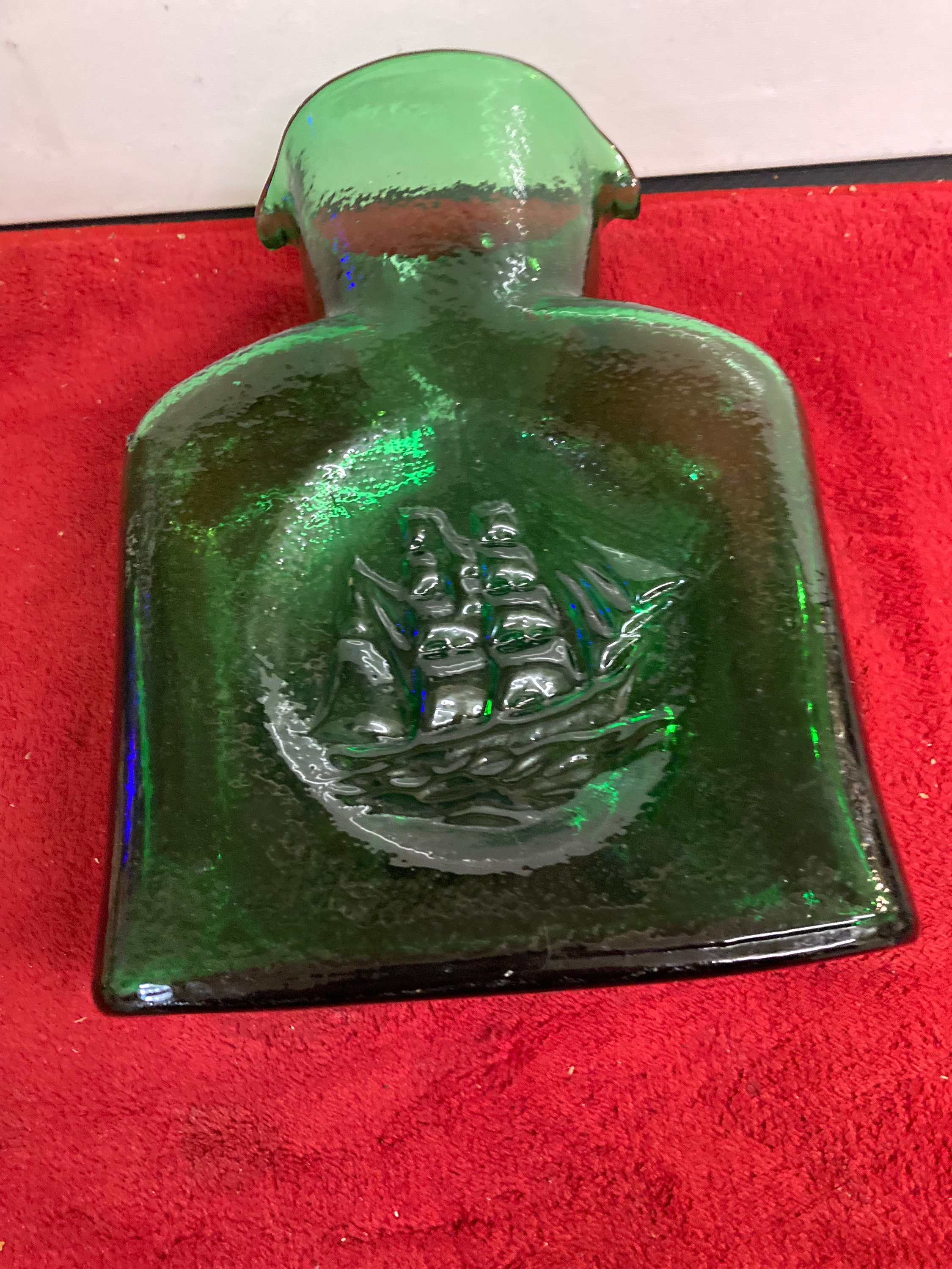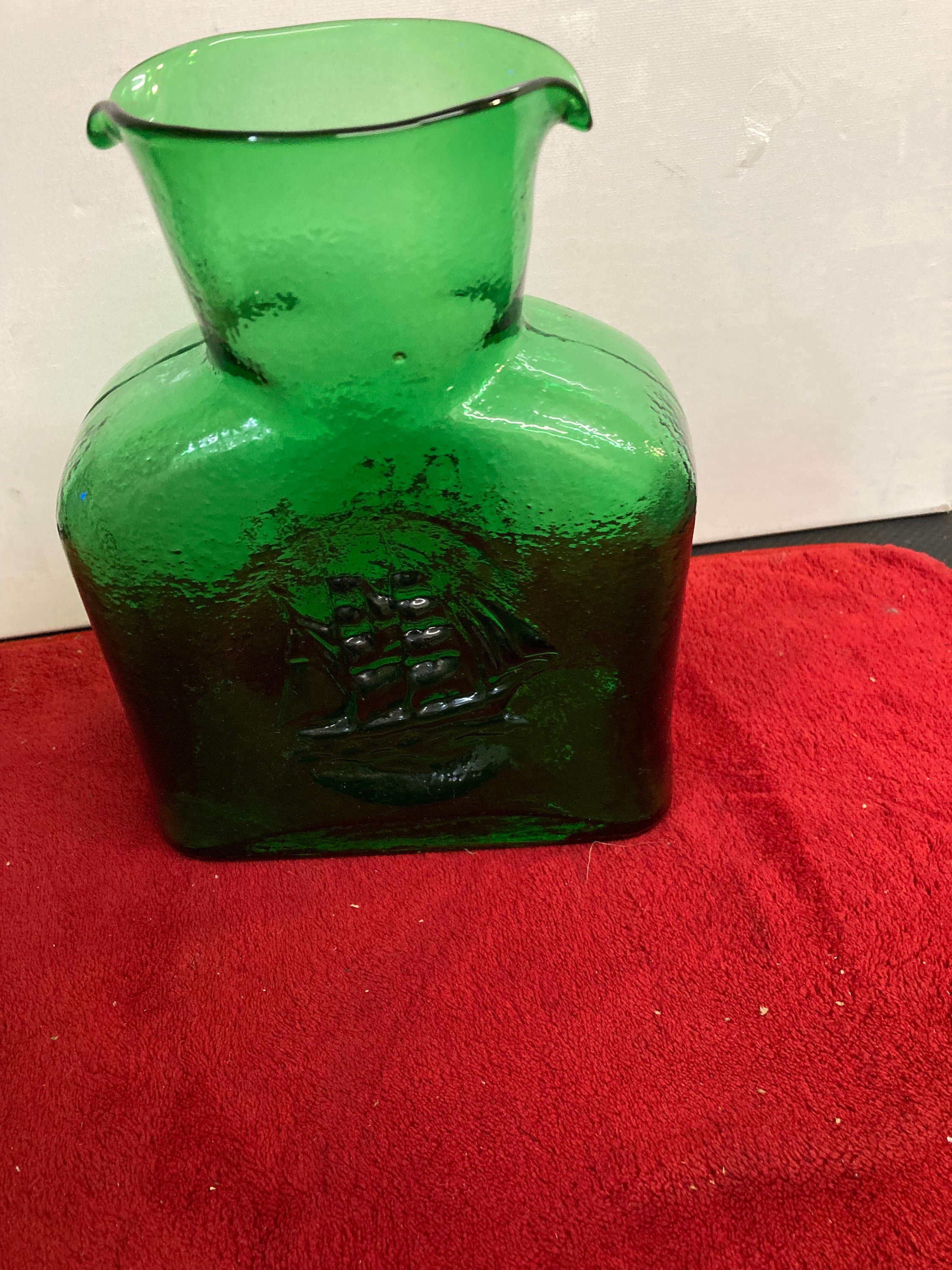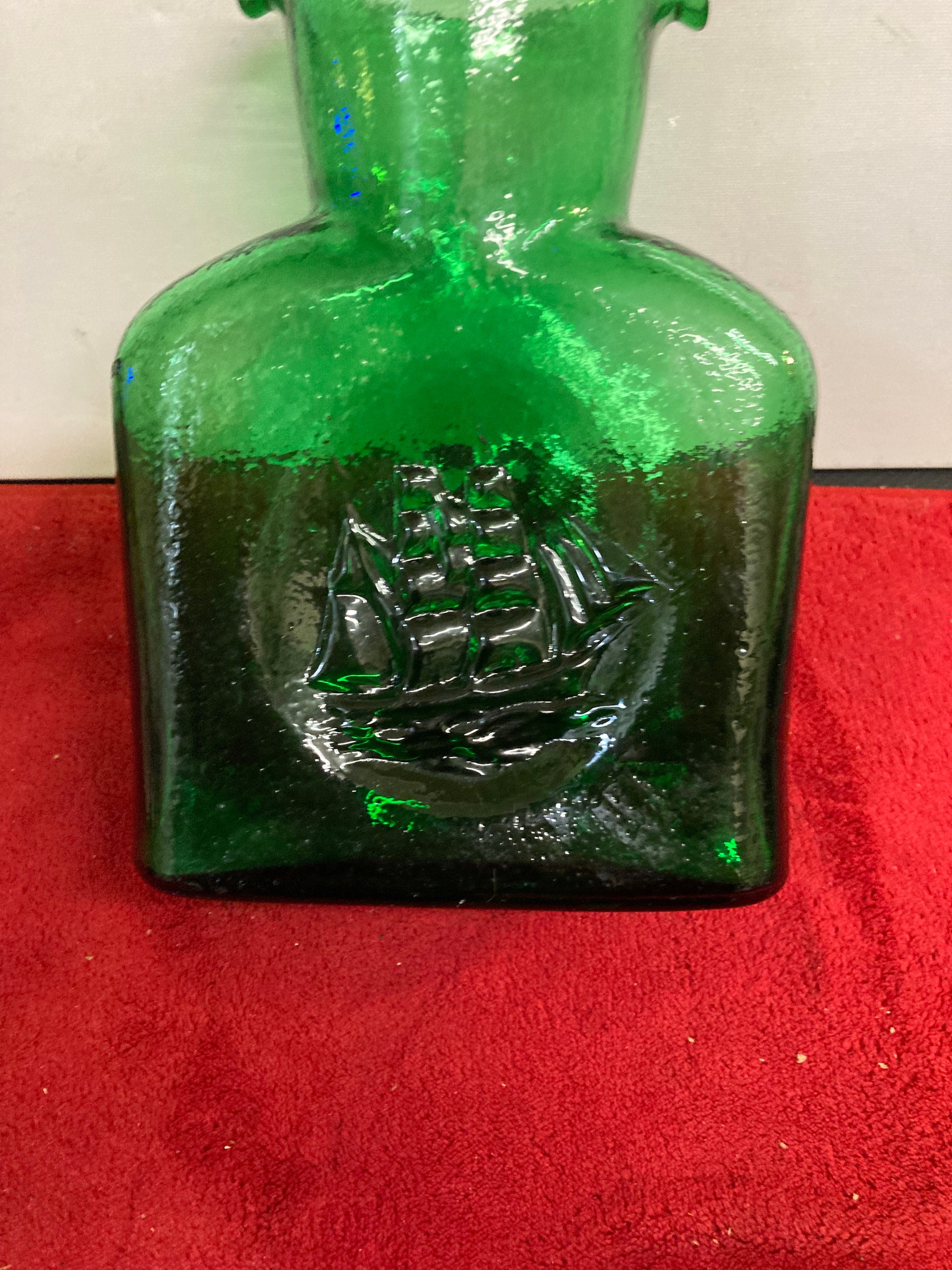 Kanawaha Green Two Spout Glass Carafe w/ Ship Design