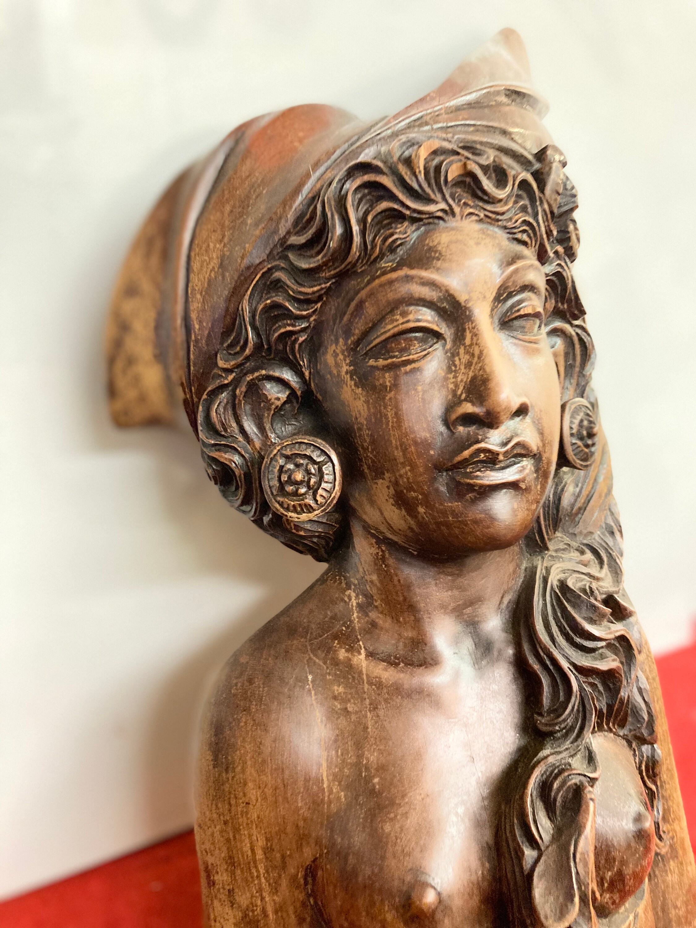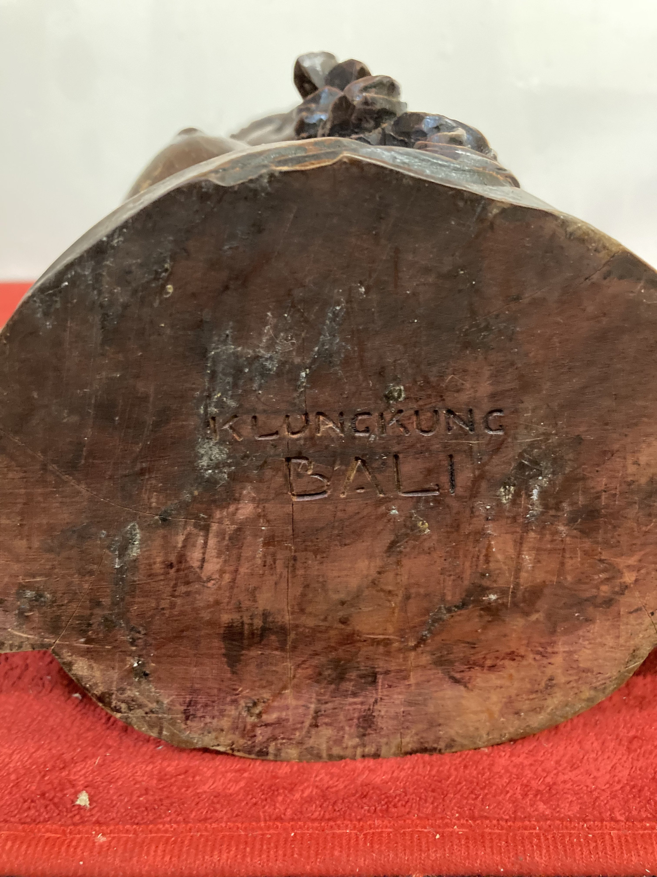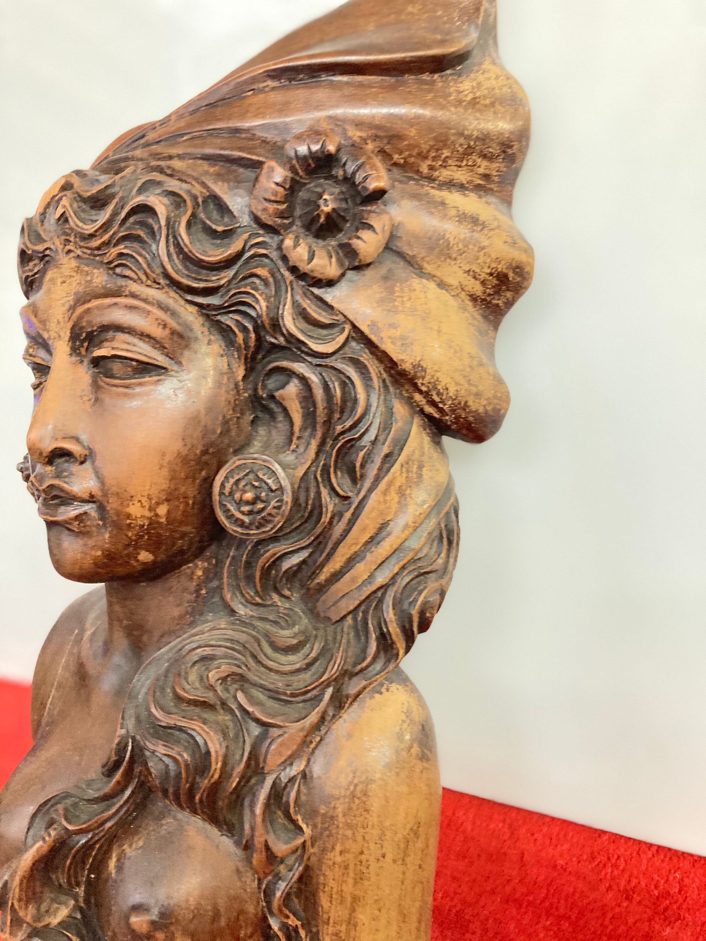 Since the piece was made in Denpasar, which has the international airport and the port, we feel it was strictly carved for tourists and sailors and is of a very standard quality.Such pieces are sometimes called “airport art,” which suggest they were made to be picked up by tourists as they entered or left the country.The image of a bare-breasted woman might have appealed to a sailor in the Merchant Marine, but it is often found paired with a male counterpart.