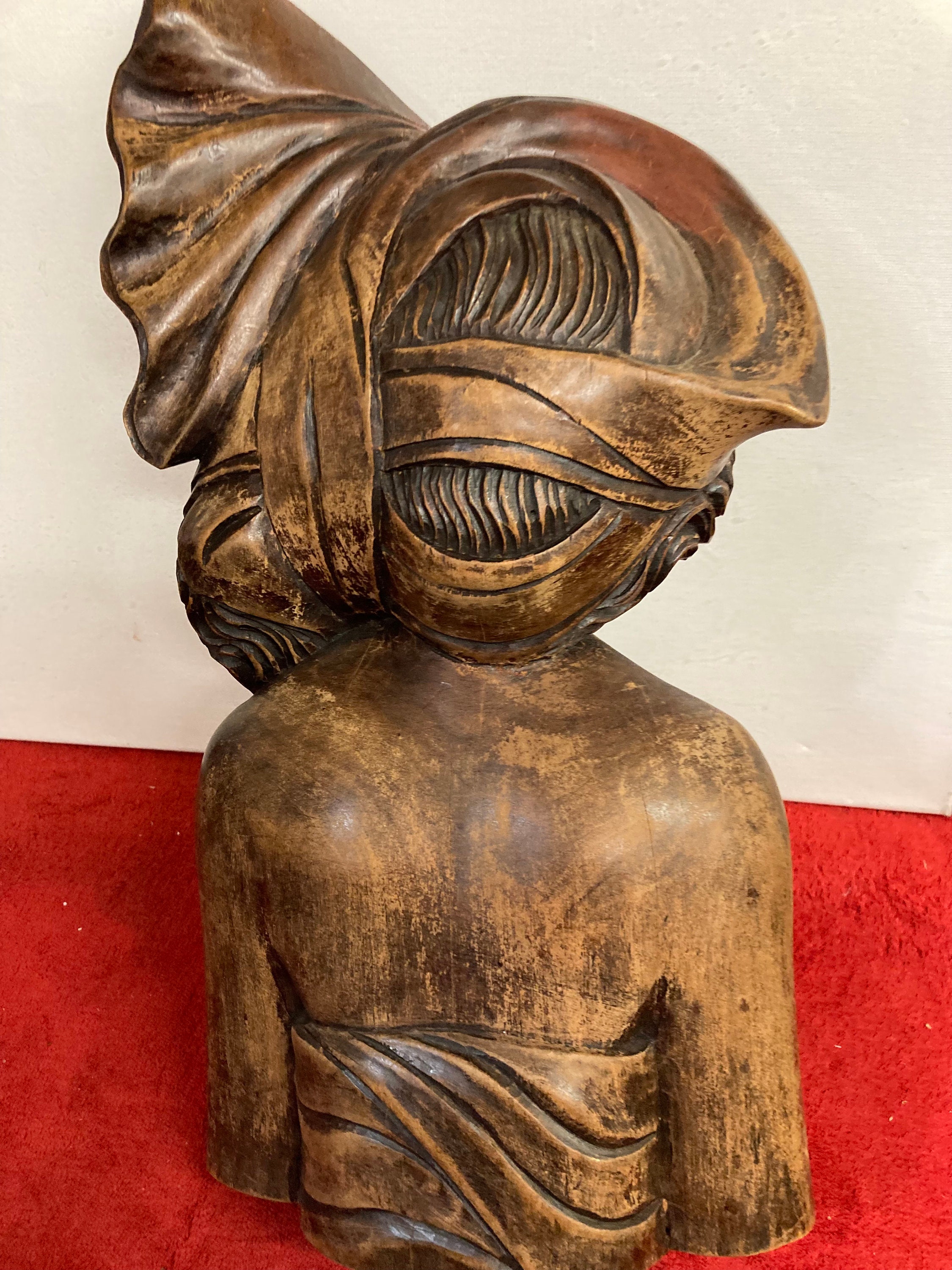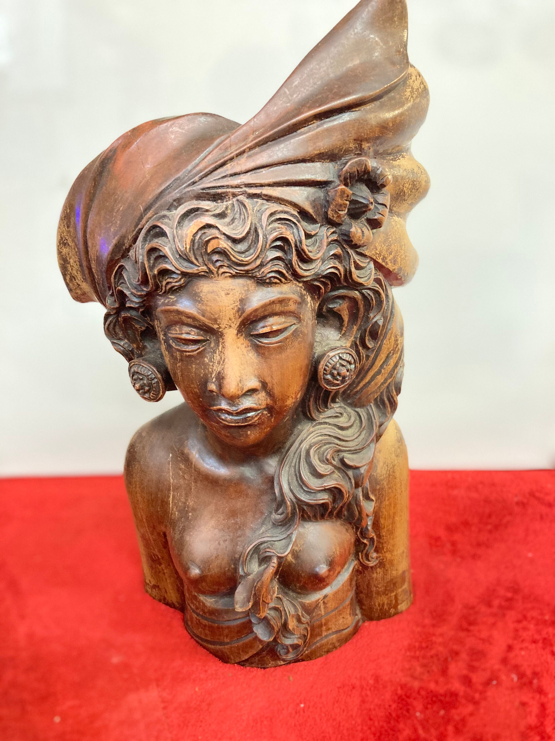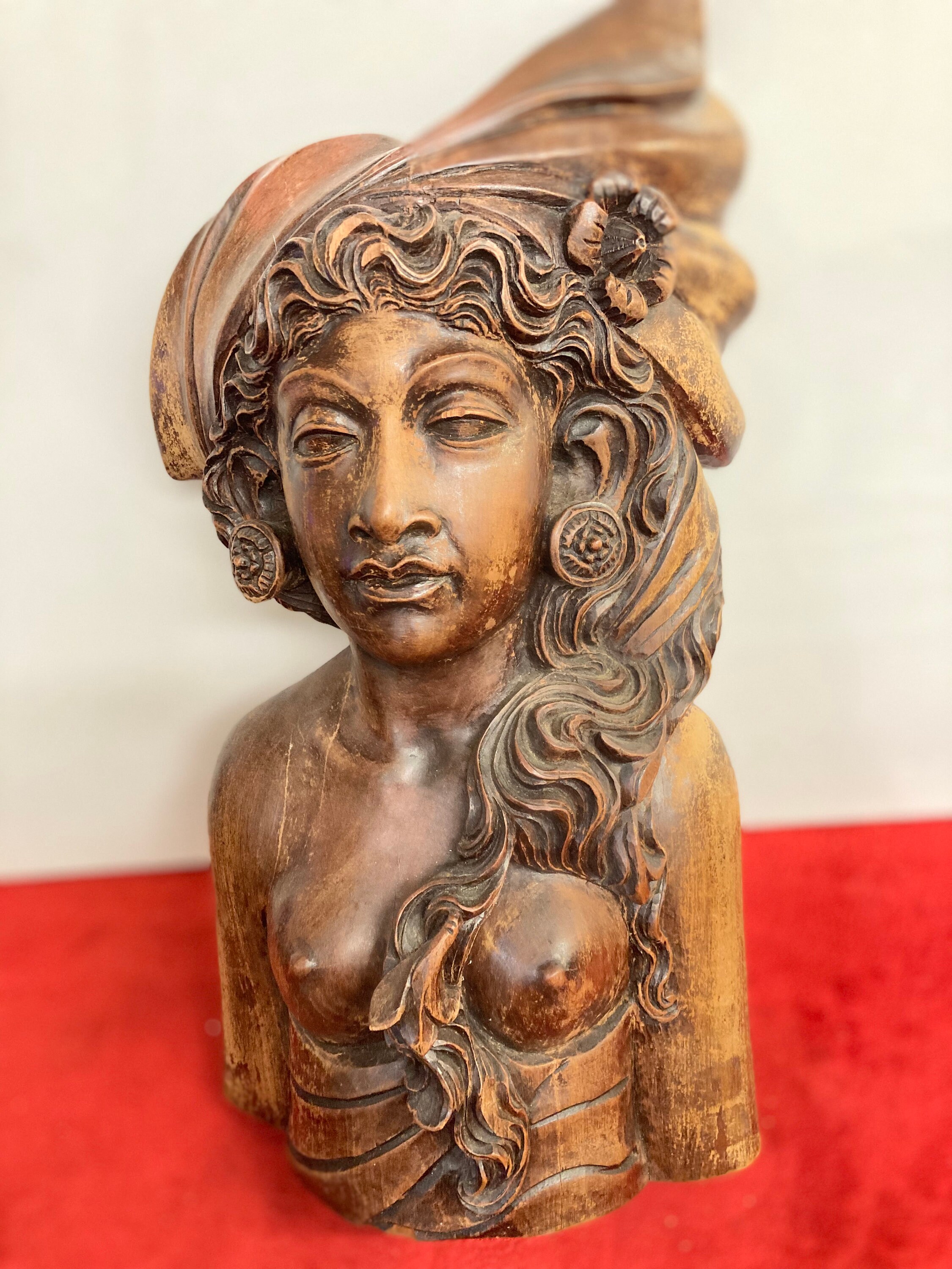 Since the piece was made in Denpasar, which has the international airport and the port, we feel it was strictly carved for tourists and sailors and is of a very standard quality.Such pieces are sometimes called “airport art,” which suggest they were made to be picked up by tourists as they entered or left the country.The image of a bare-breasted woman might have appealed to a sailor in the Merchant Marine, but it is often found paired with a male counterpart.