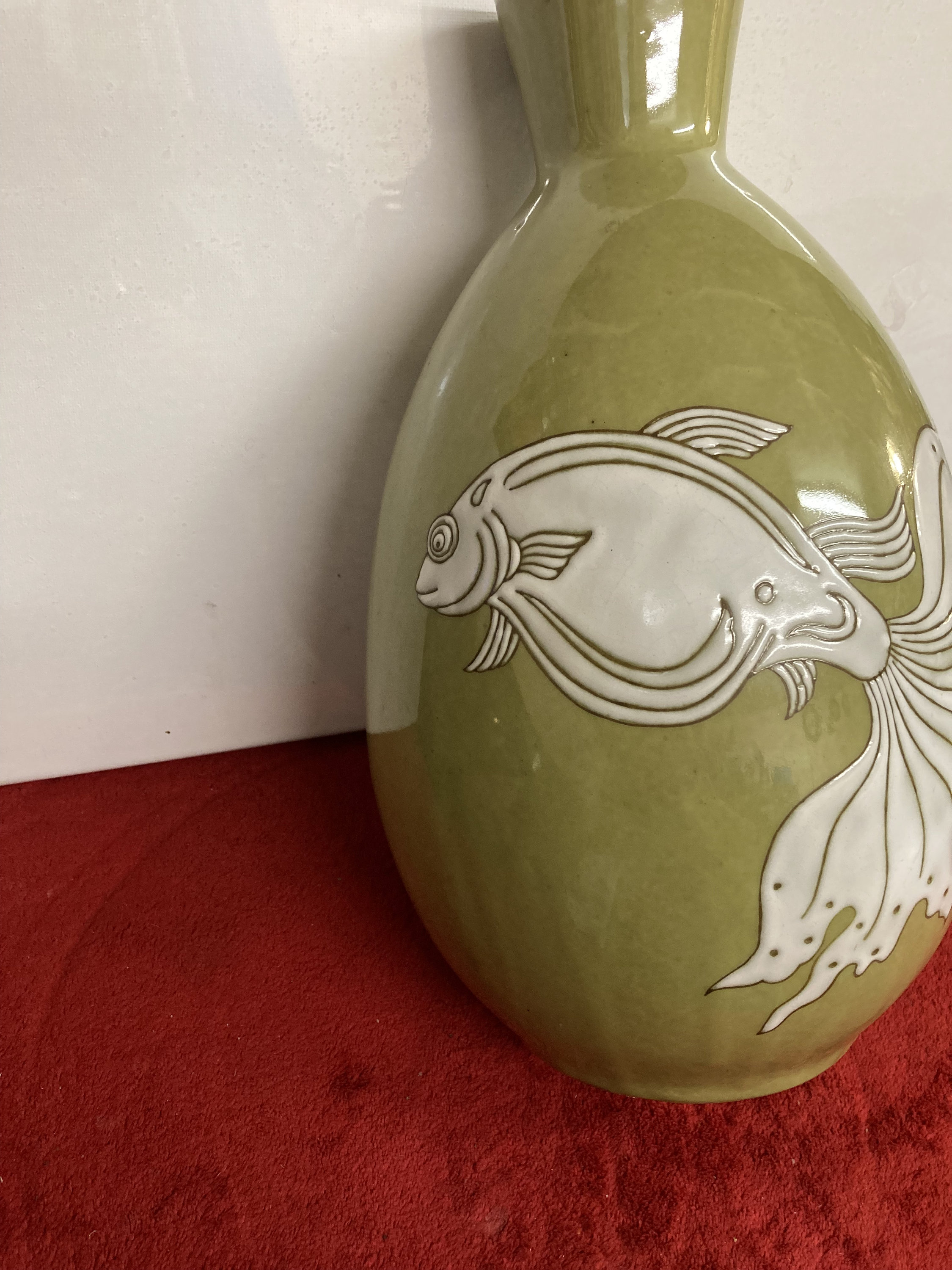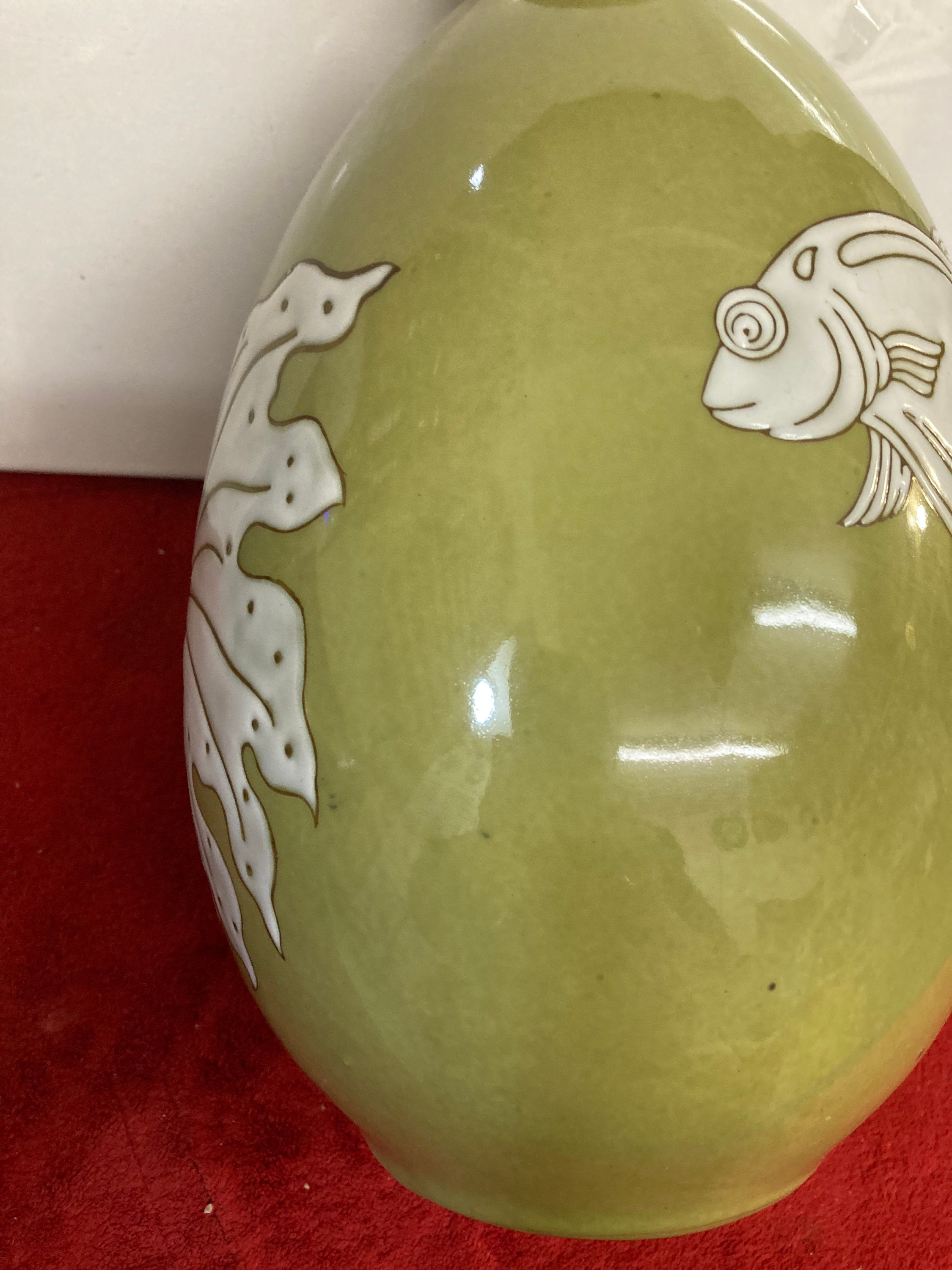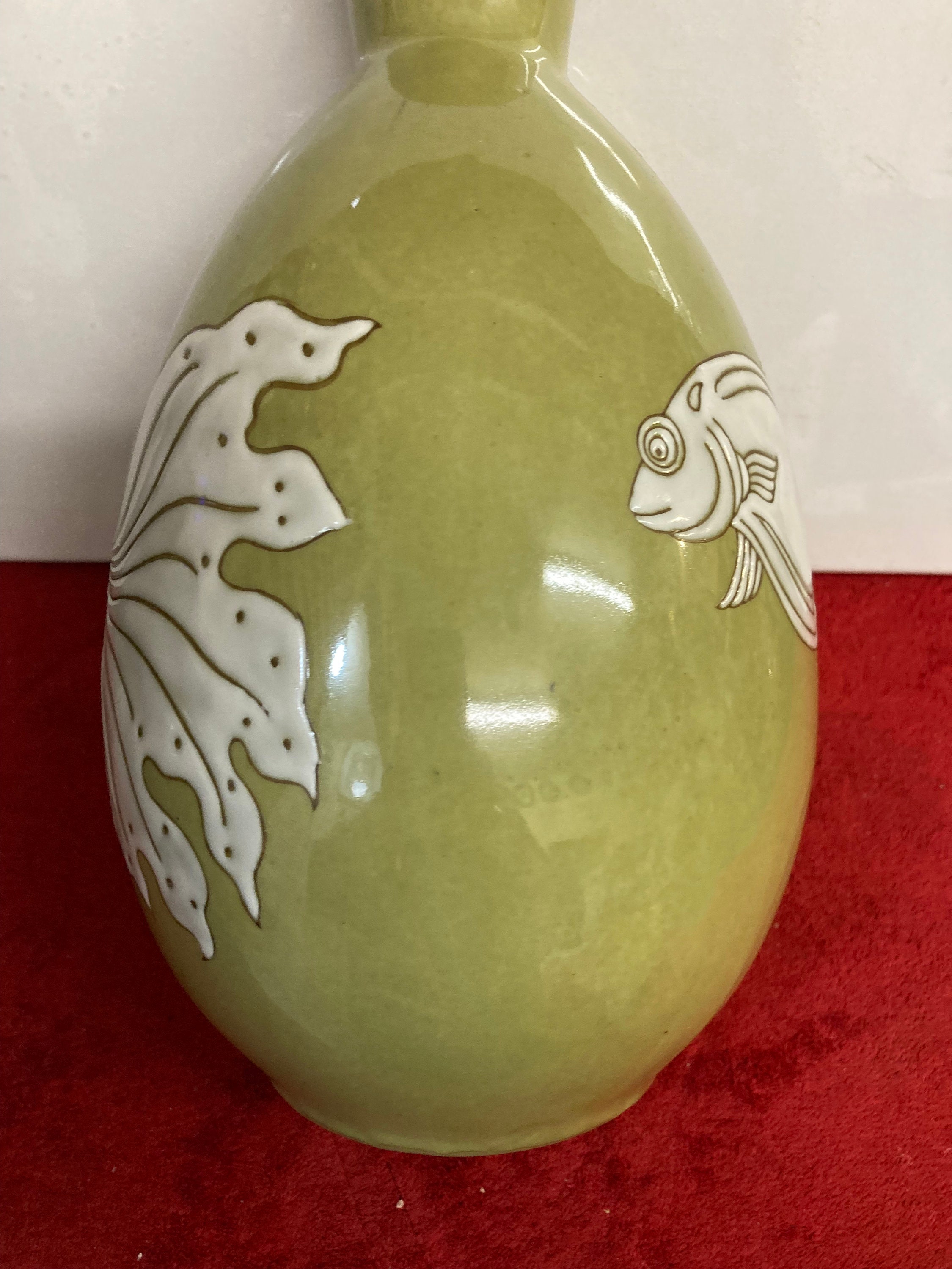 Large hand thrown vase with incised and enameled mystical Fish over a muted green ground.