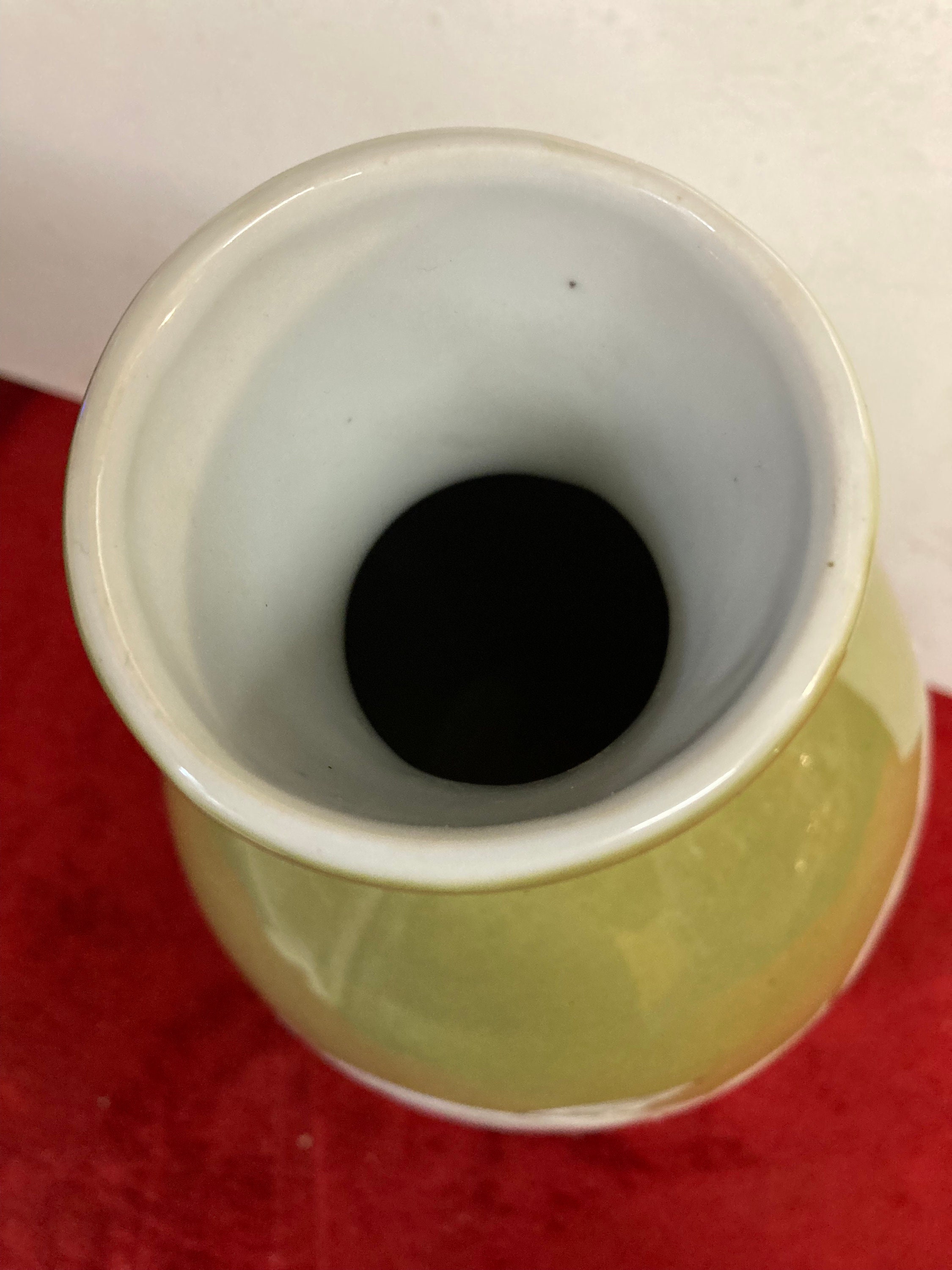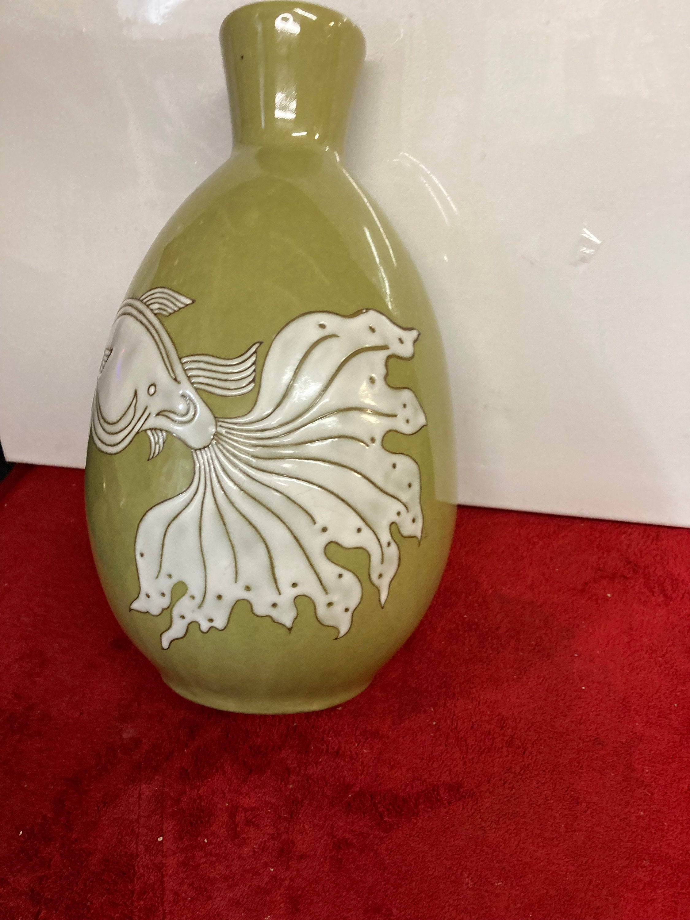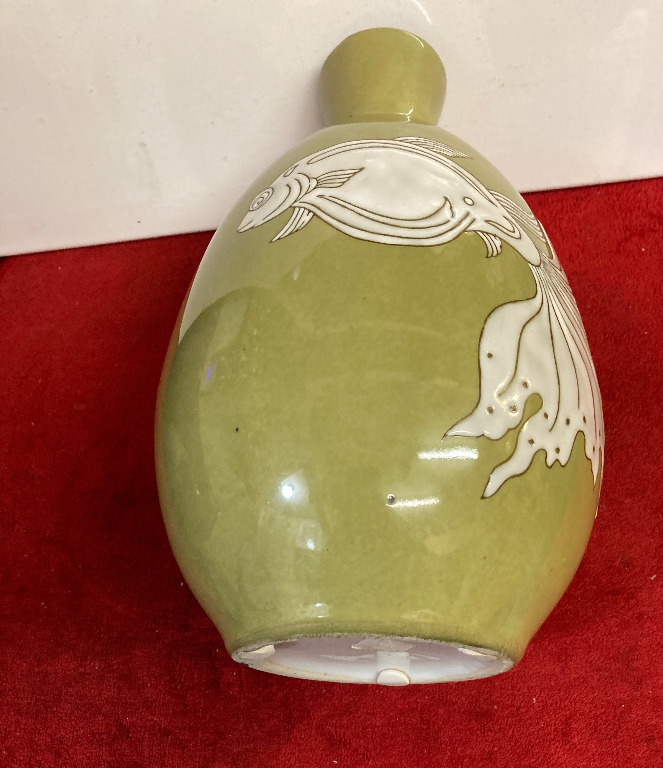Large hand thrown vase with incised and enameled mystical Fish over a muted green ground.