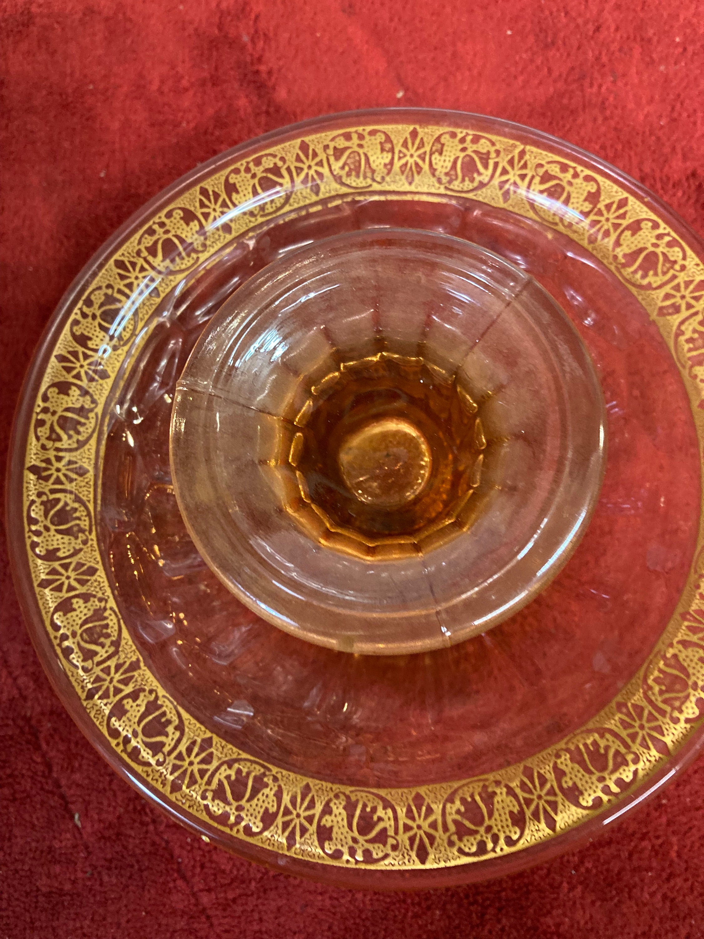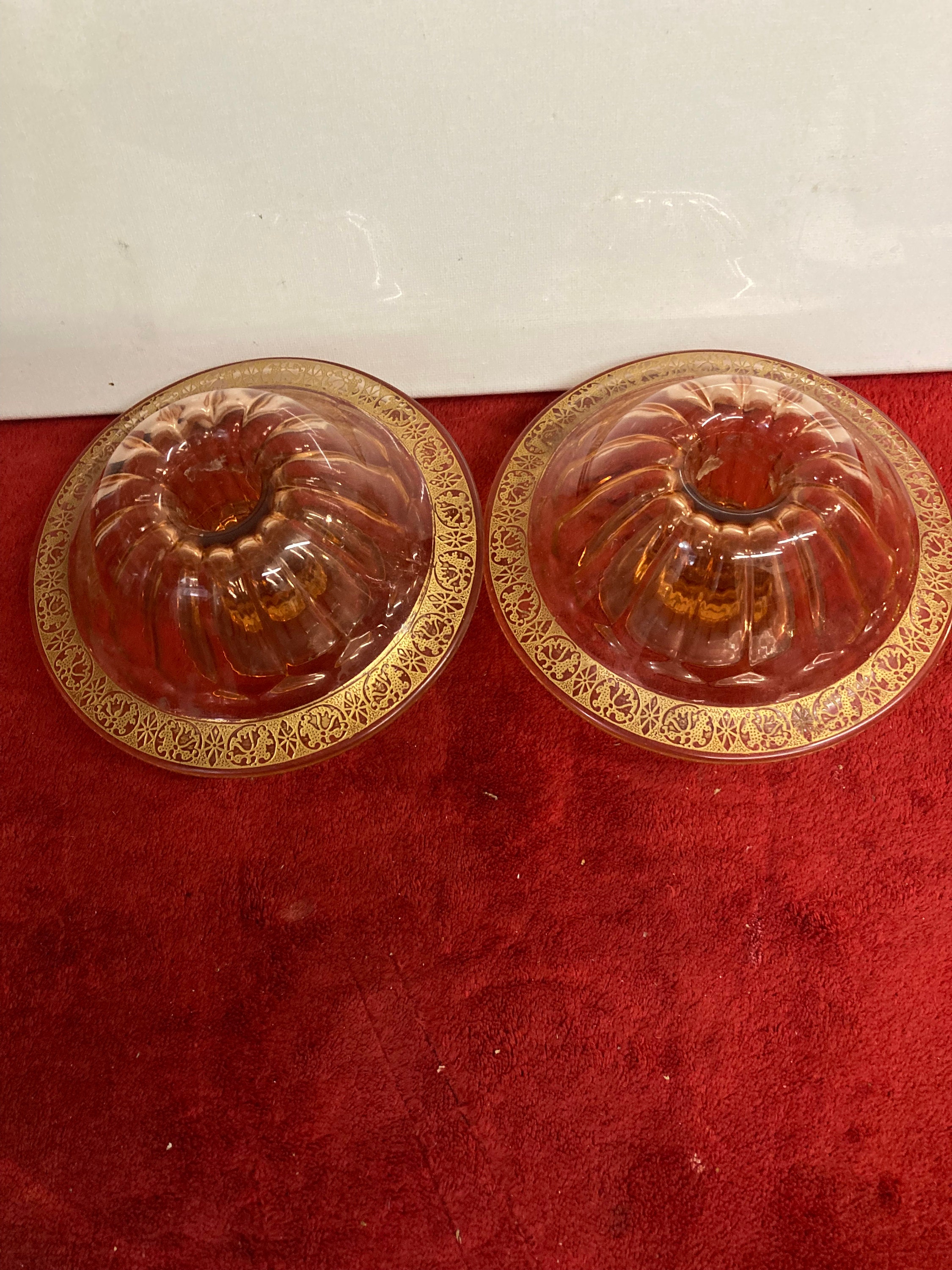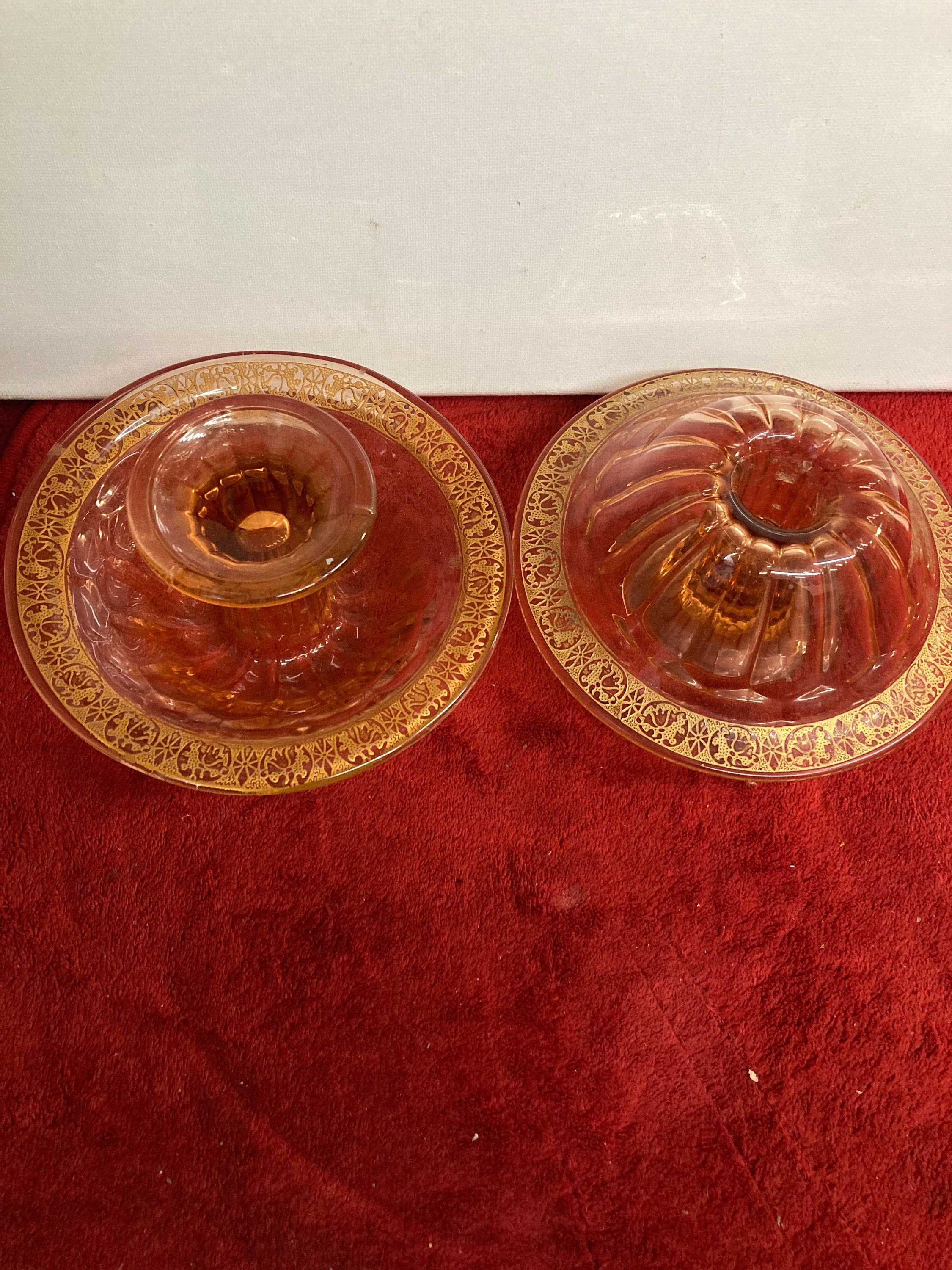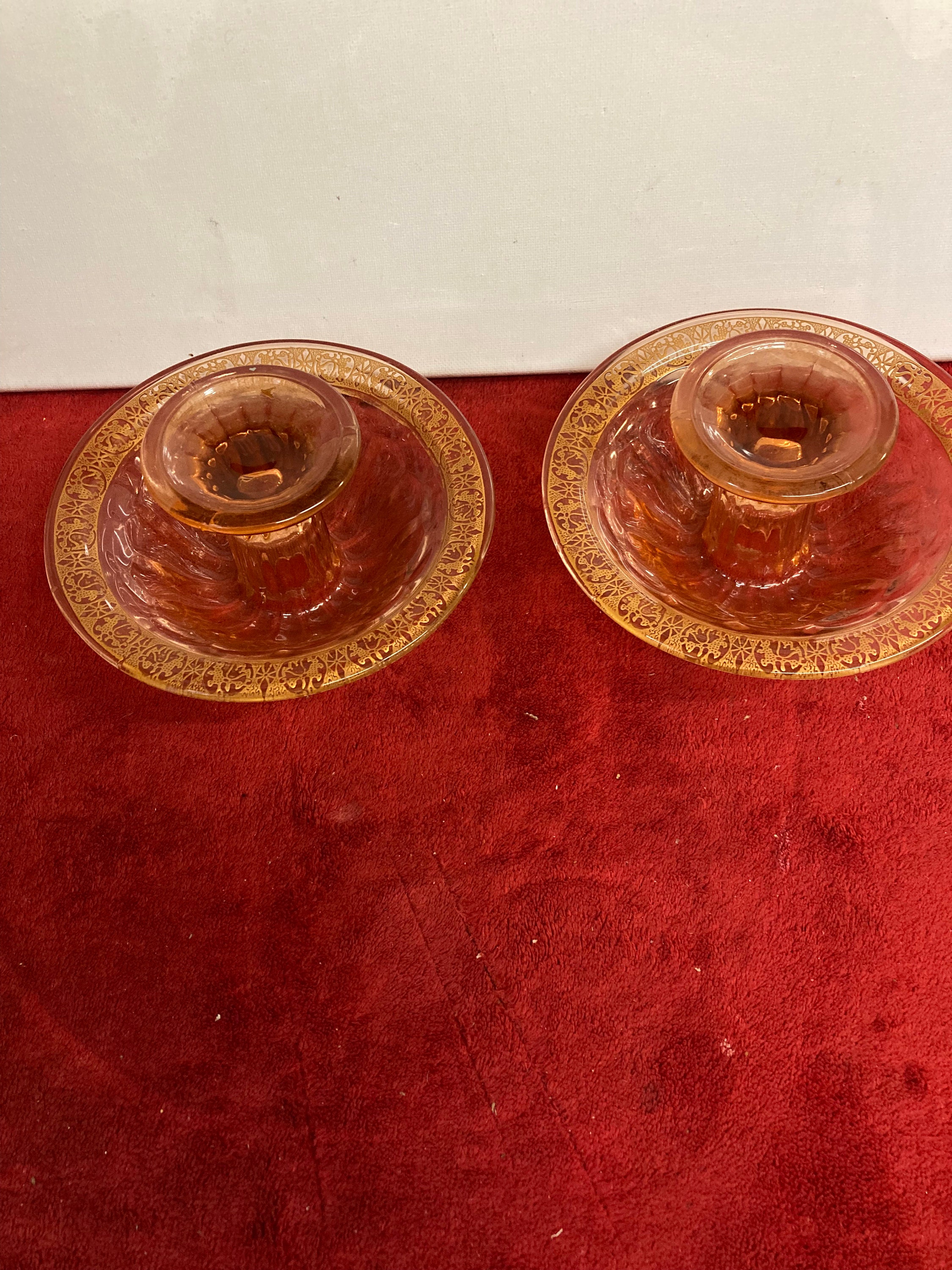 Pair of Antique Fancy Etched Pink Depression Glass Candle Holders